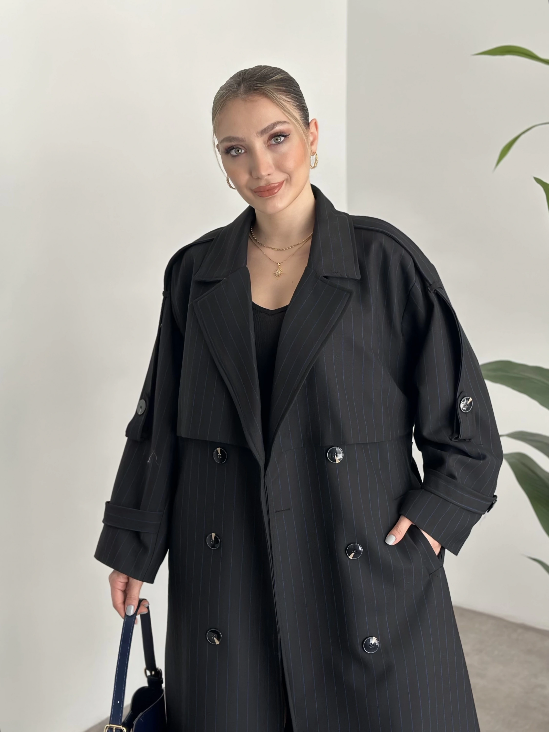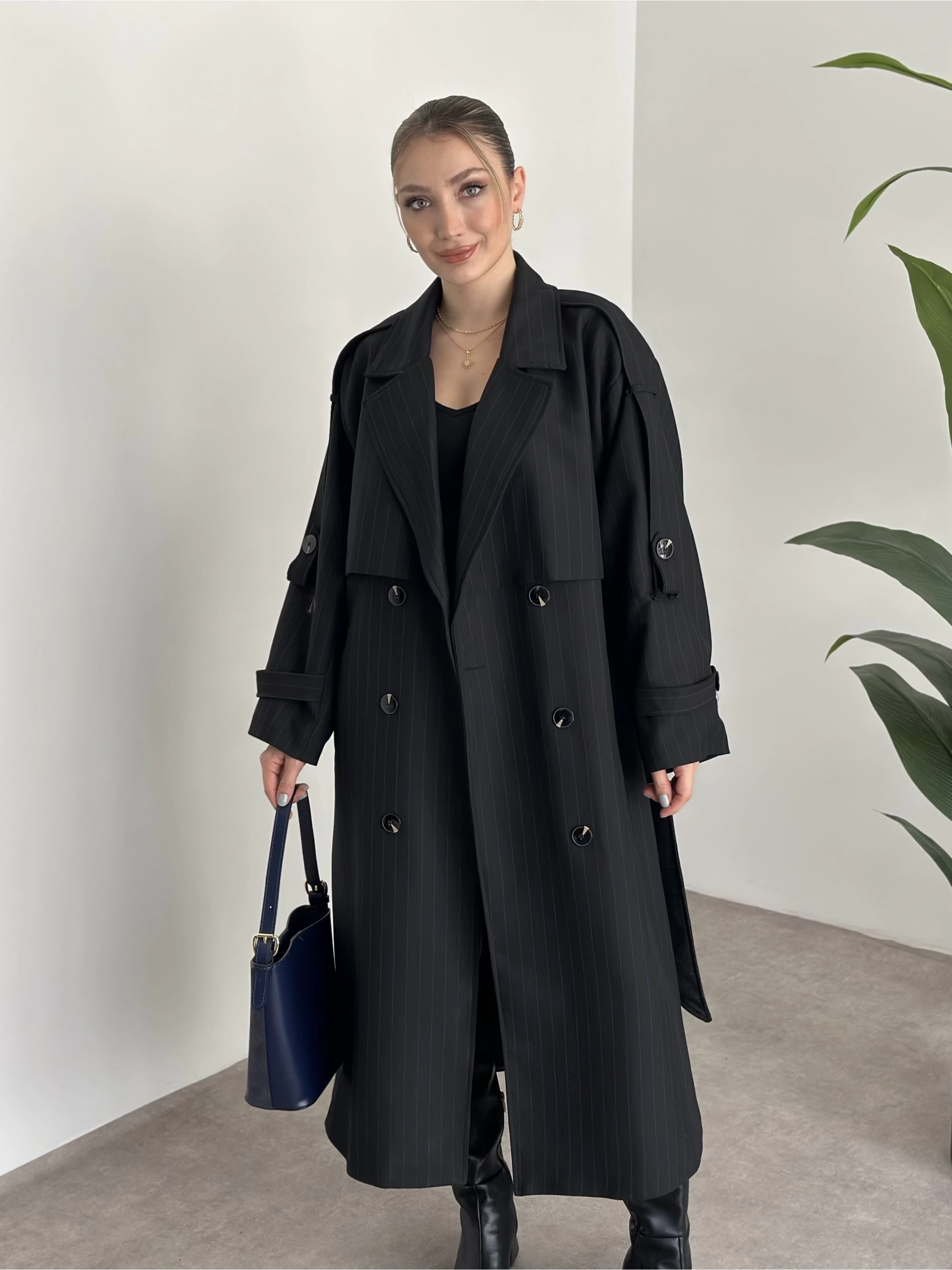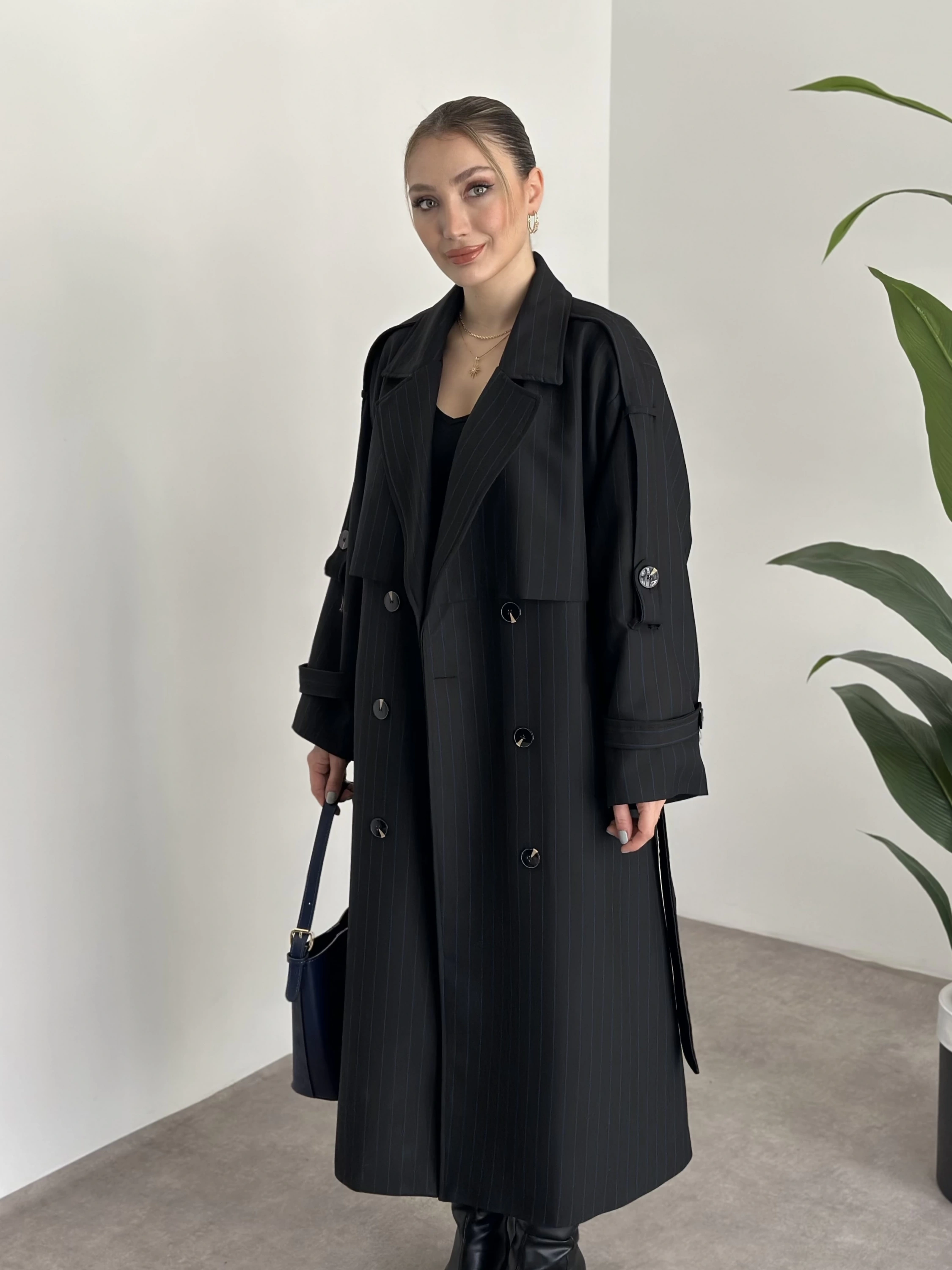Çizgili uzun düğmeli beli kuşaklı oversize astarlı trençkot siyah
