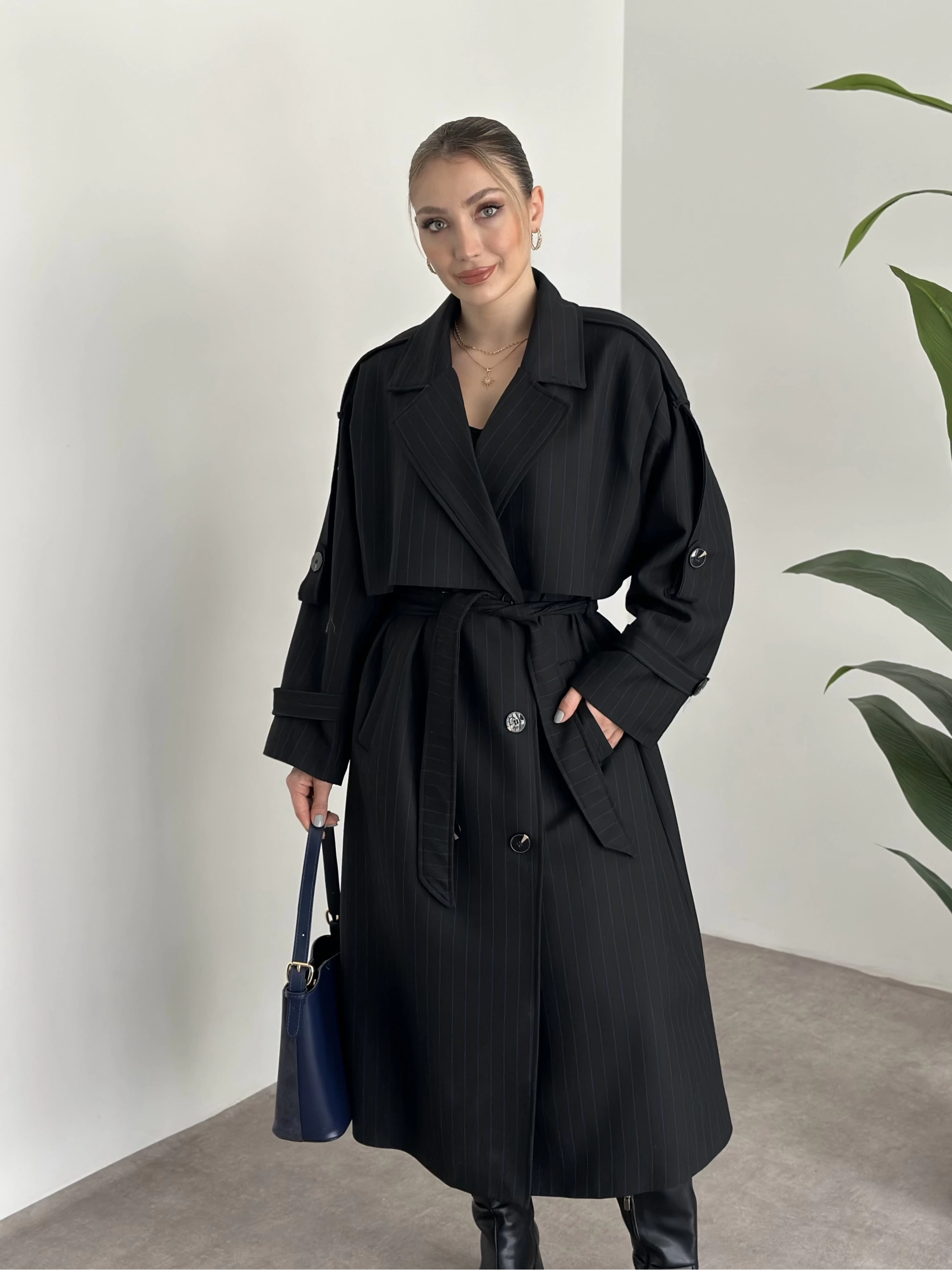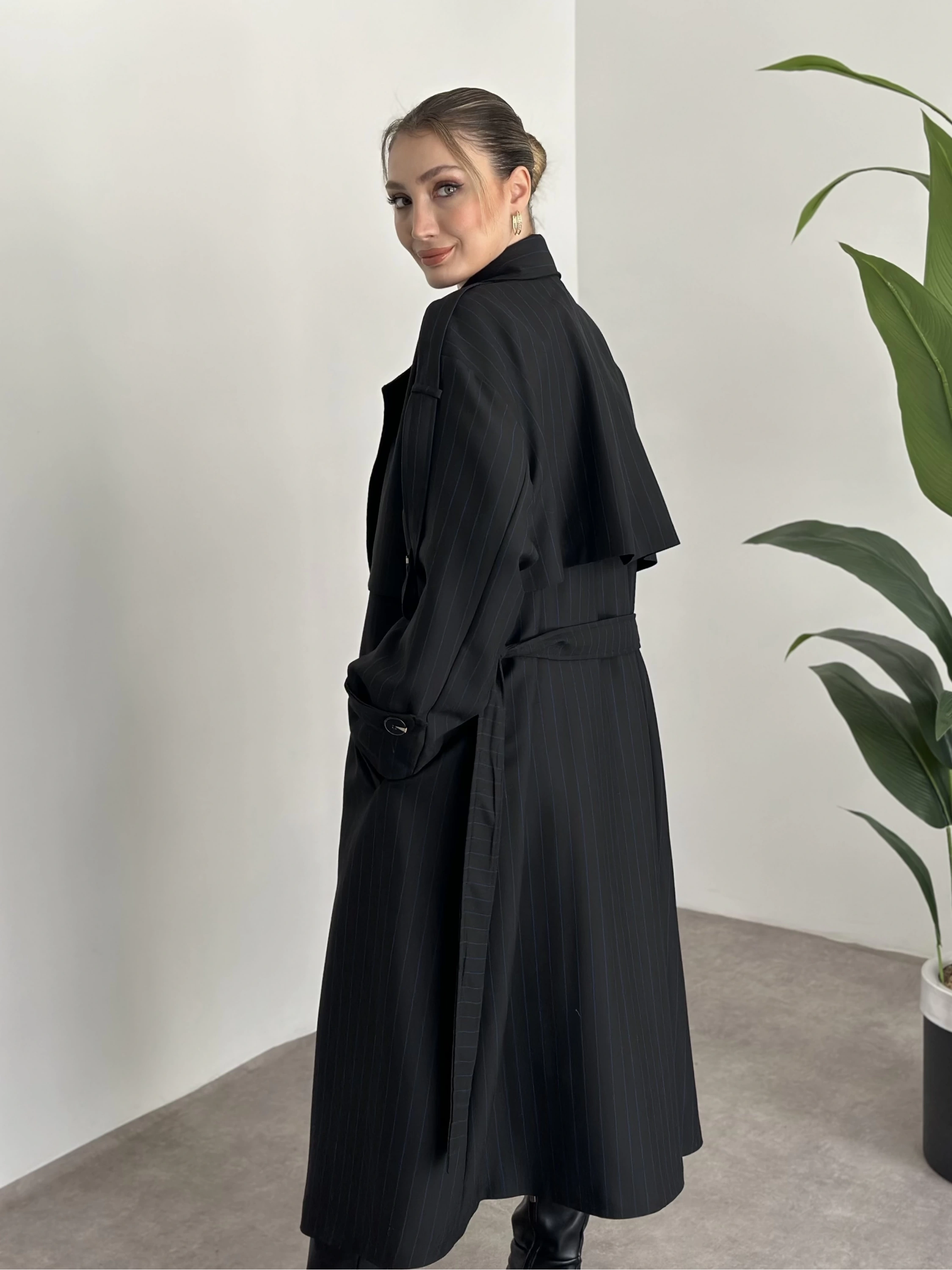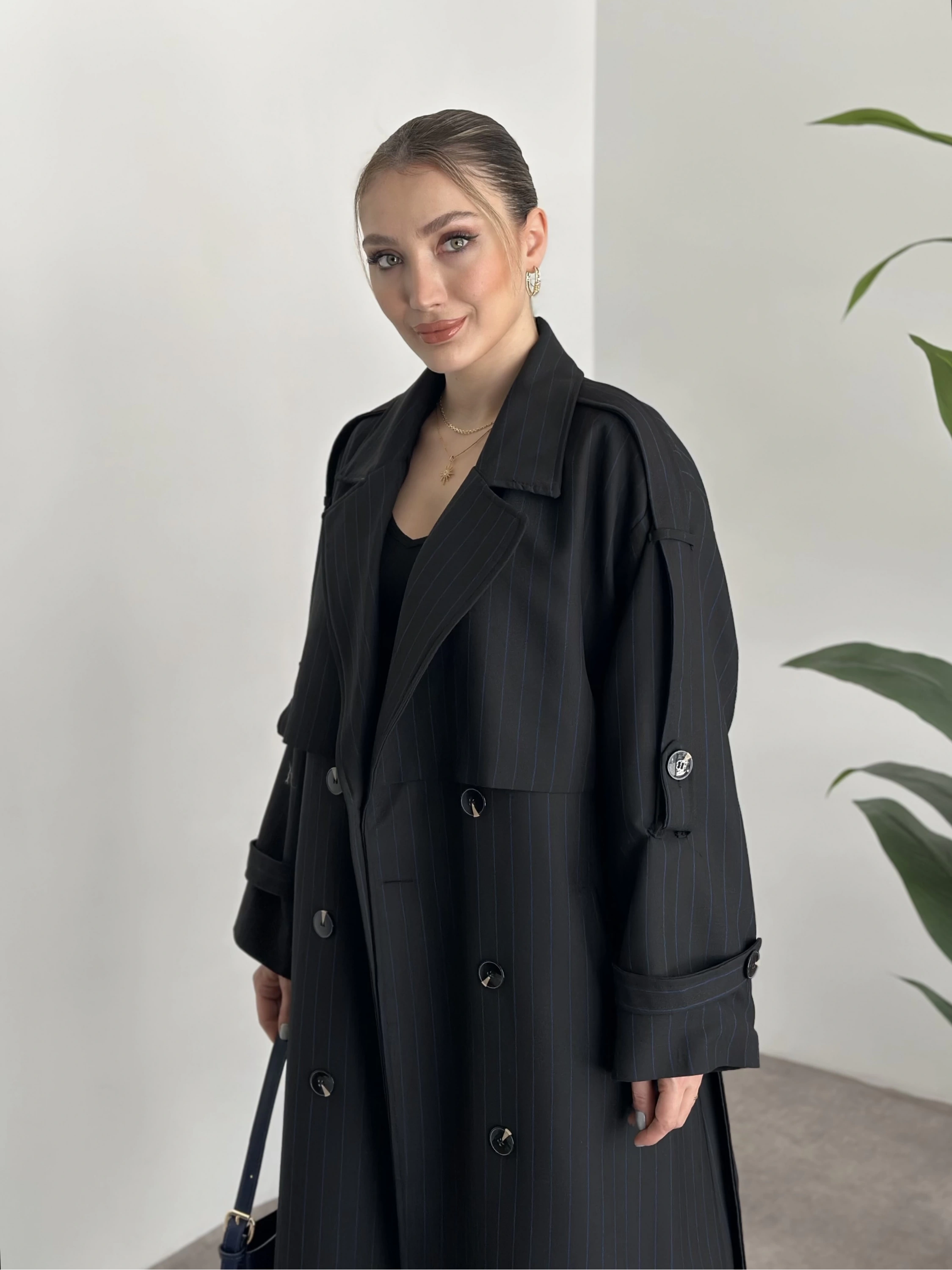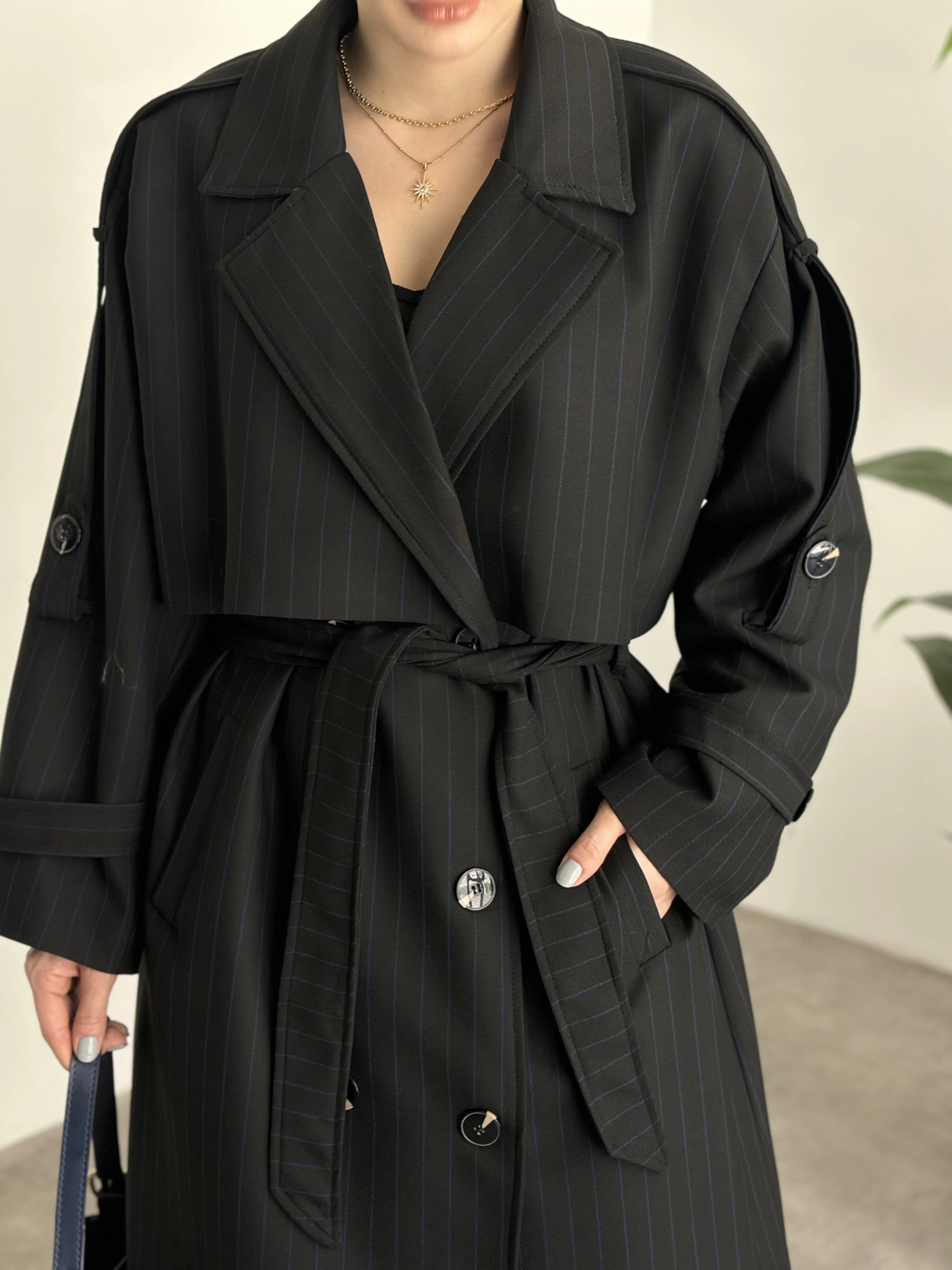 Çizgili uzun düğmeli beli kuşaklı oversize astarlı trençkot siyah