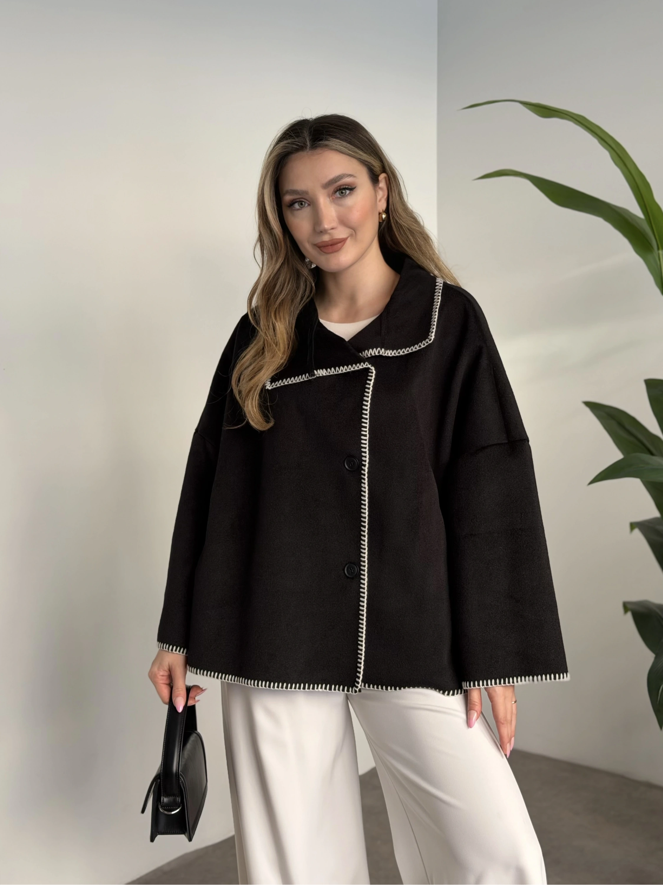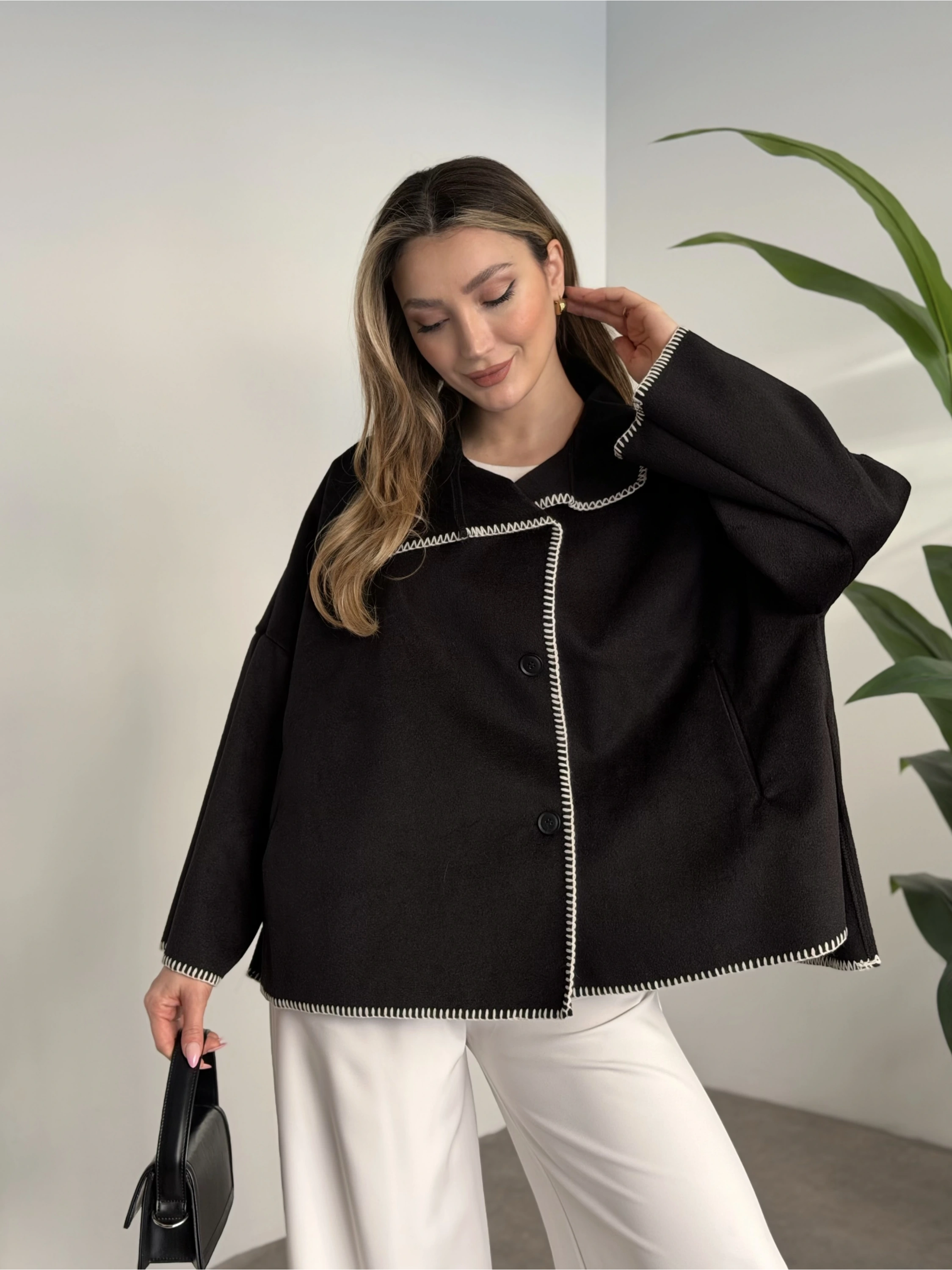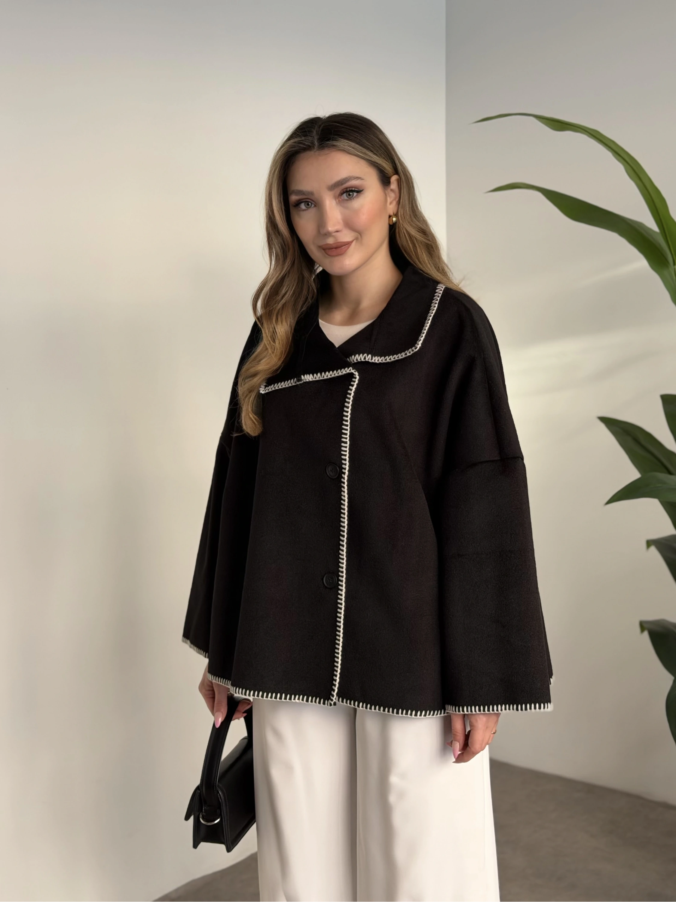 Oversize düğmeli astarlı bağlamalı kaşe kaban antrasit