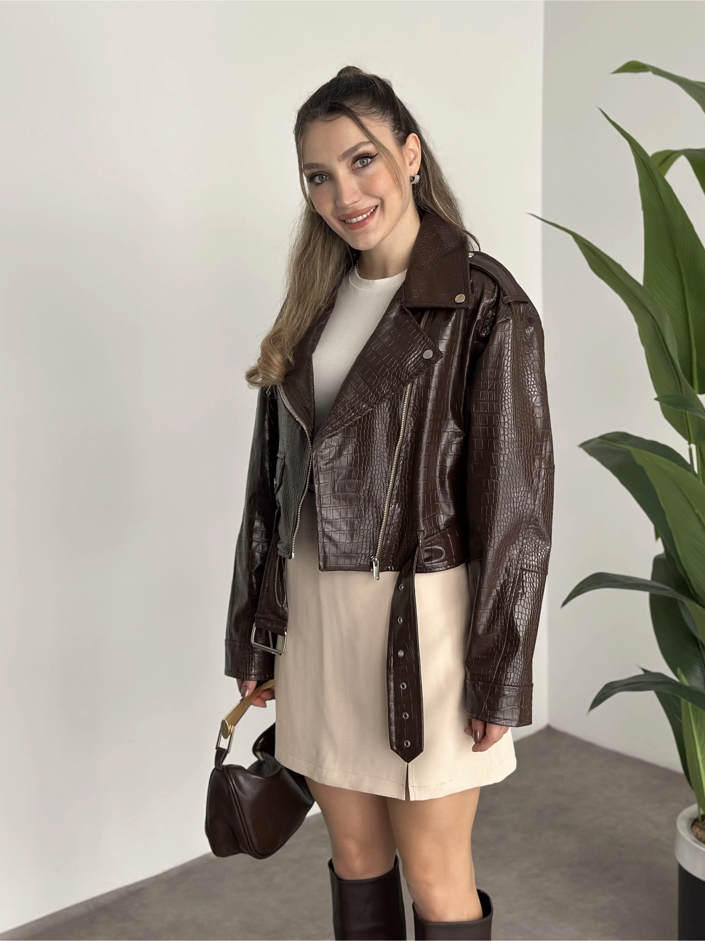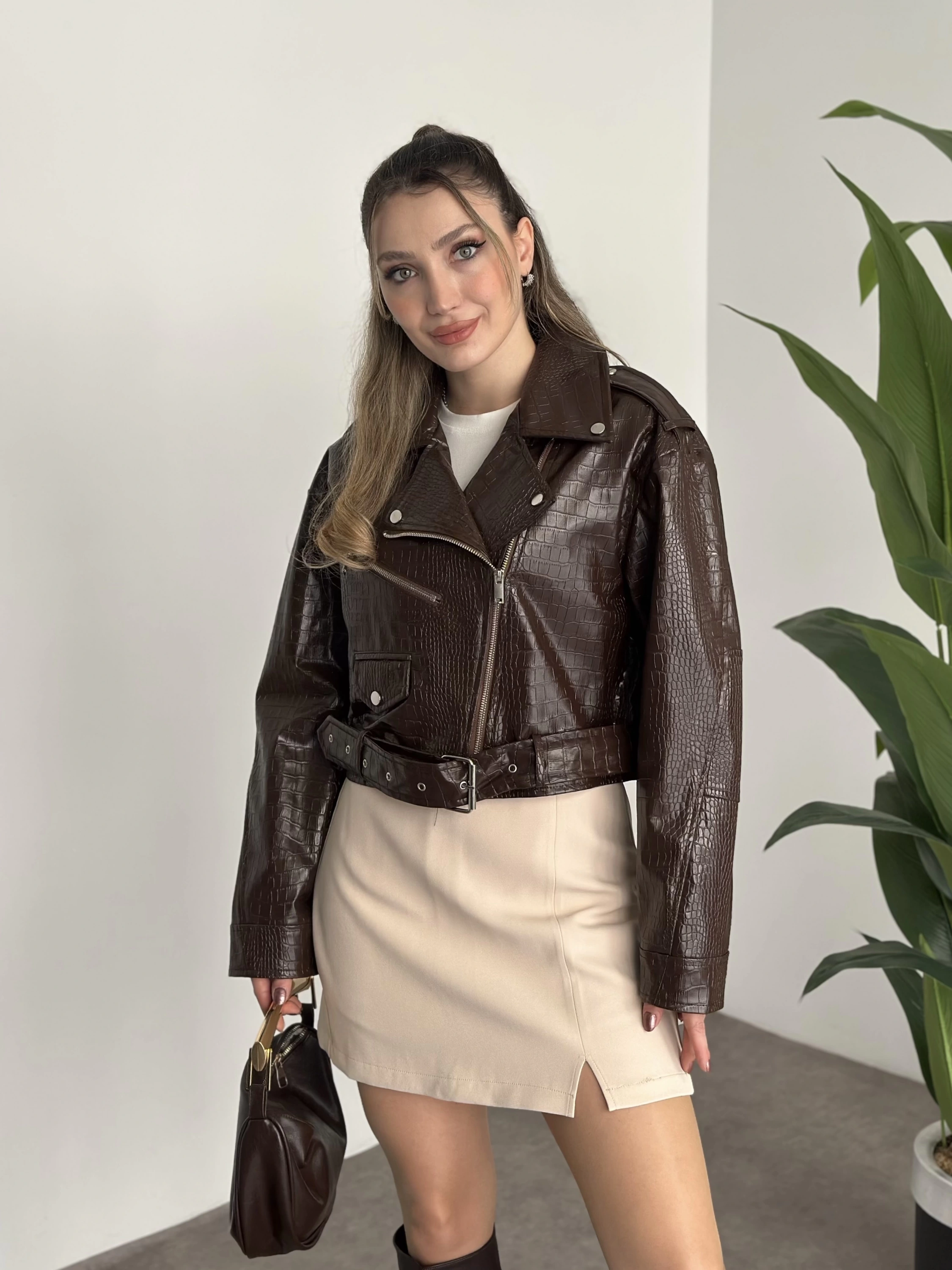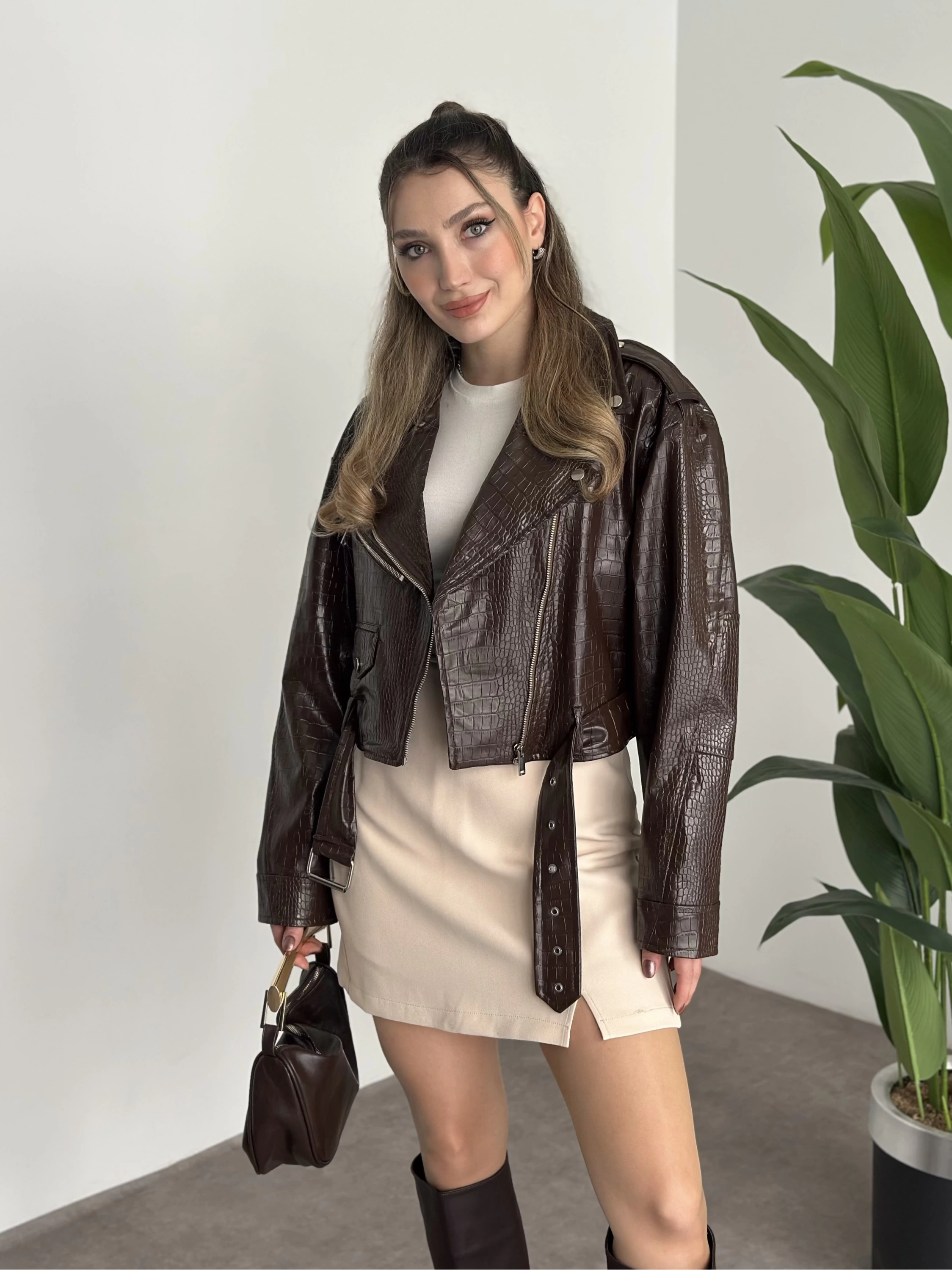 Crop boy kemer detaylı fermuarlı desenli ceket kahve