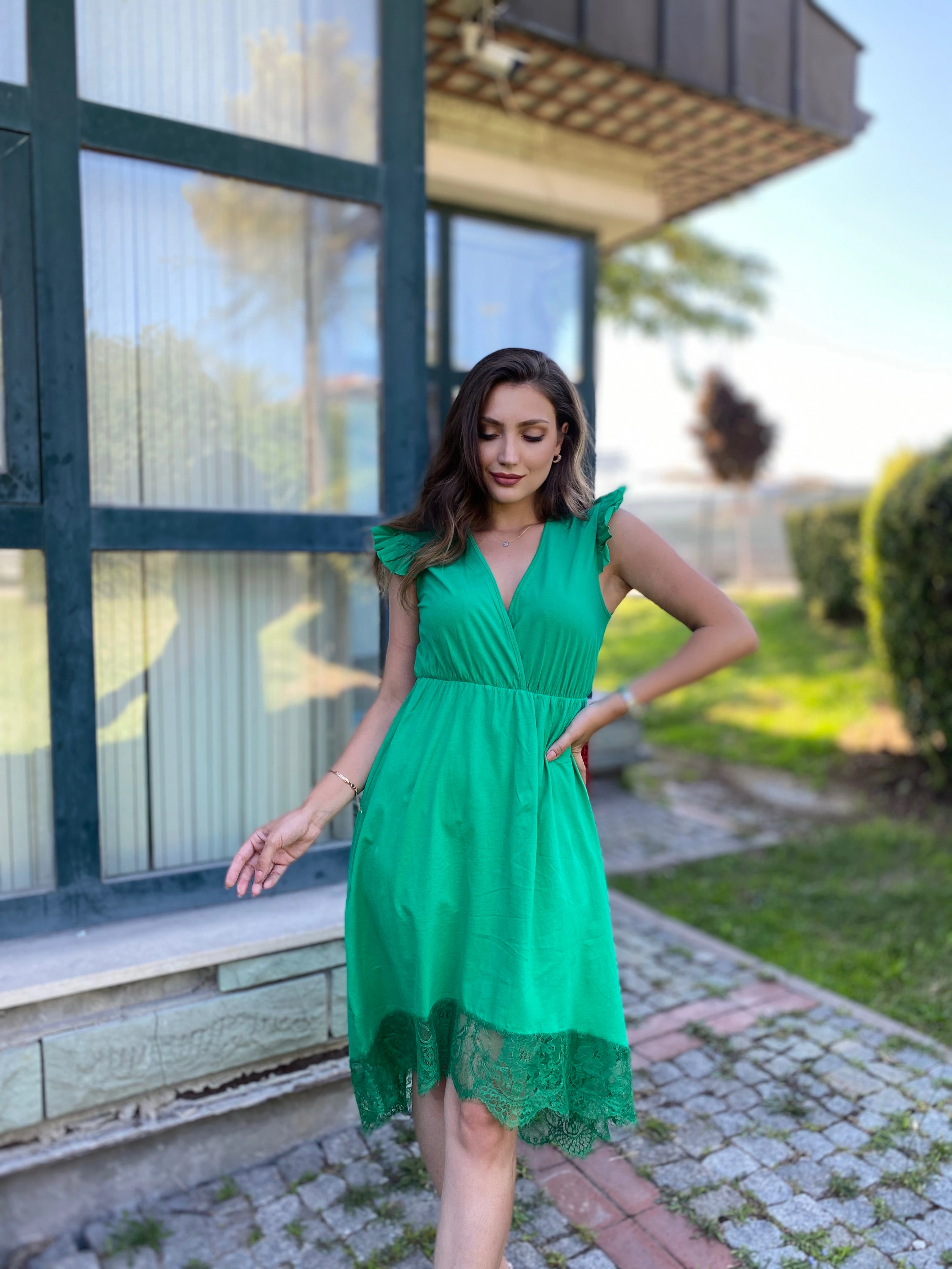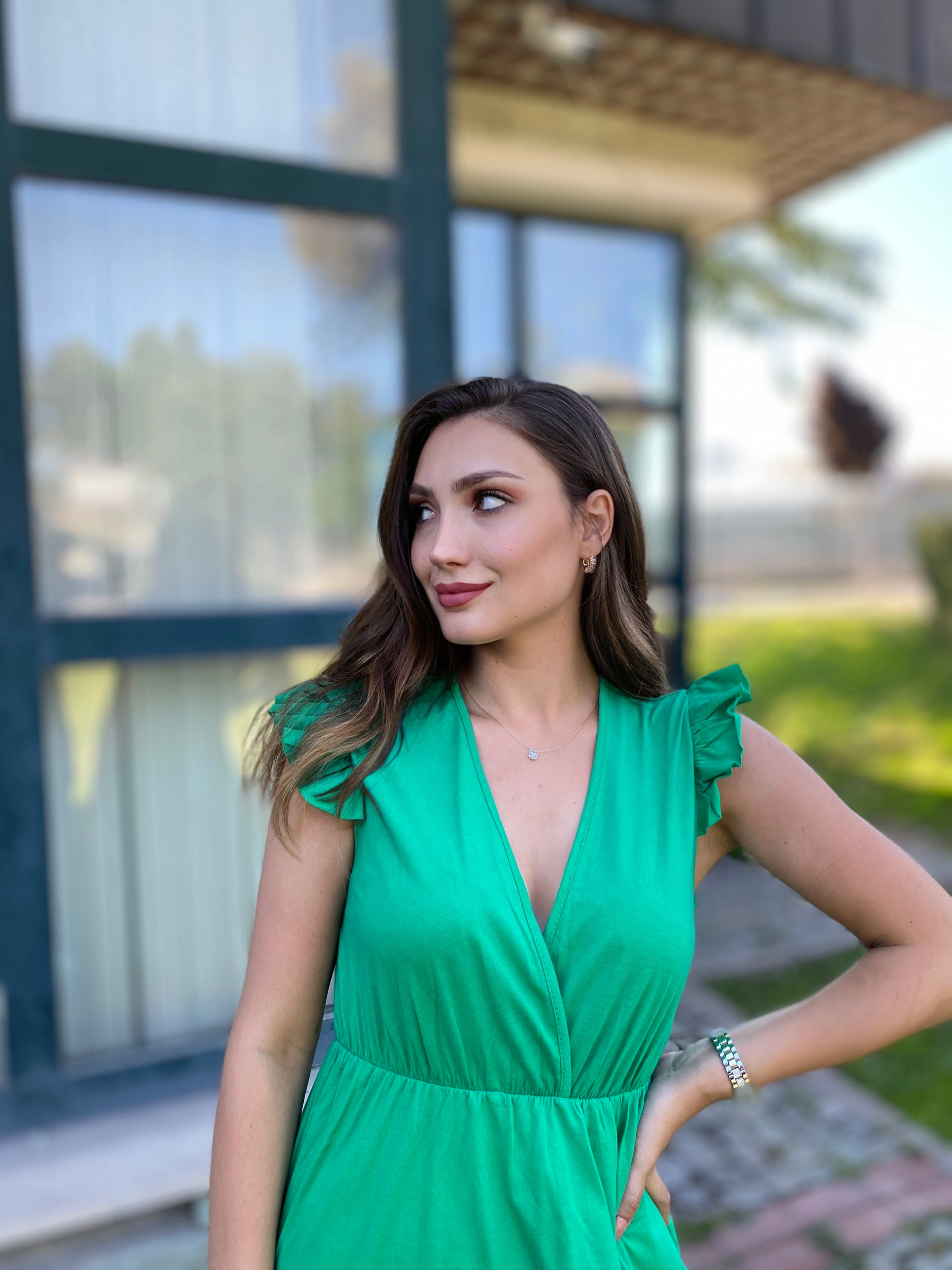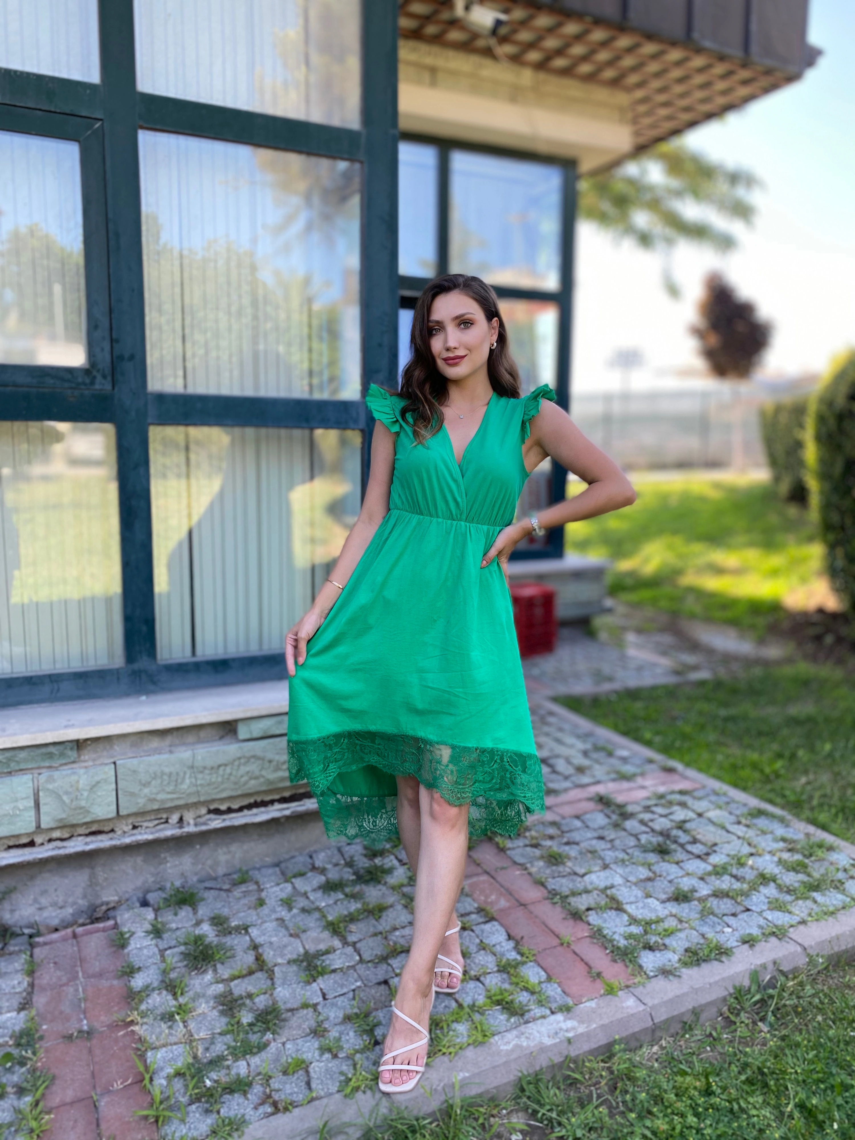 Sırt dekolteli askılı keten elbise yağ yeşili