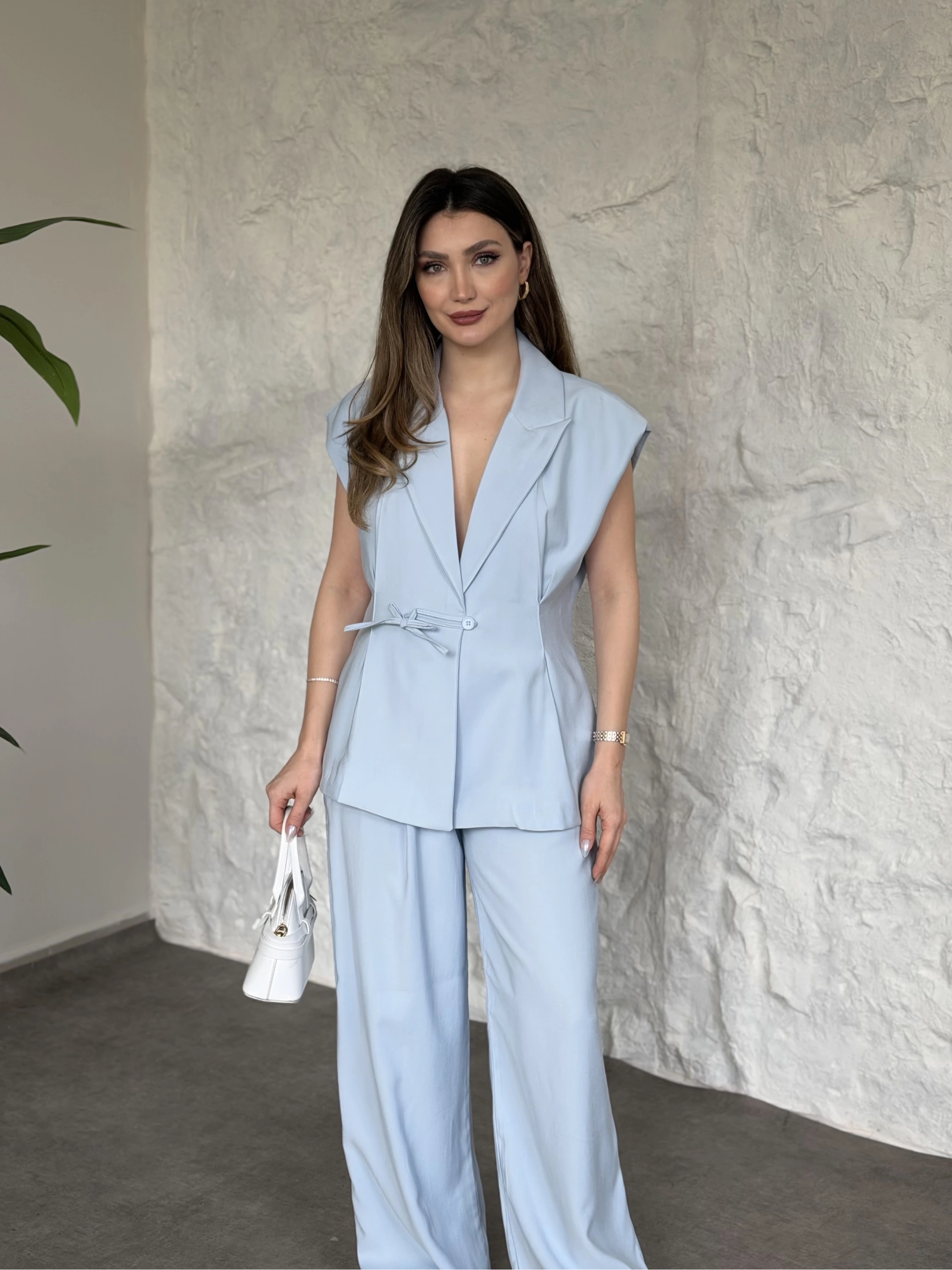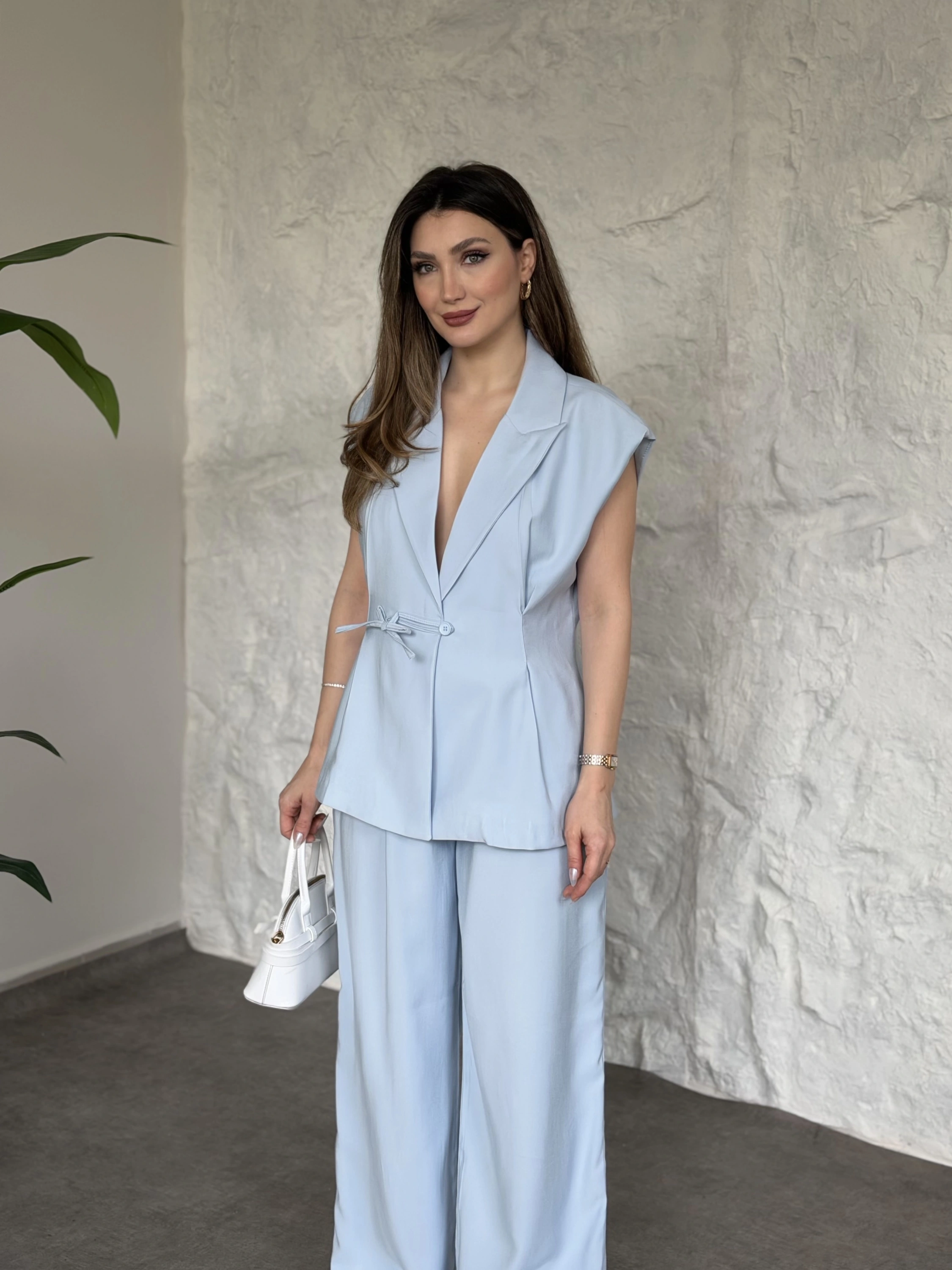 Düğme detaylı yelekli takım kahve