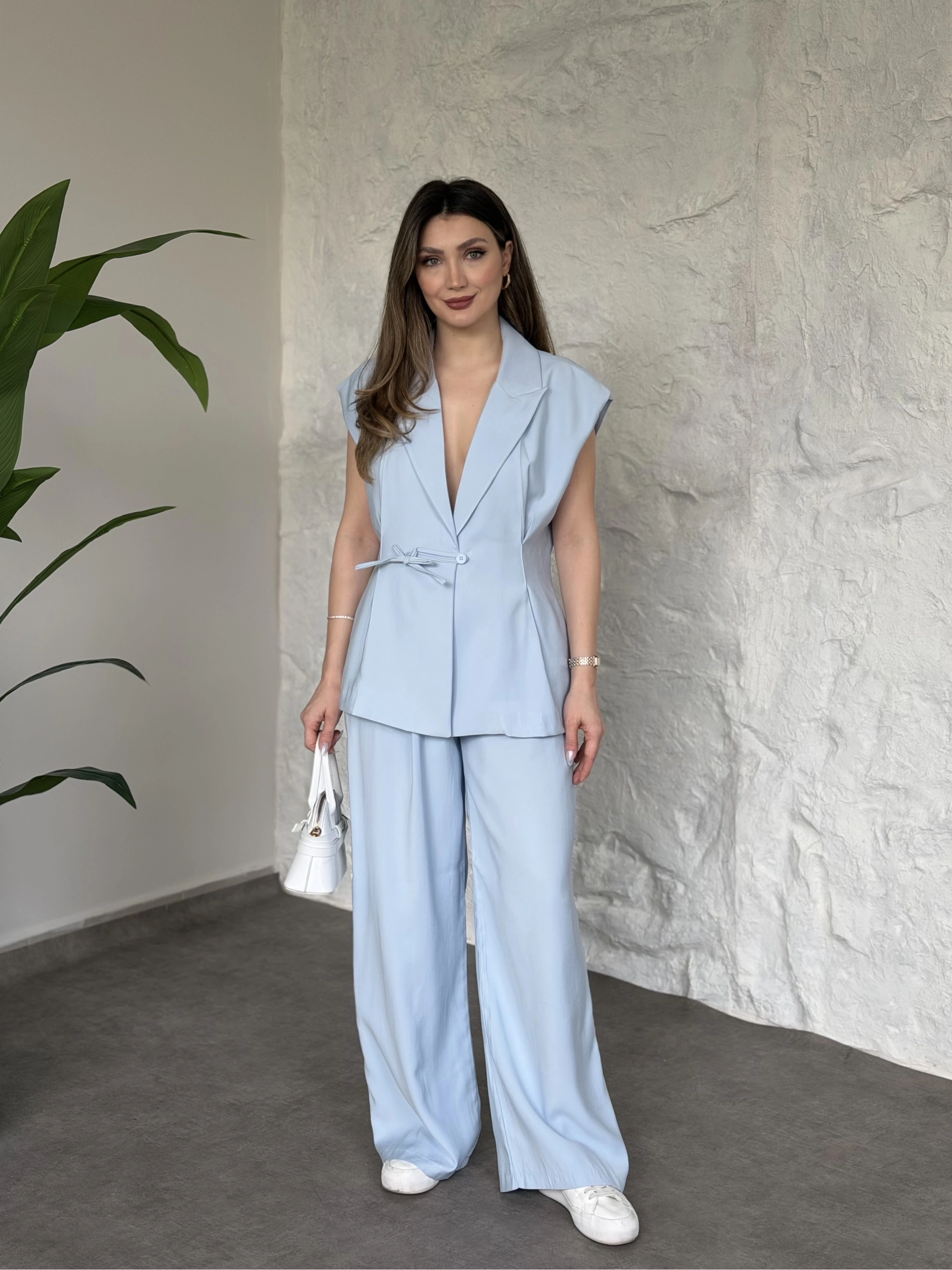Sıfır kol belden bağlamalı kumaş takım siyah