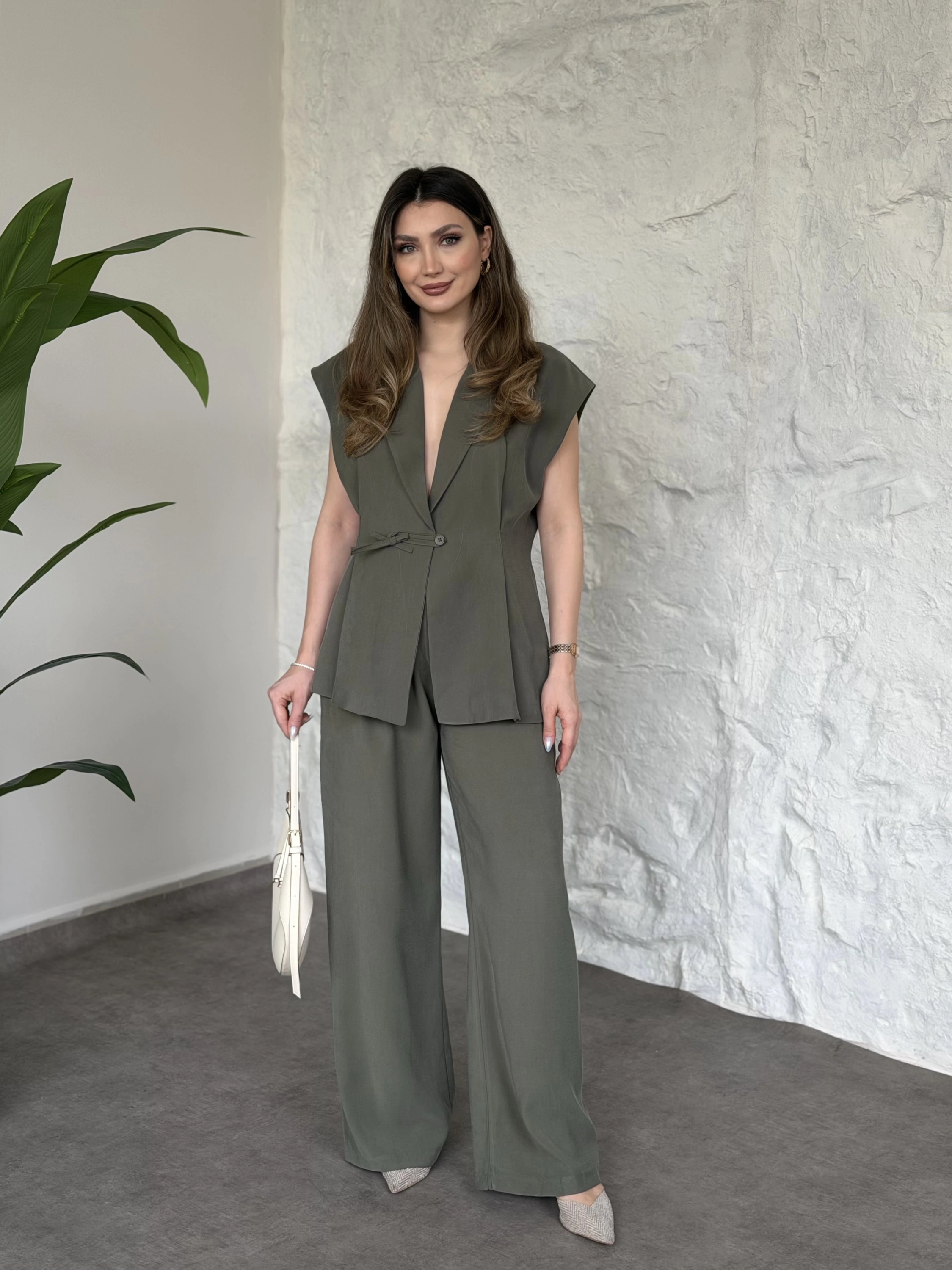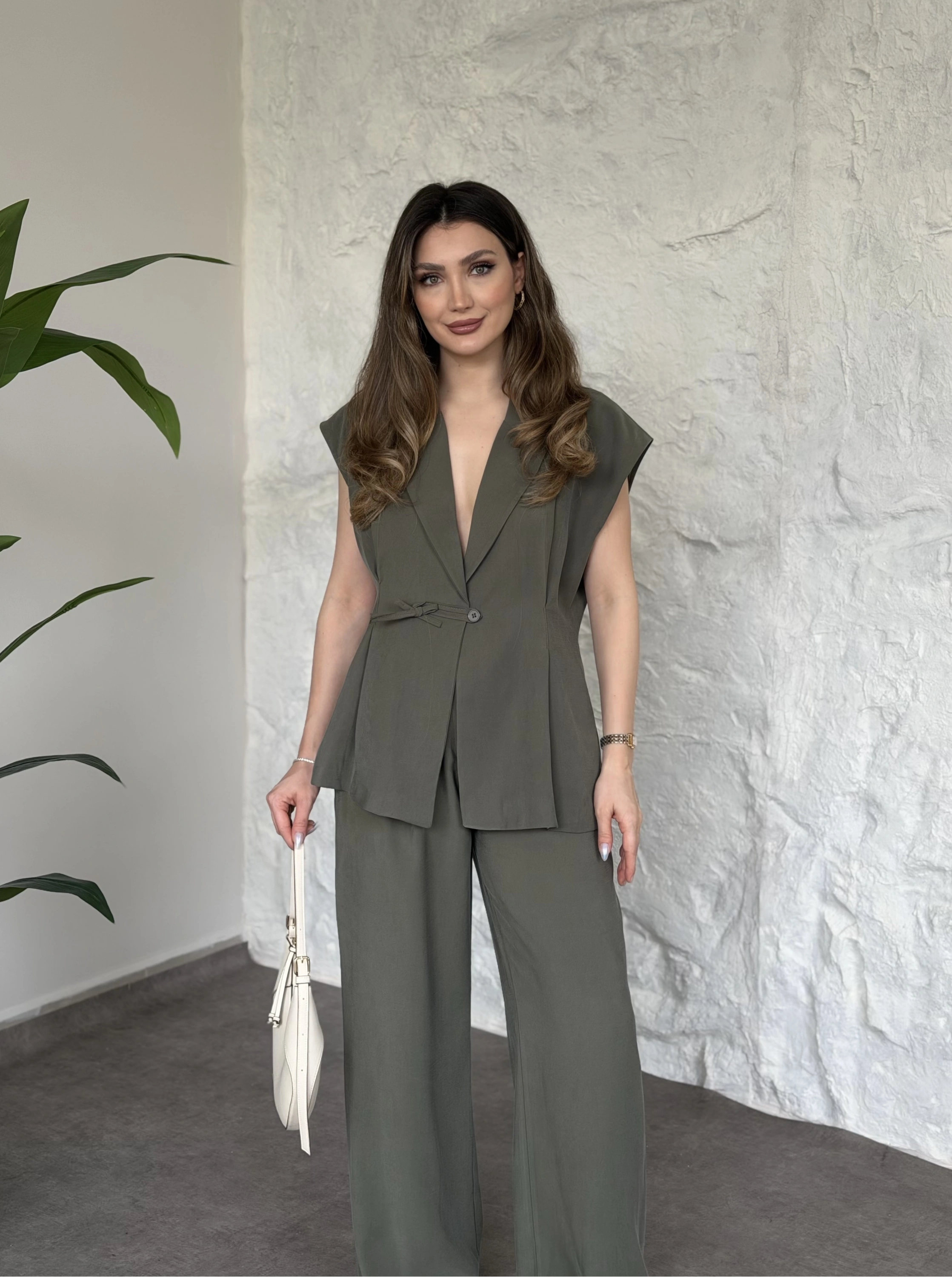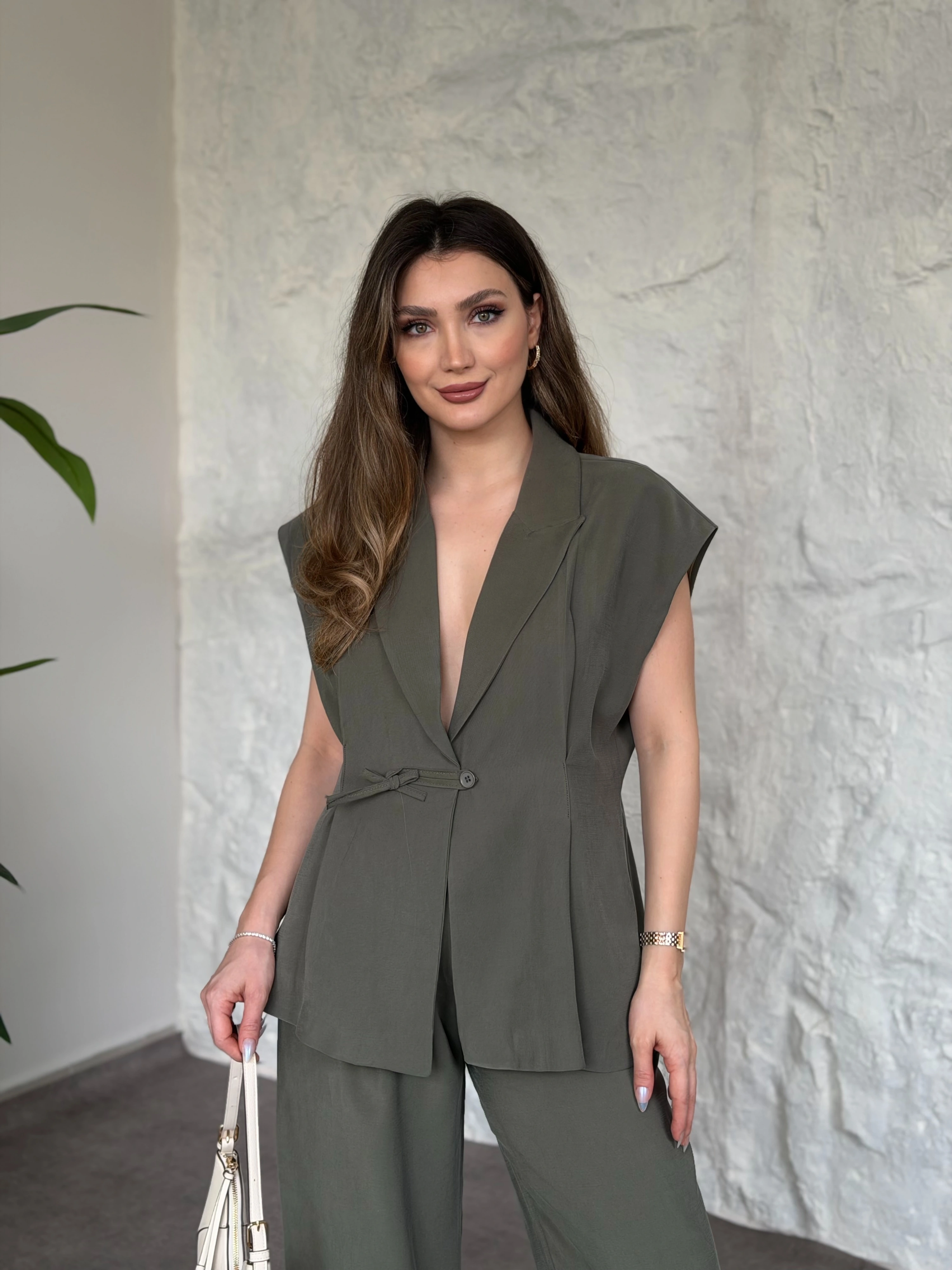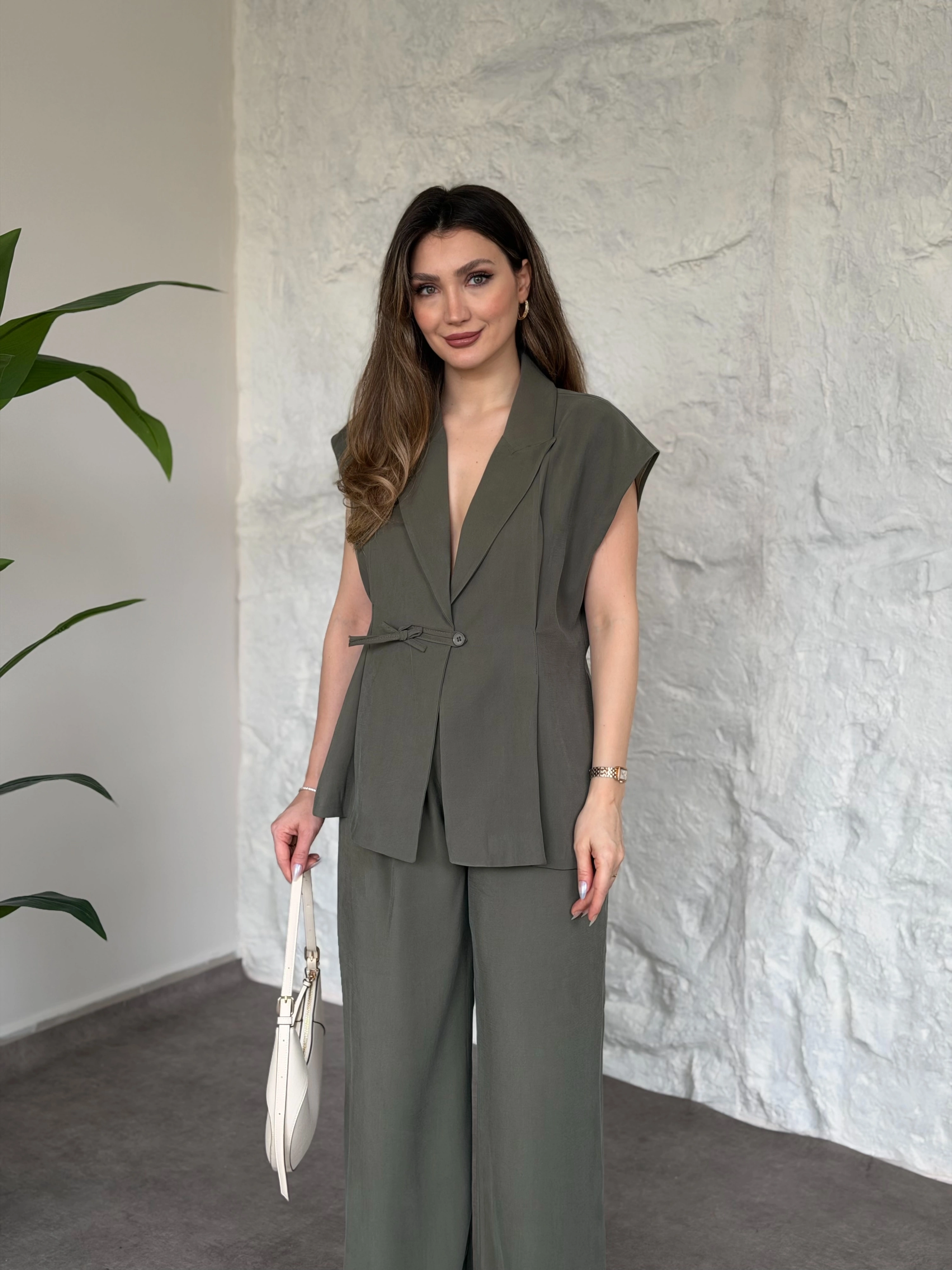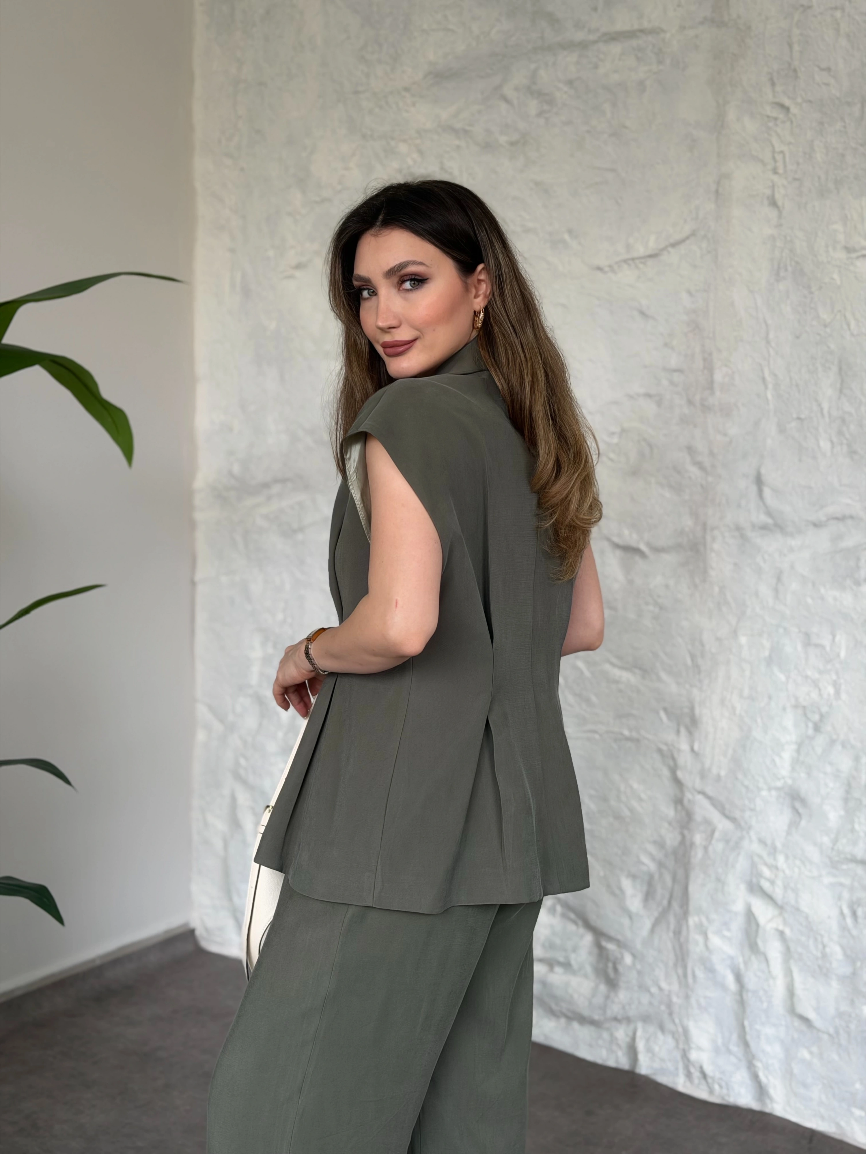 Düğme detaylı yelekli takım kahve