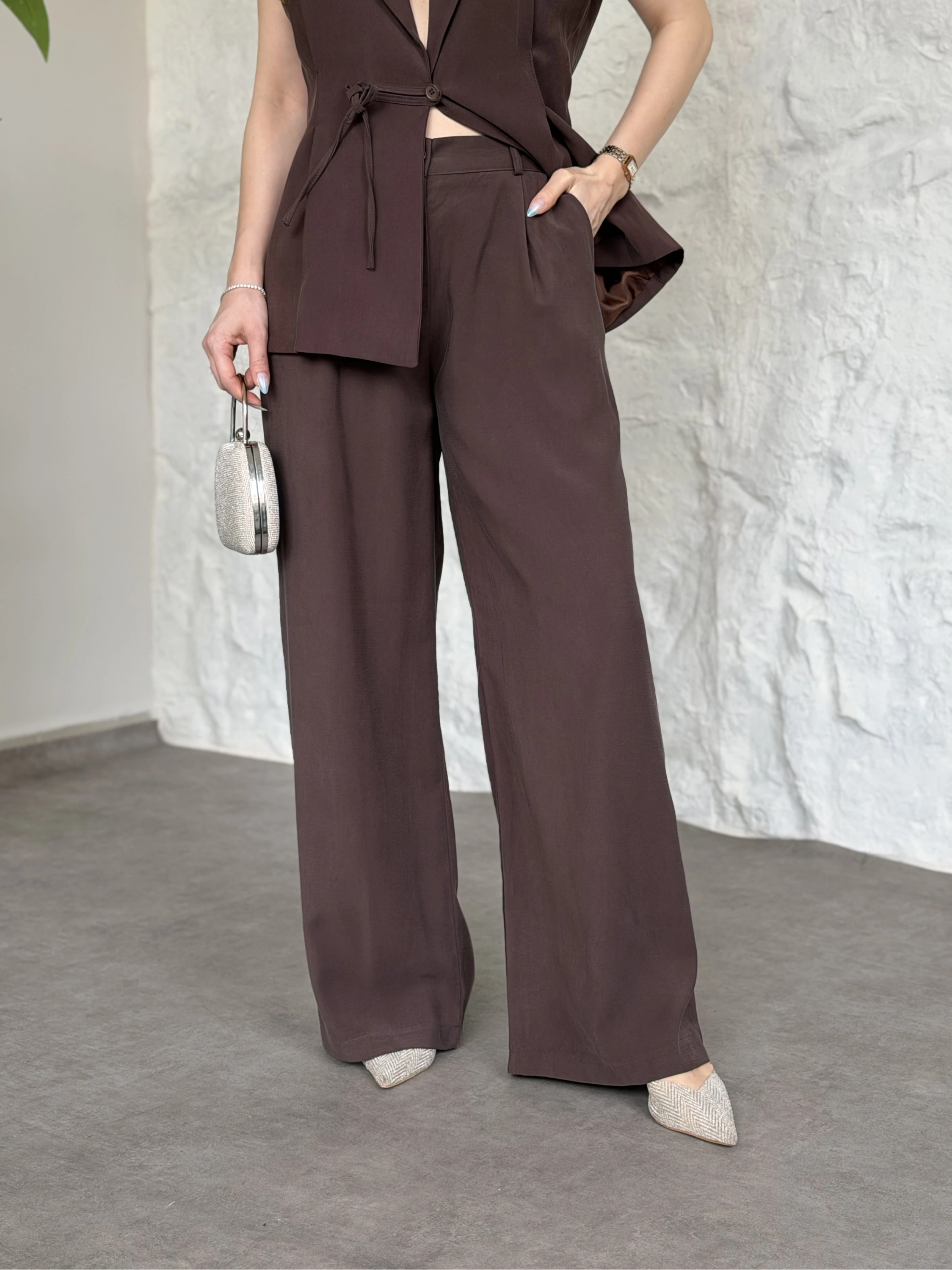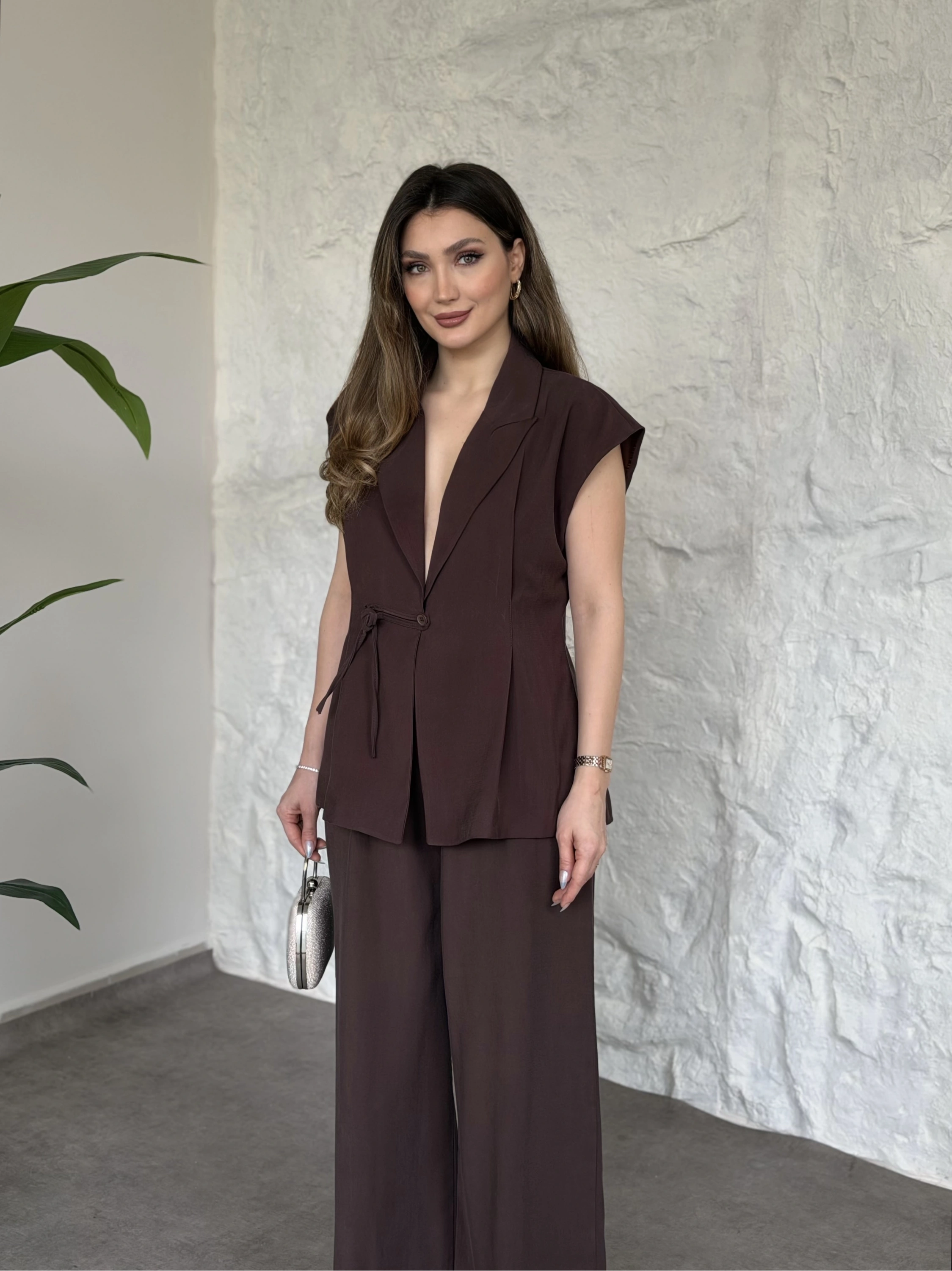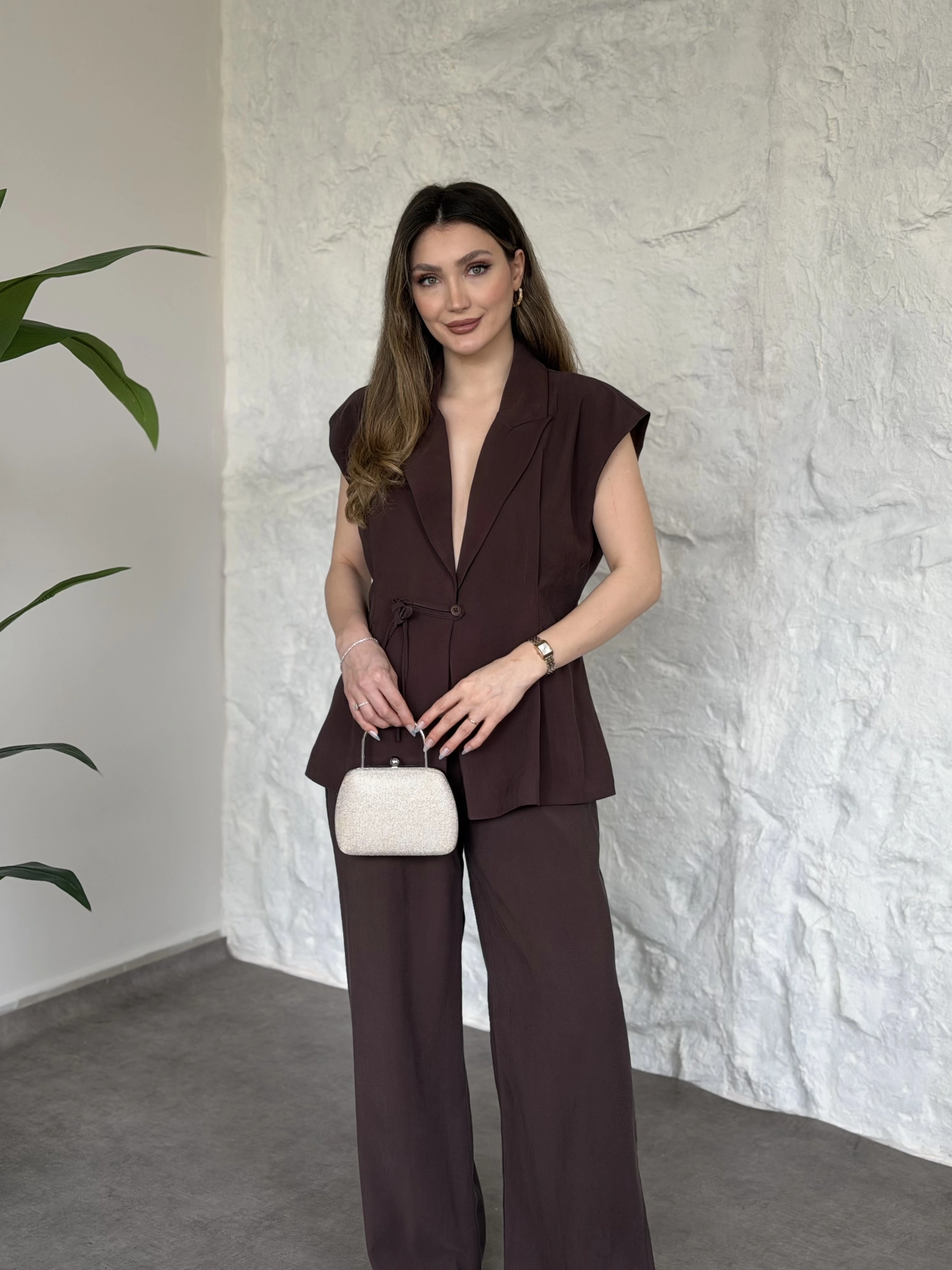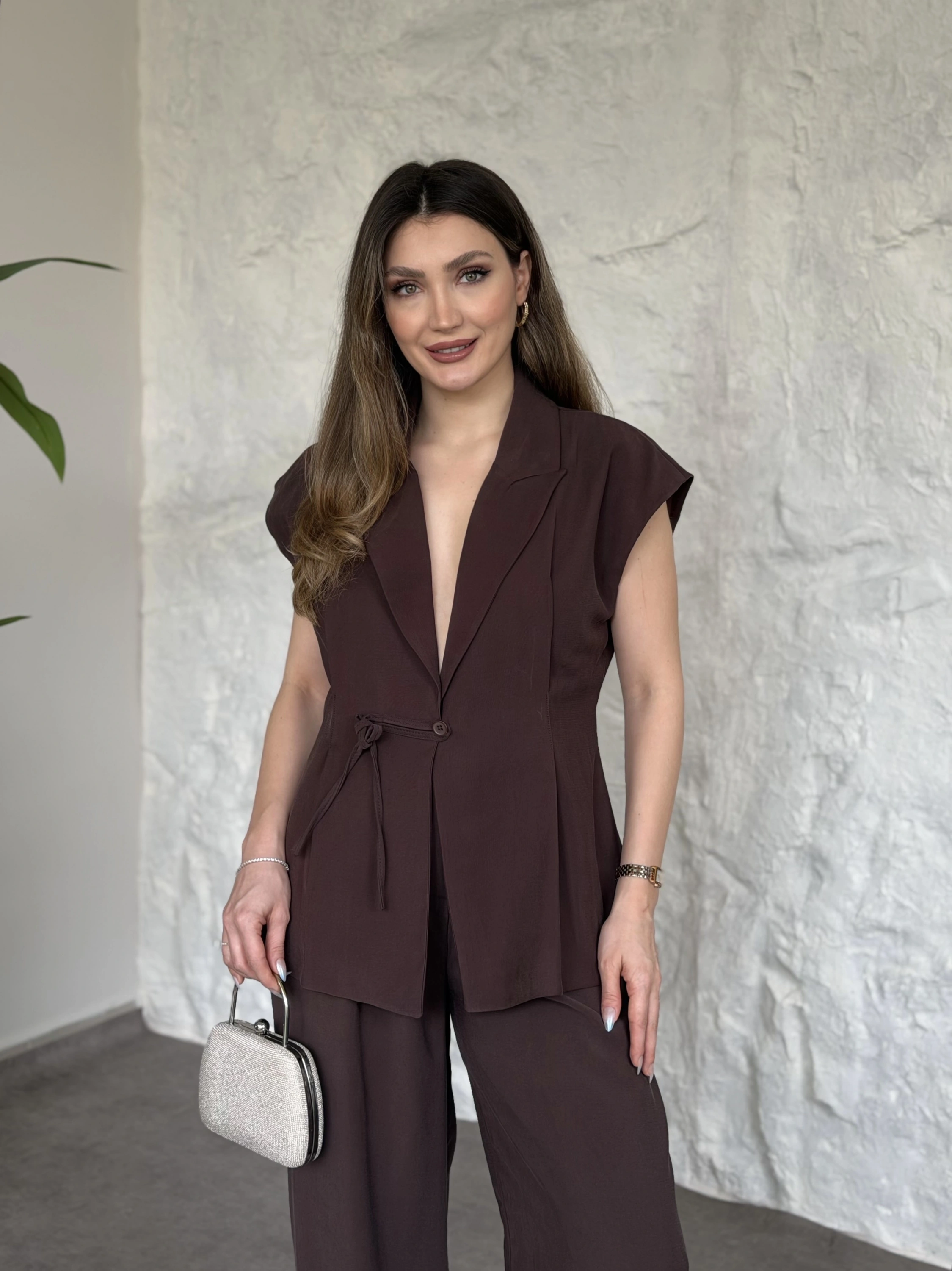 Sıfır kol belden bağlamalı kumaş takım siyah