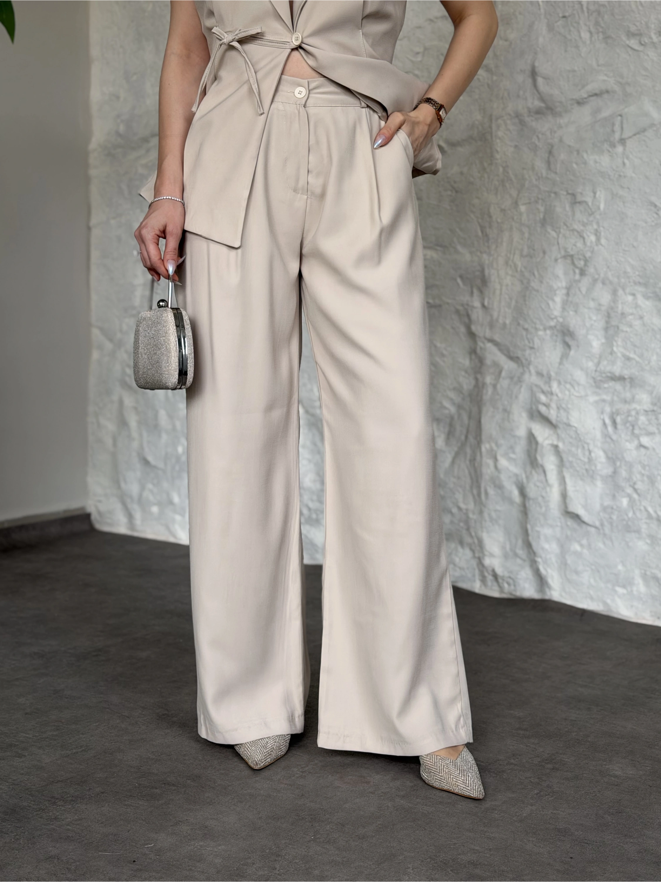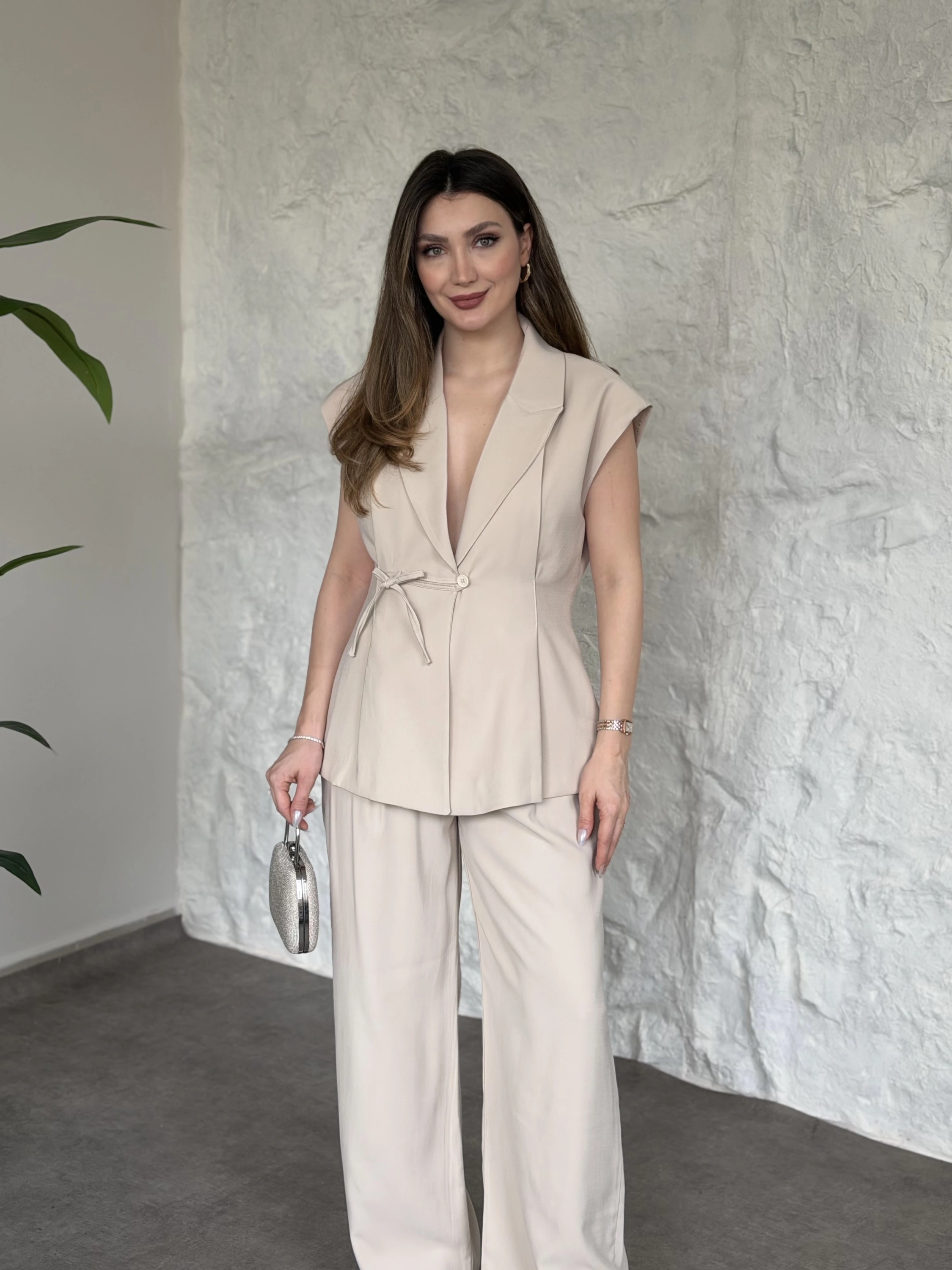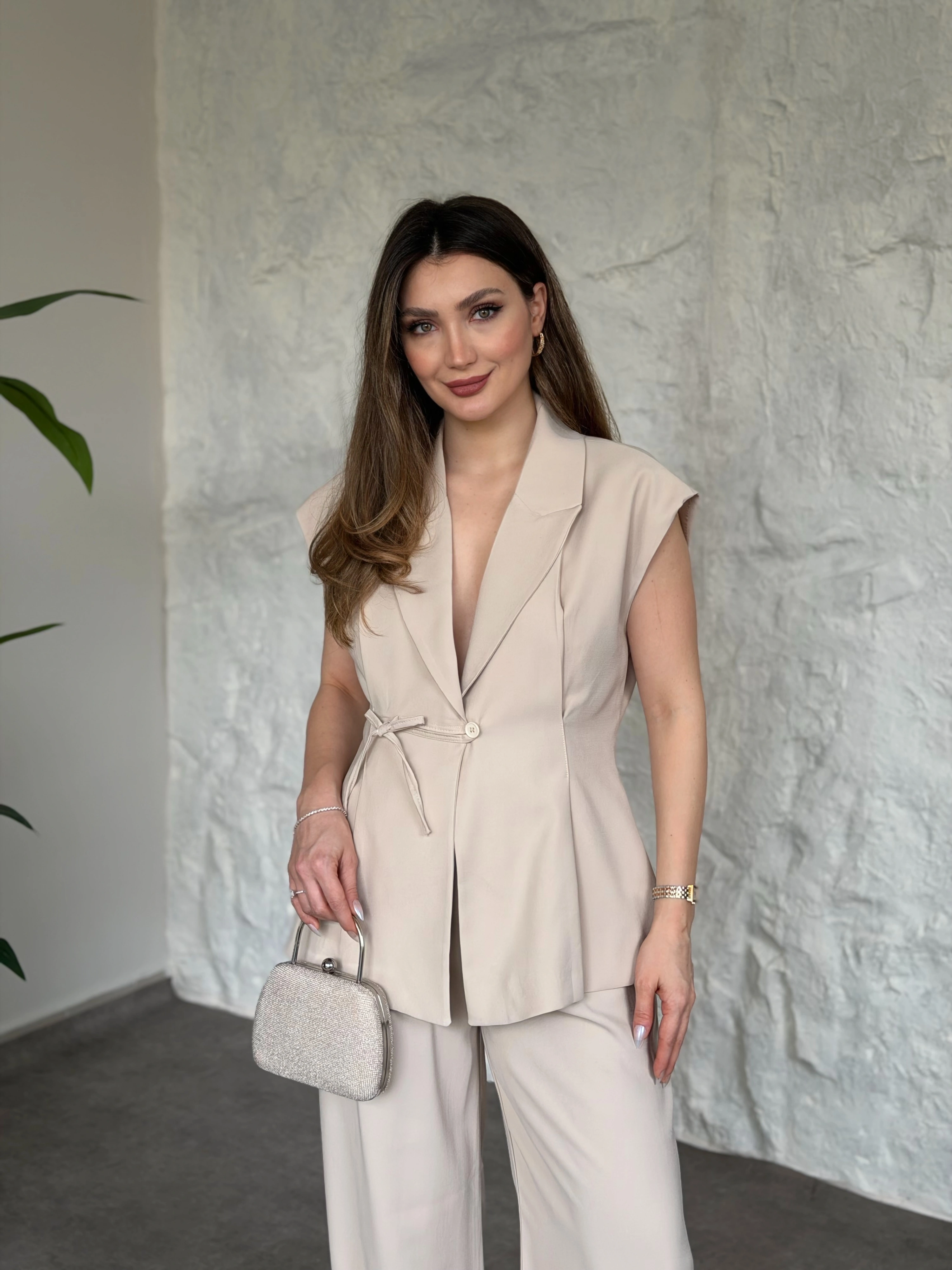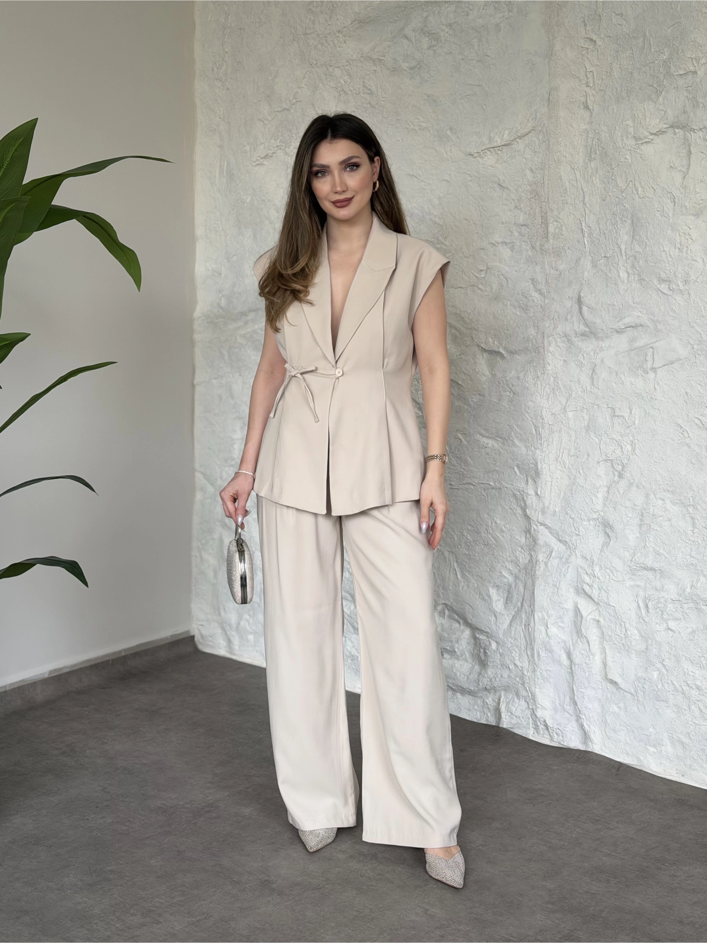 Sıfır kol belden bağlamalı kumaş takım siyah
