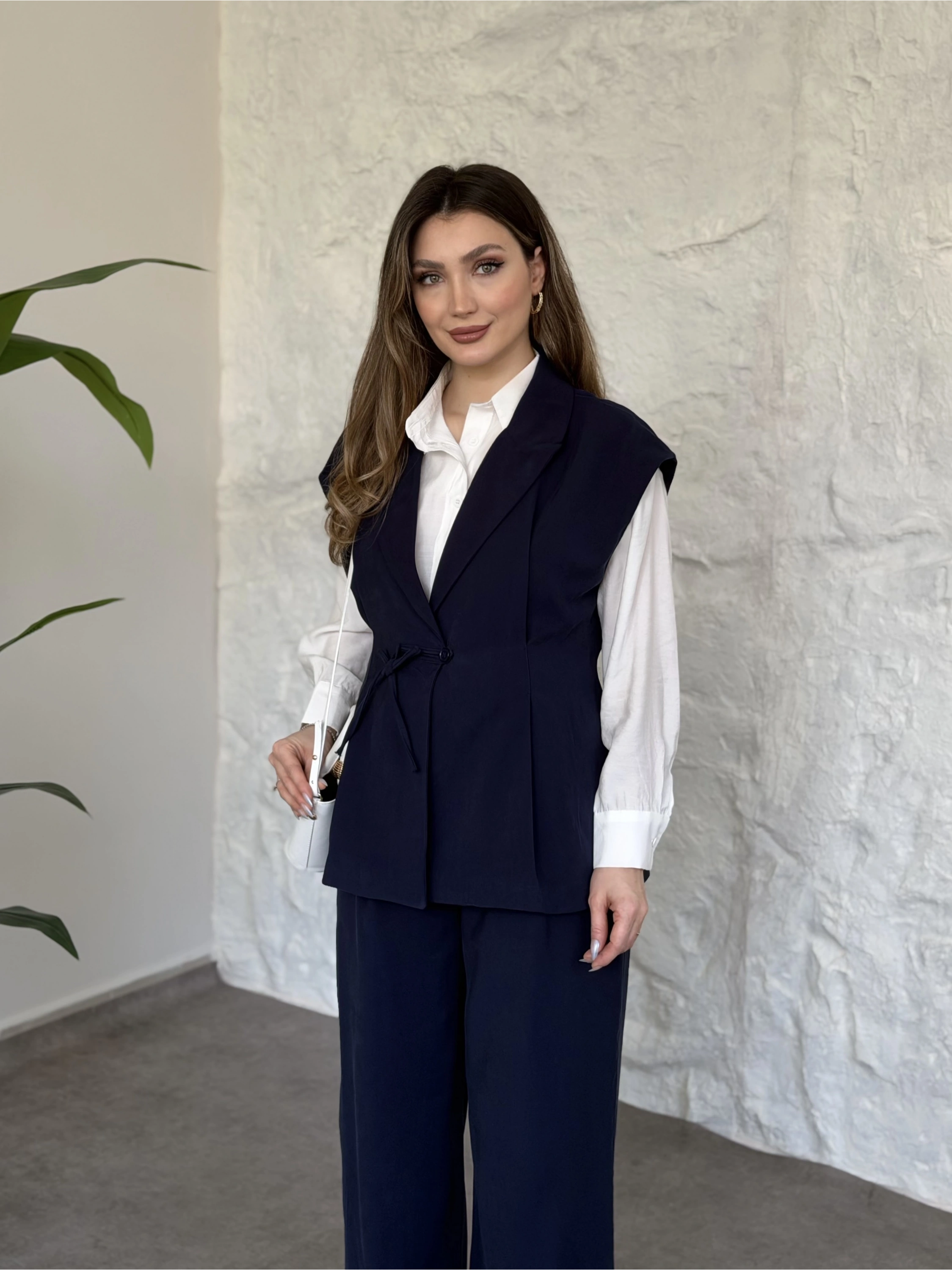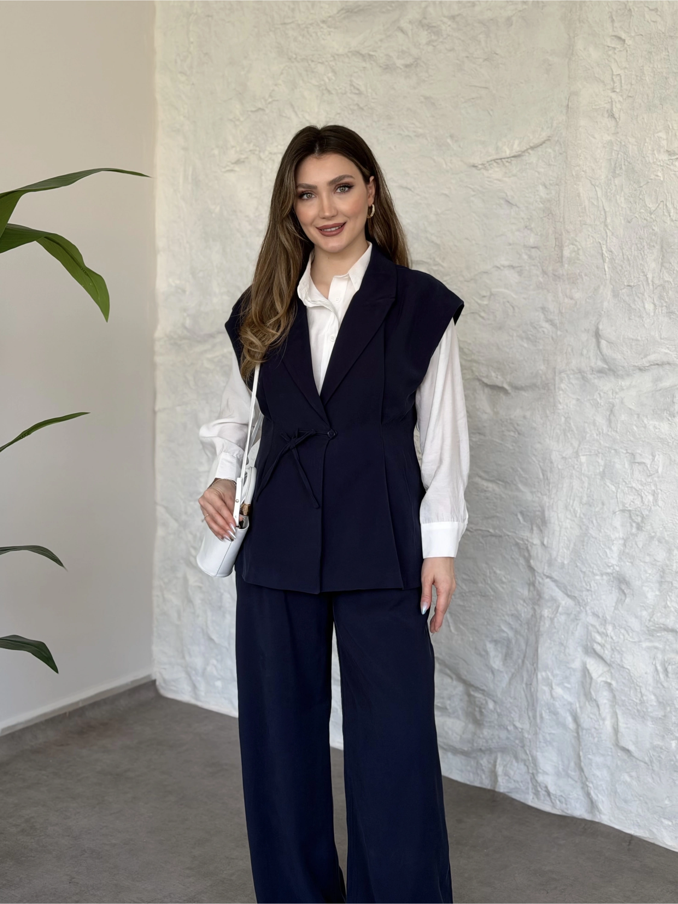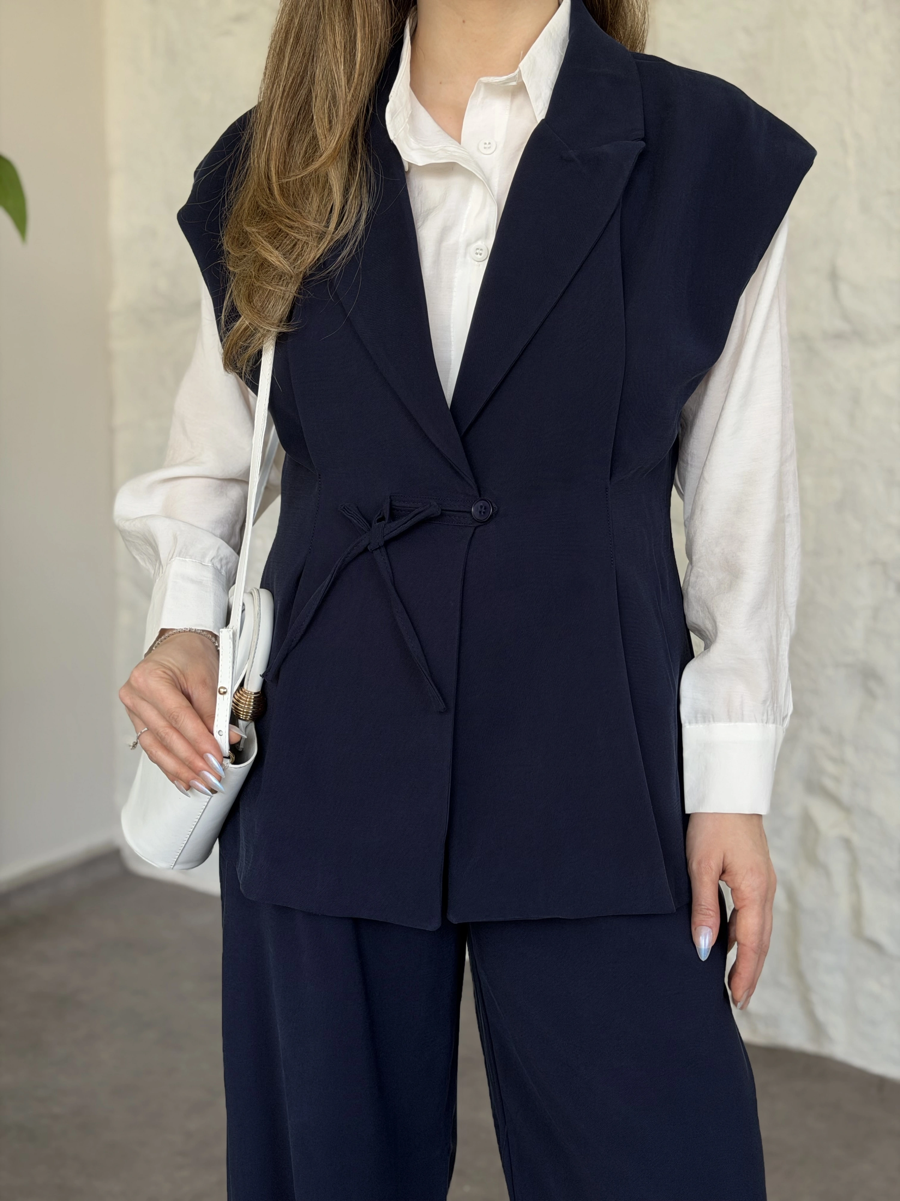 Sıfır kol belden bağlamalı kumaş takım siyah