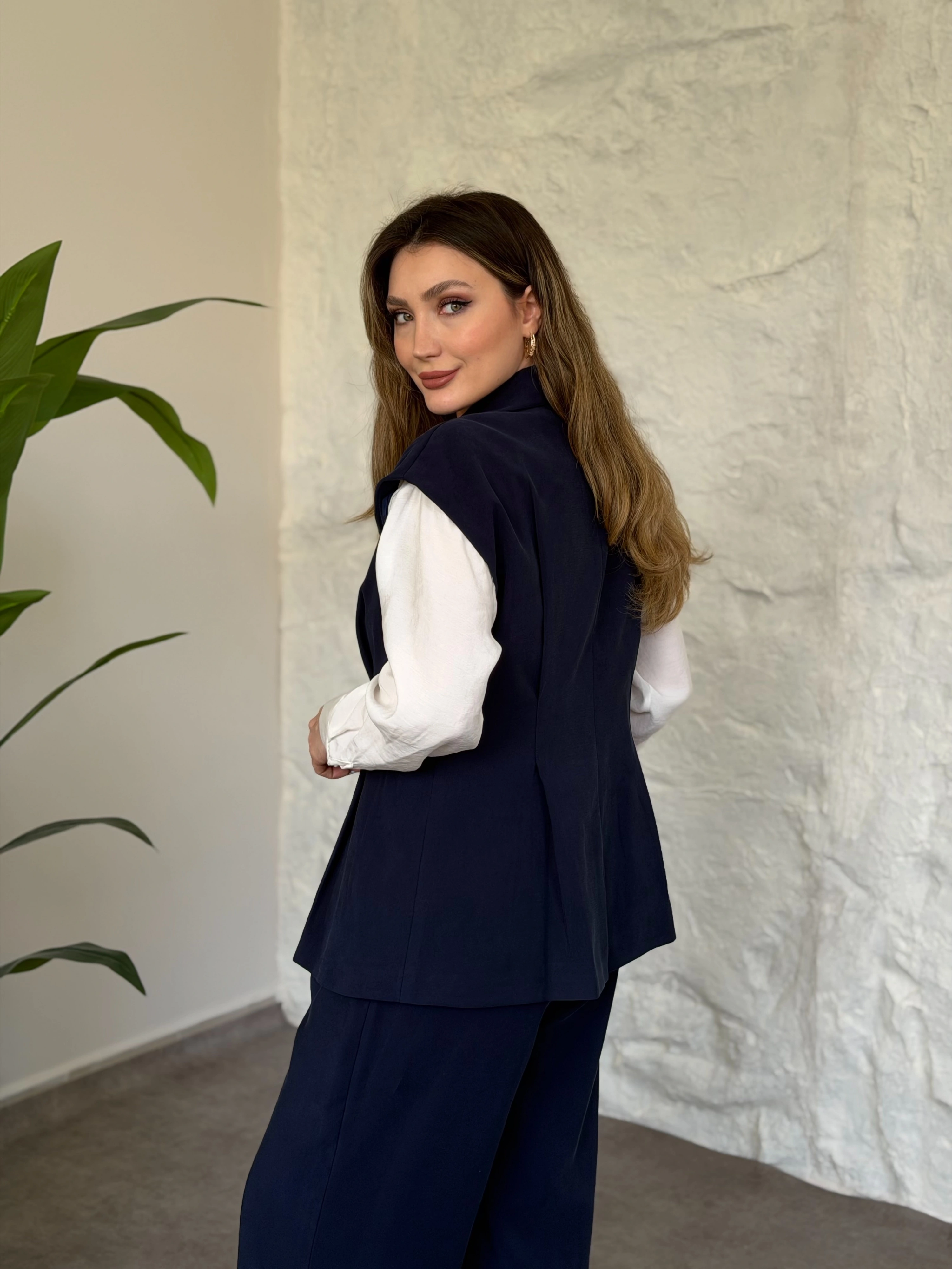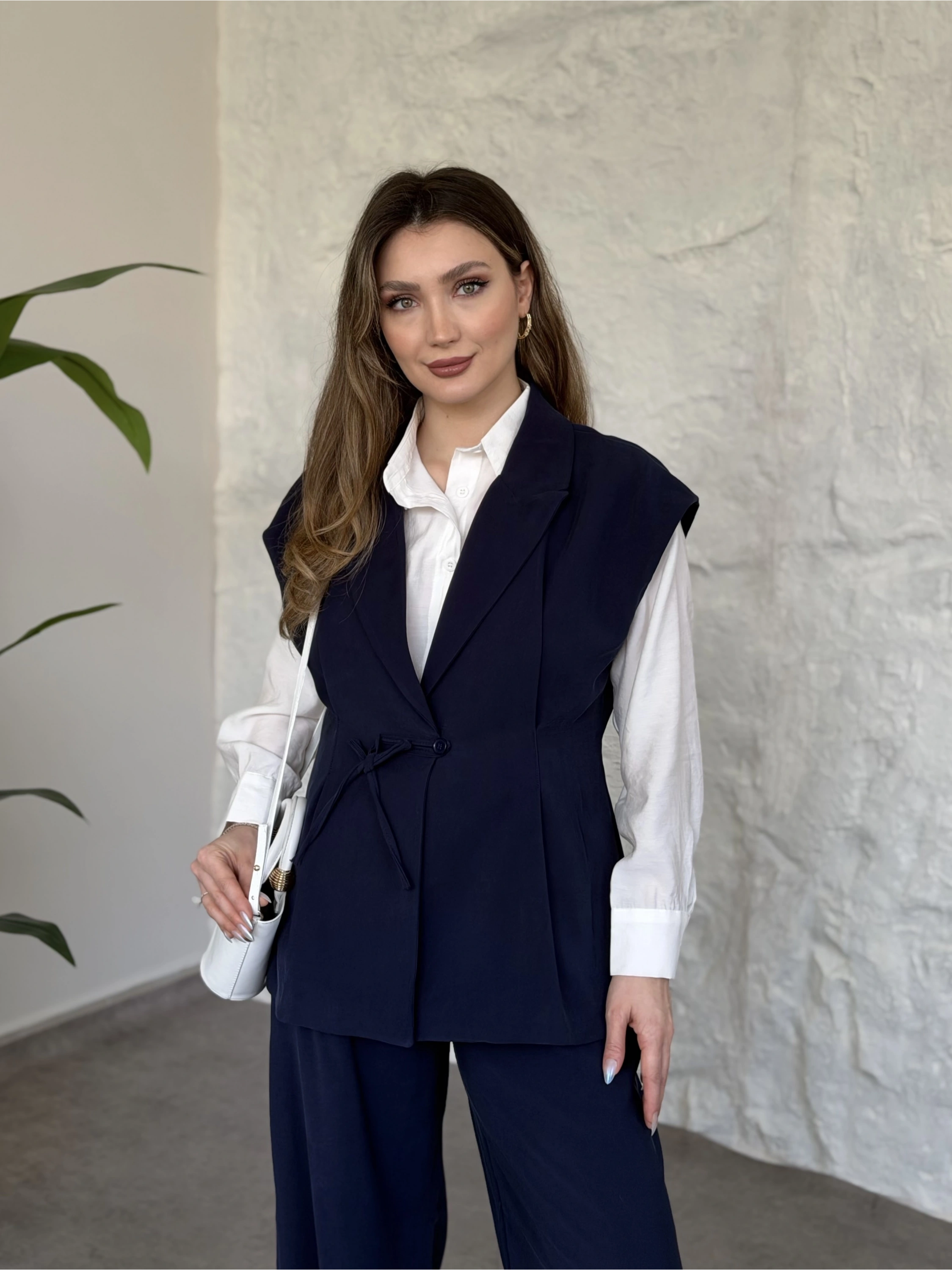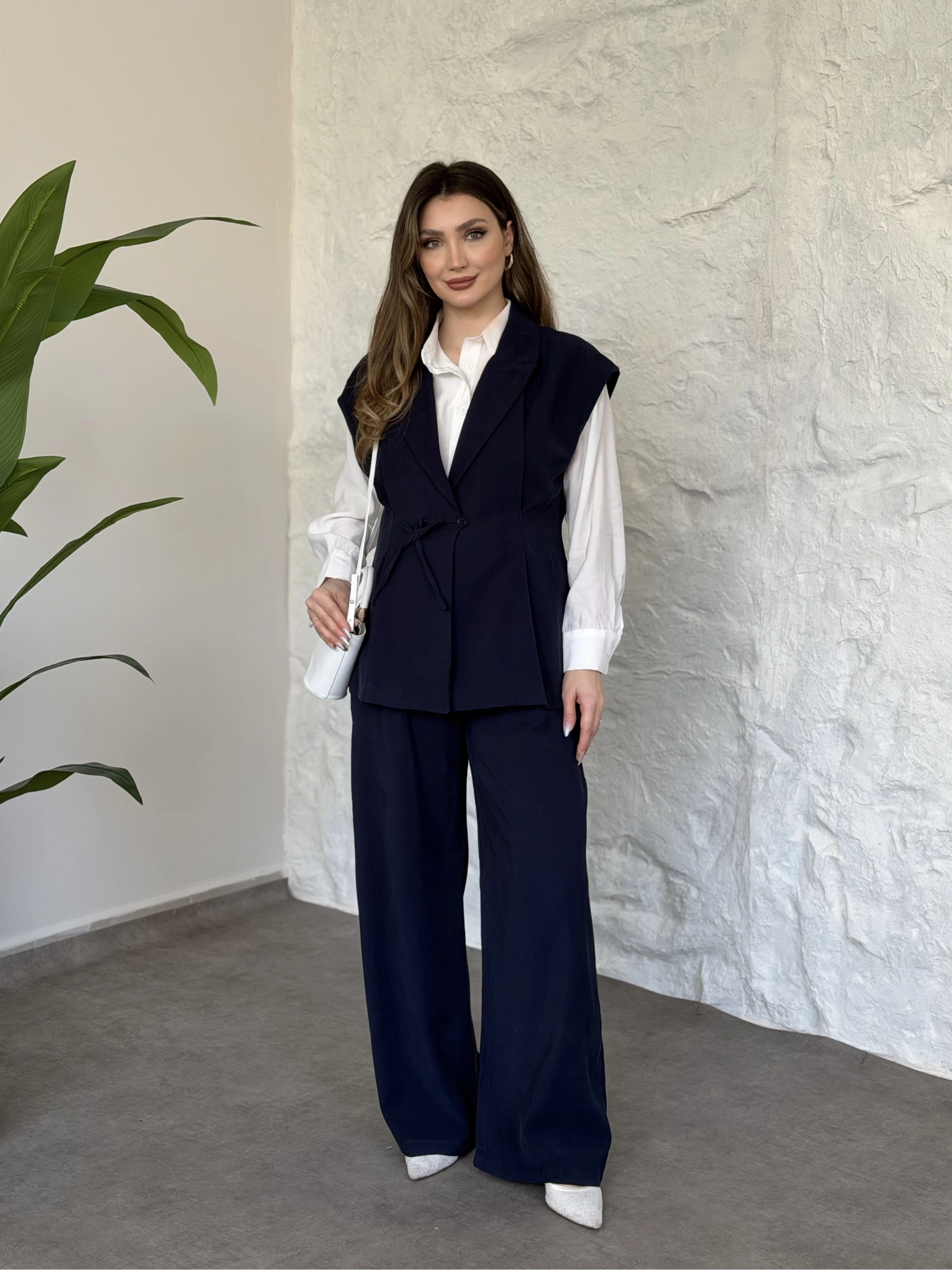 Sıfır kol belden bağlamalı kumaş takım siyah
