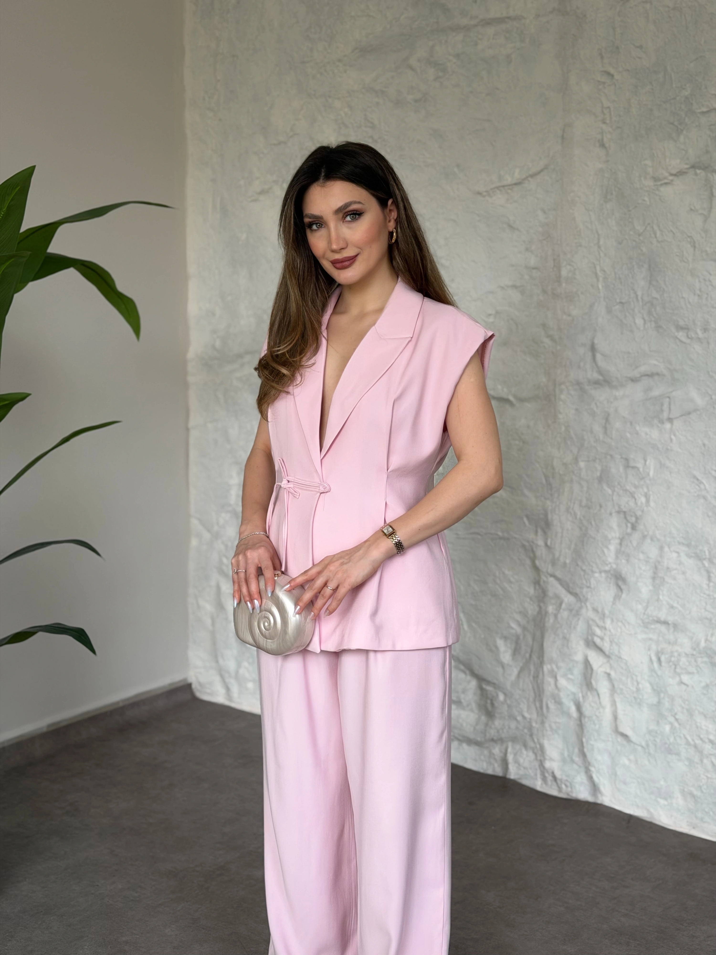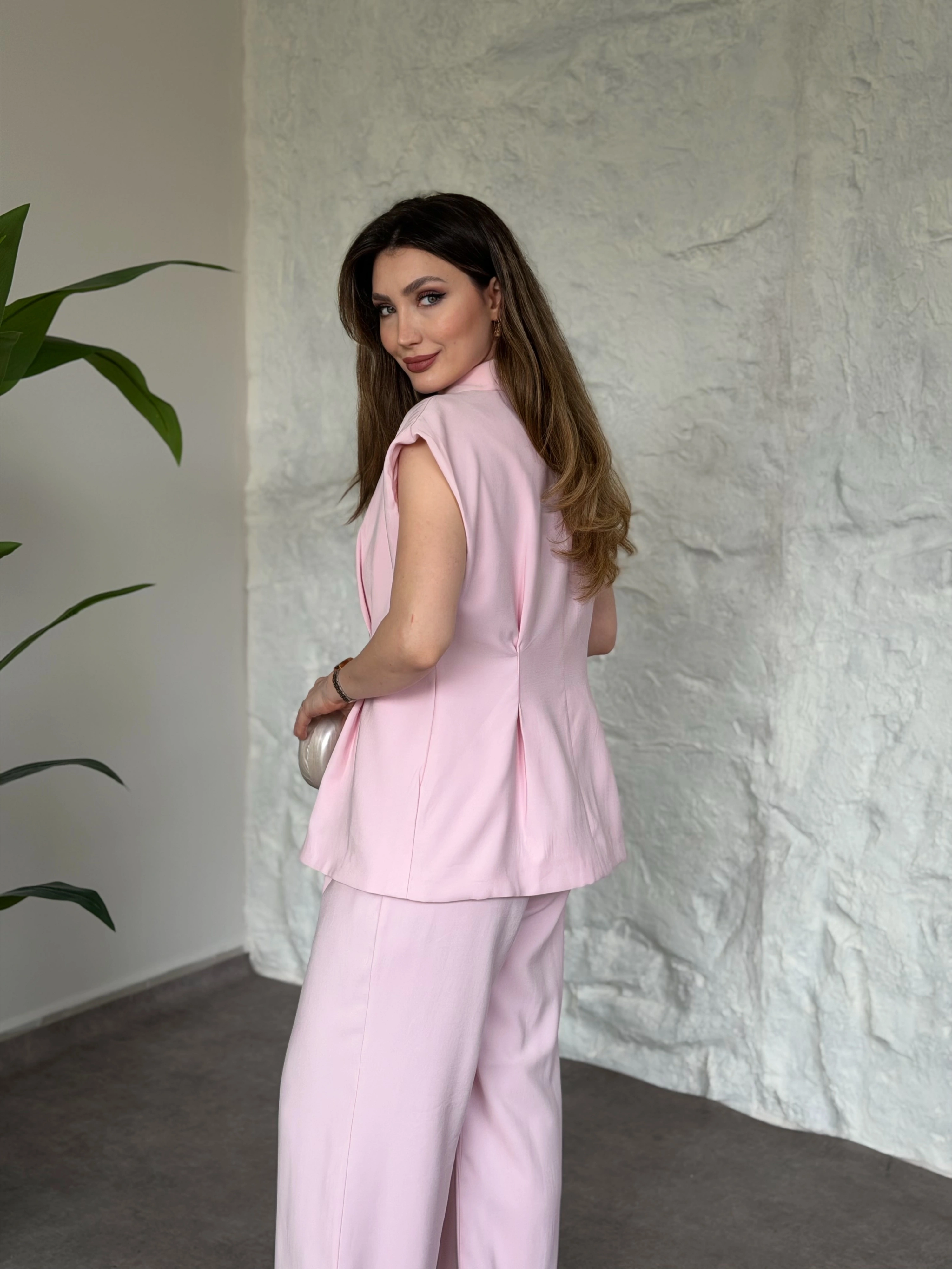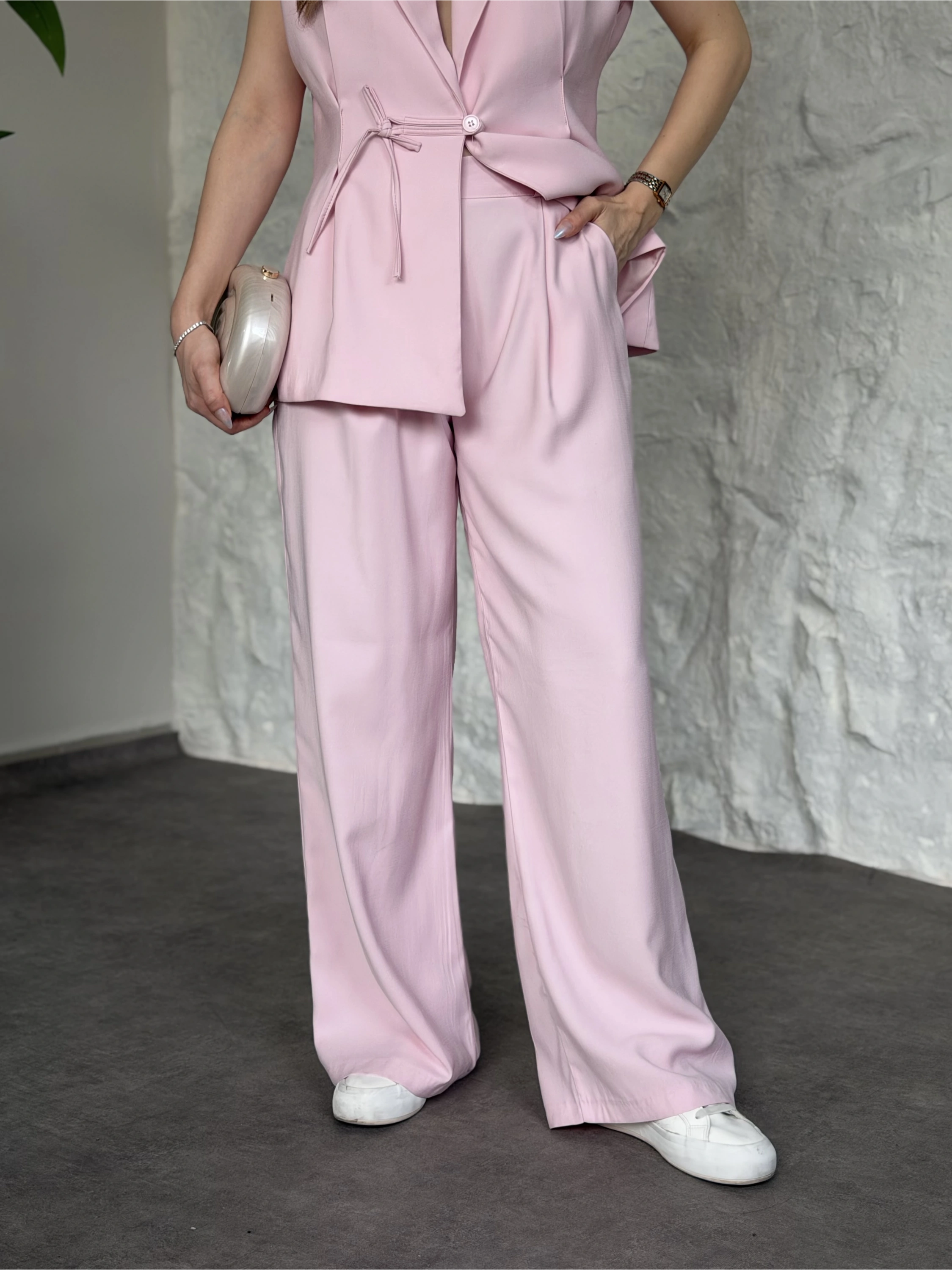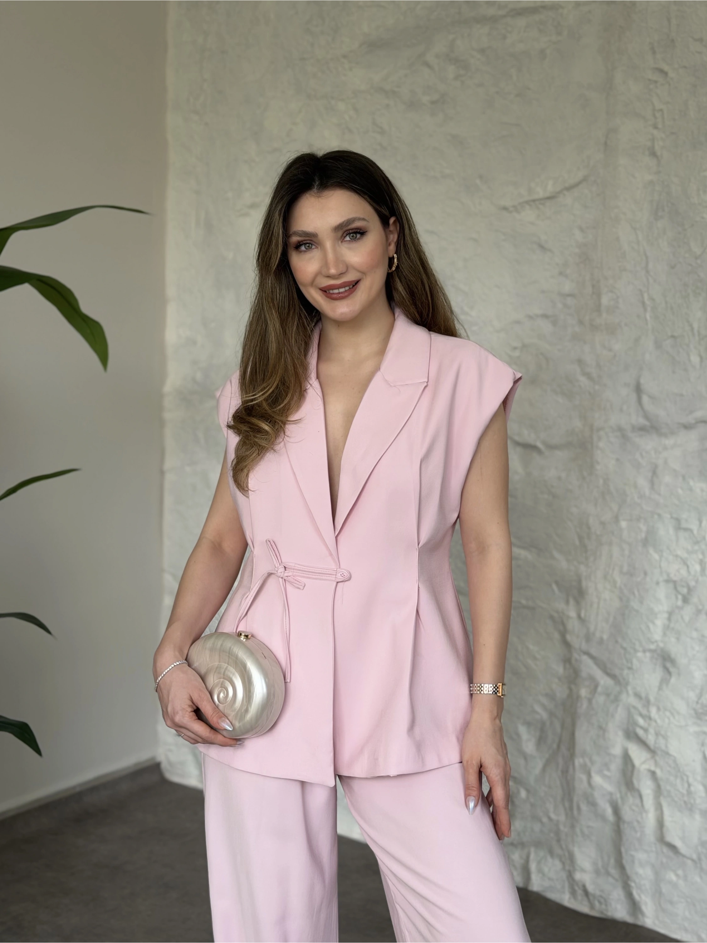 Sıfır kol belden bağlamalı kumaş takım siyah