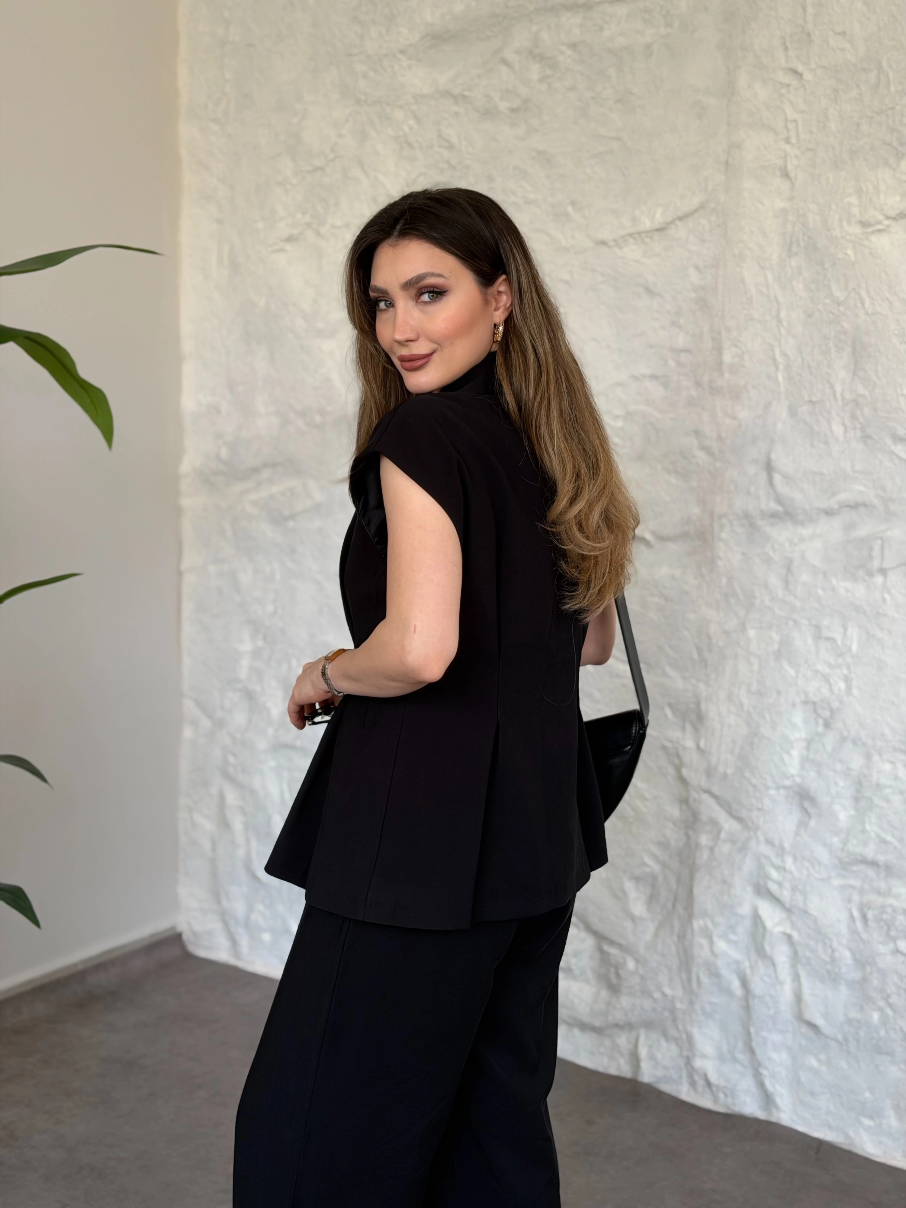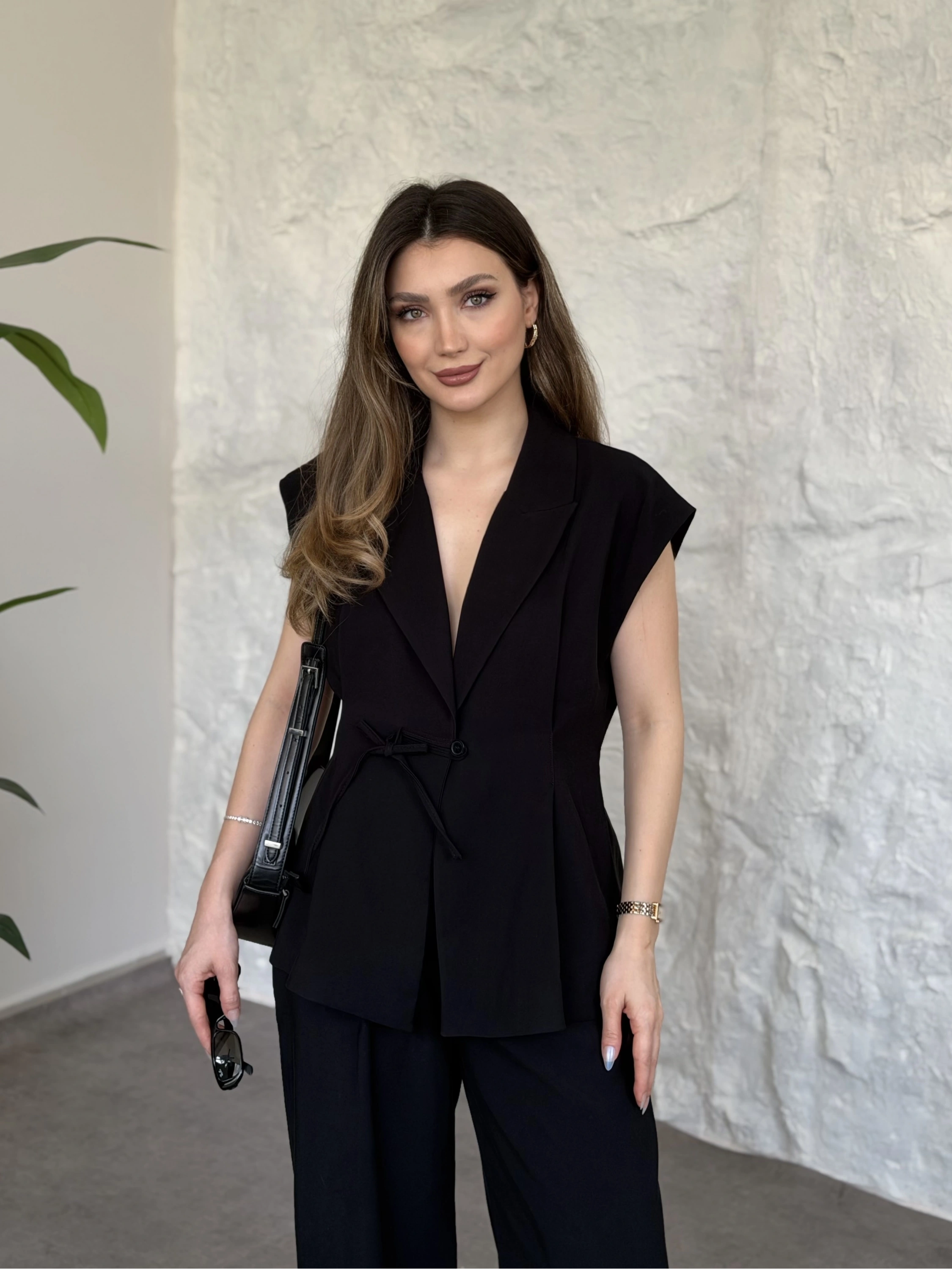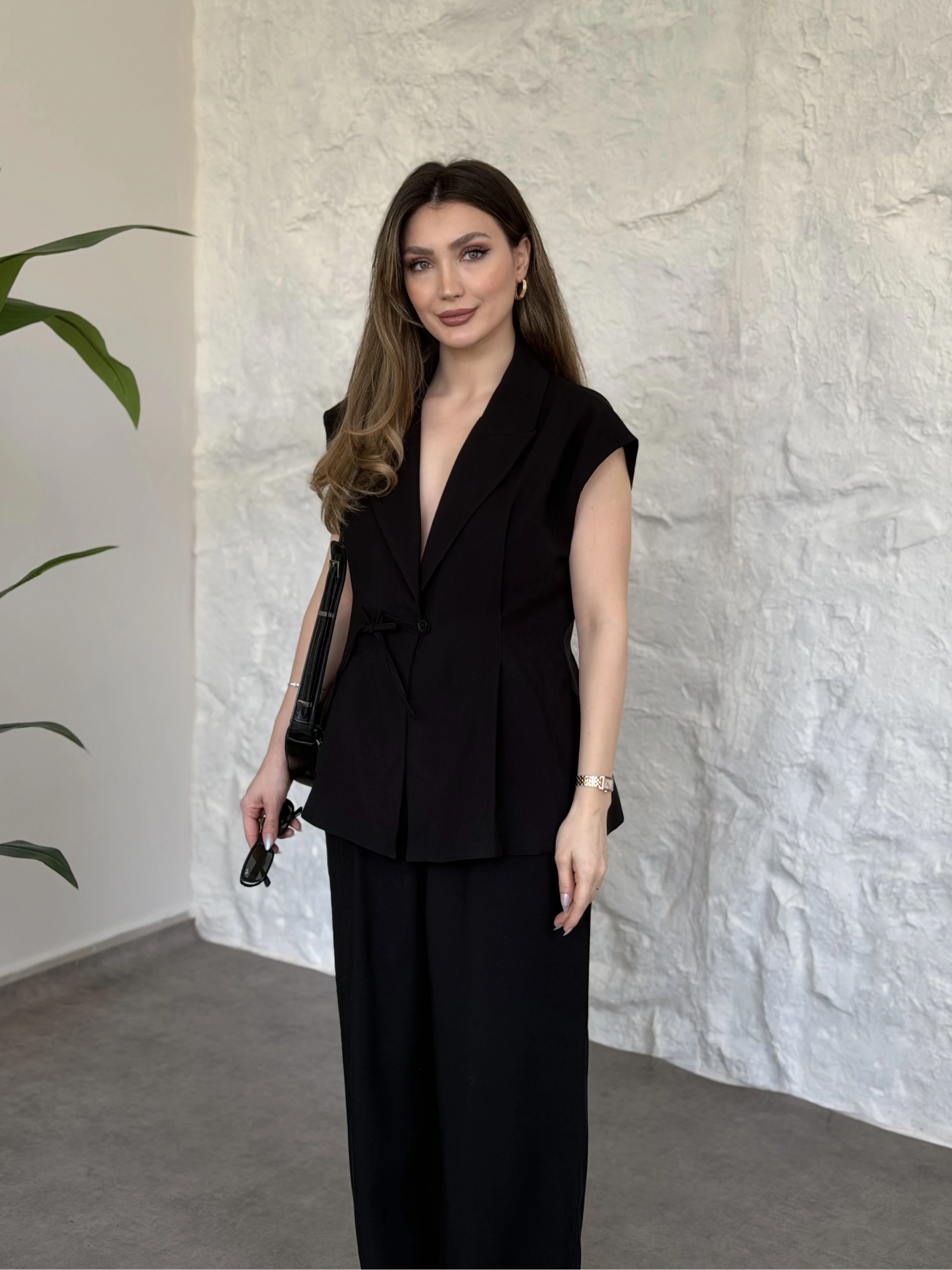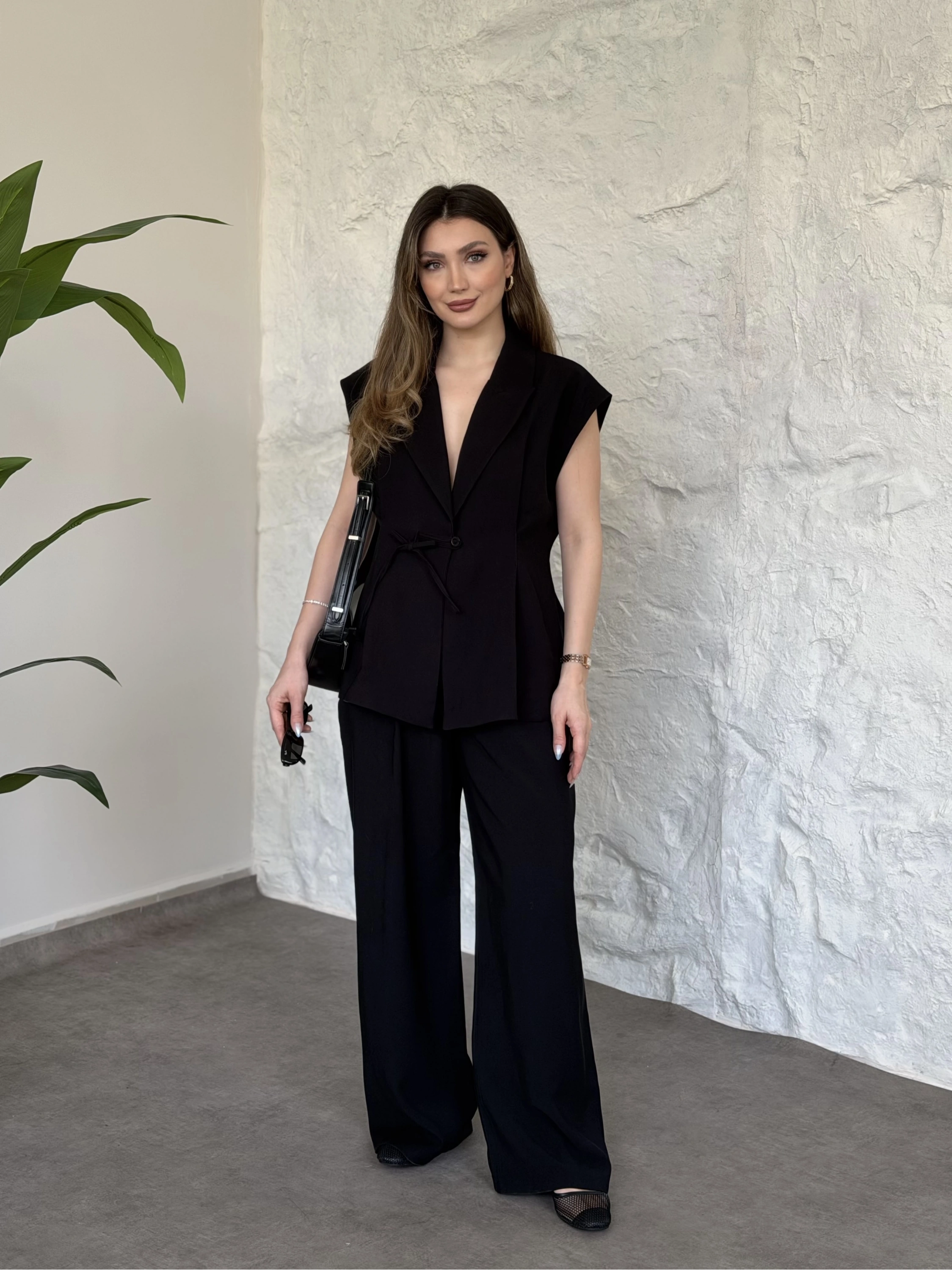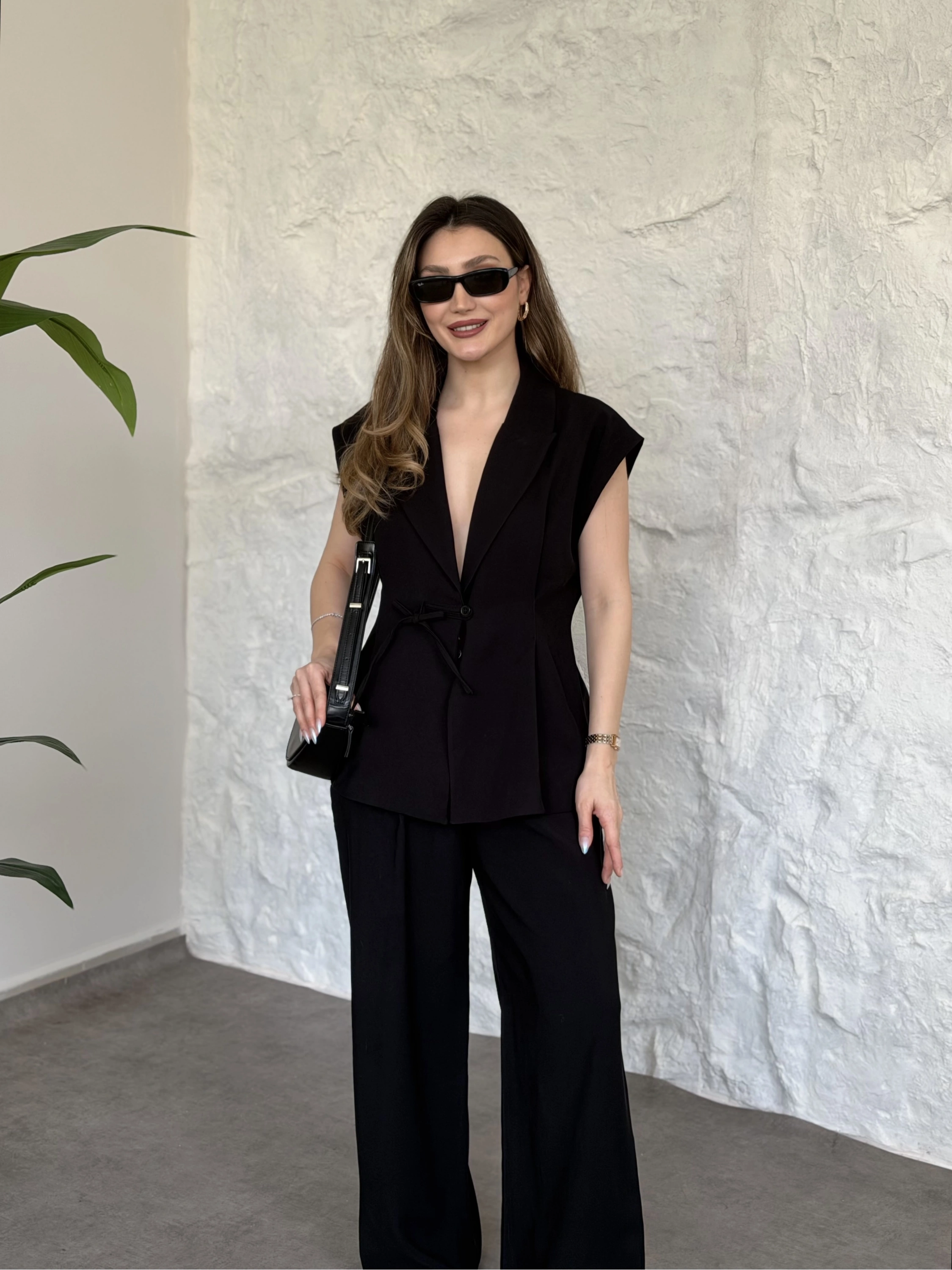 Sıfır kol belden bağlamalı kumaş takım siyah
