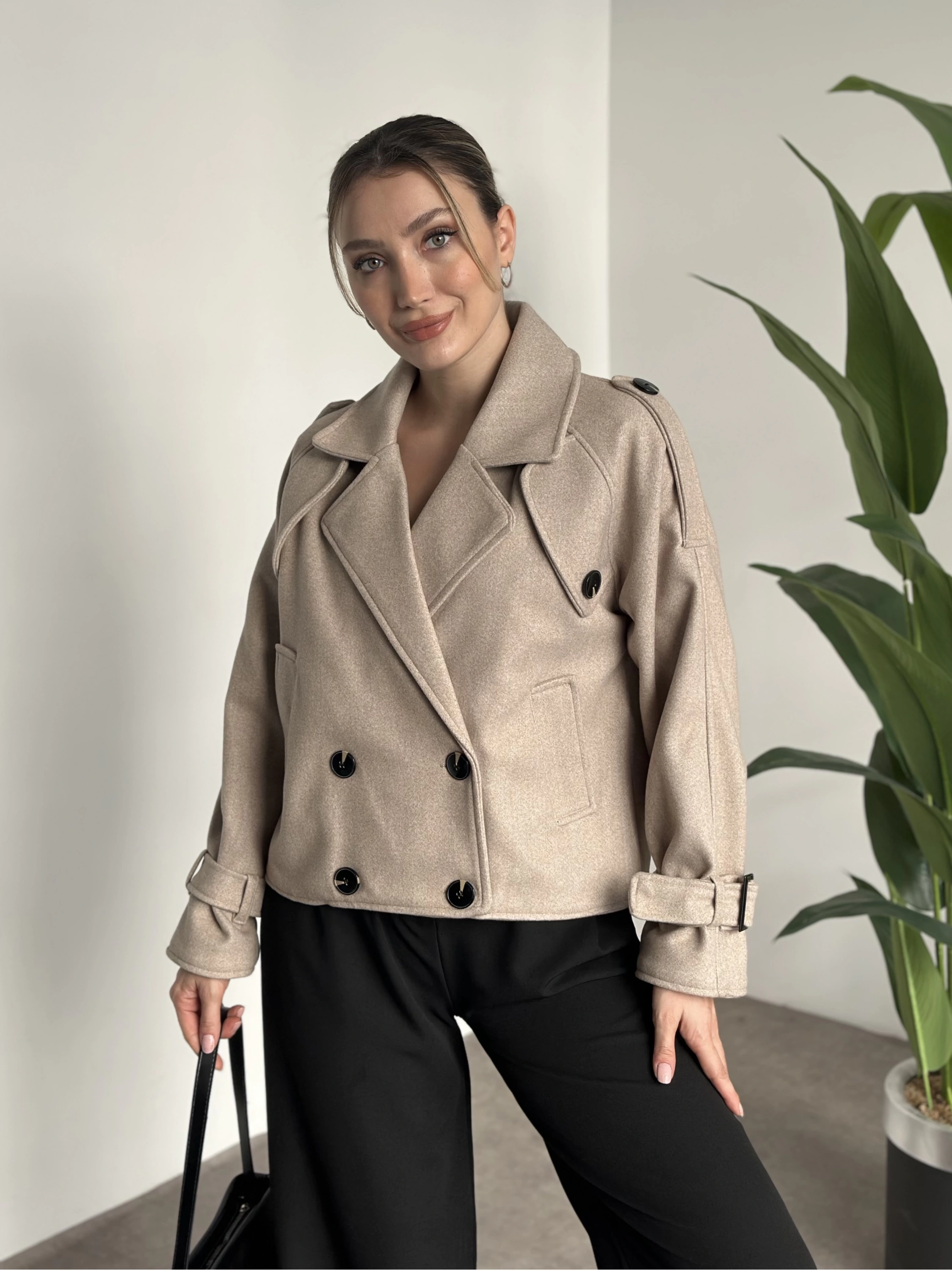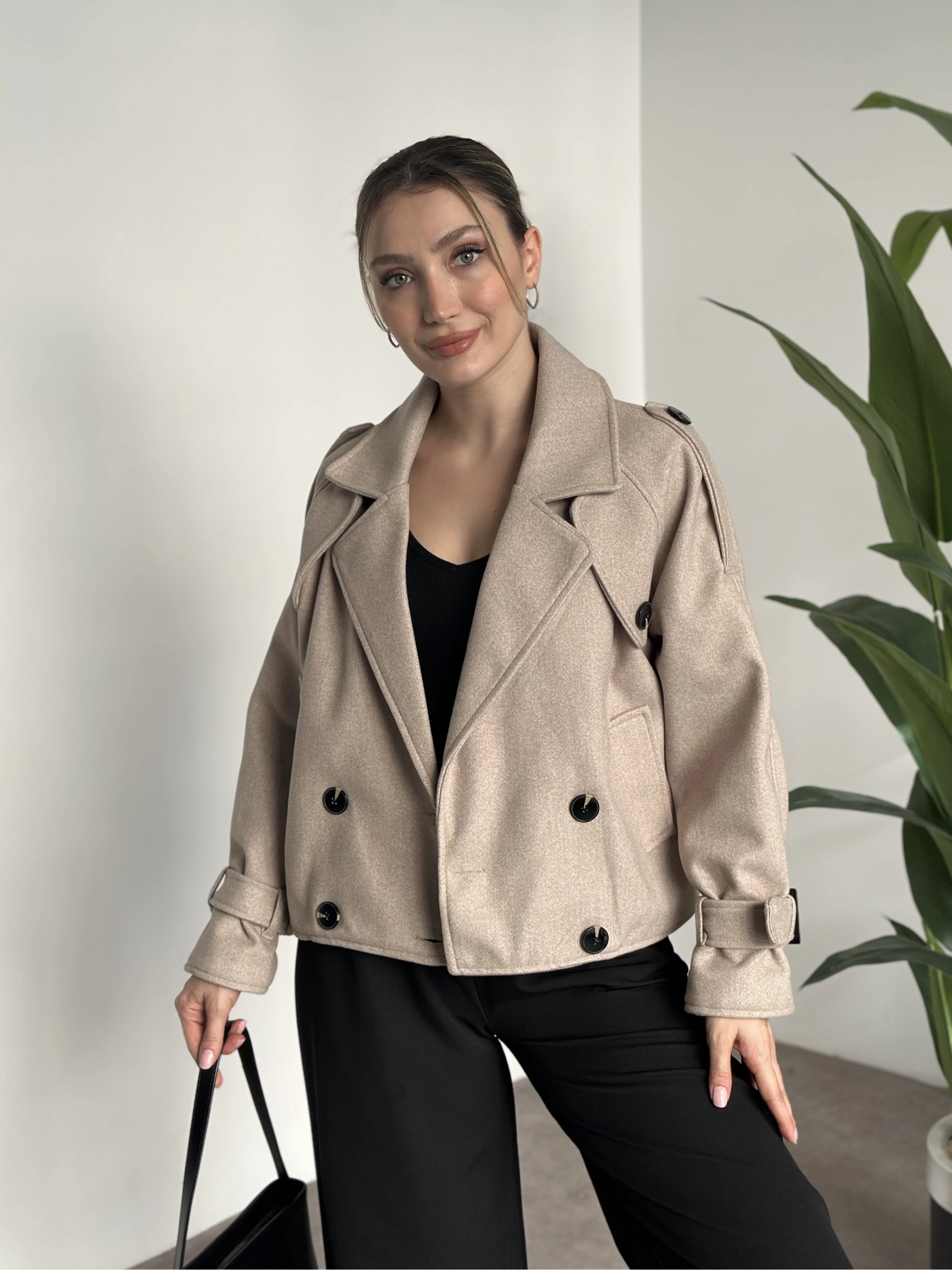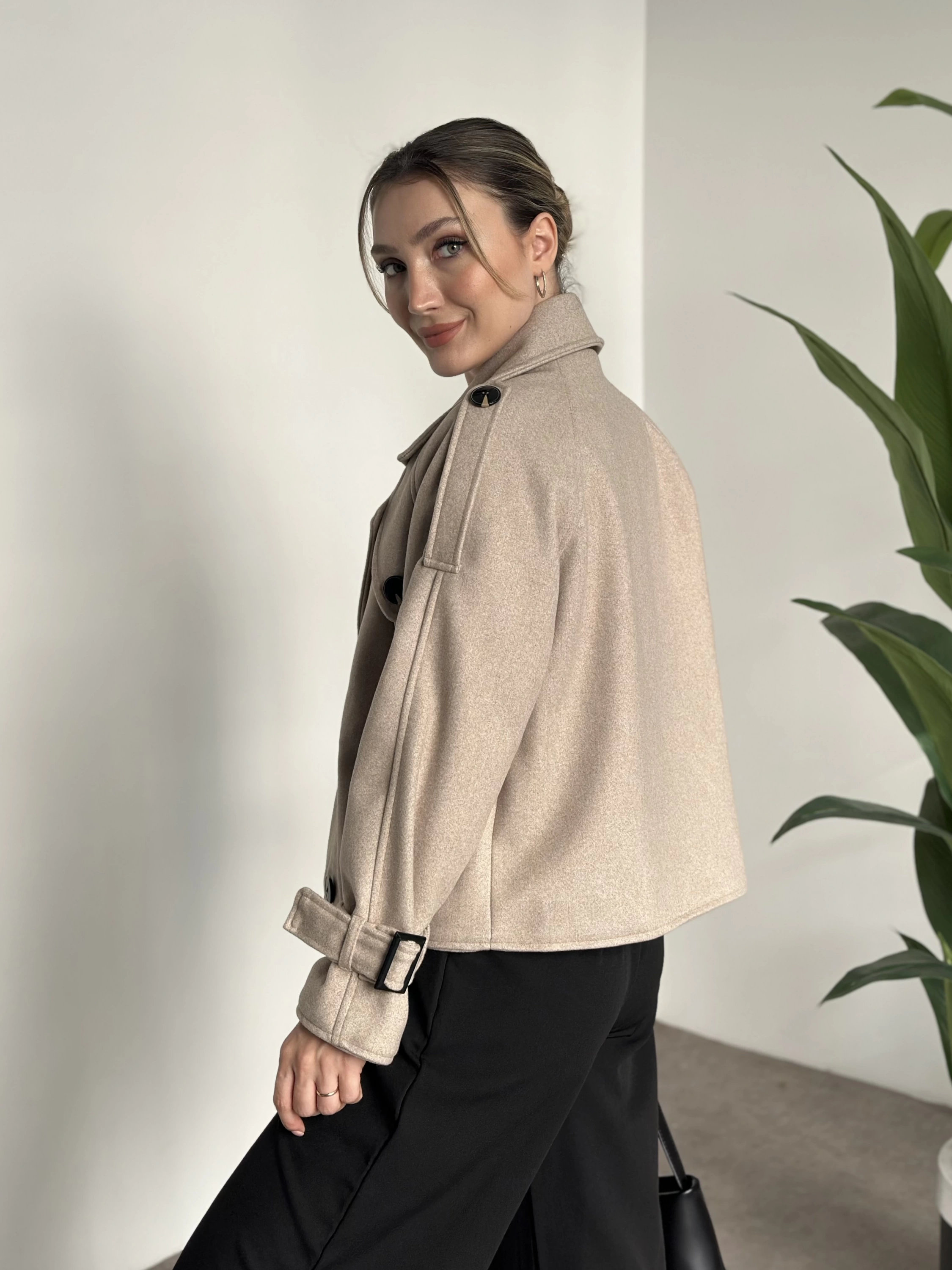 Düğmeli astarlı kısa kaşe kaban krem
