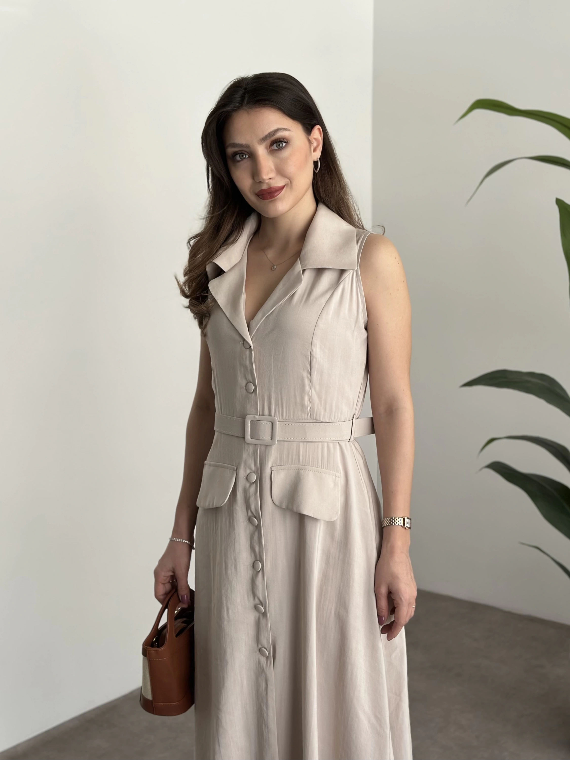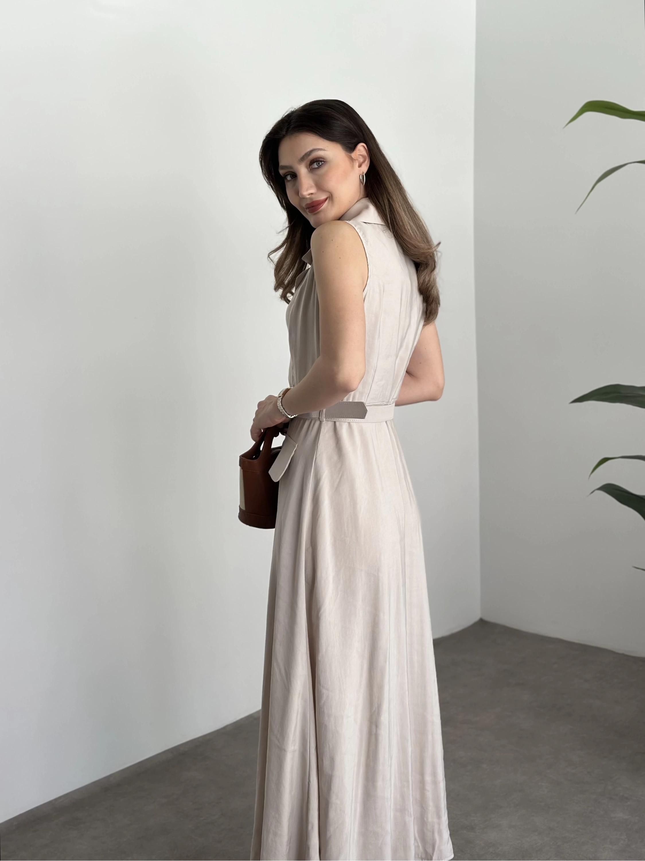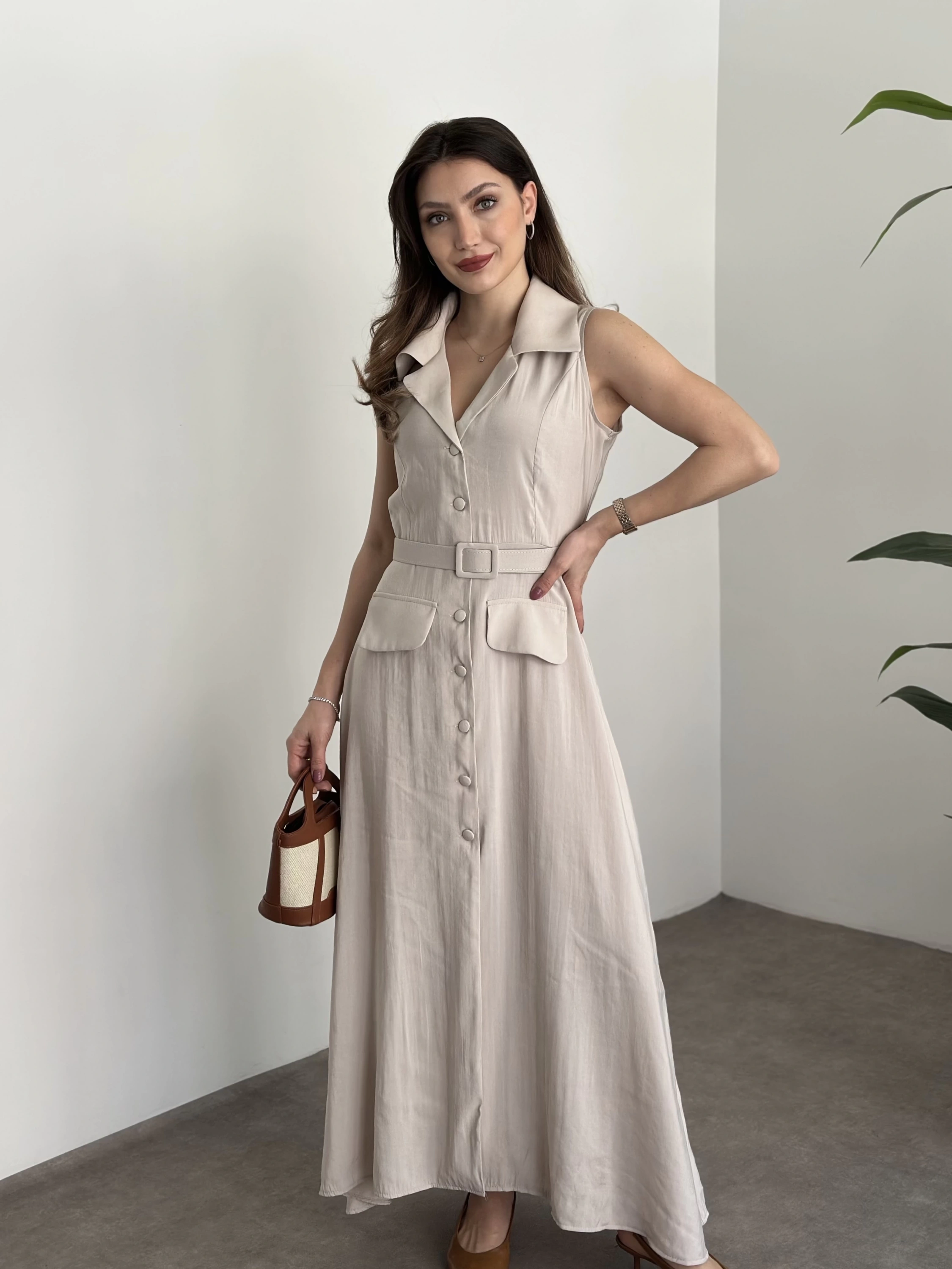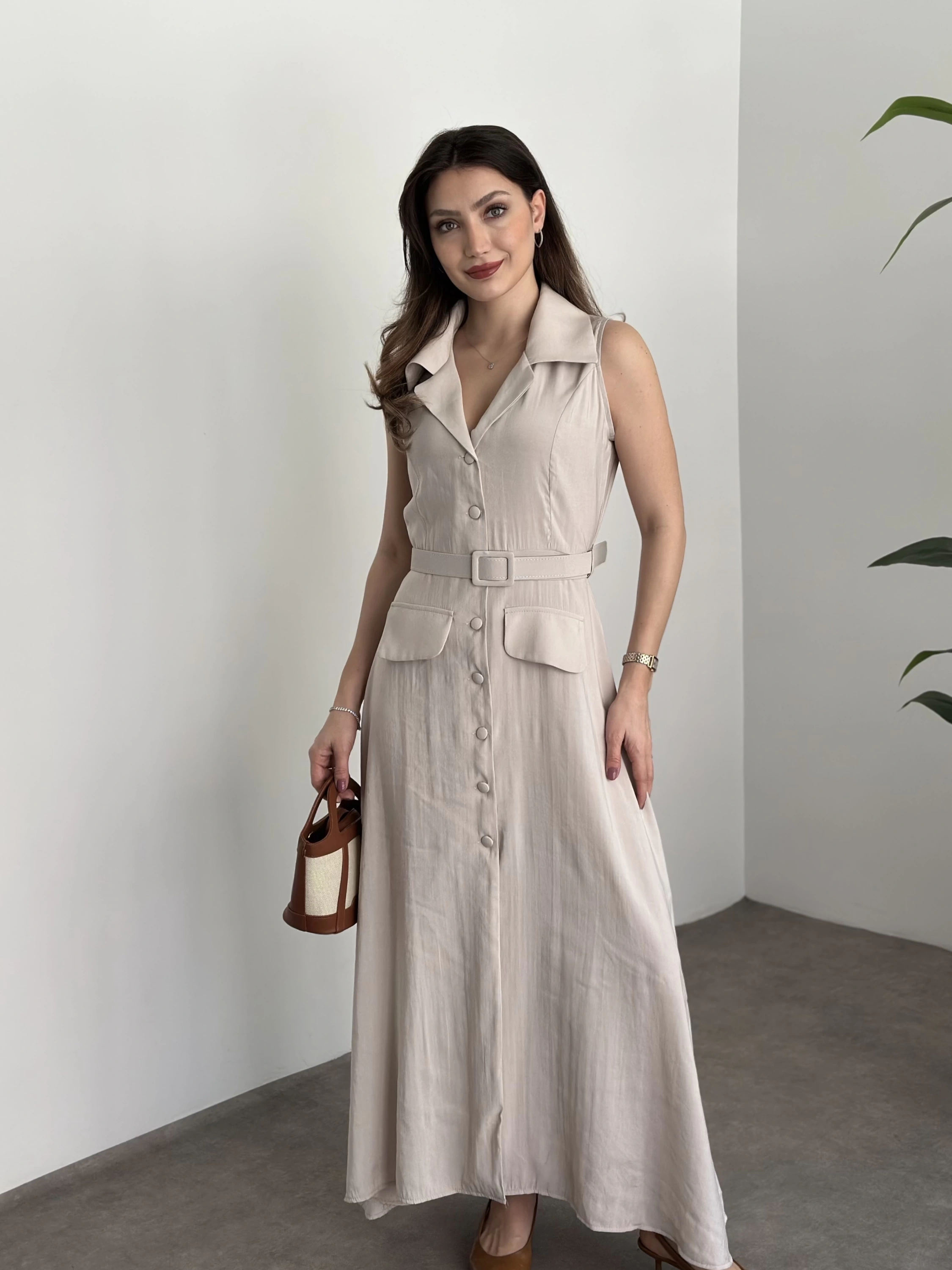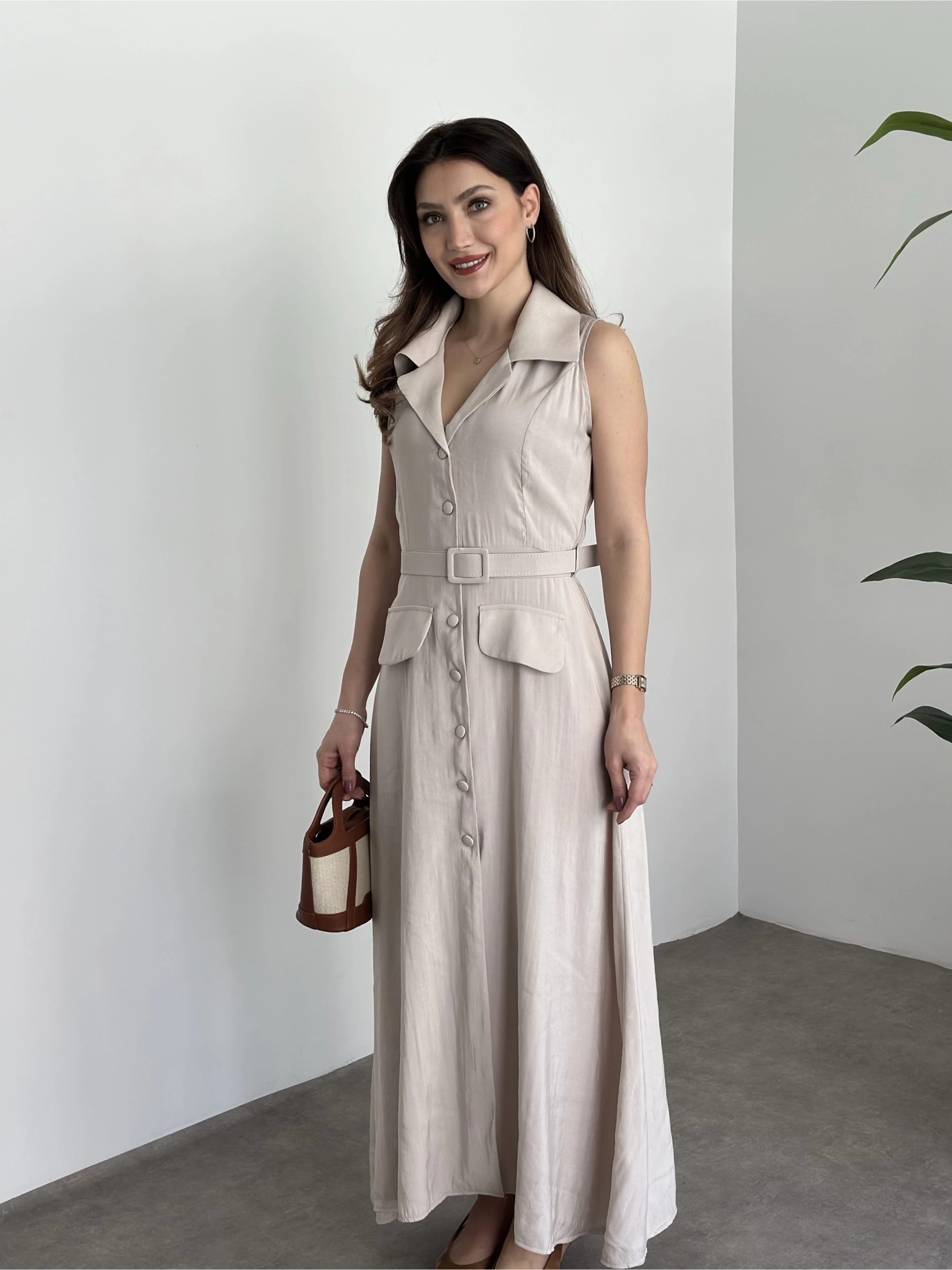 Düğmeli belinden kemerli maxi boy bambu kumaş elbise taş