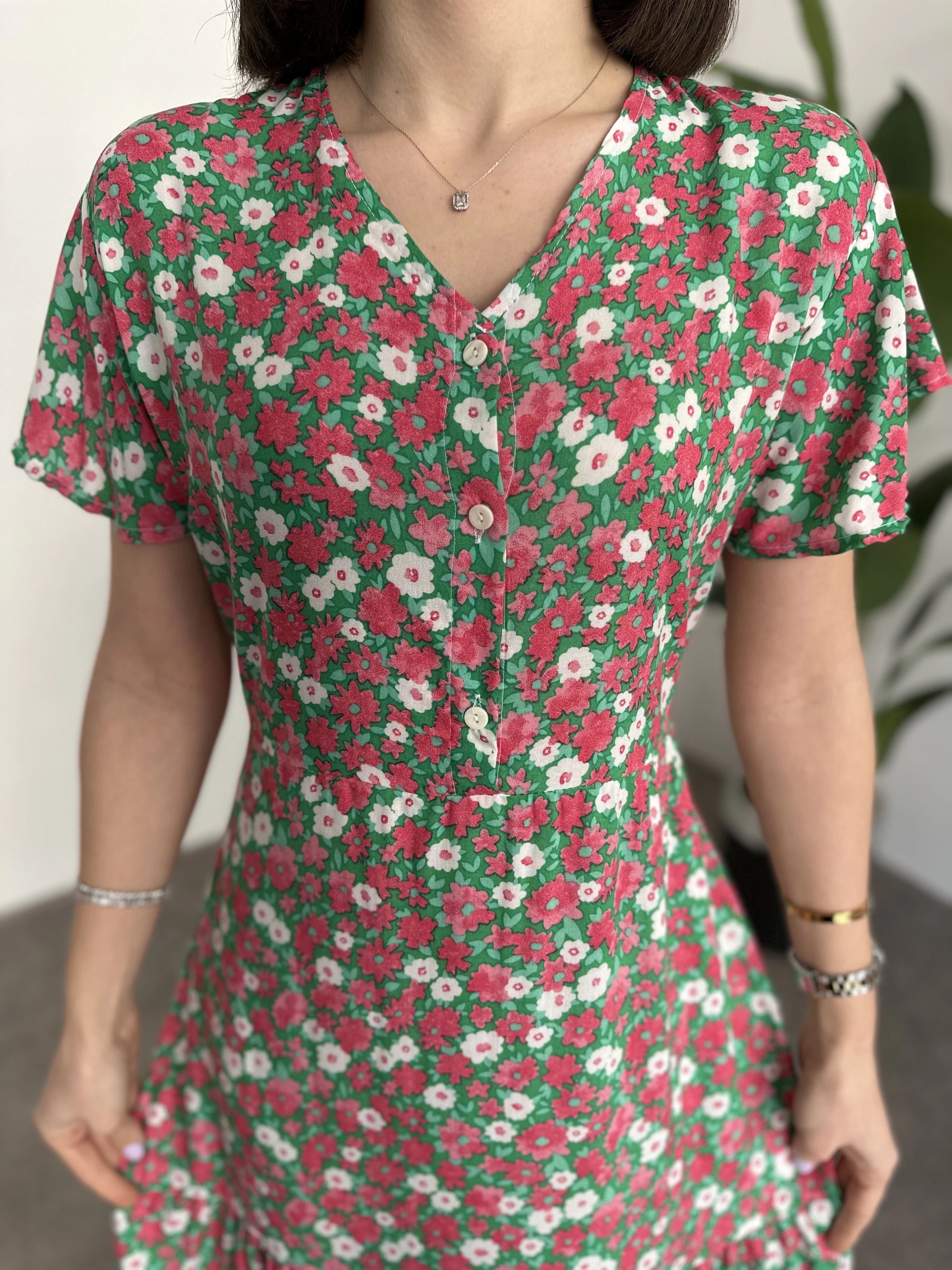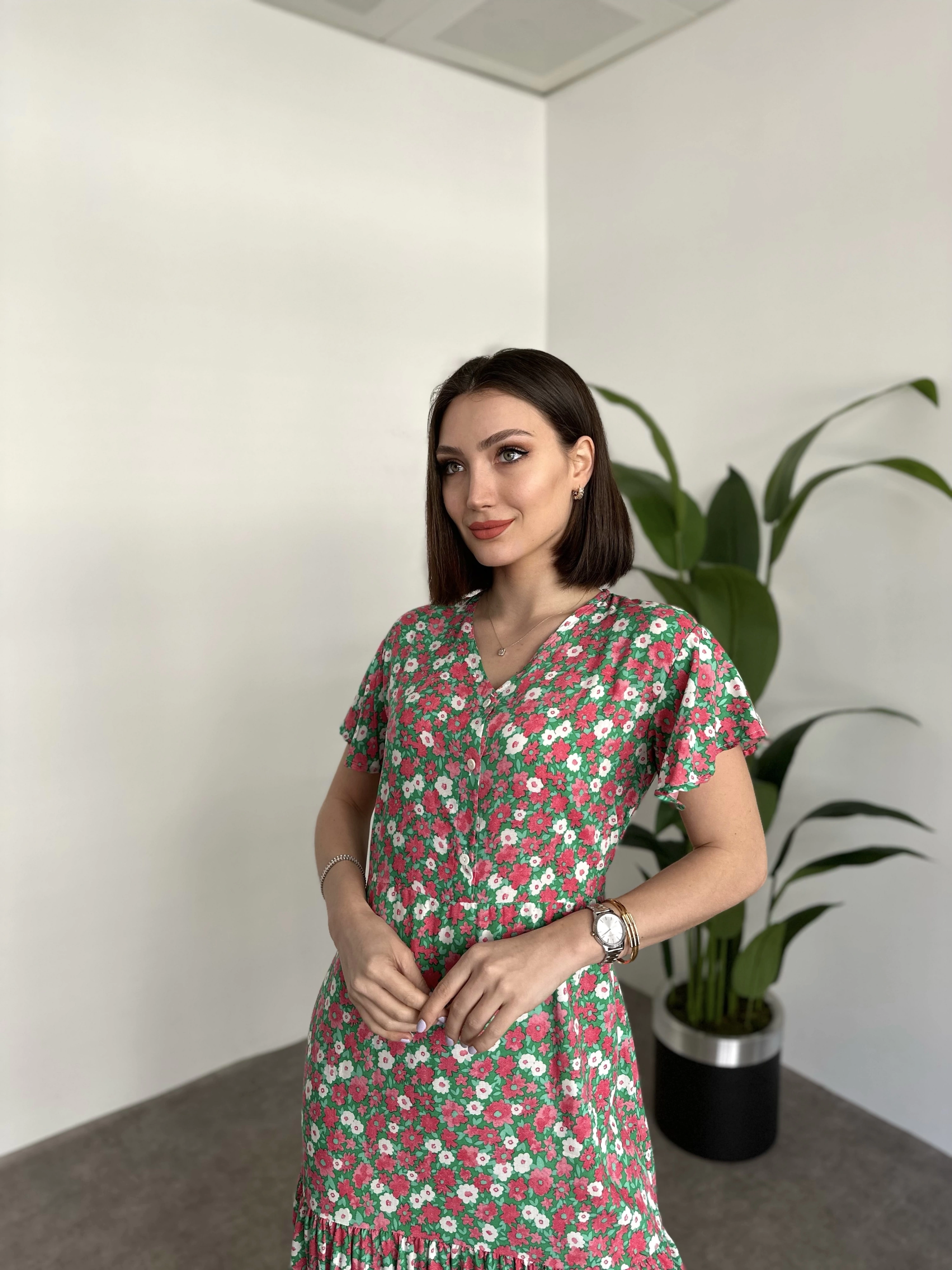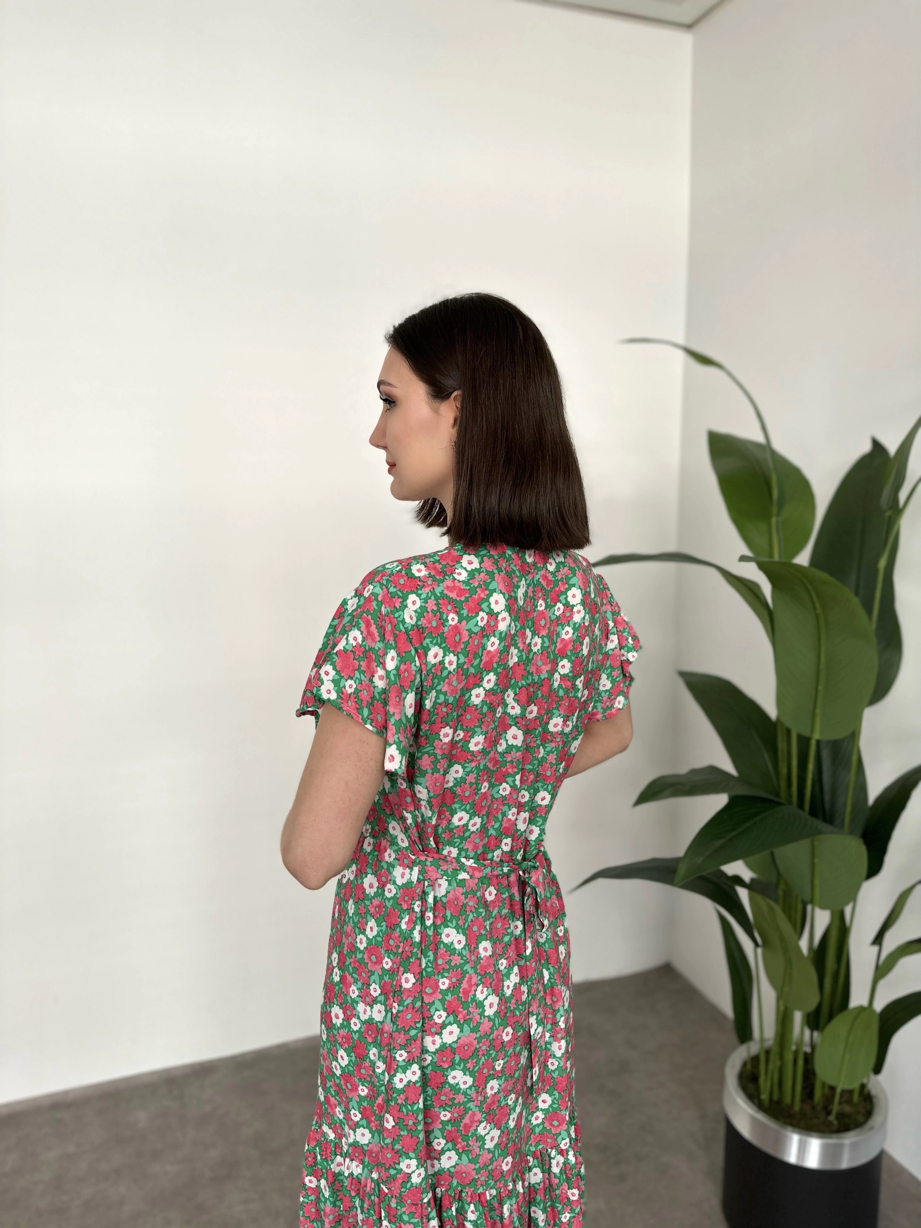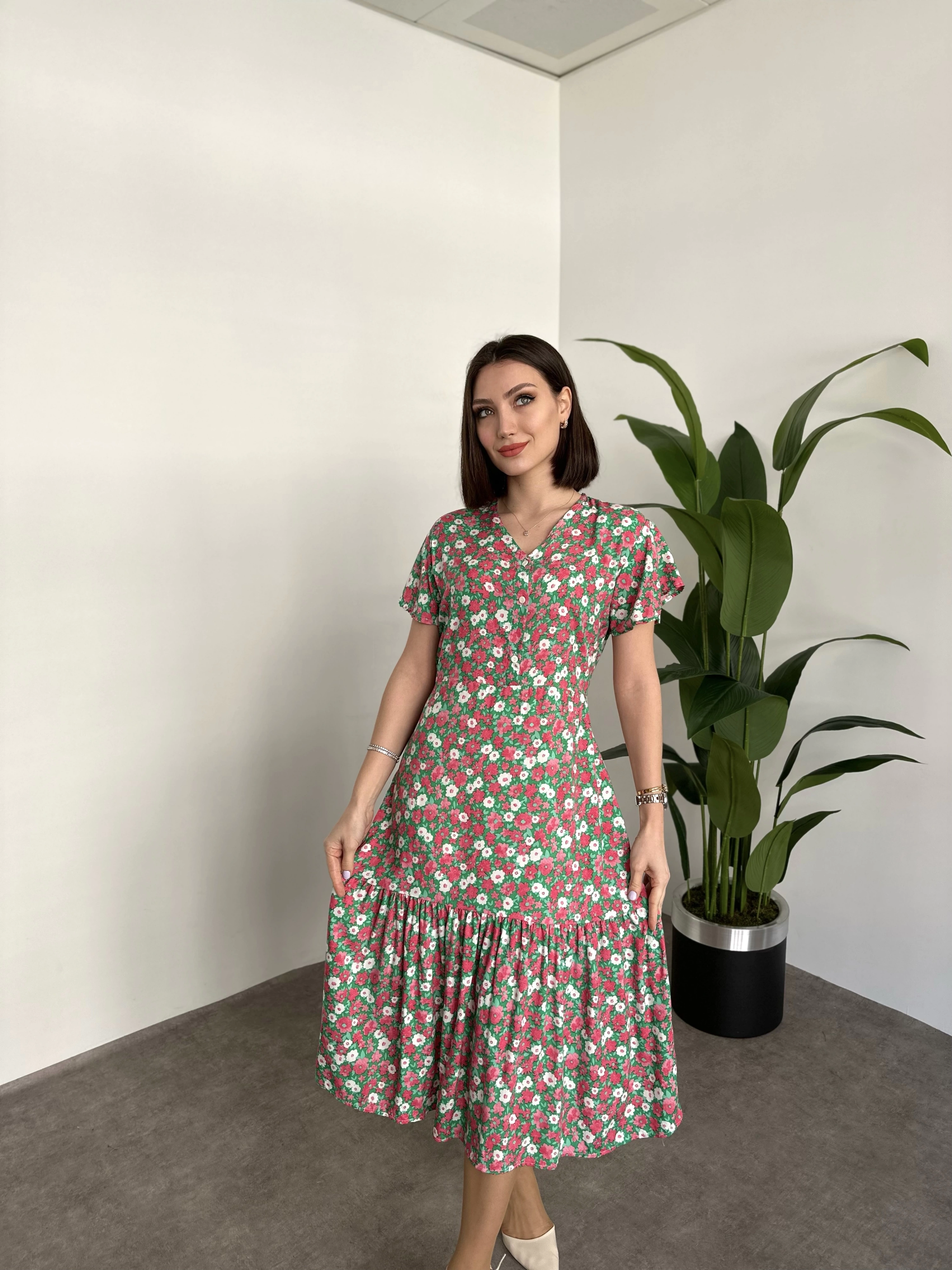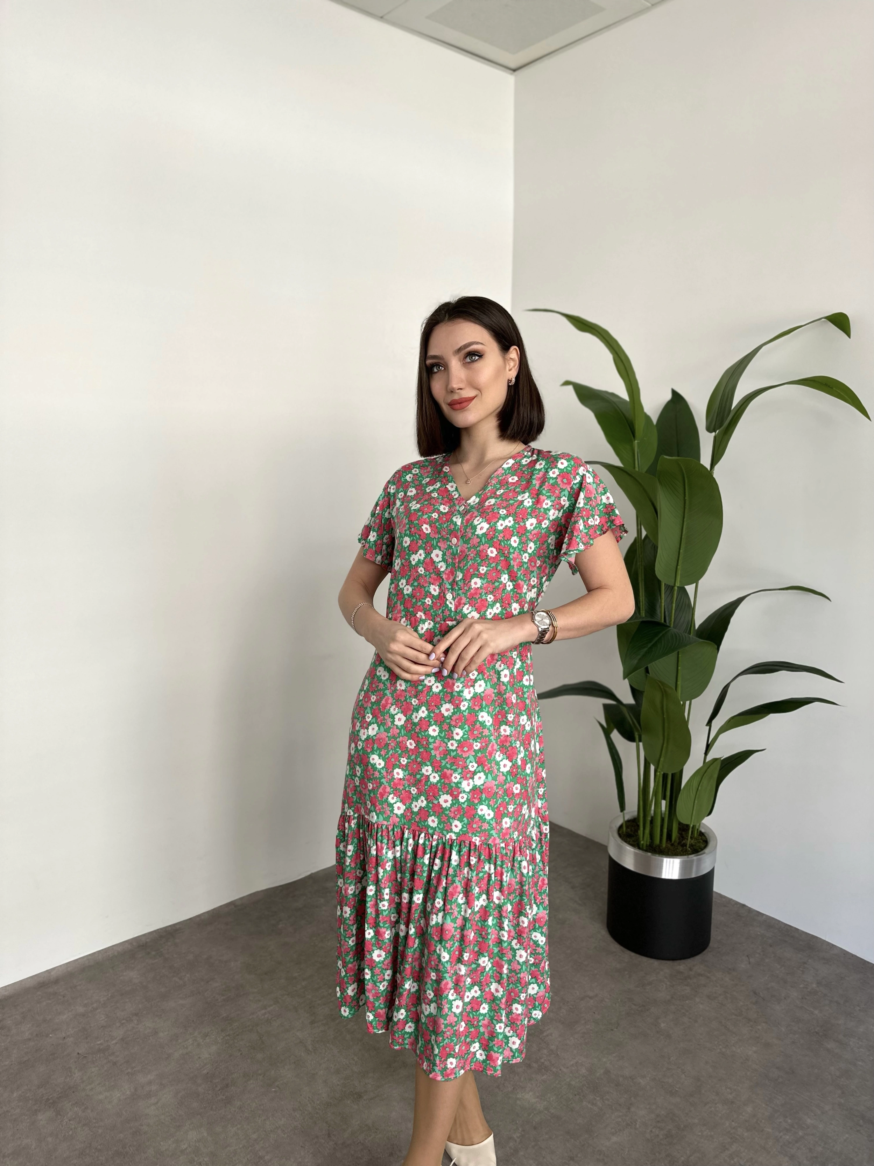 Düğmeli Belinden Kuşaklı Viskon Kumaş Elbise Krem Pembe Yeşil Çiçekli