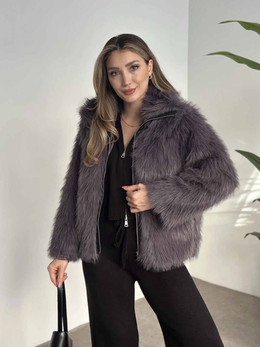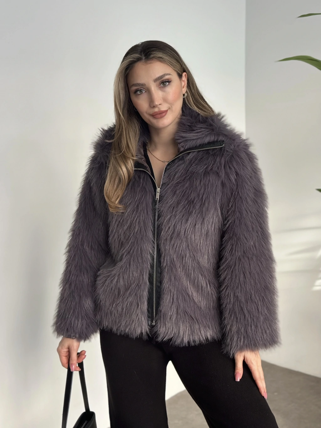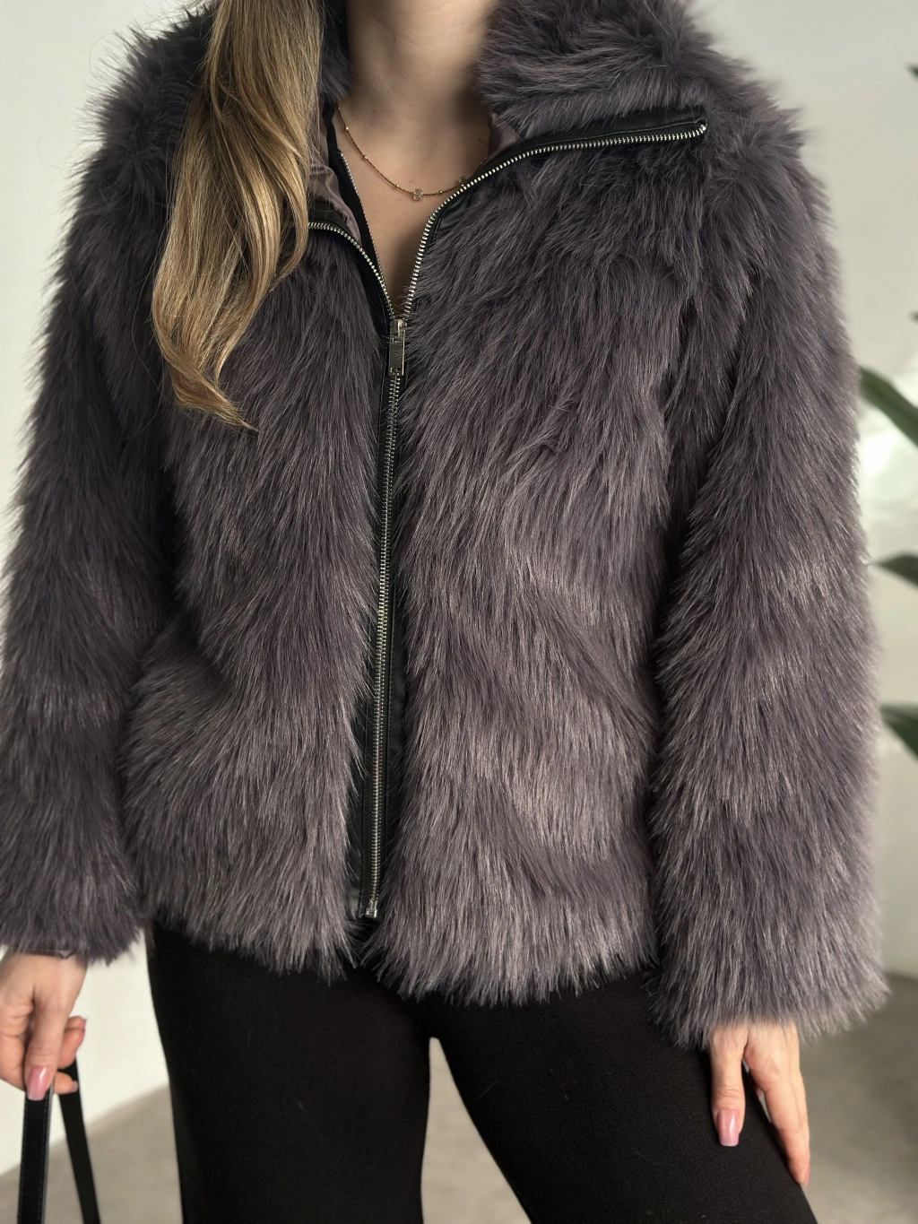 Fermuar detaylı kürk mont antrasit