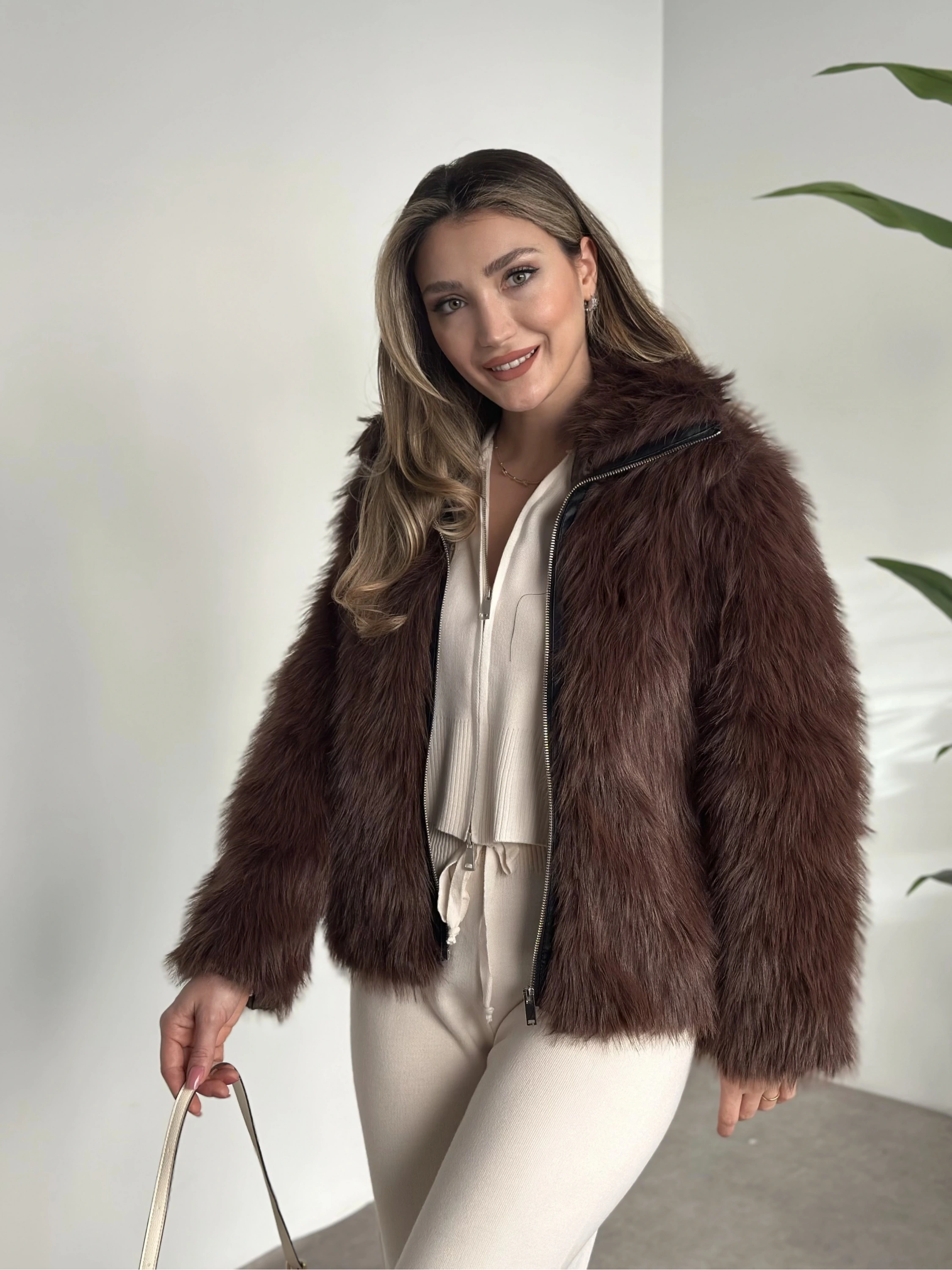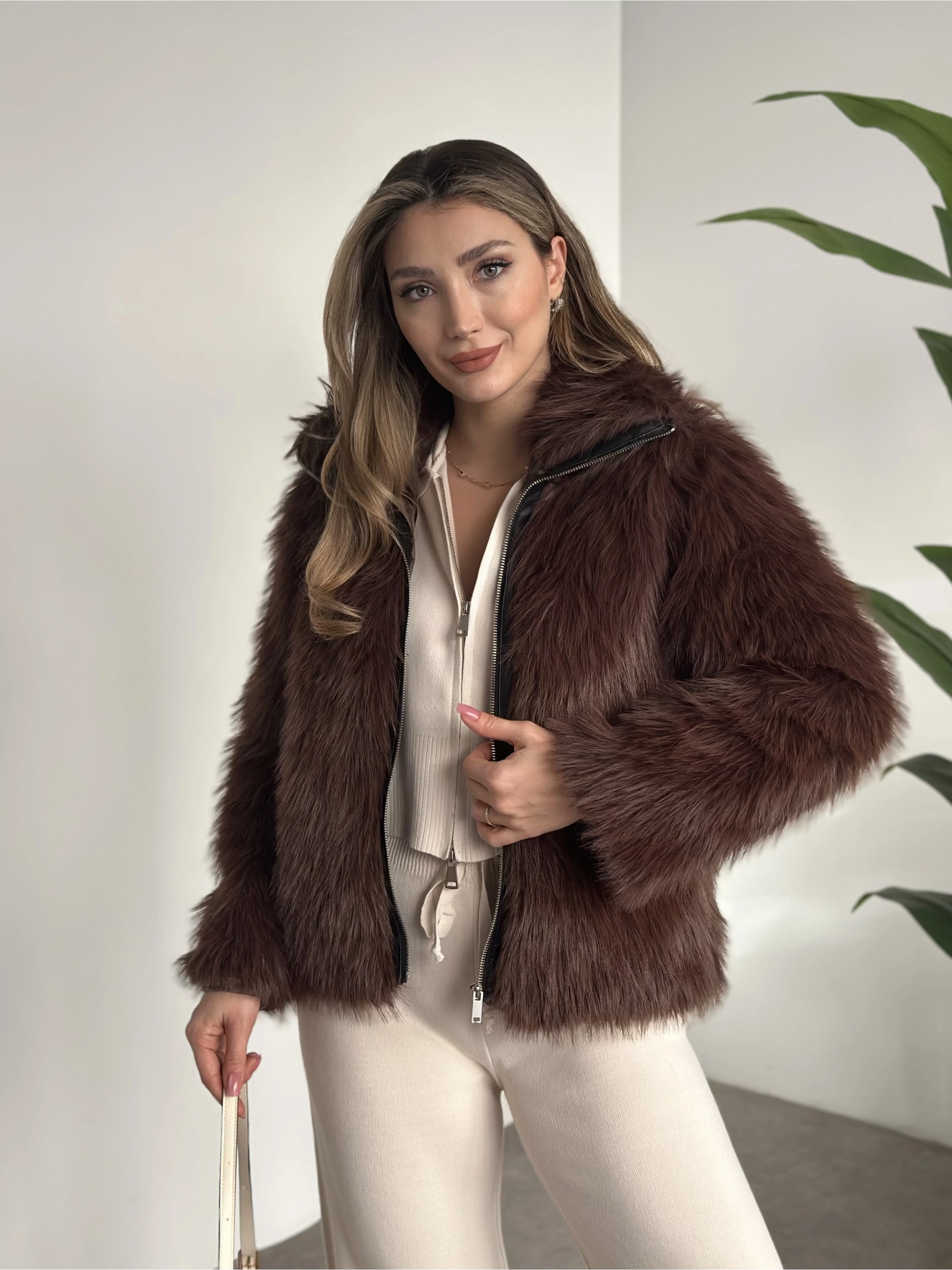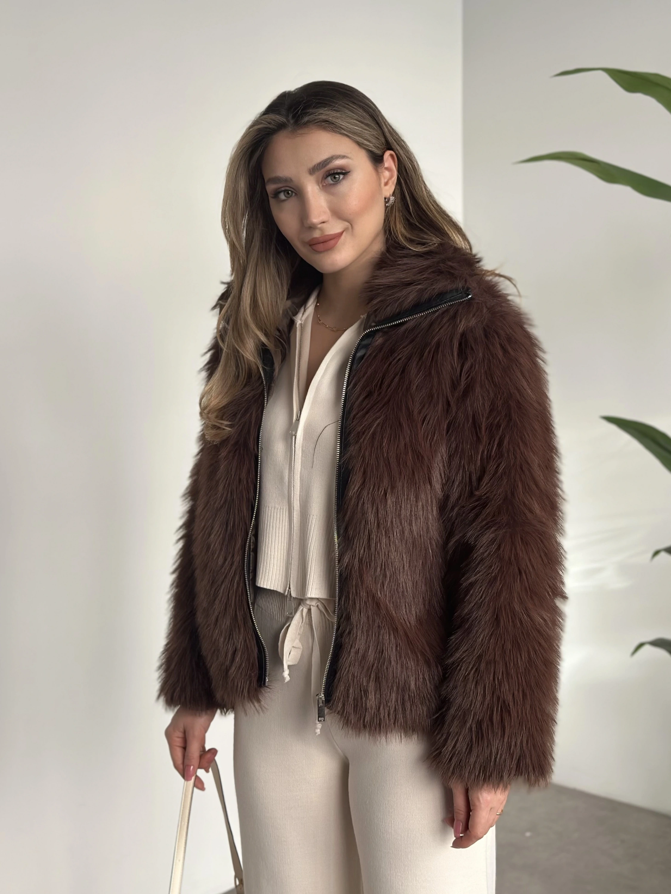 Fermuar detaylı kürk mont kahve
