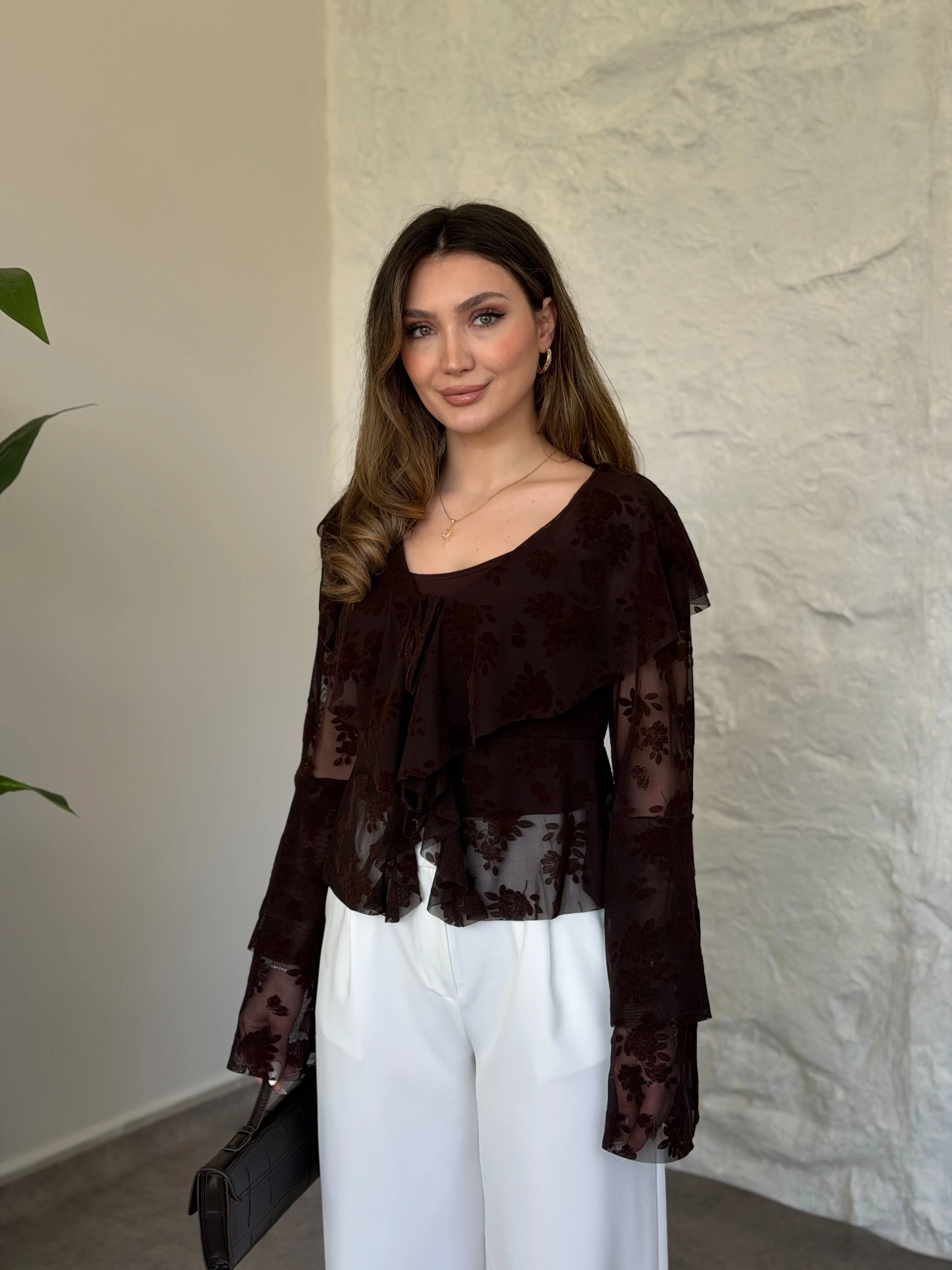Yakası ve önü aksesuar detaylı dantelli bluz kahve
