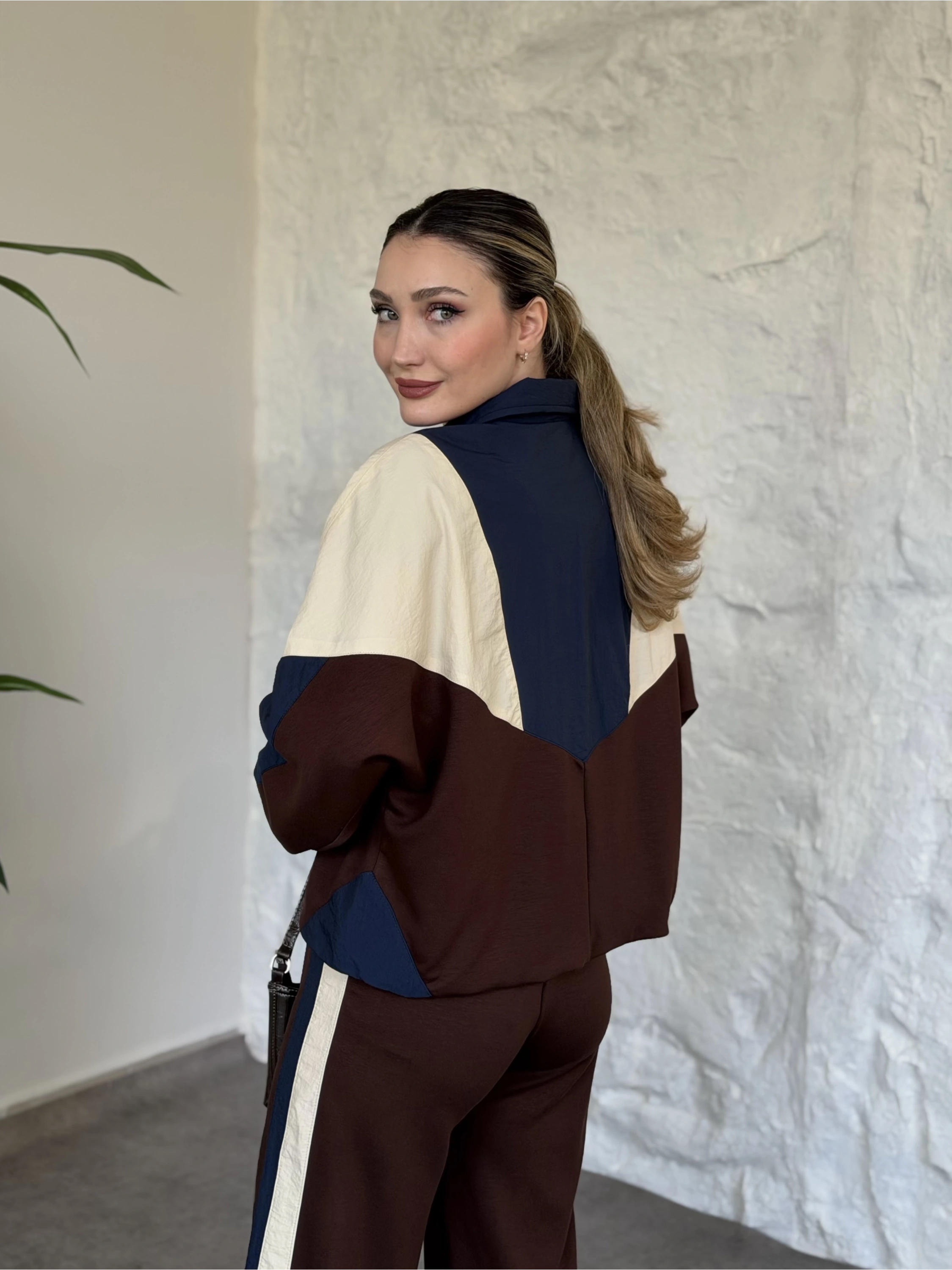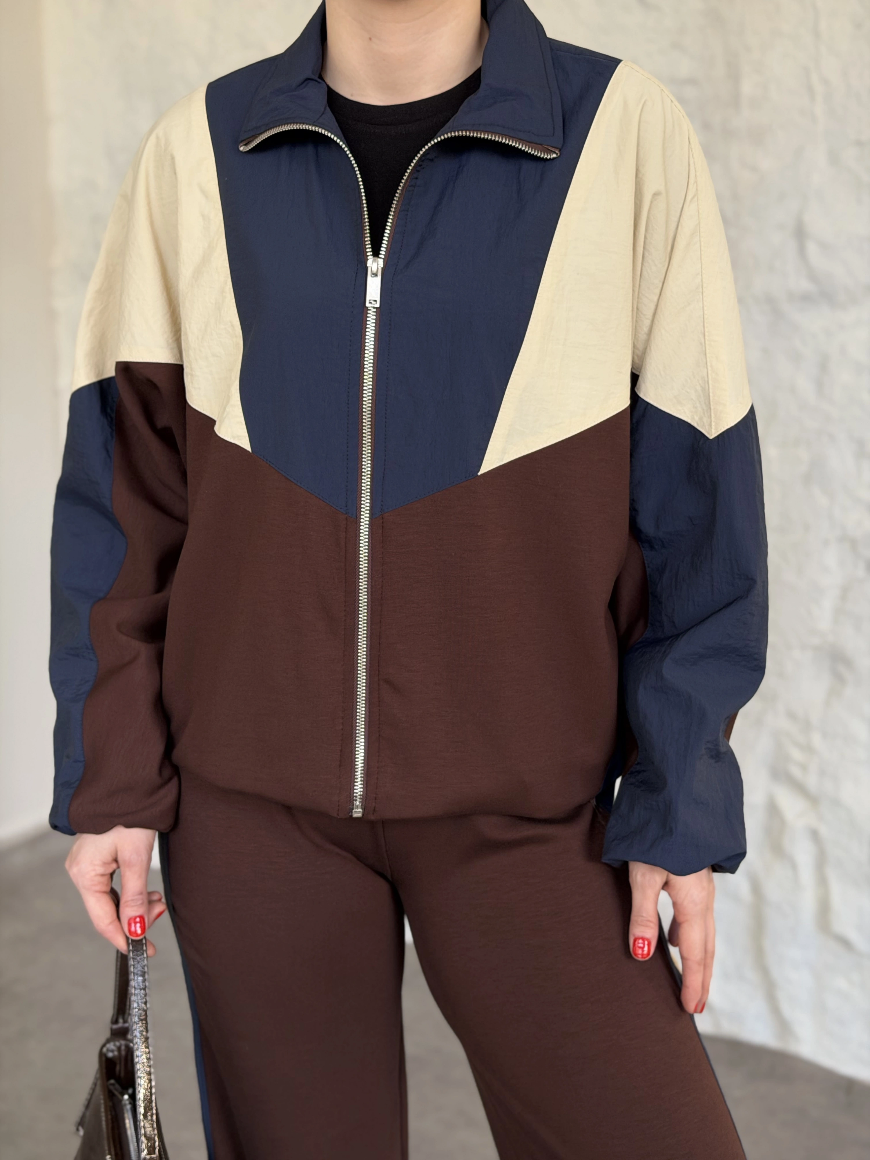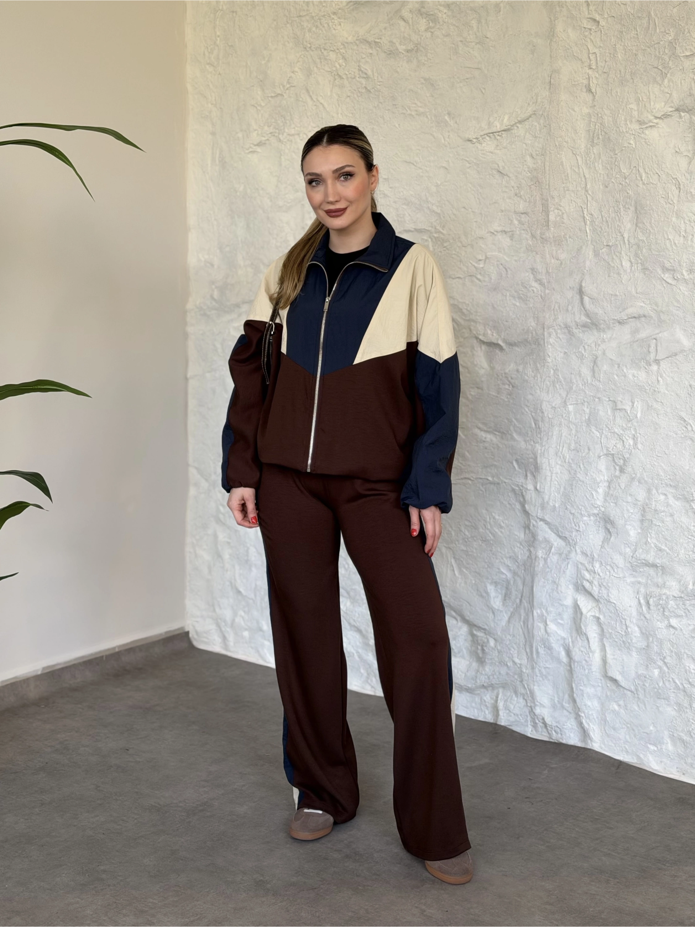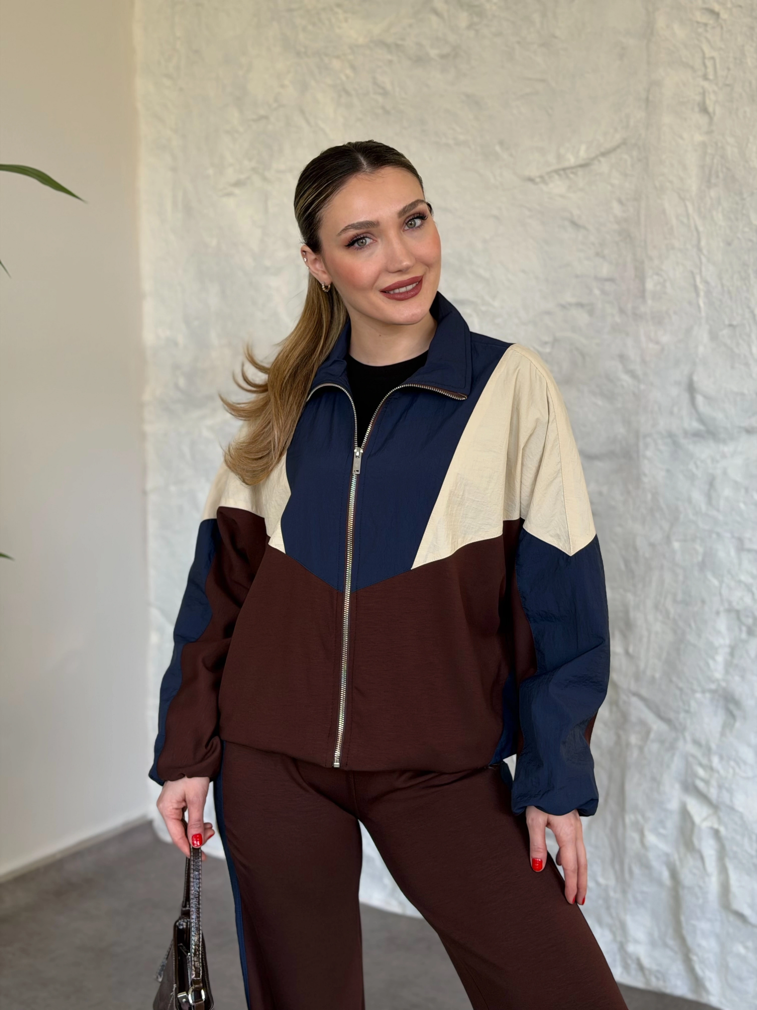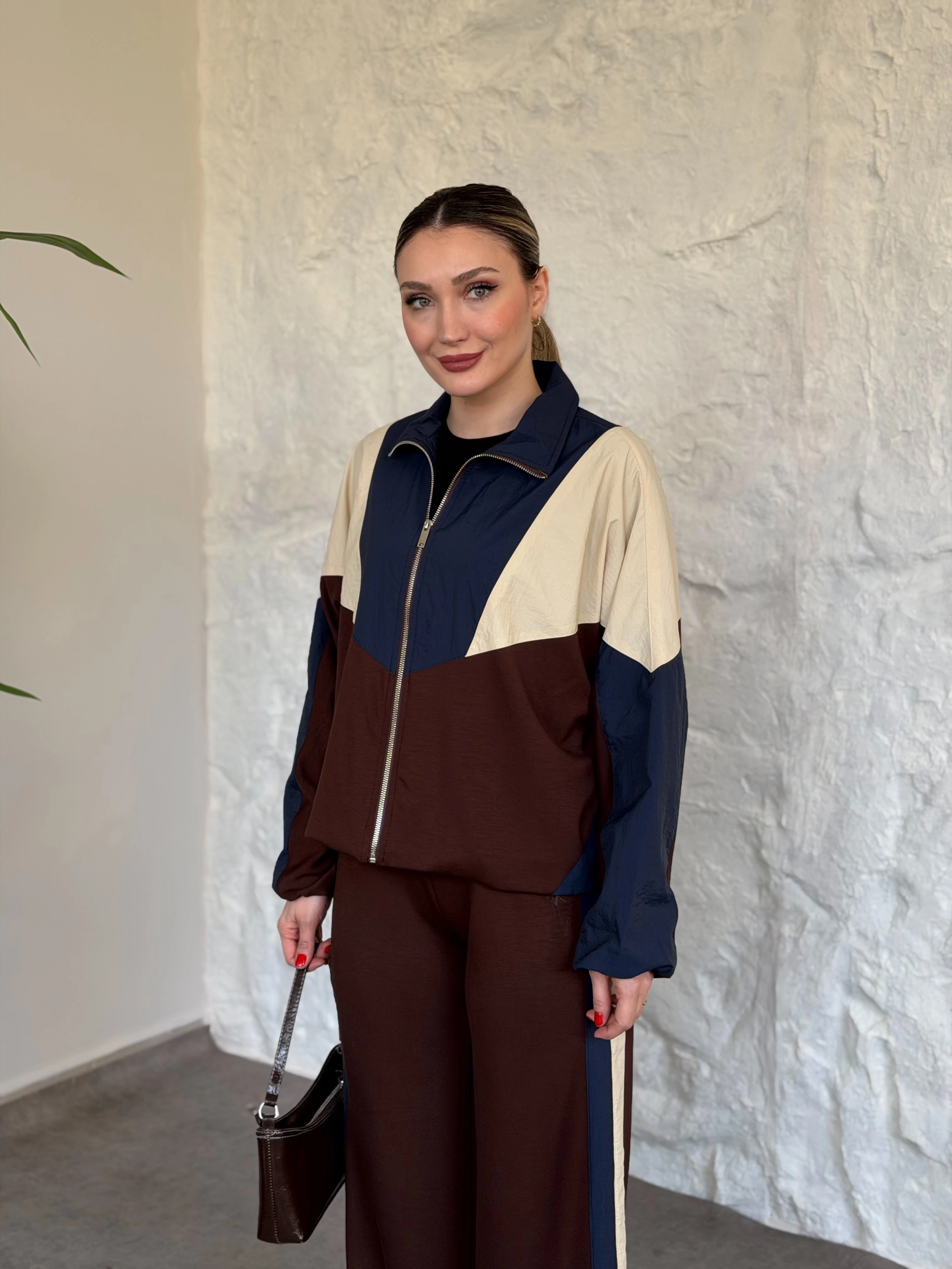 Premium ara biye detaylı fermuarlı takım kahve