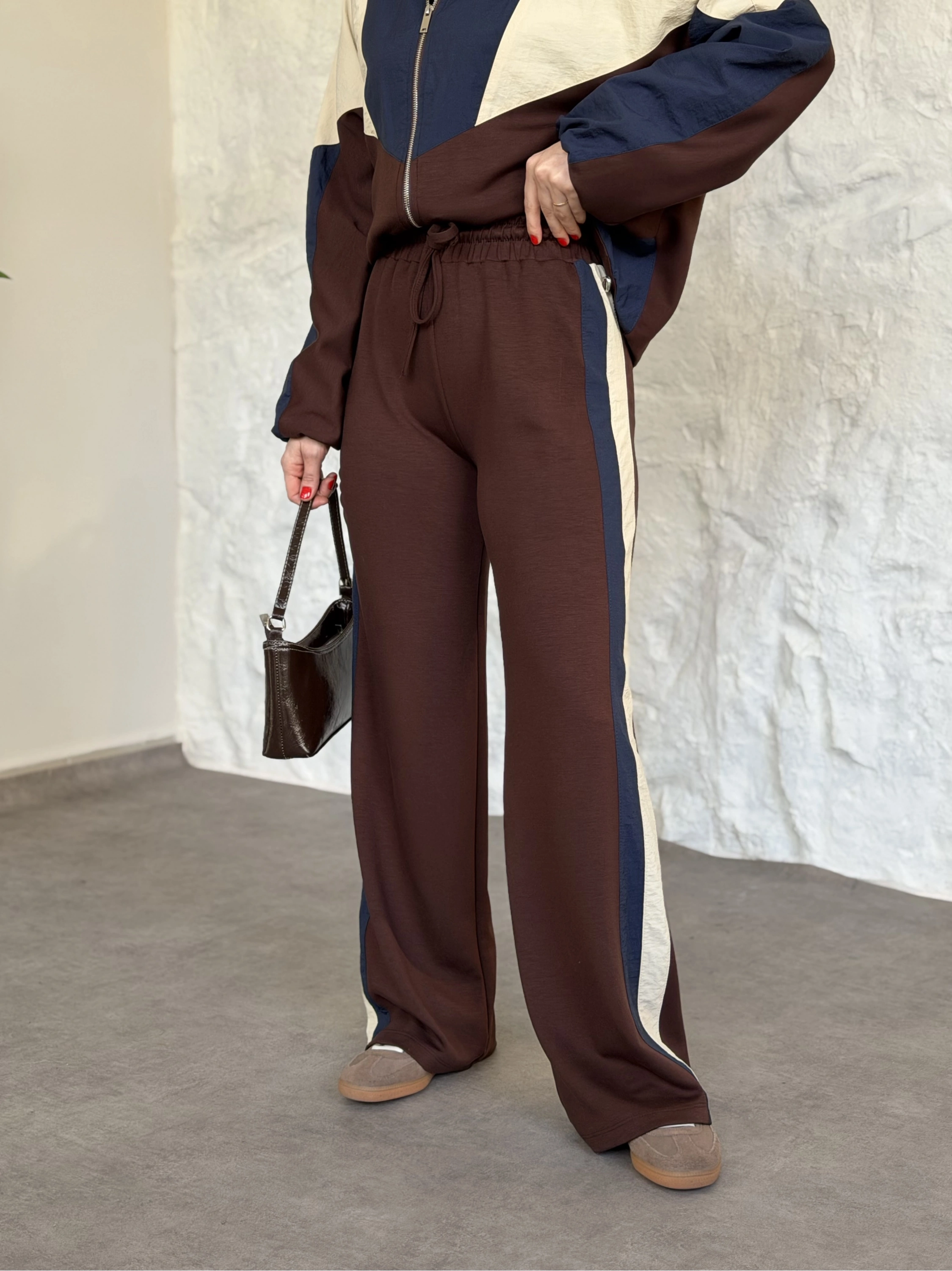 Garnili paraşüt kumaş detaylı ikili takım acı kahve