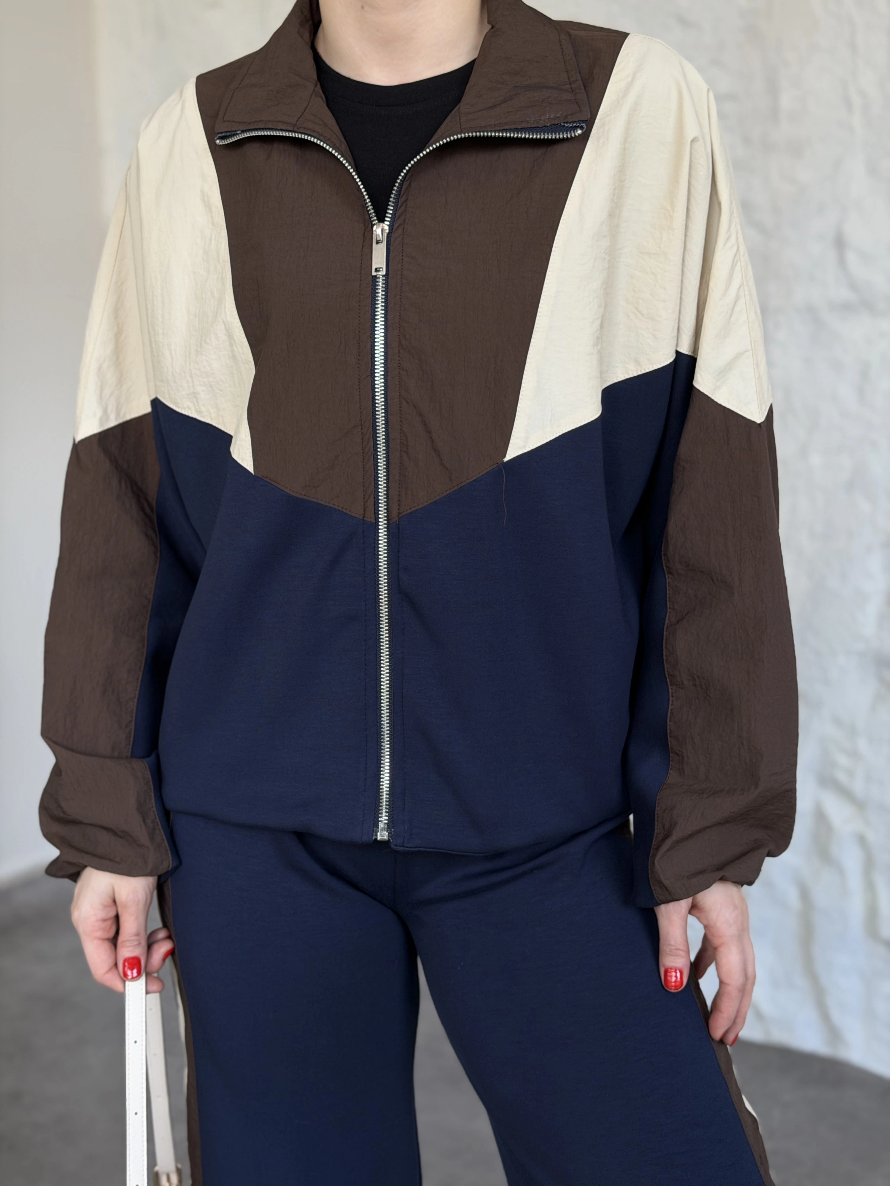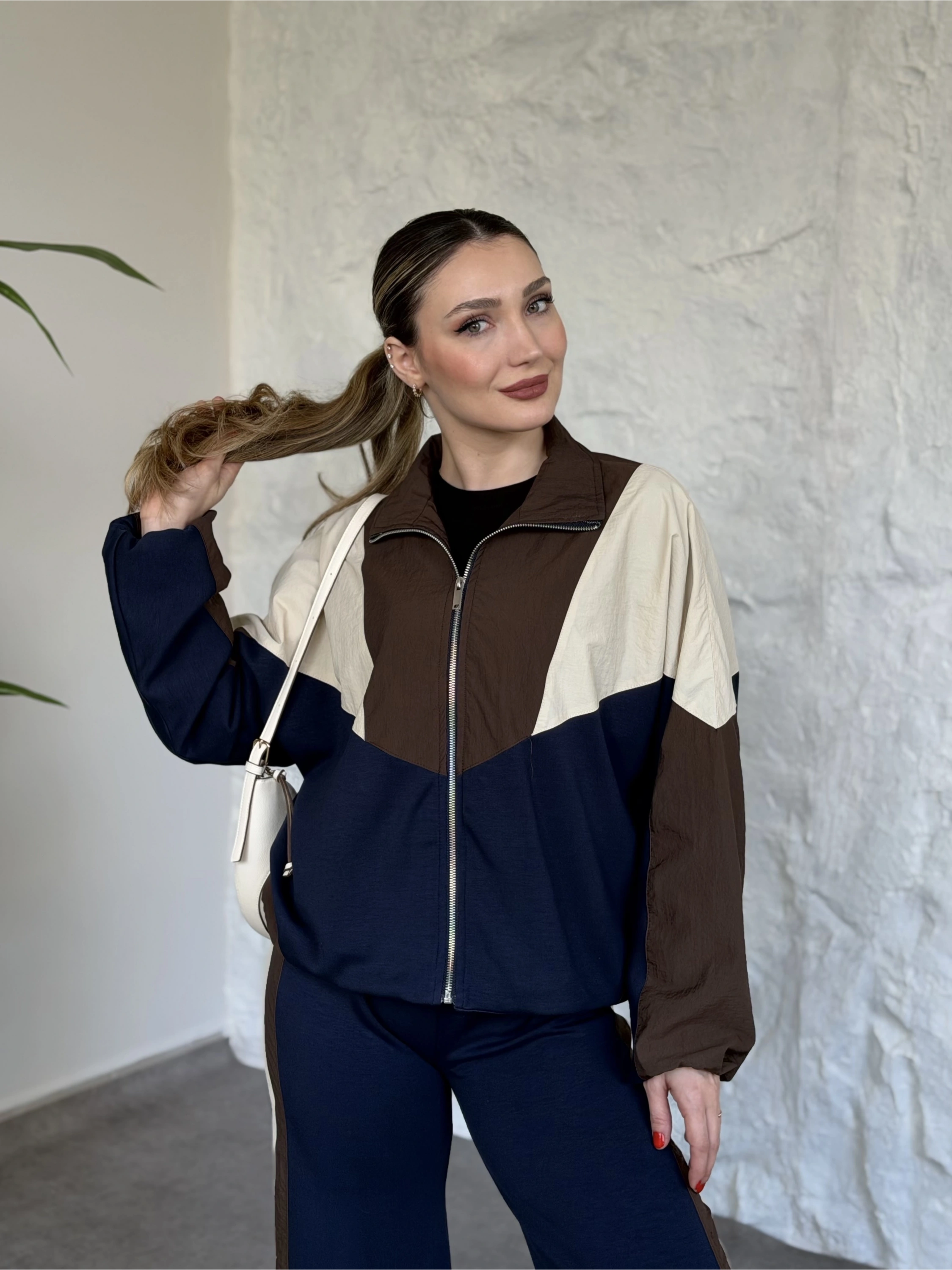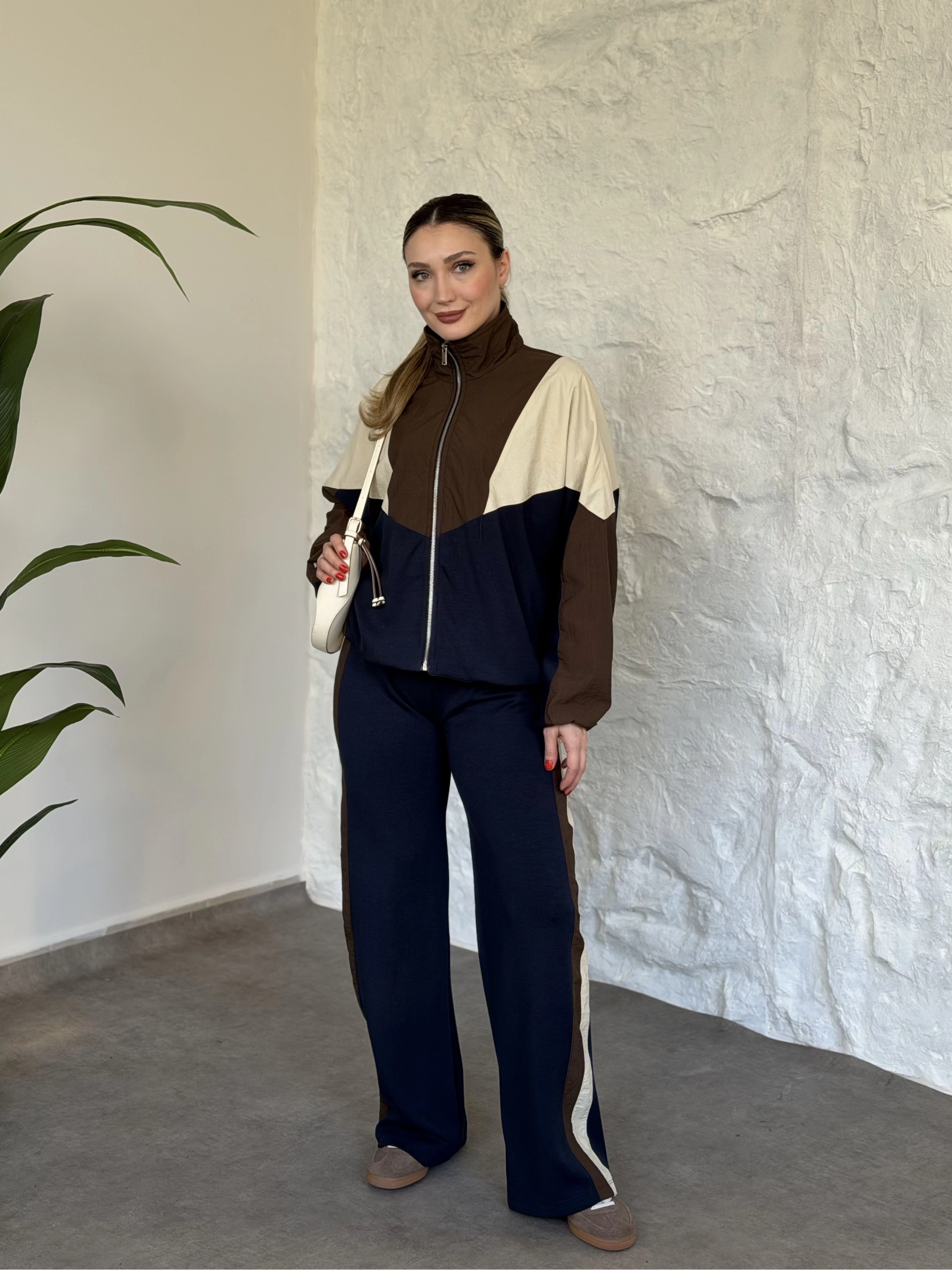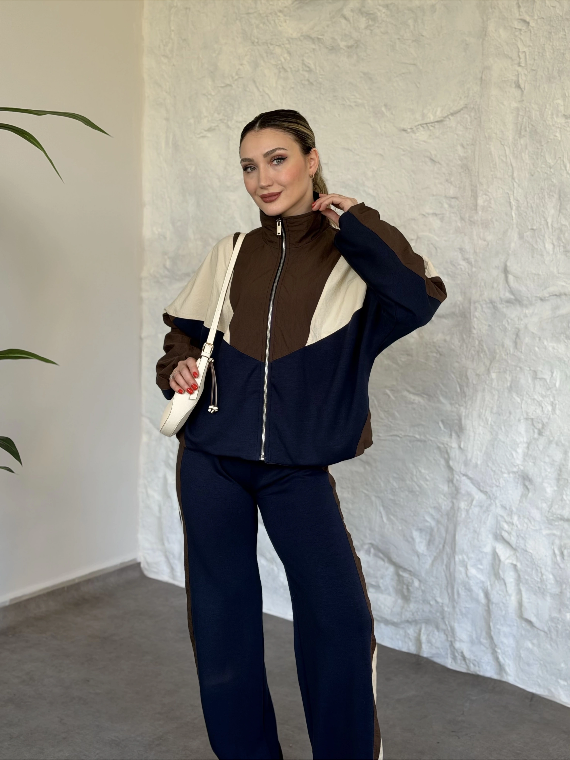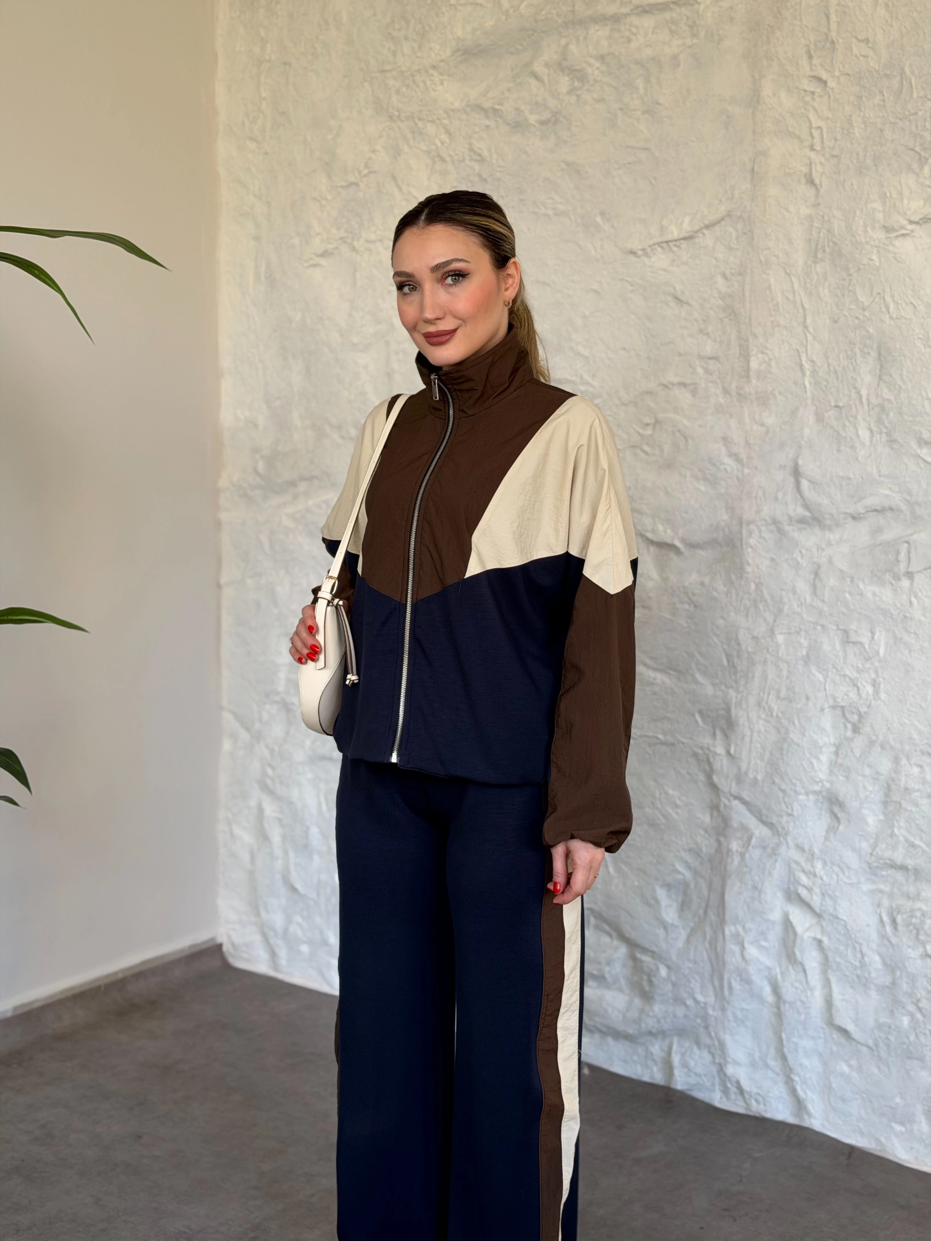 Garnili paraşüt kumaş detaylı ikili takım acı kahve