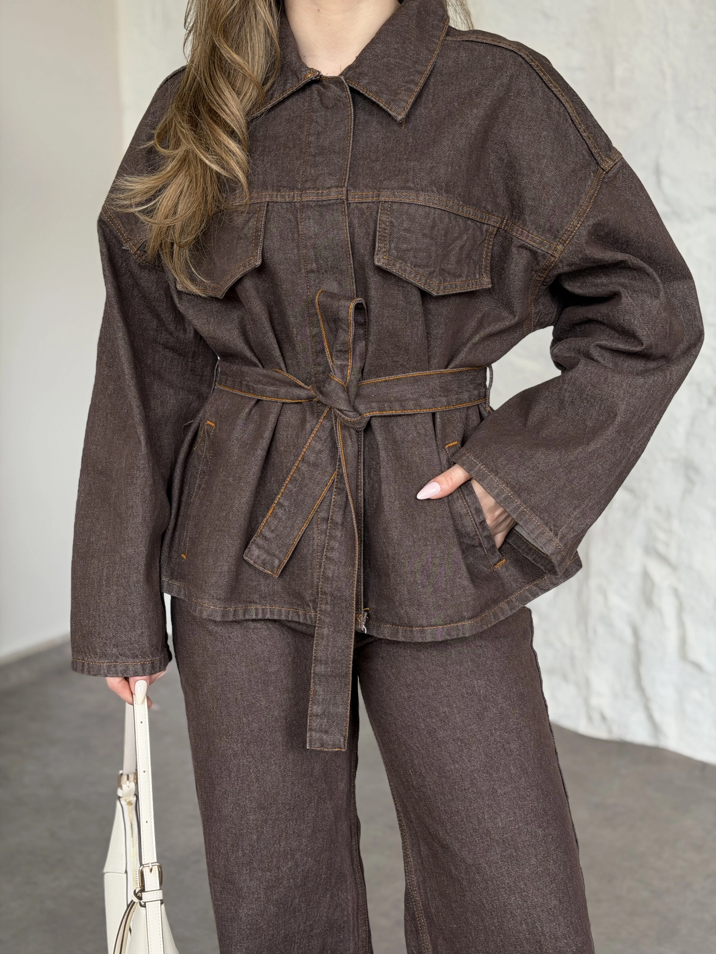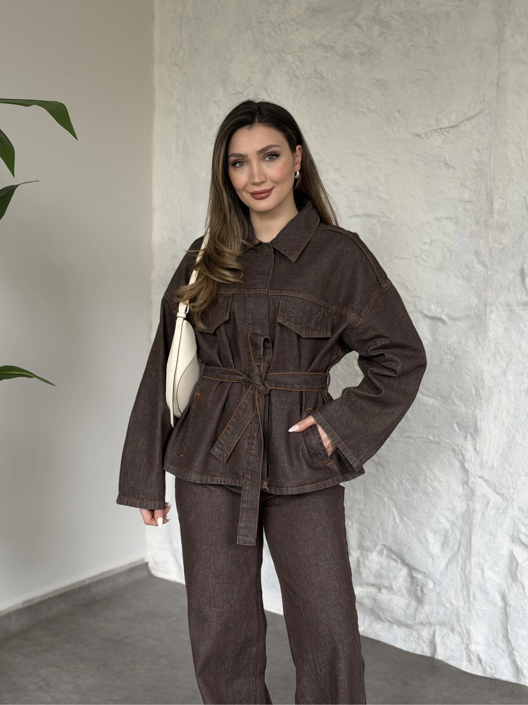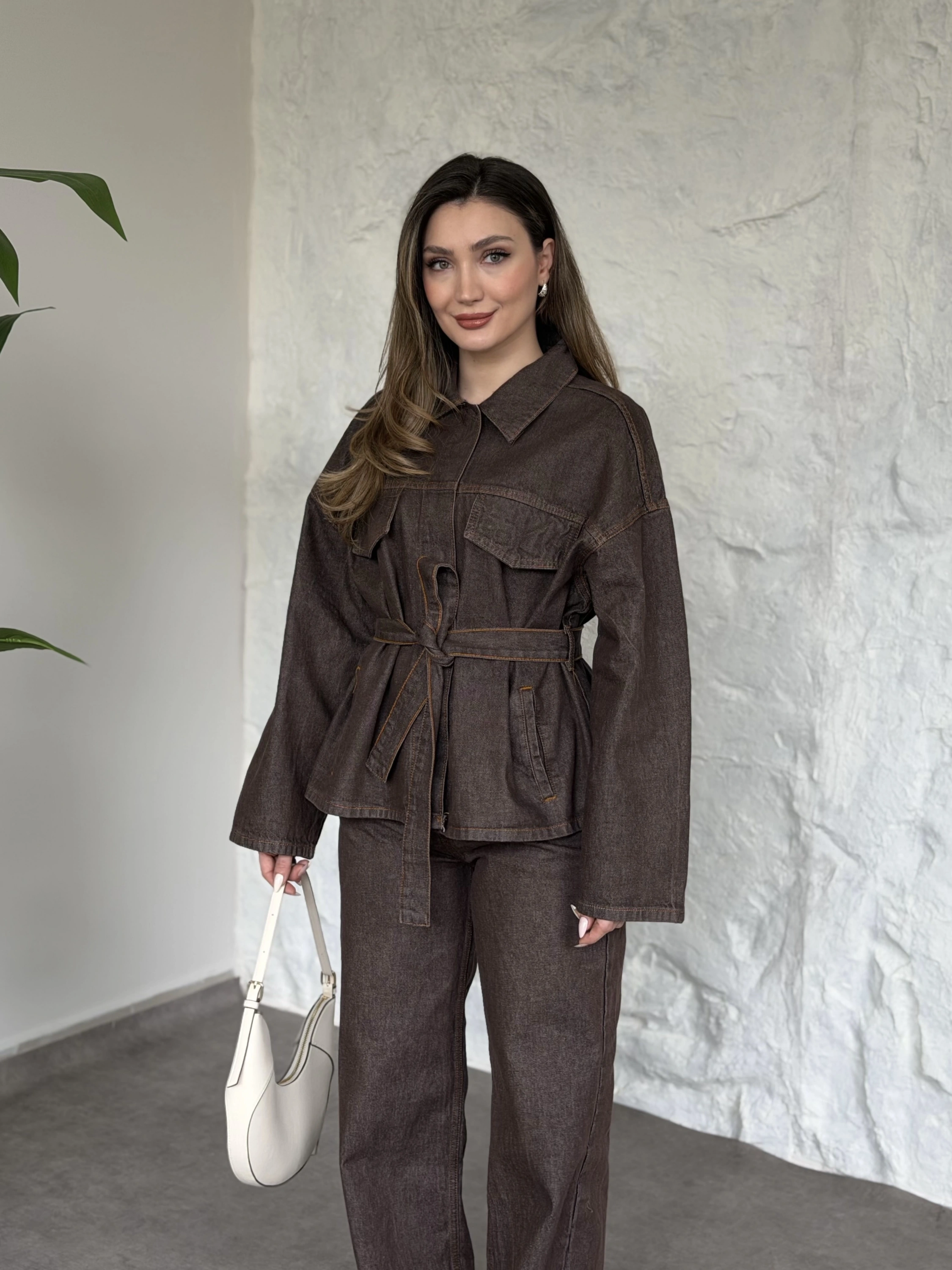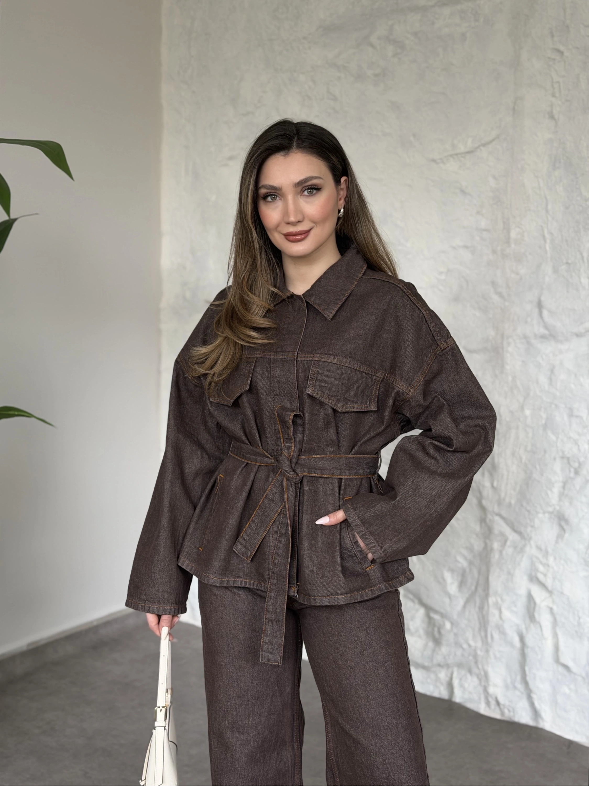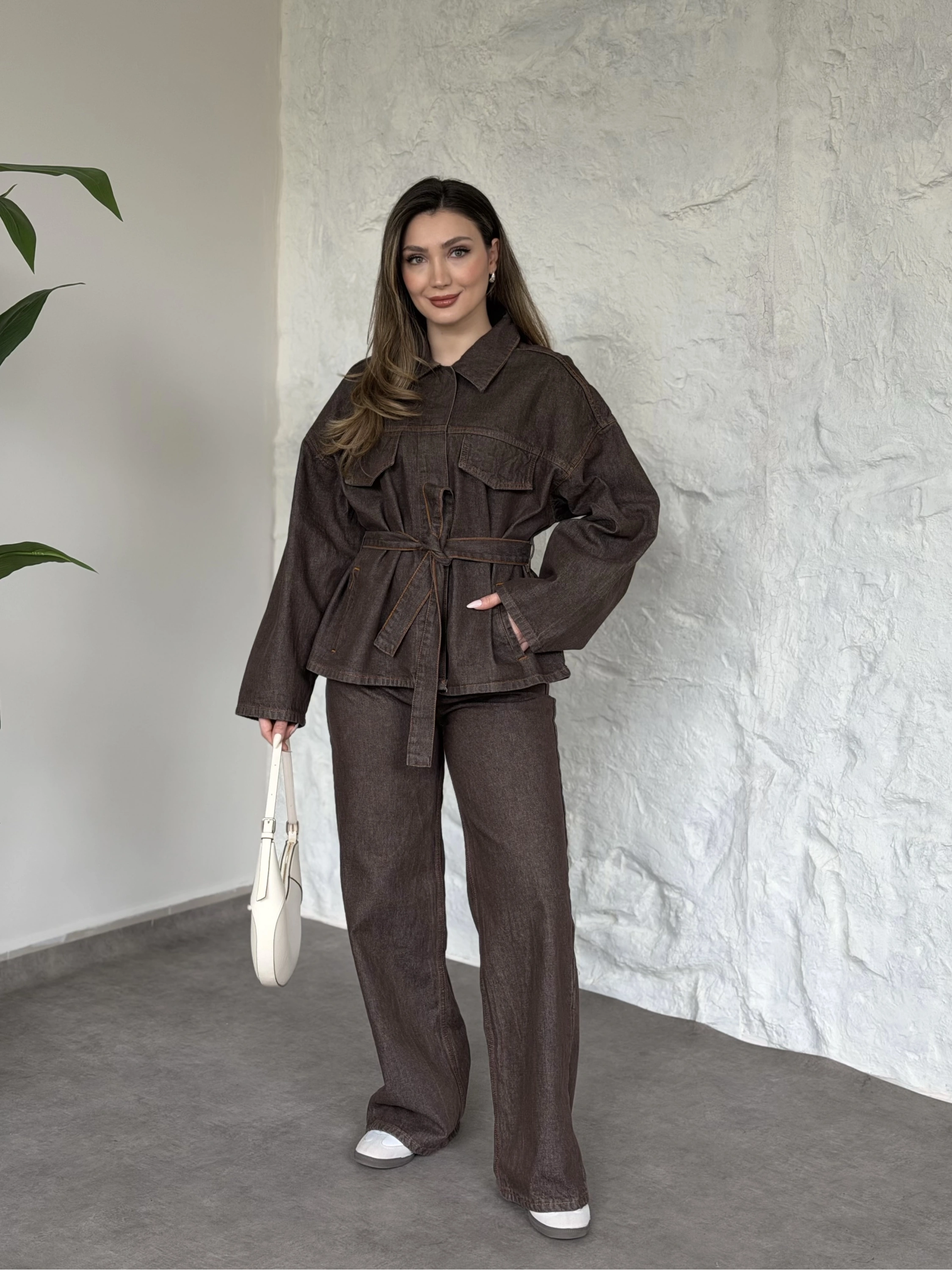 Gizli çıt çıt düğmeli belinden kuşaklı denim takım kahve