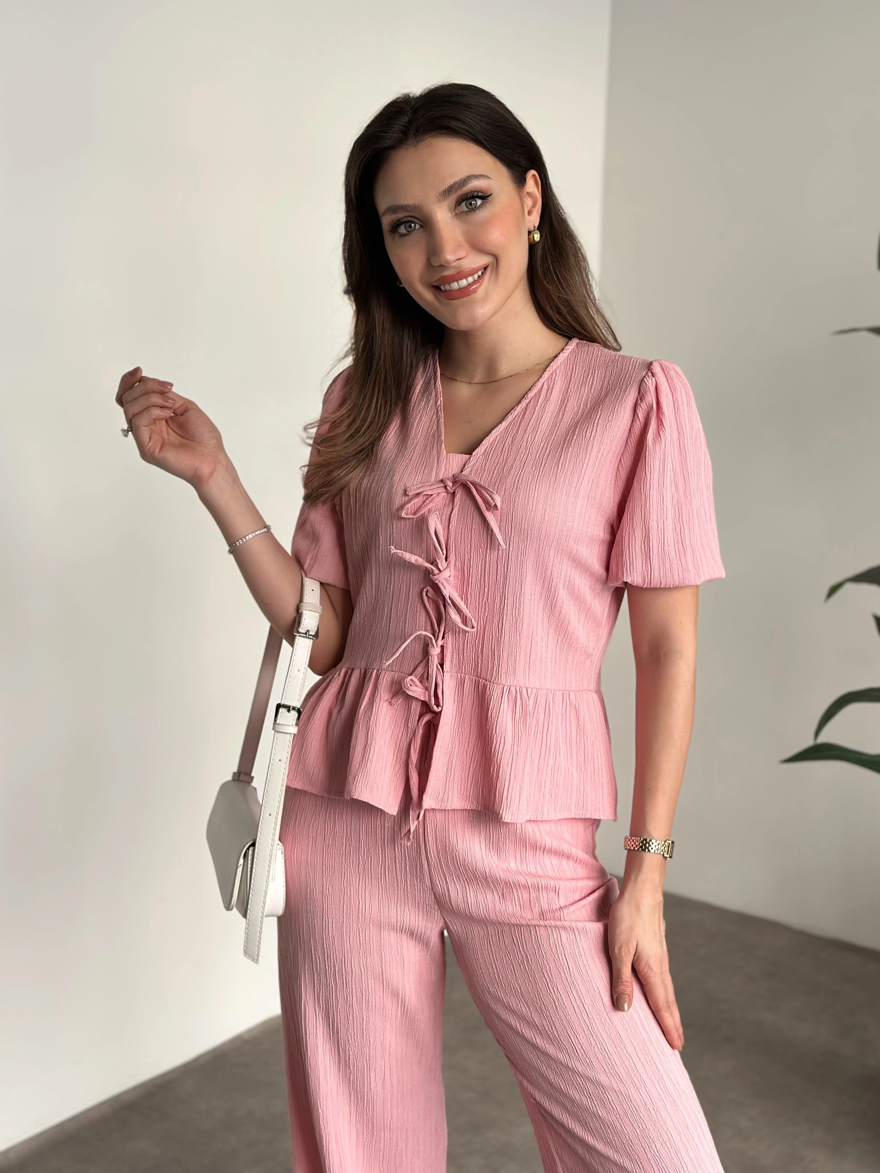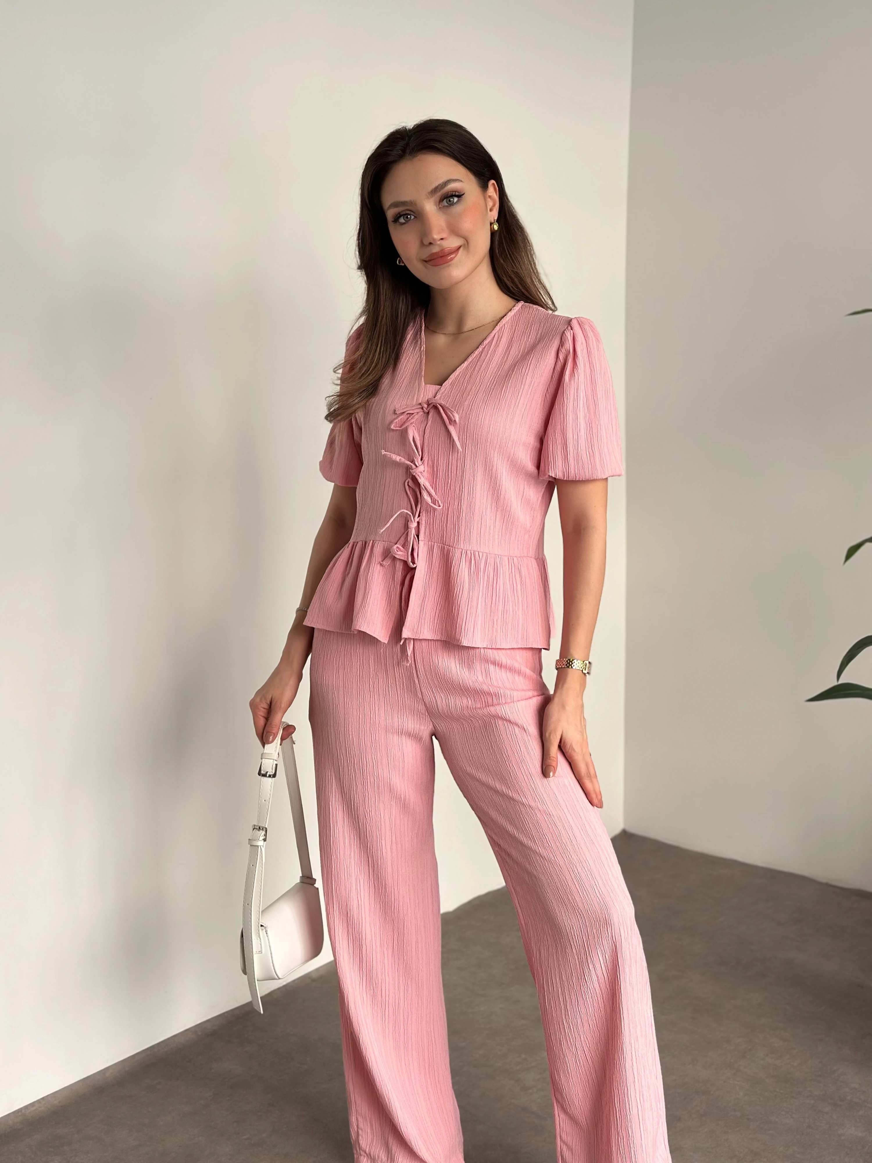 Gofre bağlama detaylı karpuz kol takım pembe