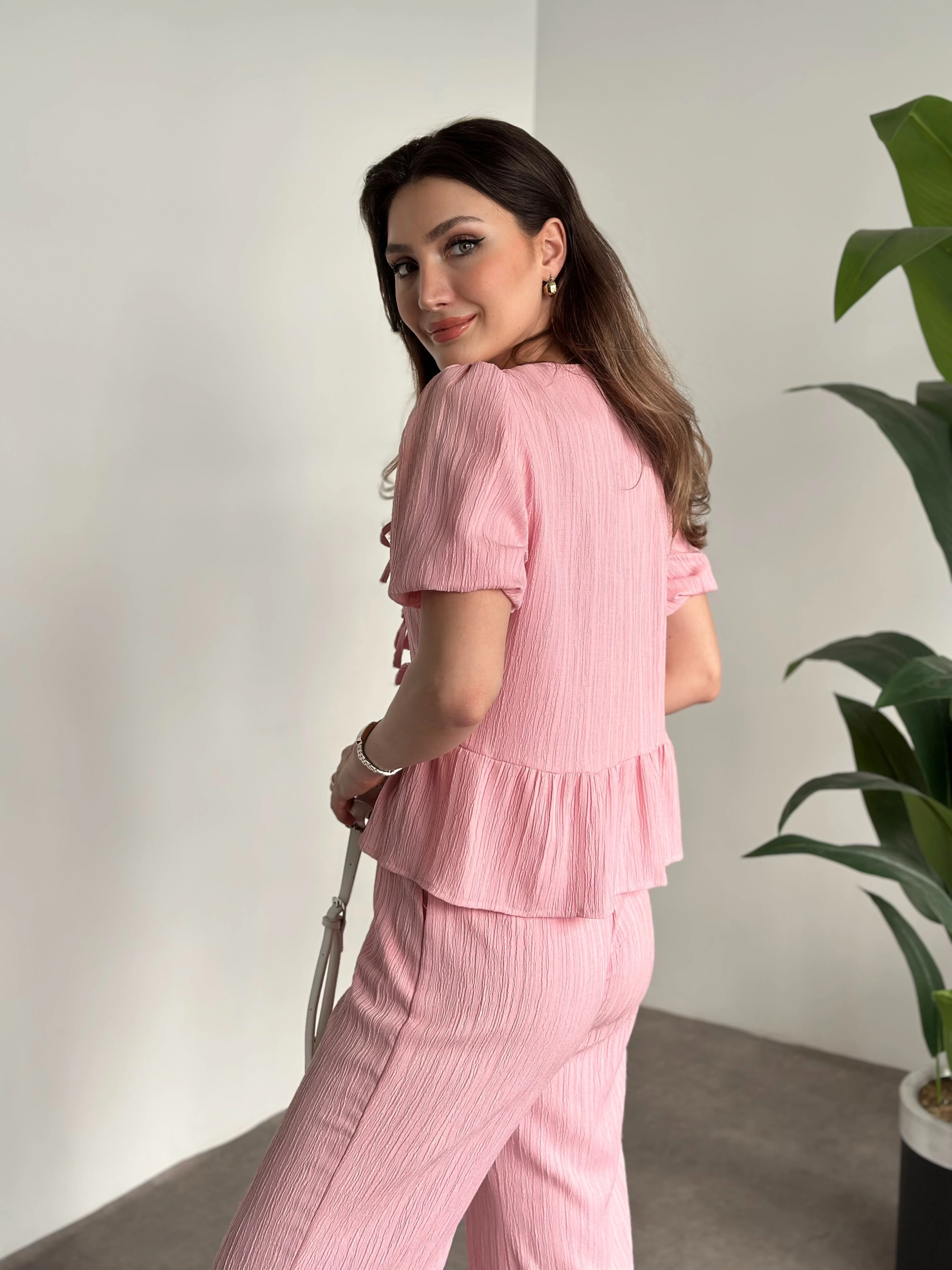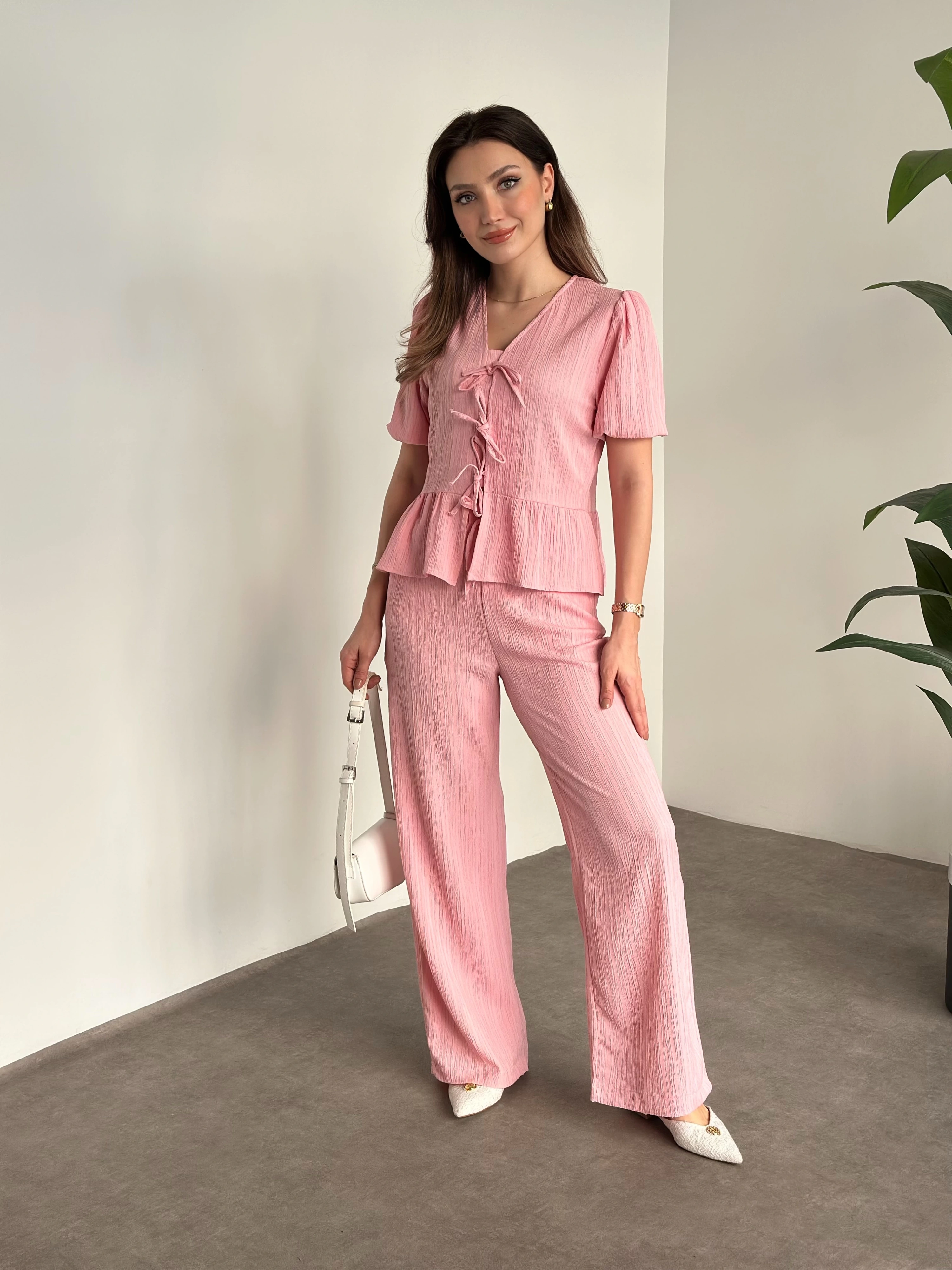 Gofre kumaş tek omuz detaylı takım pembe