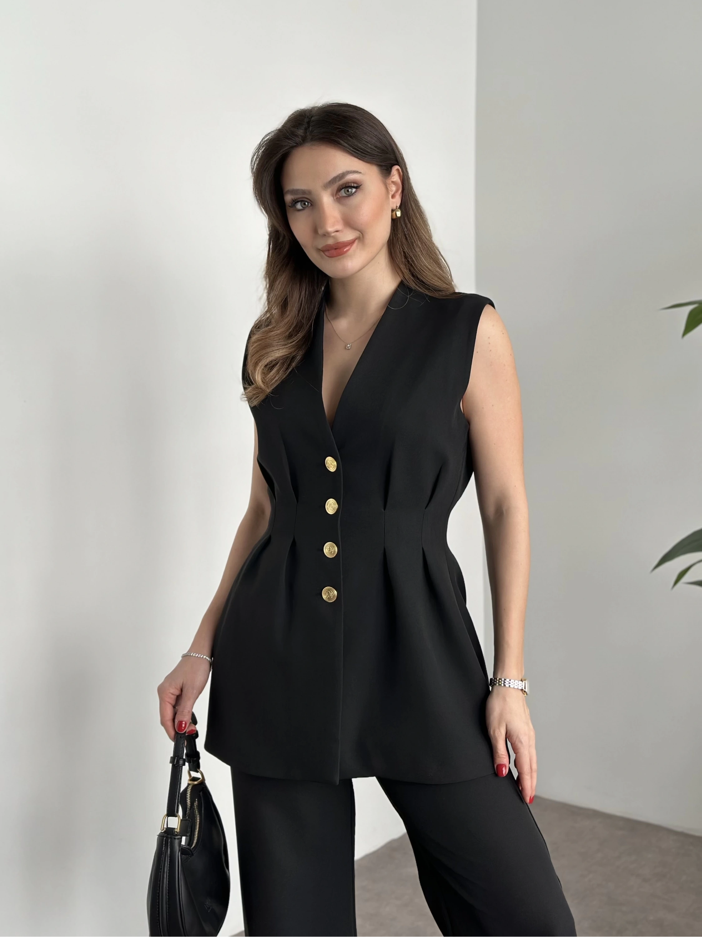 Sıfır kol belden bağlamalı kumaş takım siyah