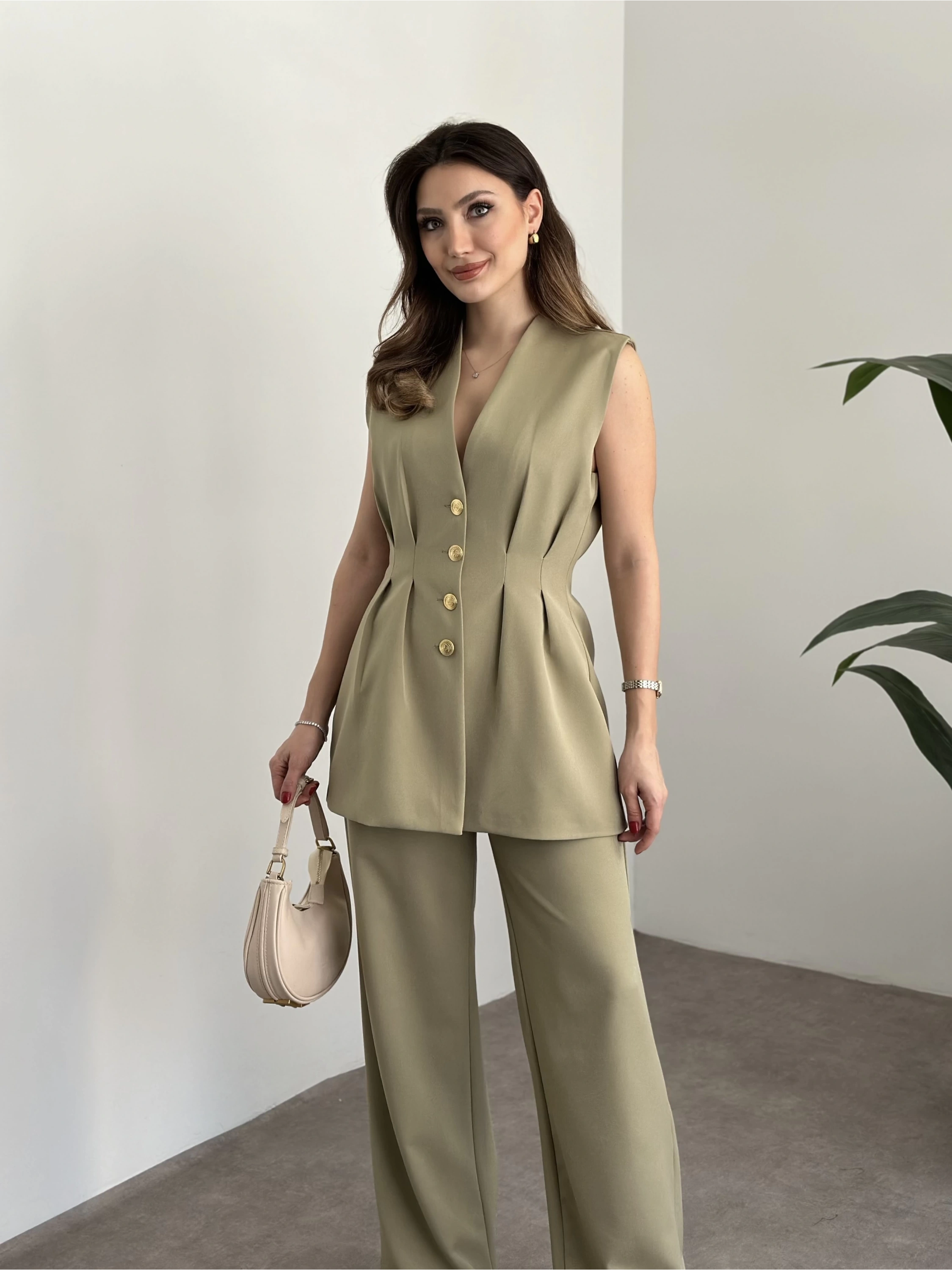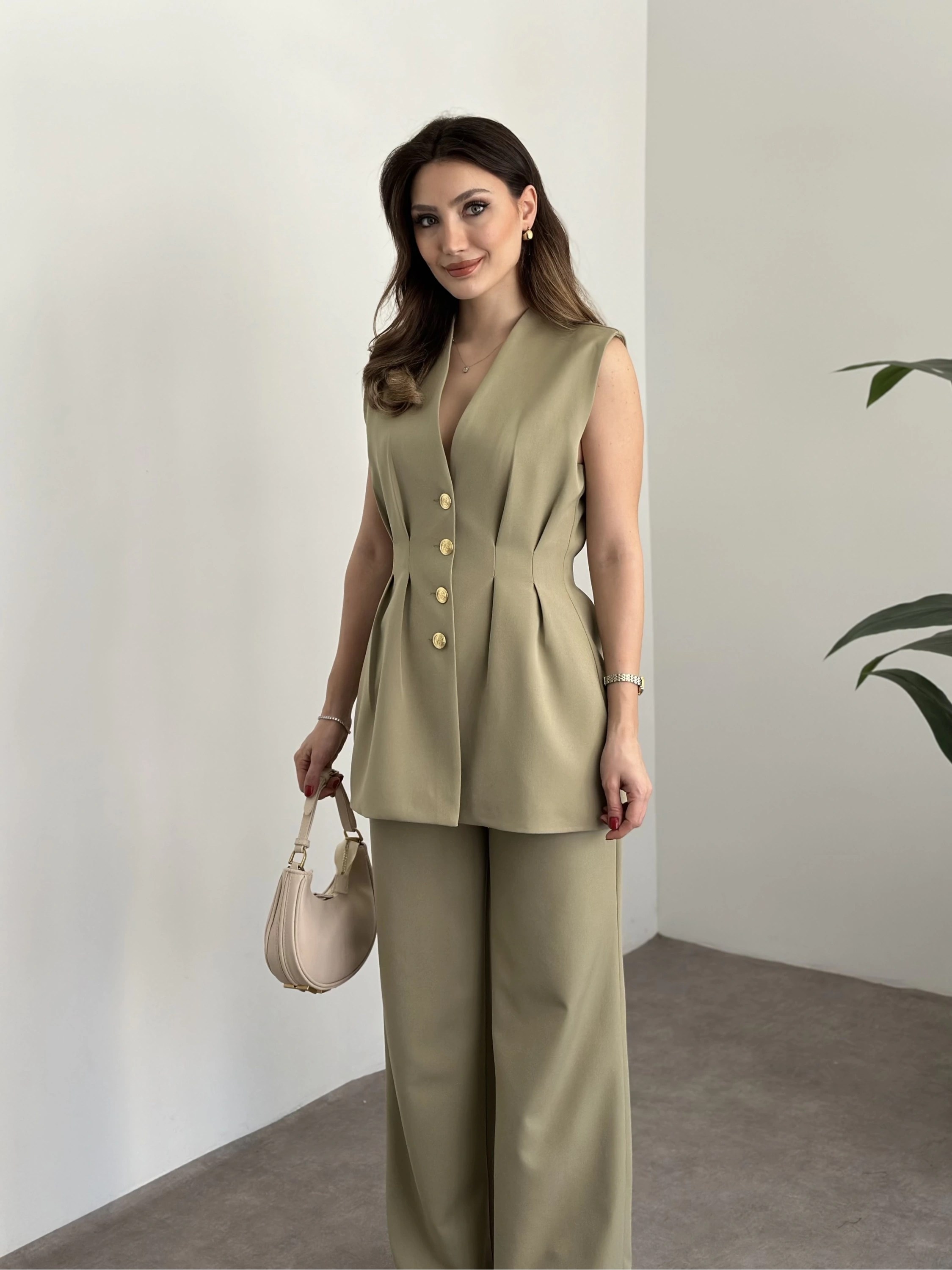 Düğme detaylı yelekli takım kahve