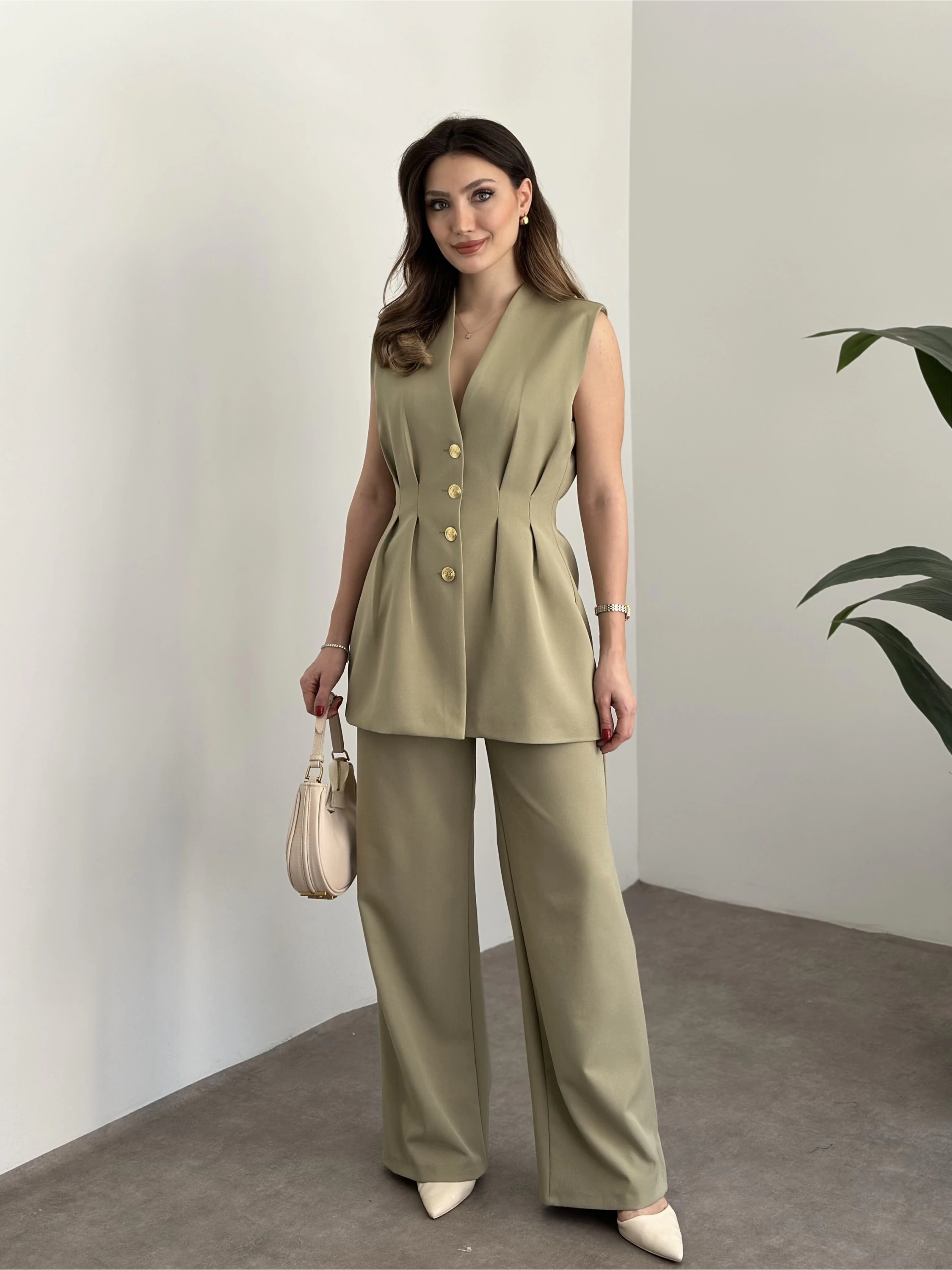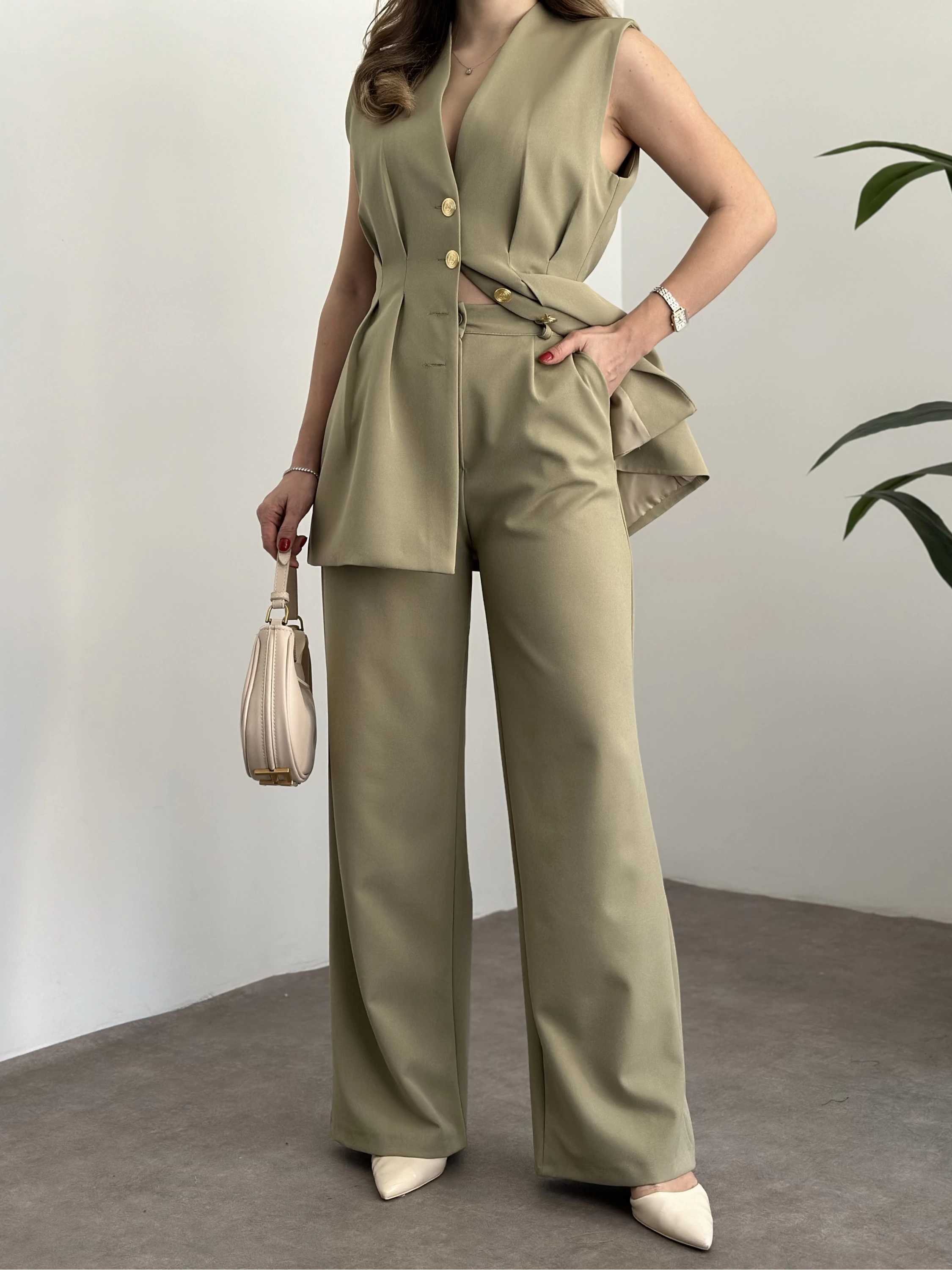 Gold düğmeli belden oturtmalı takım yeşil