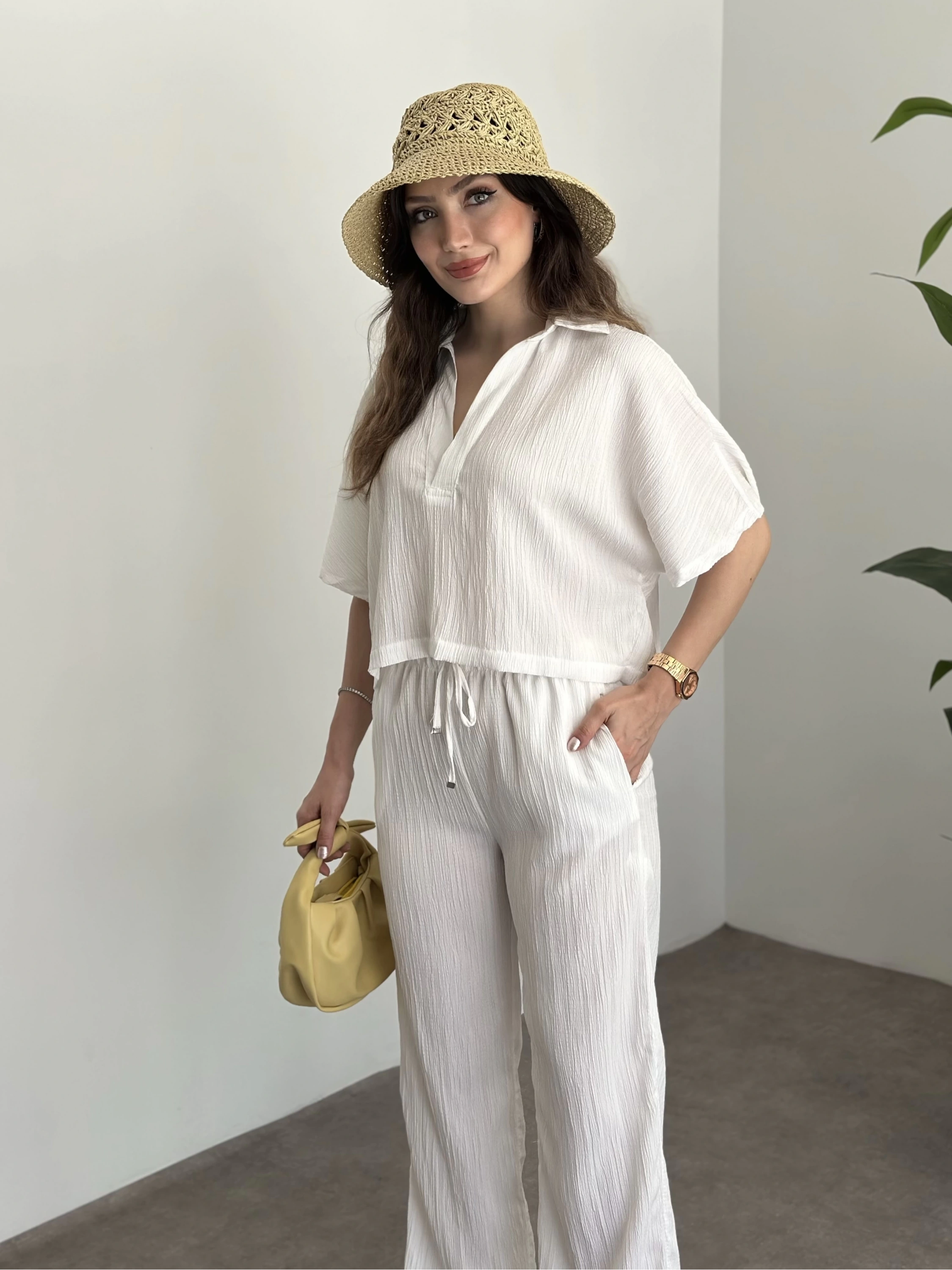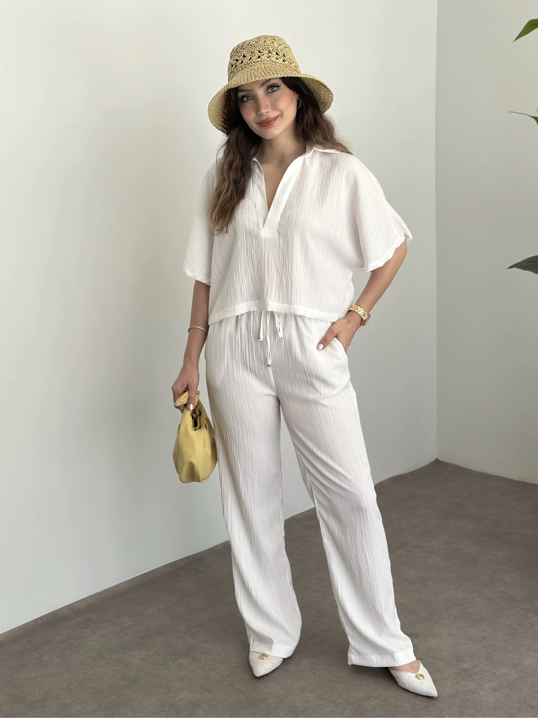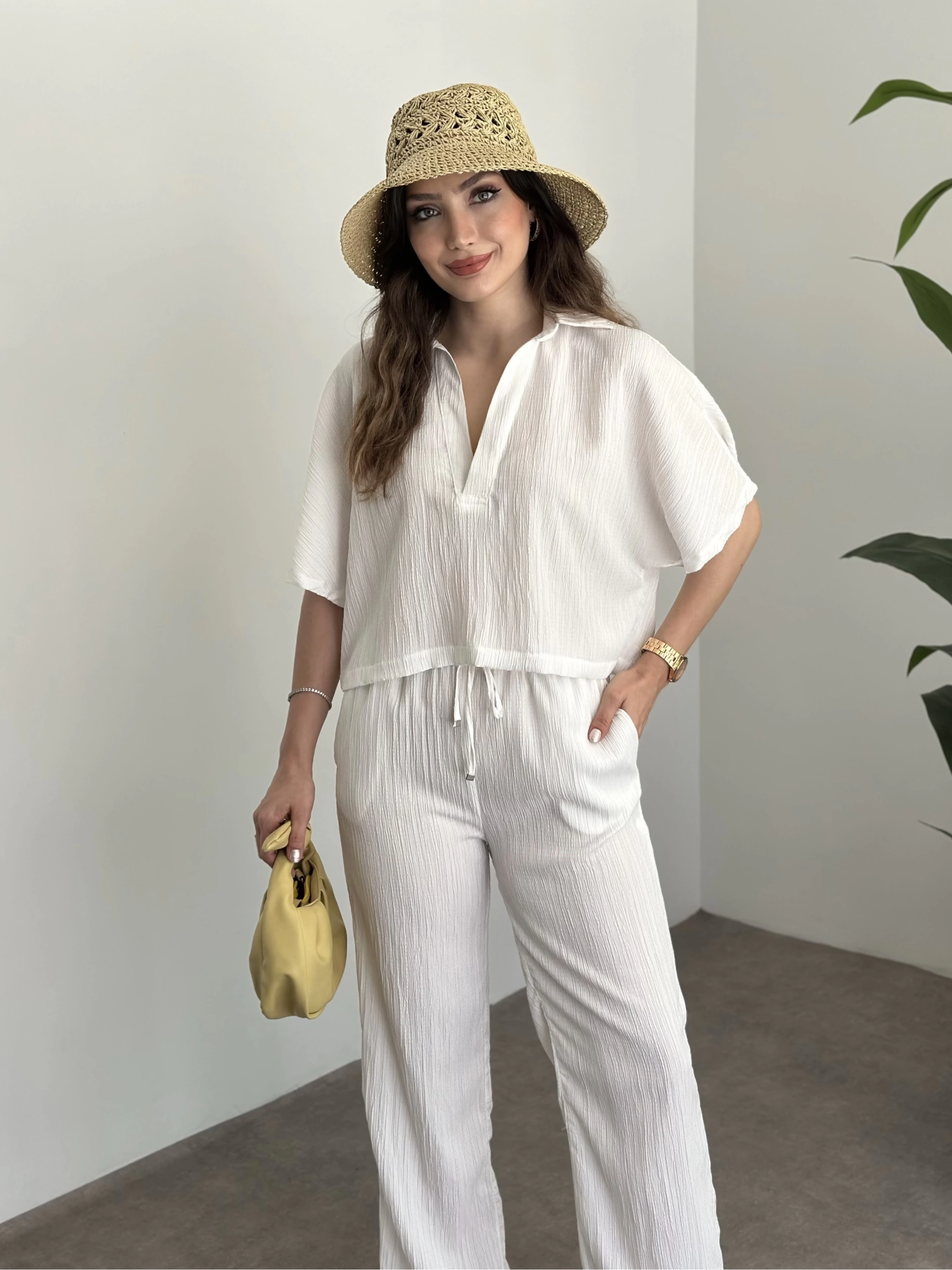Premium yandan bağlama detaylı double kumaş takım beyaz