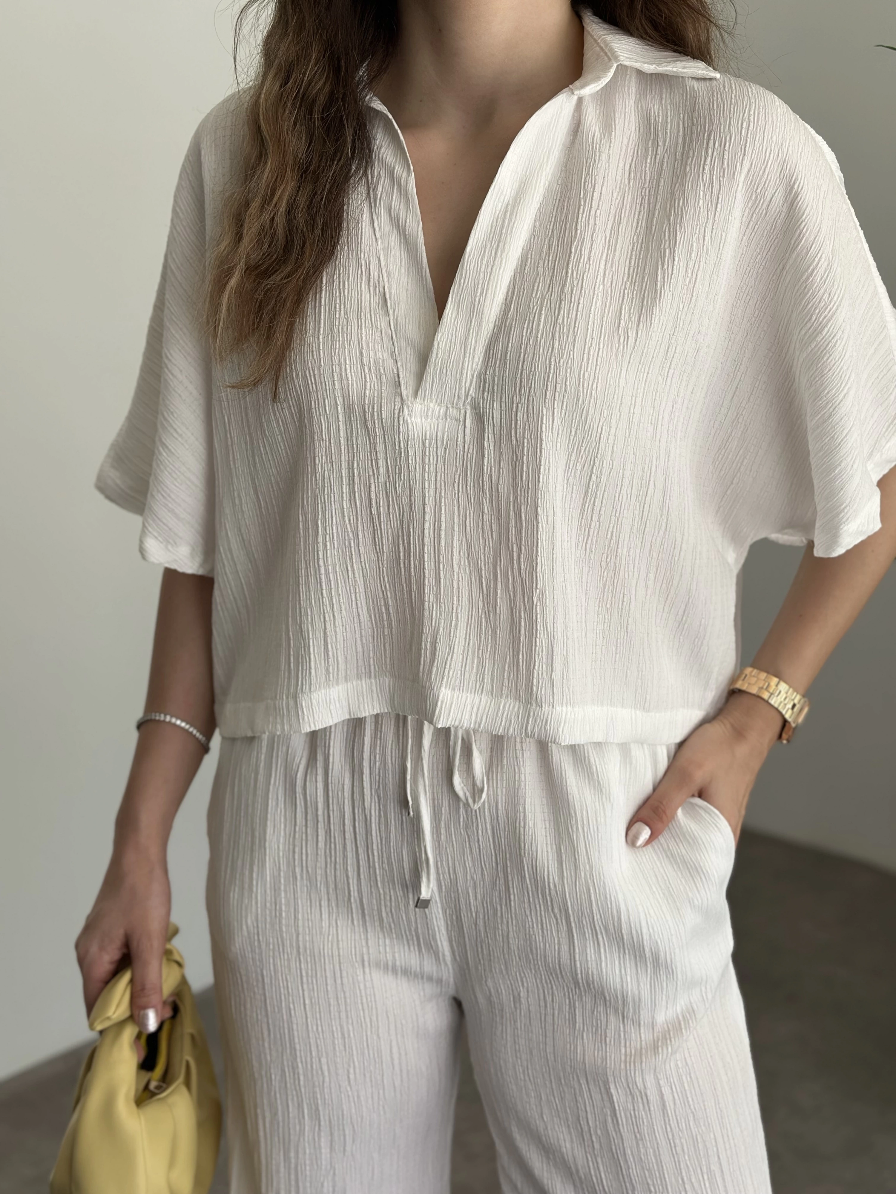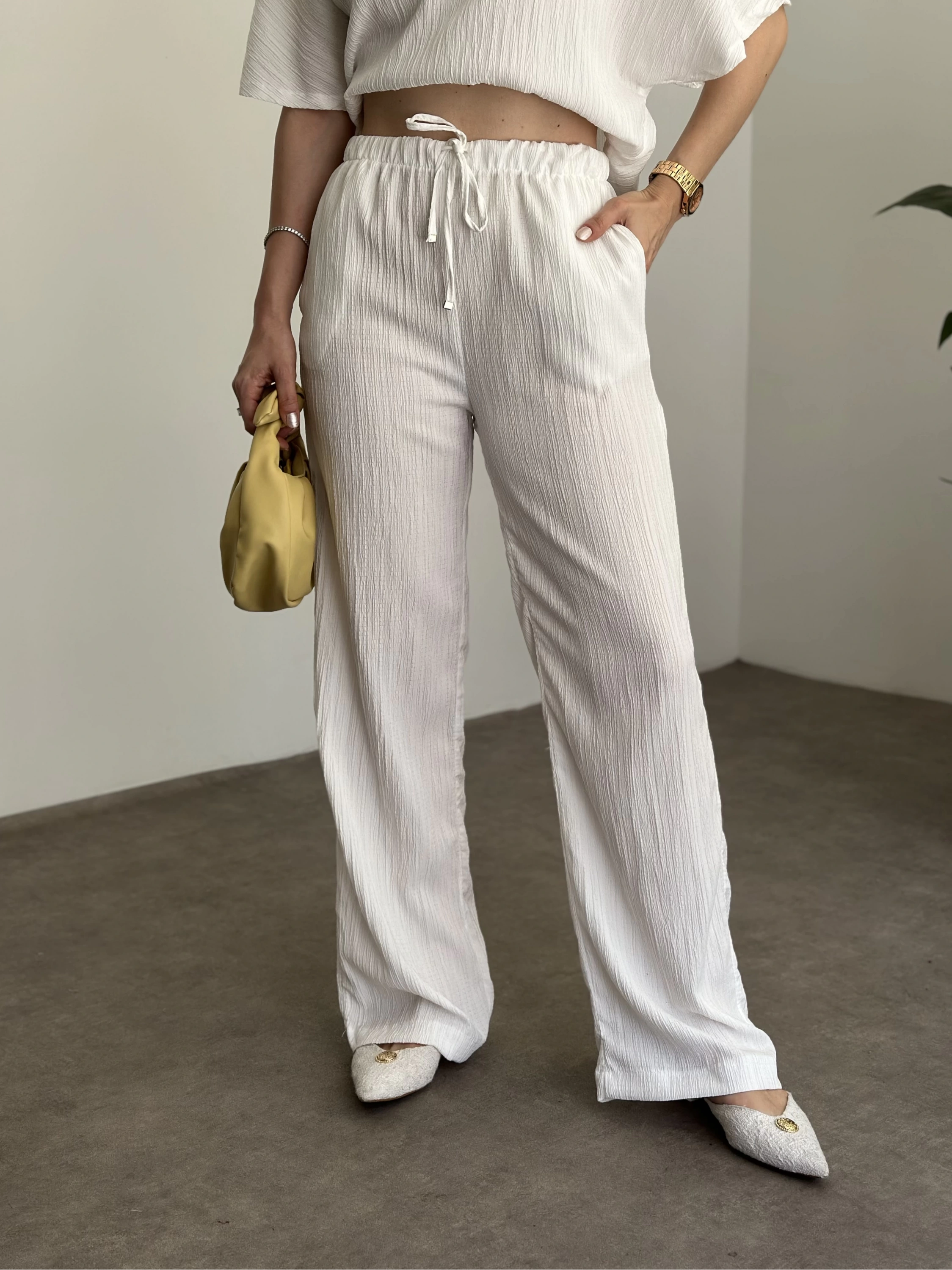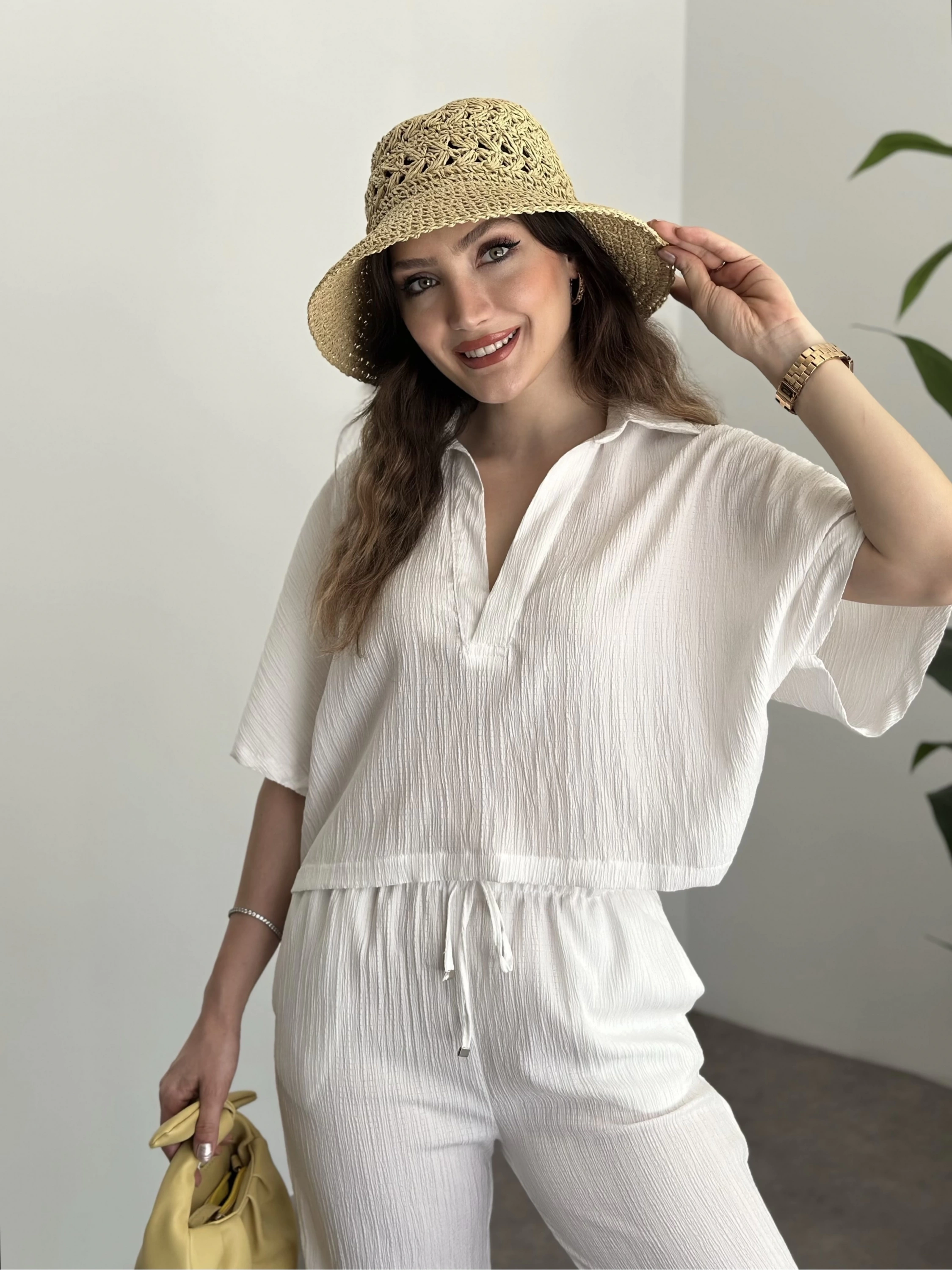 Premium yandan bağlama detaylı double kumaş takım beyaz