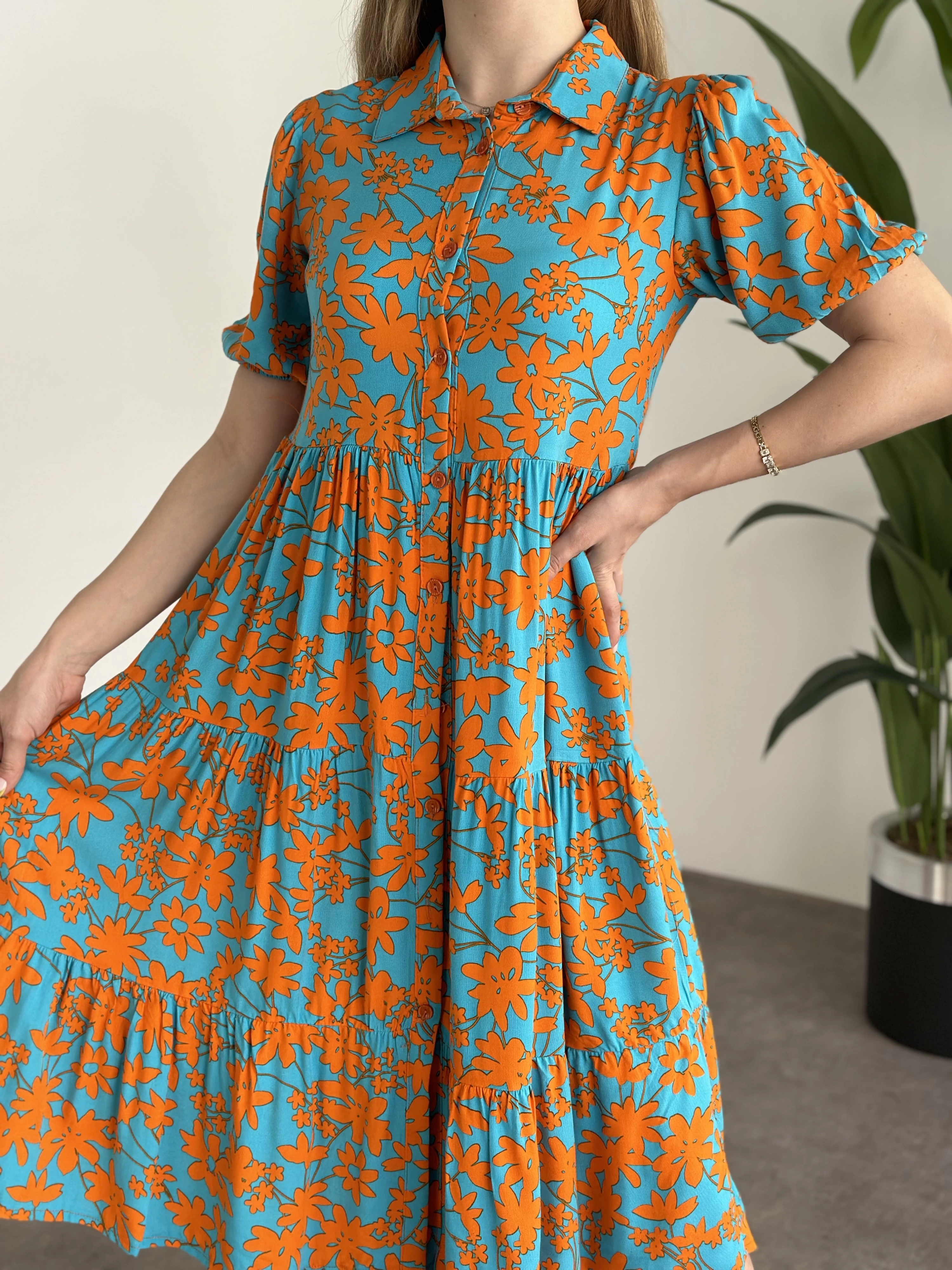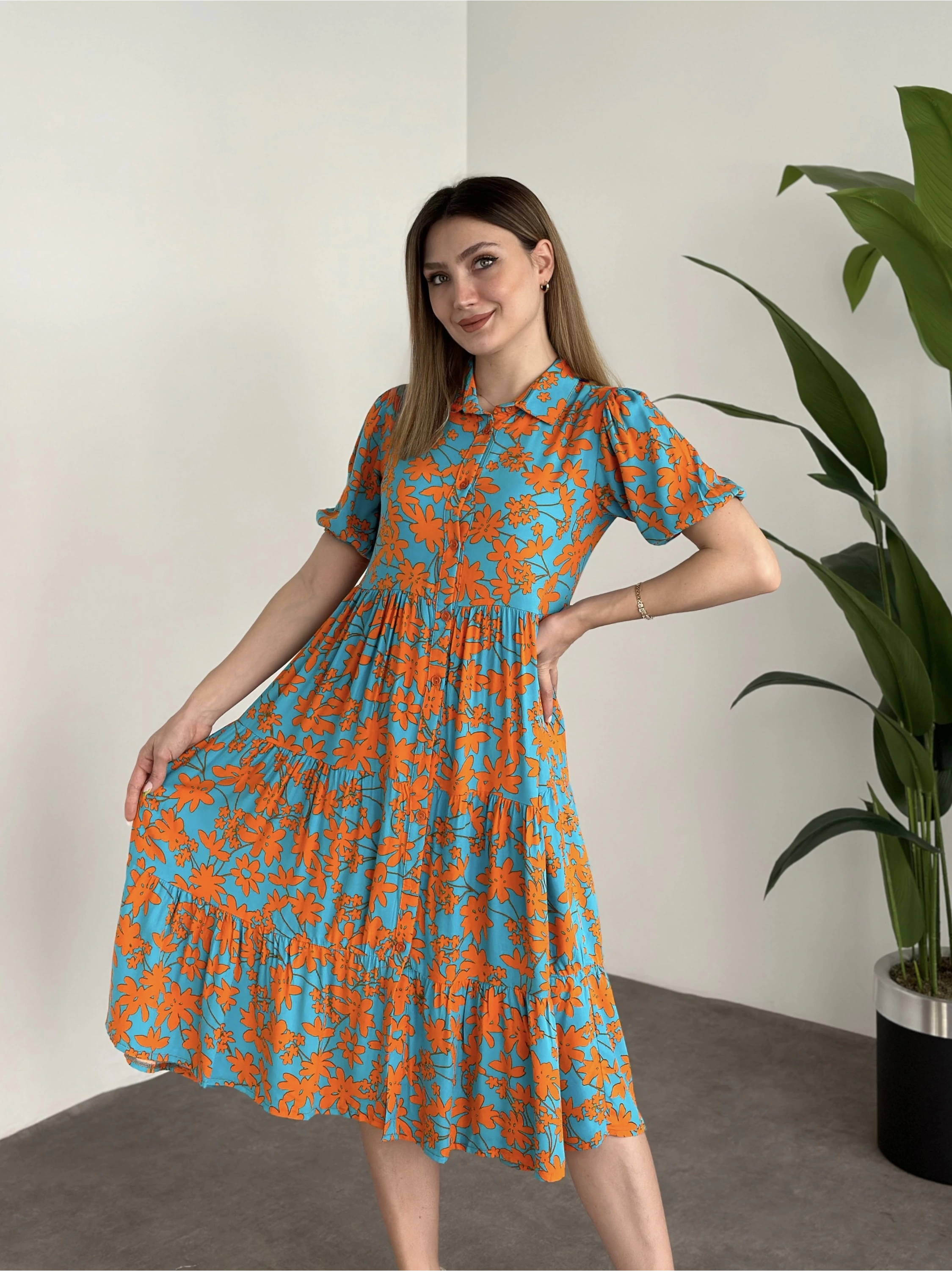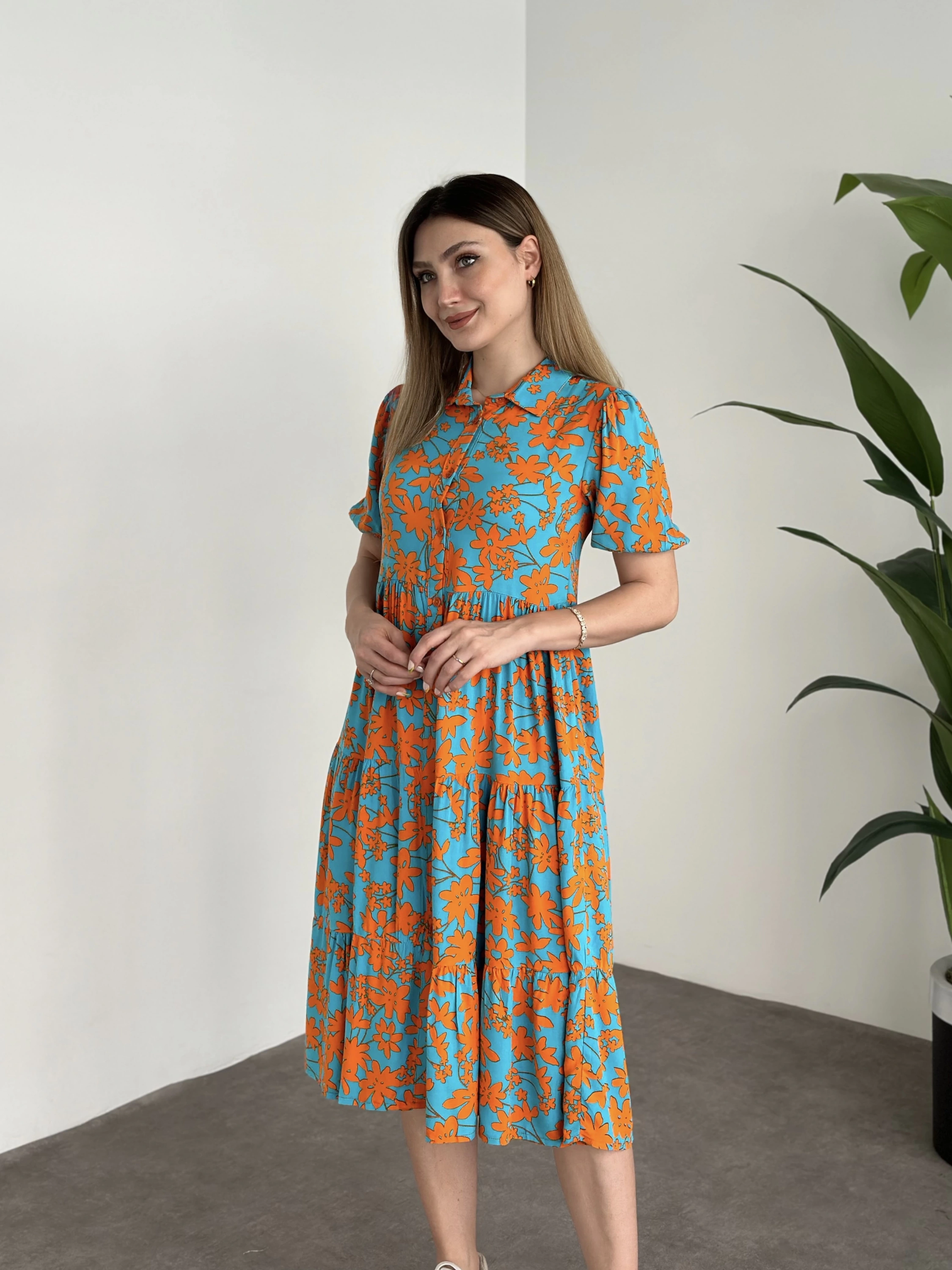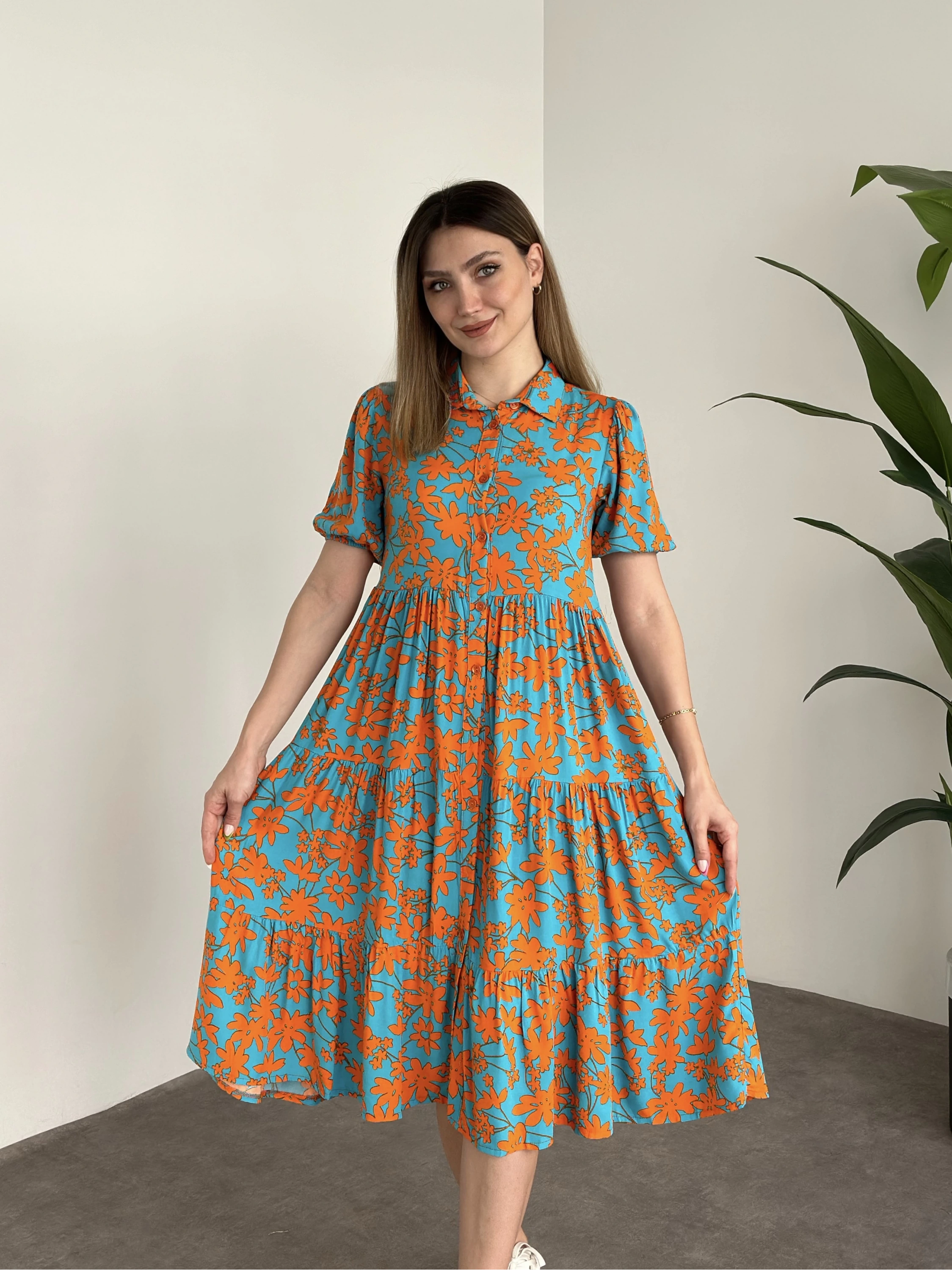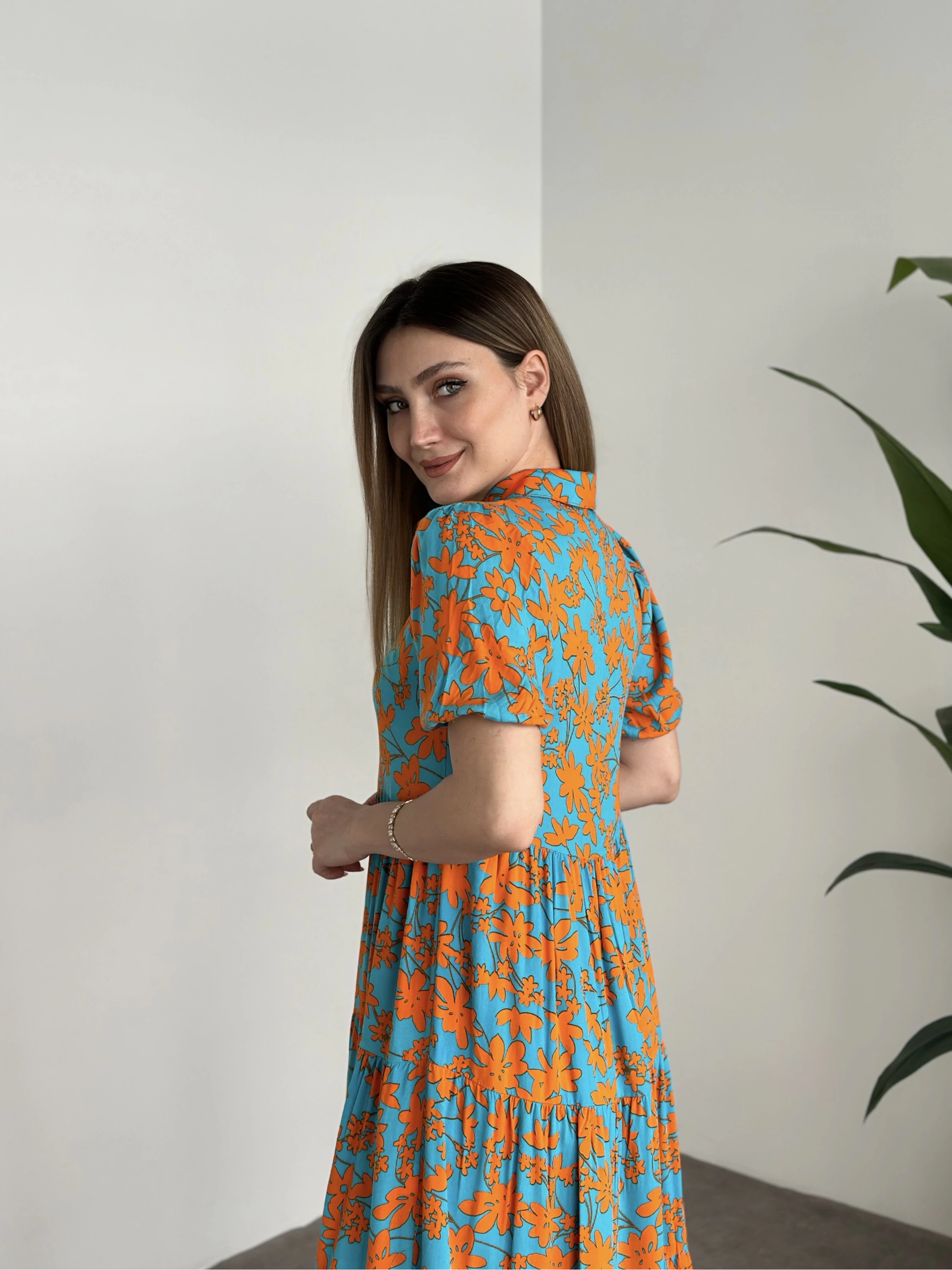 Gömlek Yaka Karpuz Kol Bol Kesim Elbise Turuncu