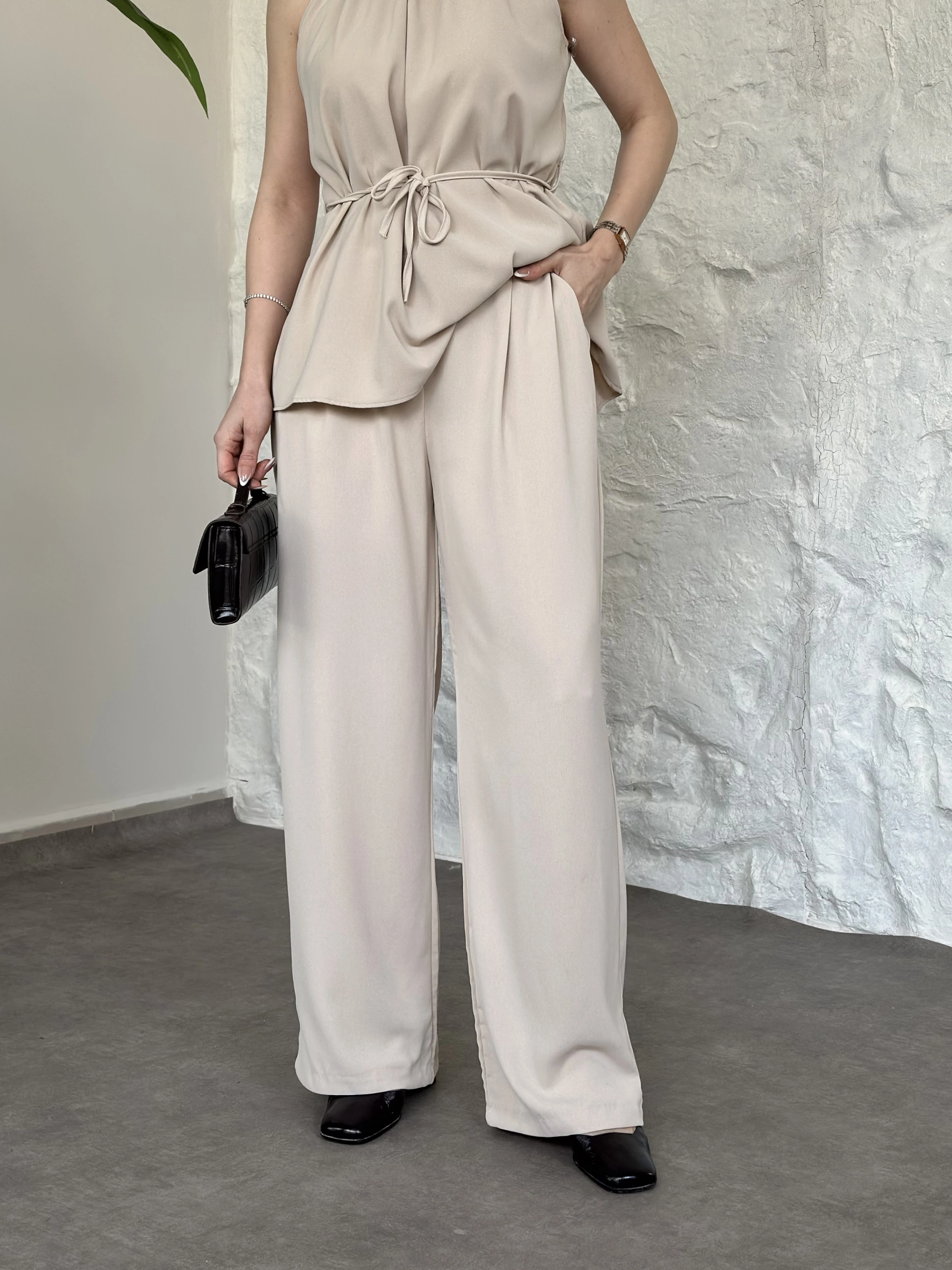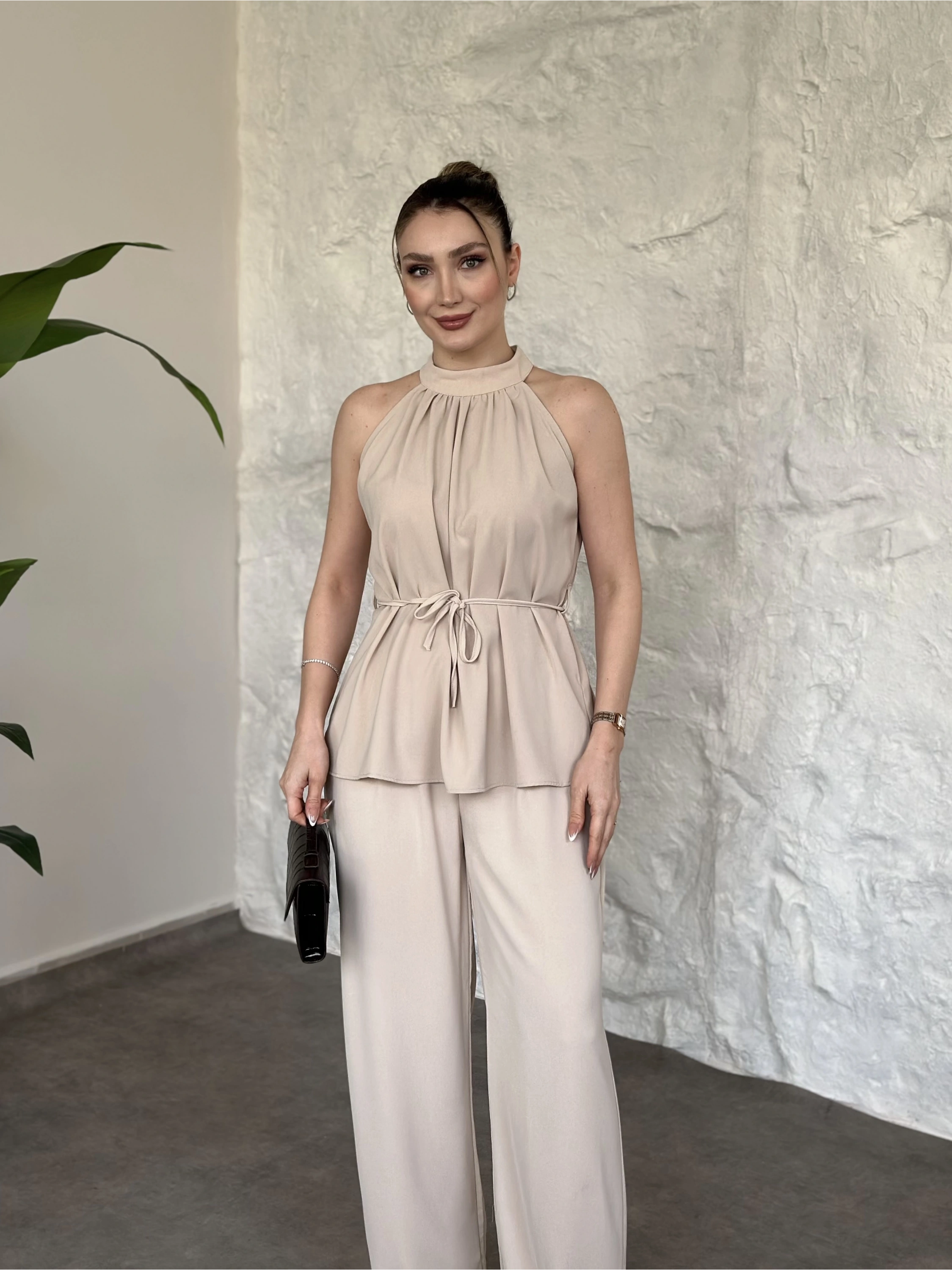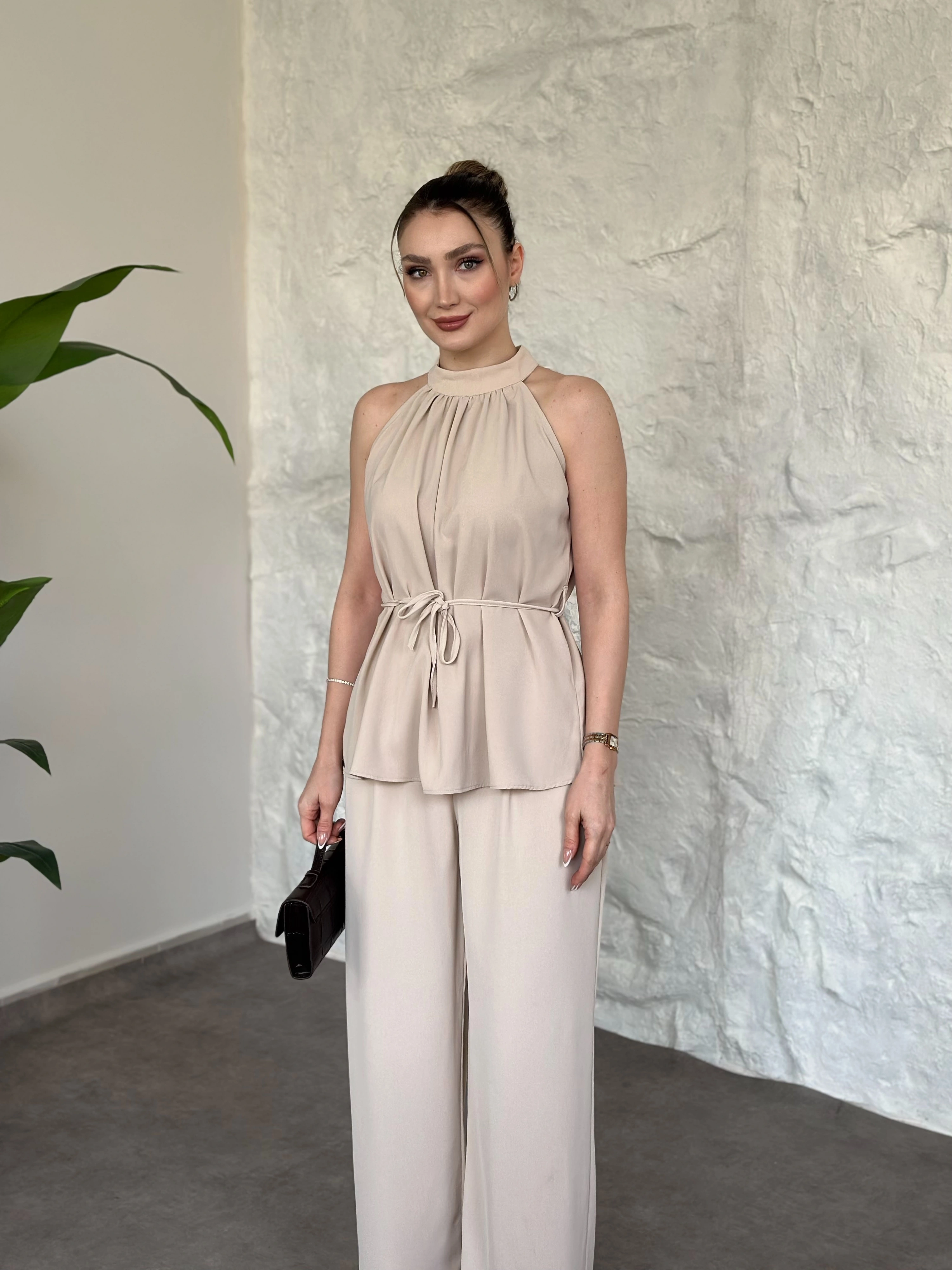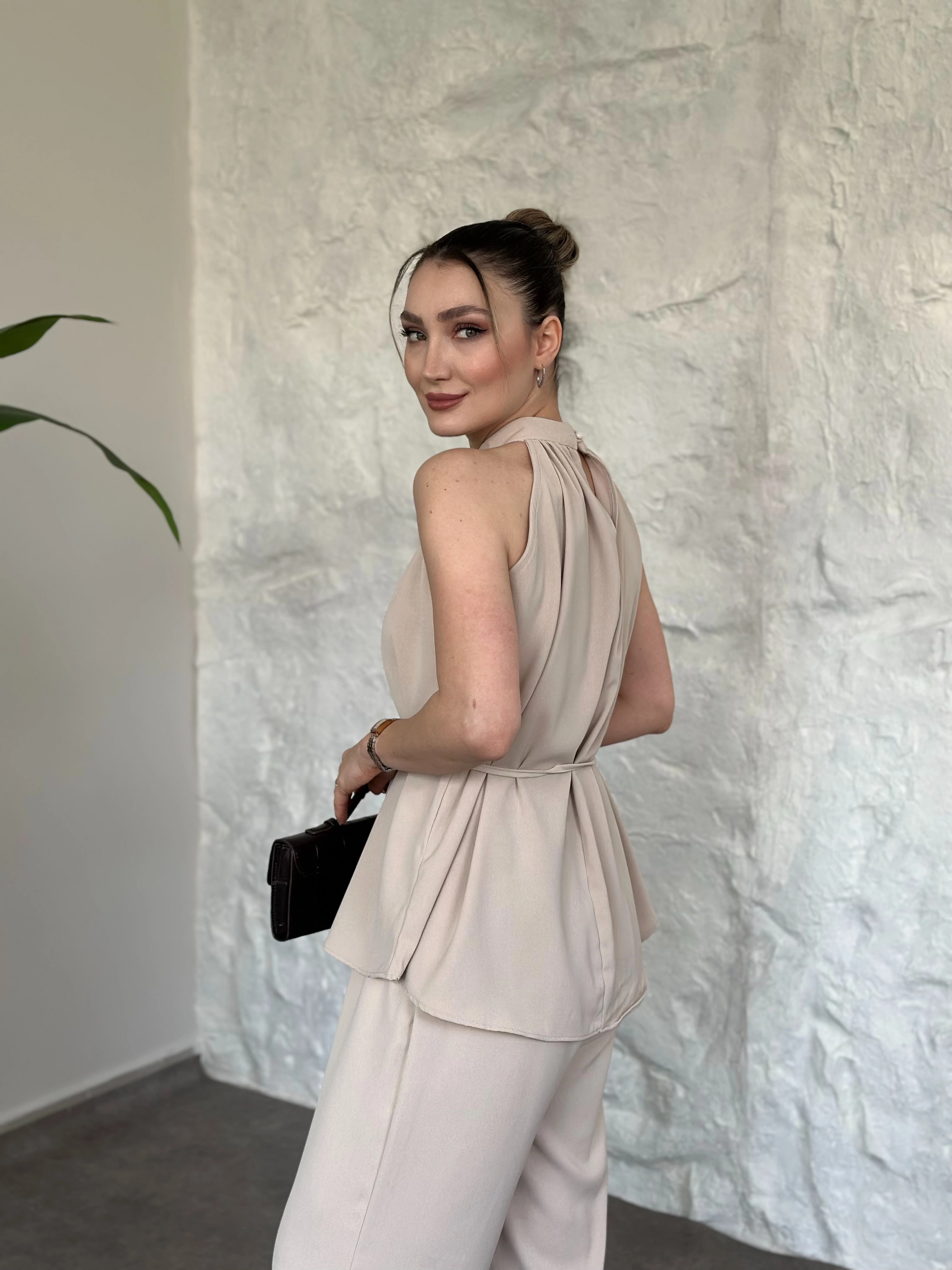 Trenç görünümlü belinden kuşaklı tivil takım krem