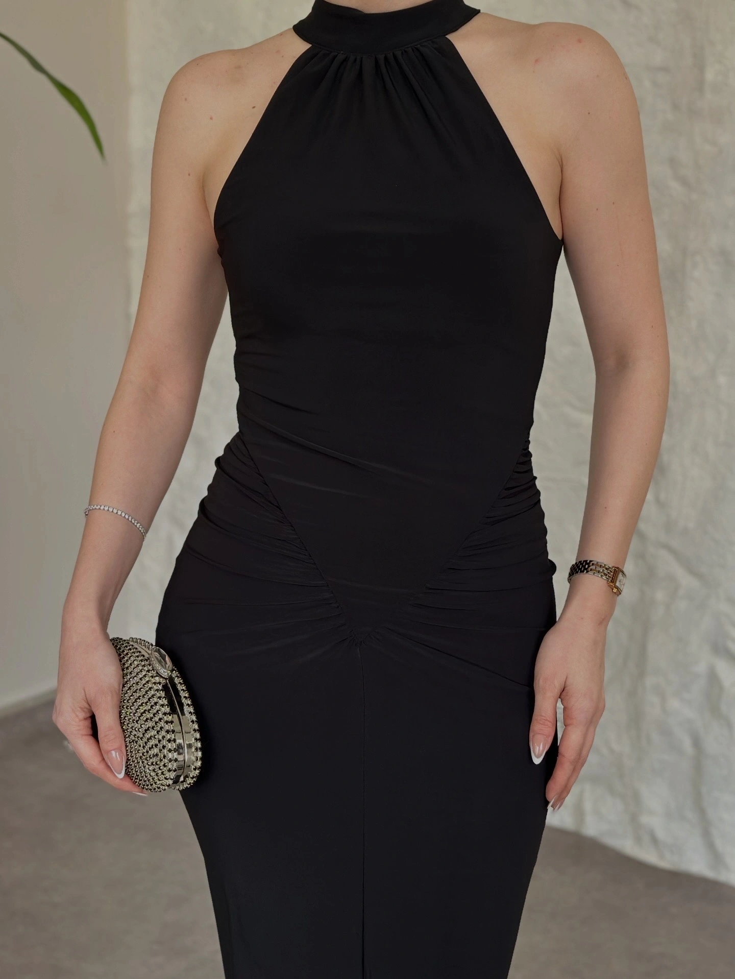 Halter yaka büzgü ve yırtmaç detaylı elbise siyah