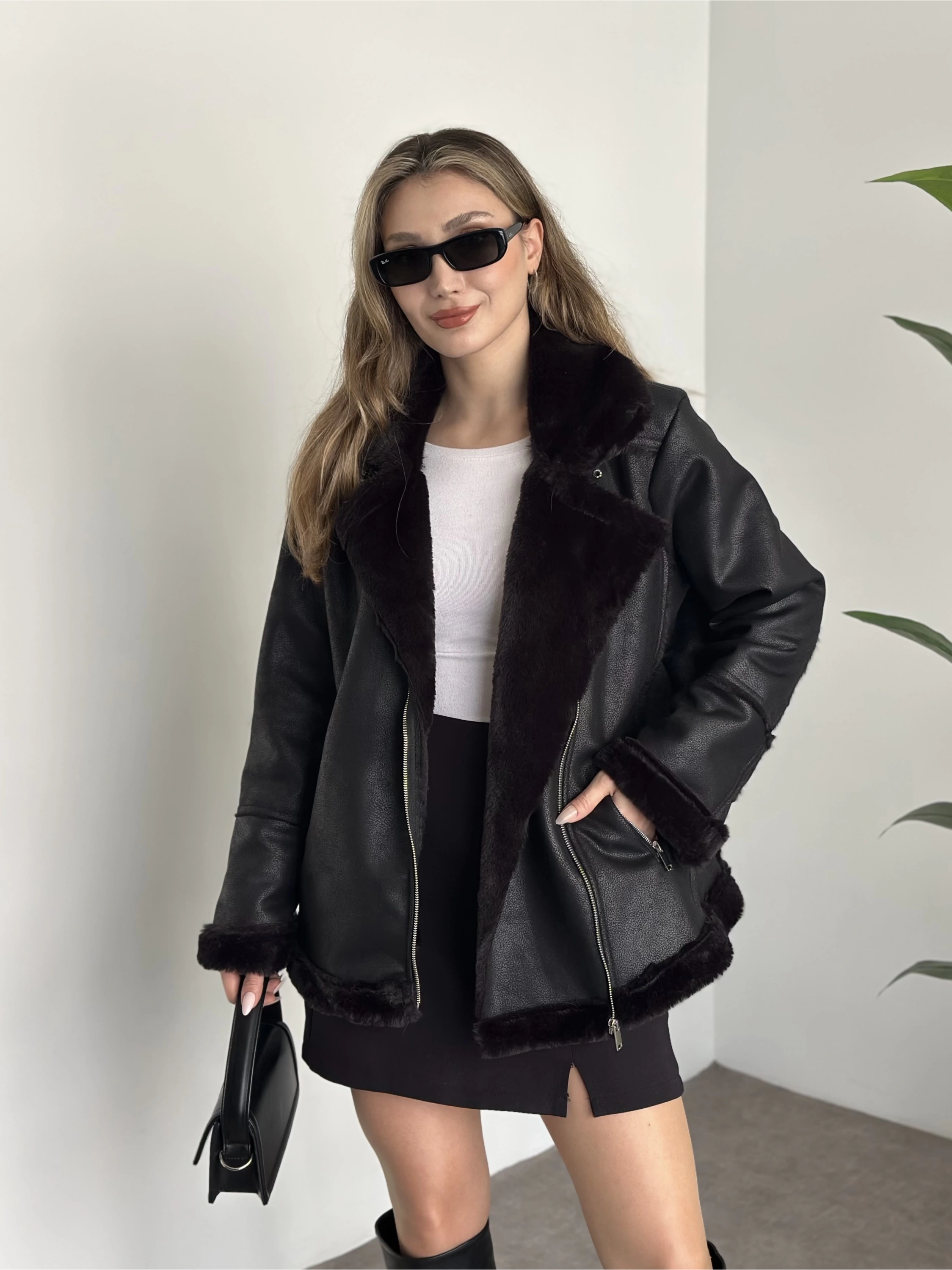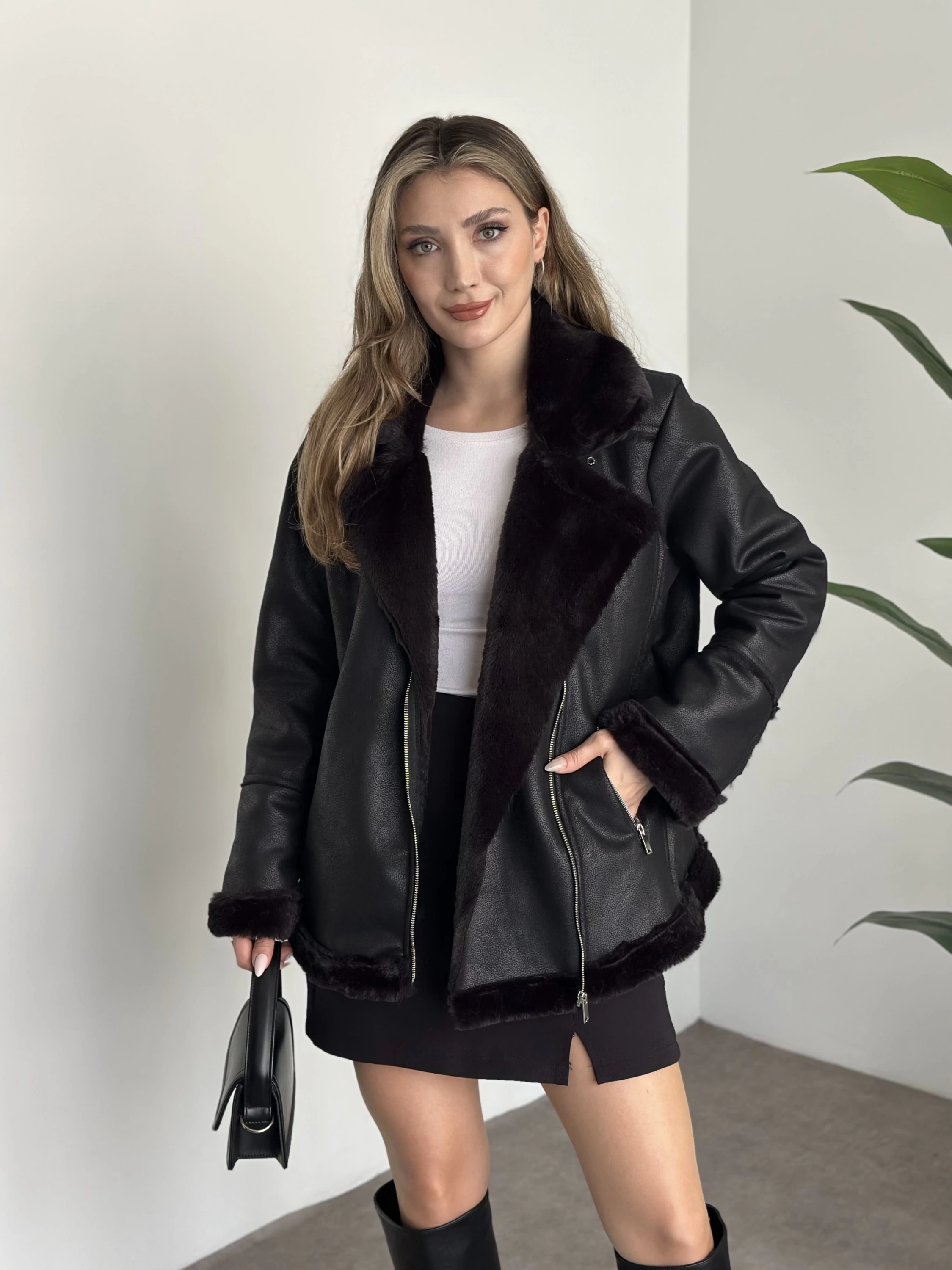 Dokulu süet içi peluşlu oversize marka model mont siyah