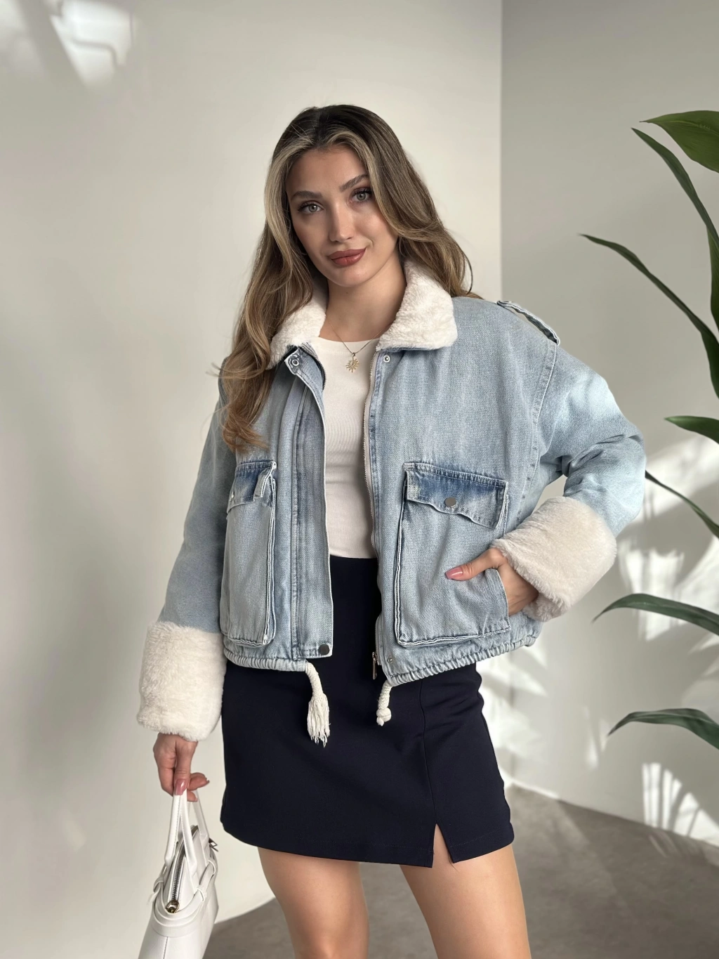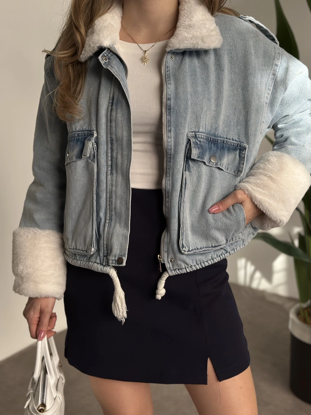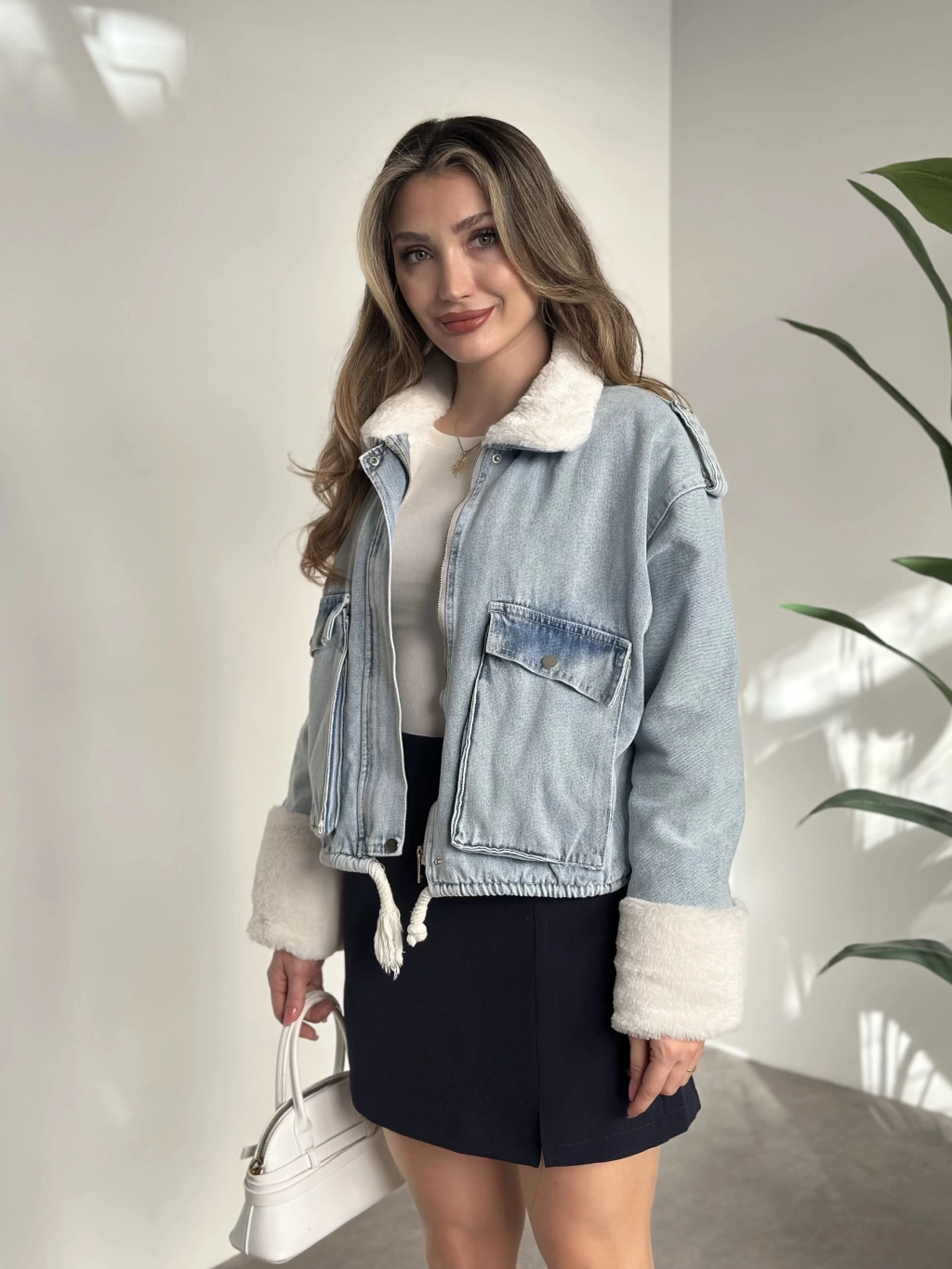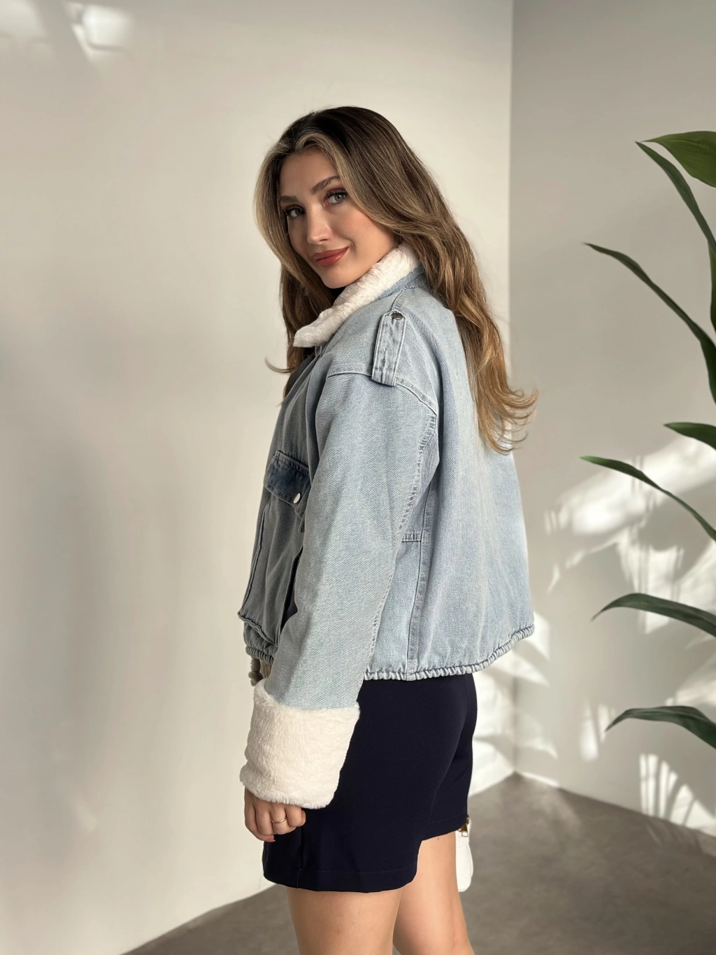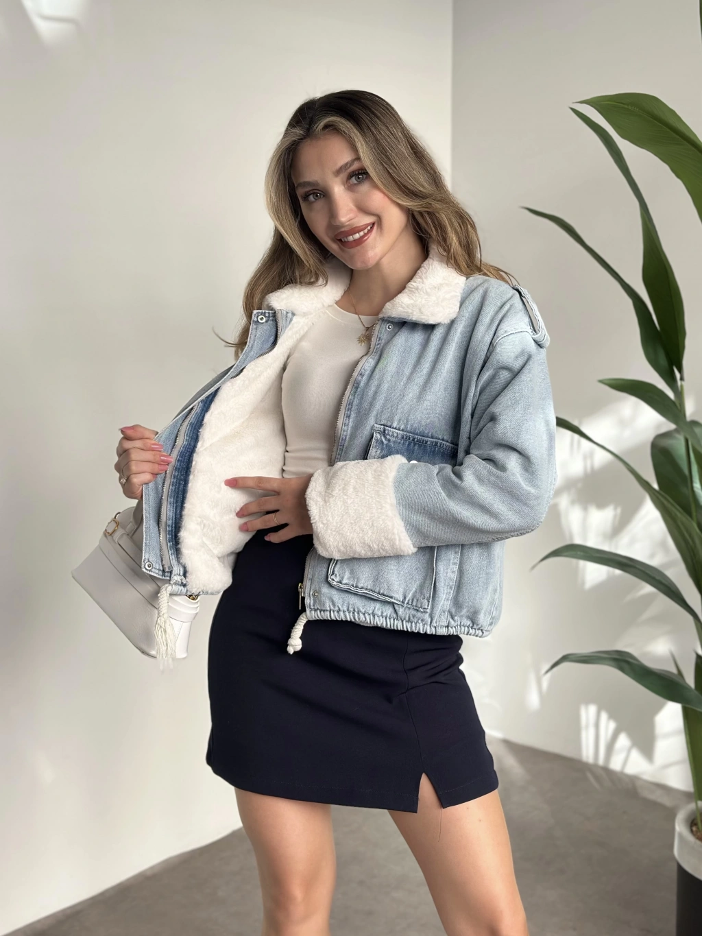 İçi ve yakası tamamen peluş kot mont siyah beyaz
