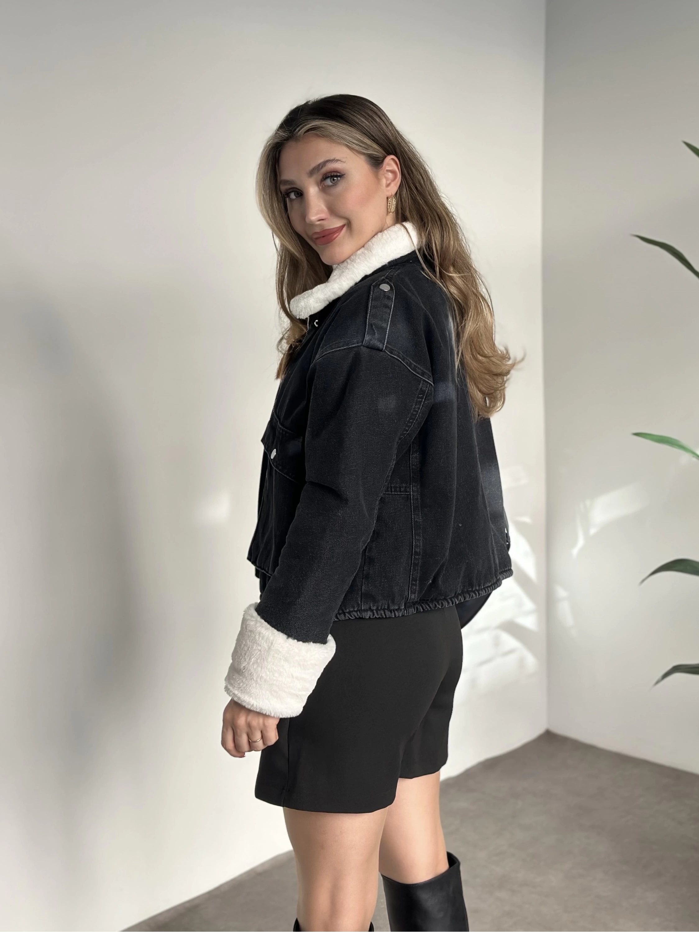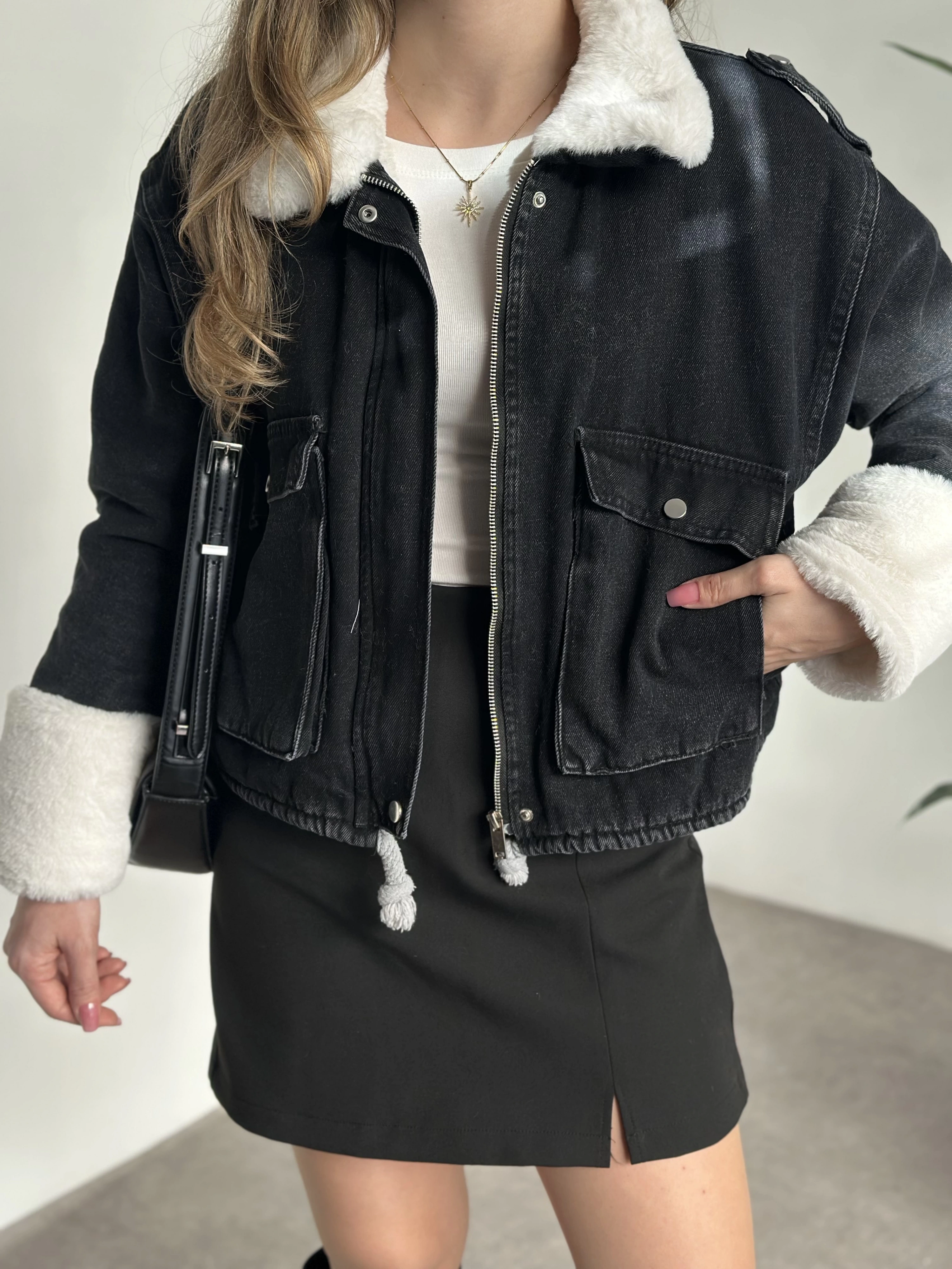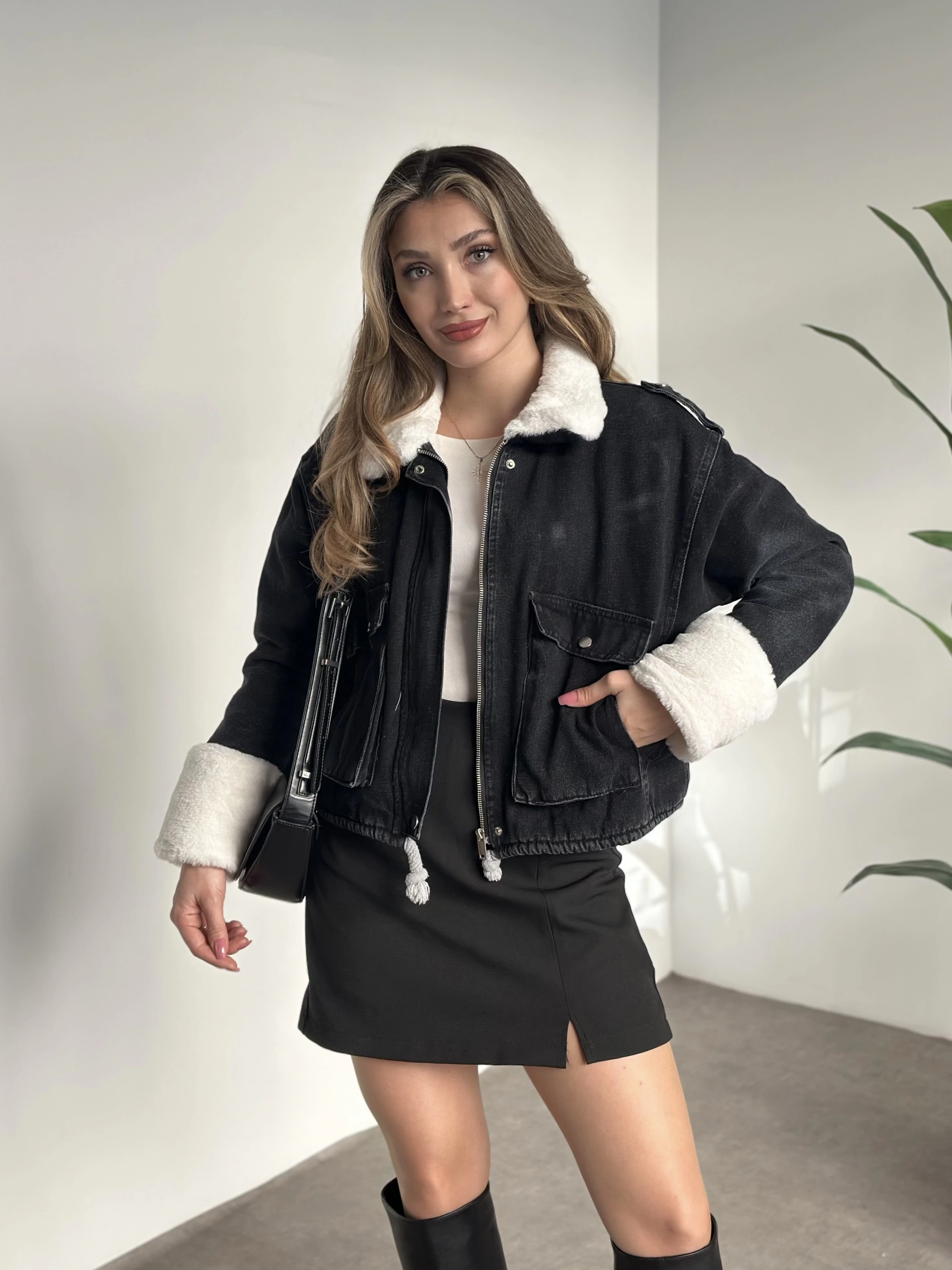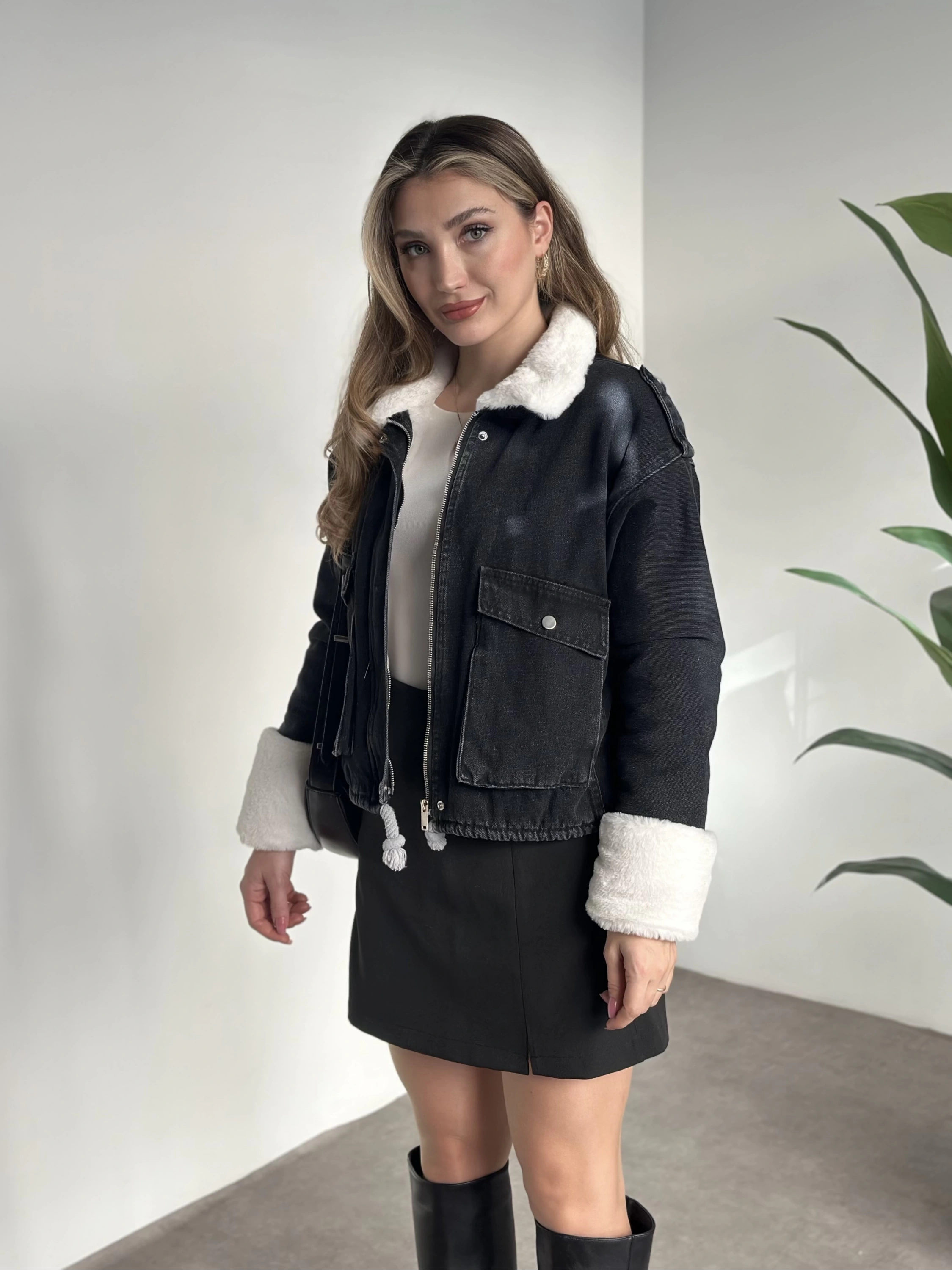 İçi ve yakası tamamen peluş kot mont siyah beyaz