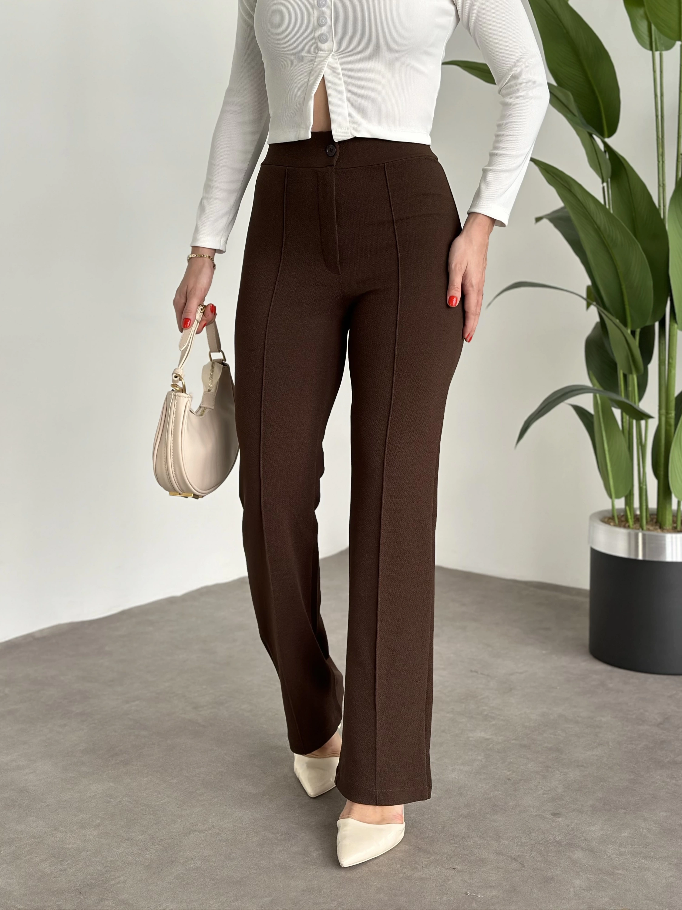 İkonik model enine boyuna full likralı düğmeli pantolon Kahve