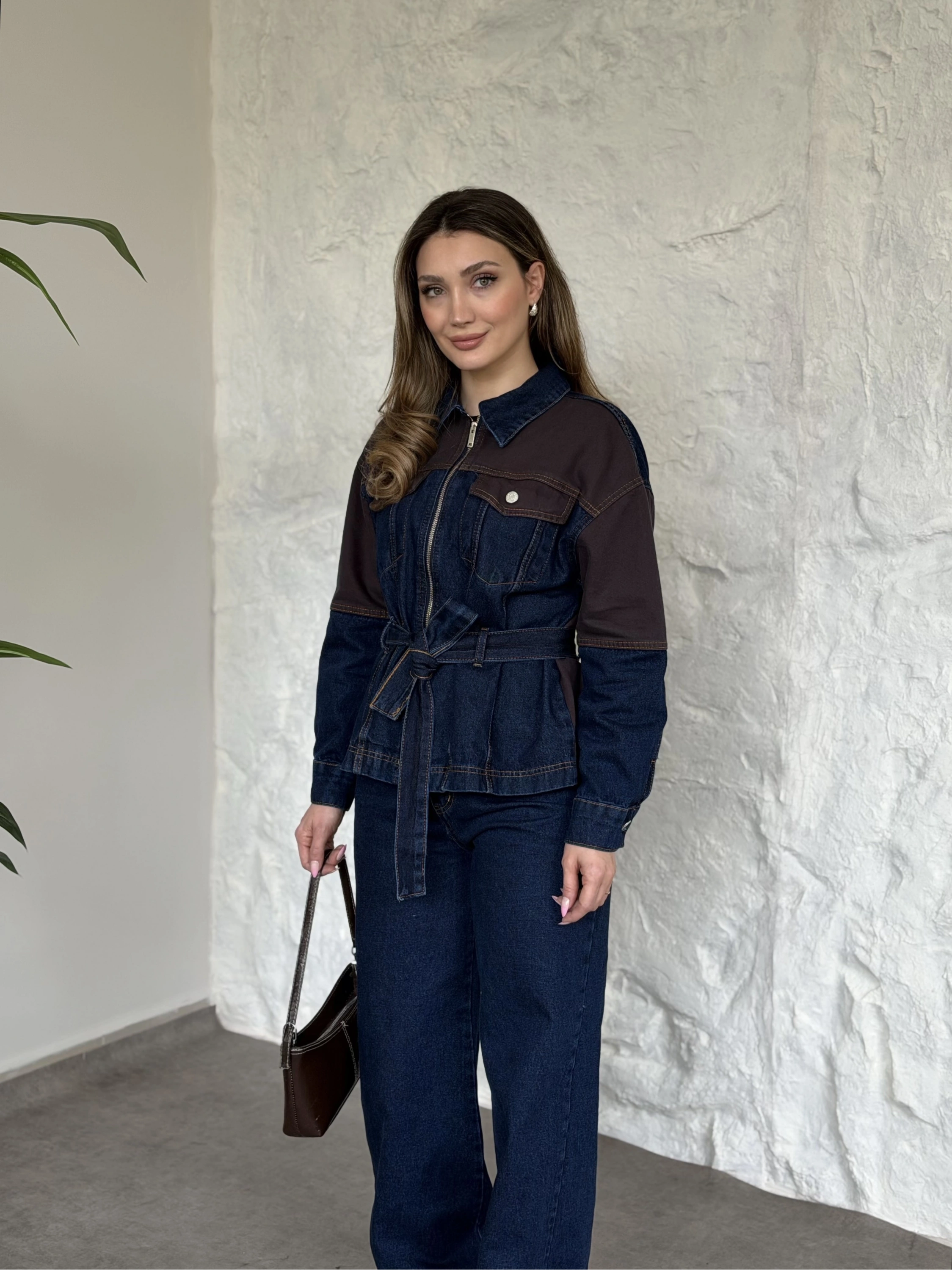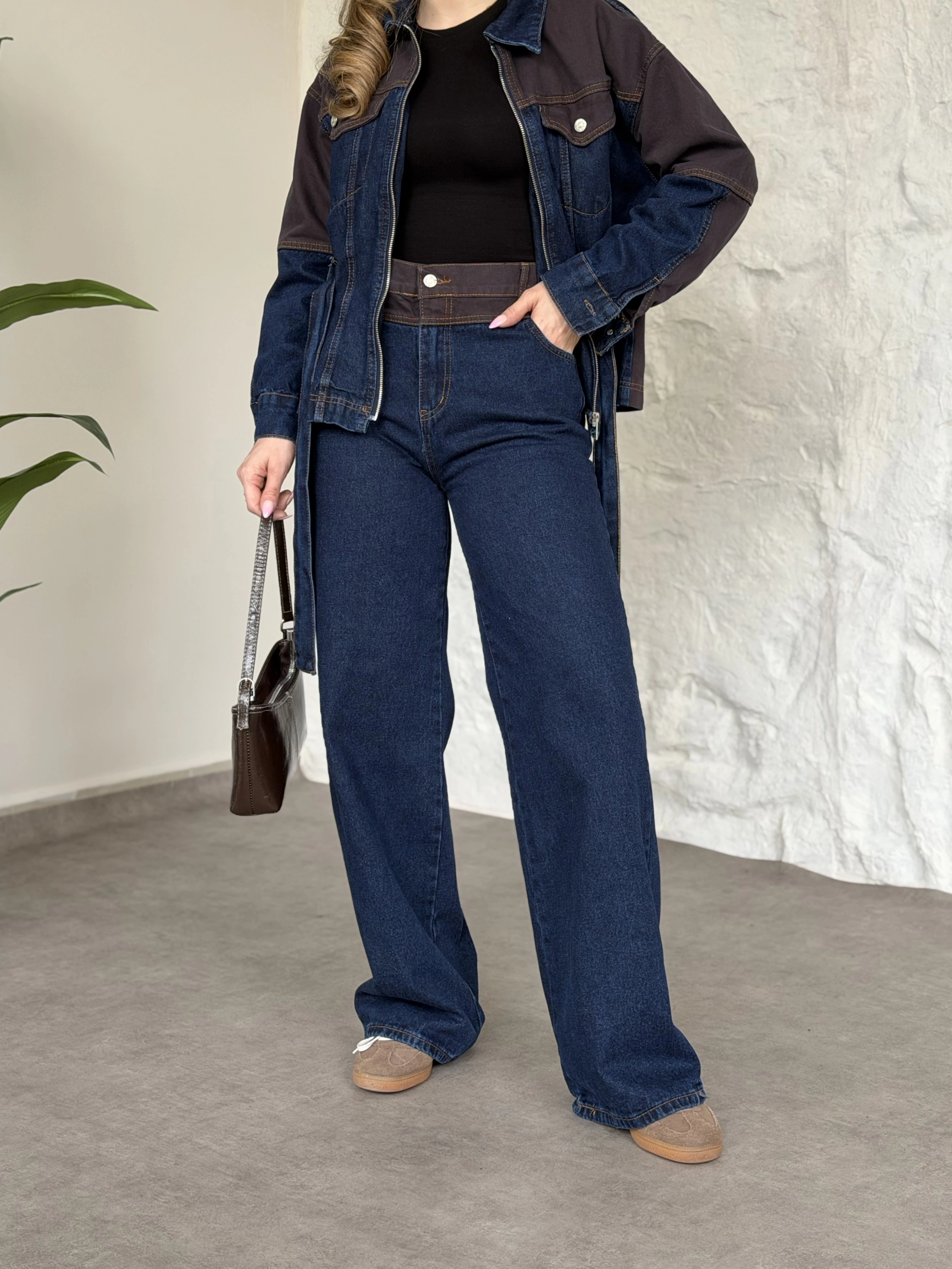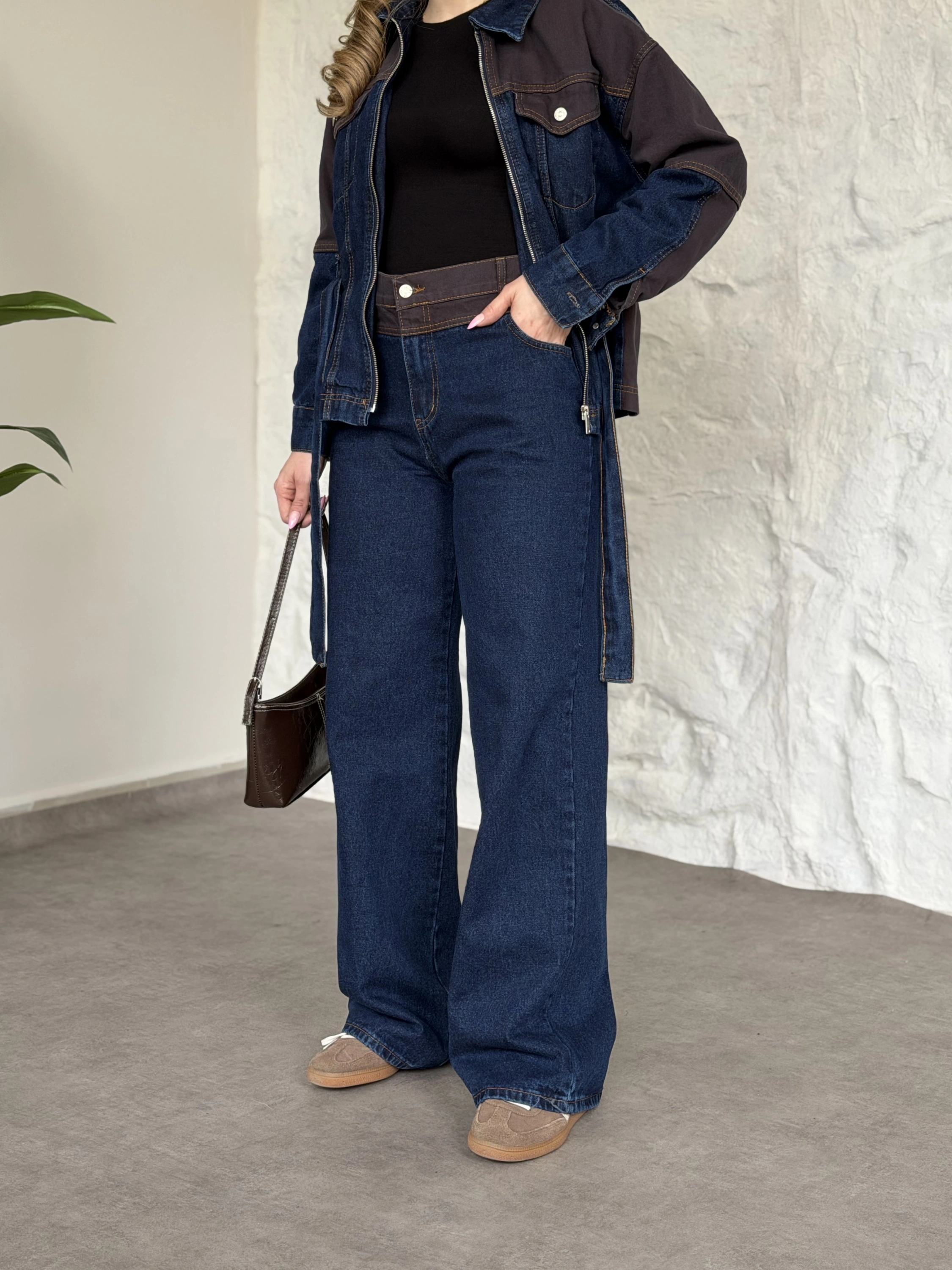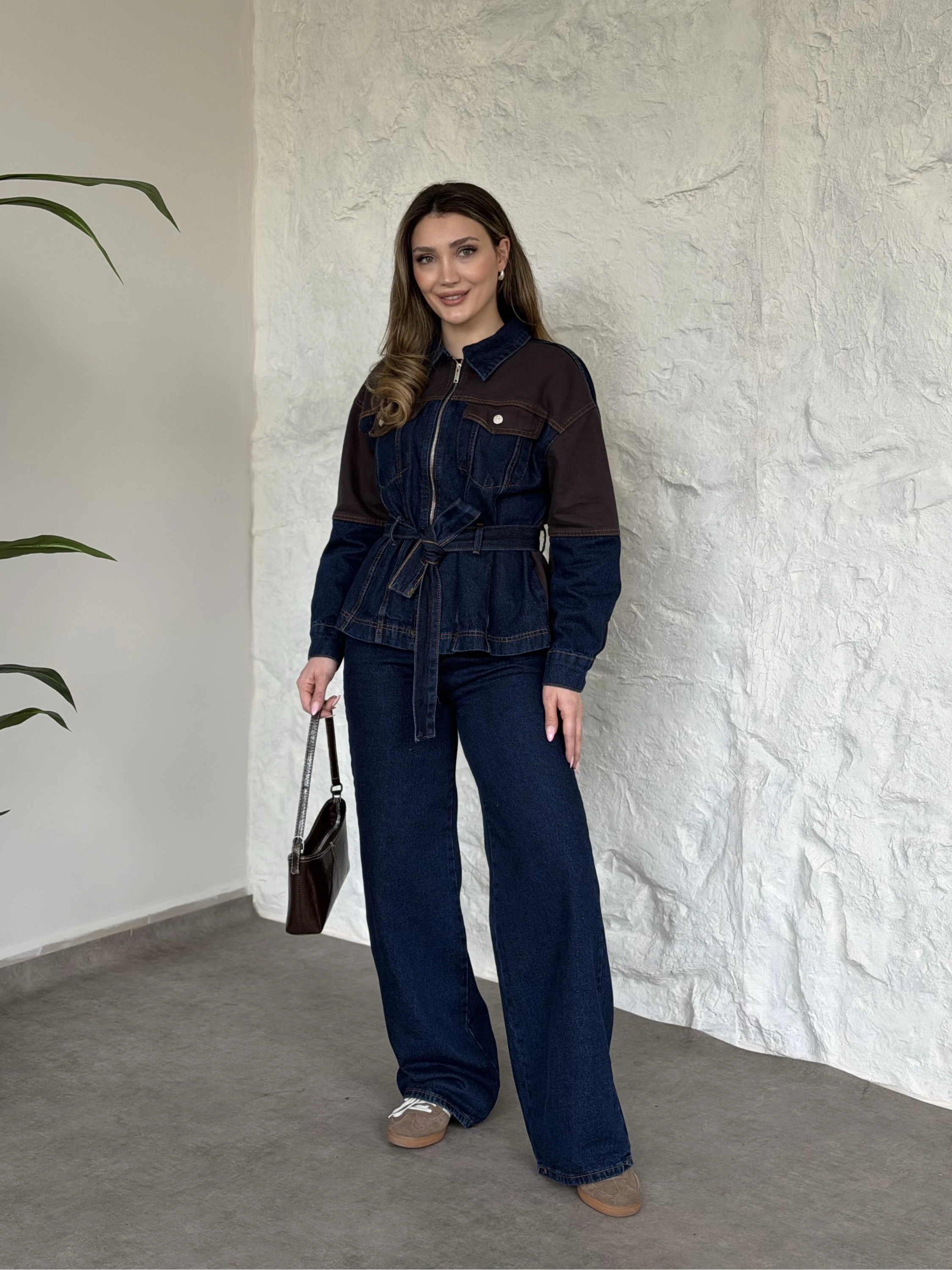 Kahve detaylı belinden kemerli denim takım