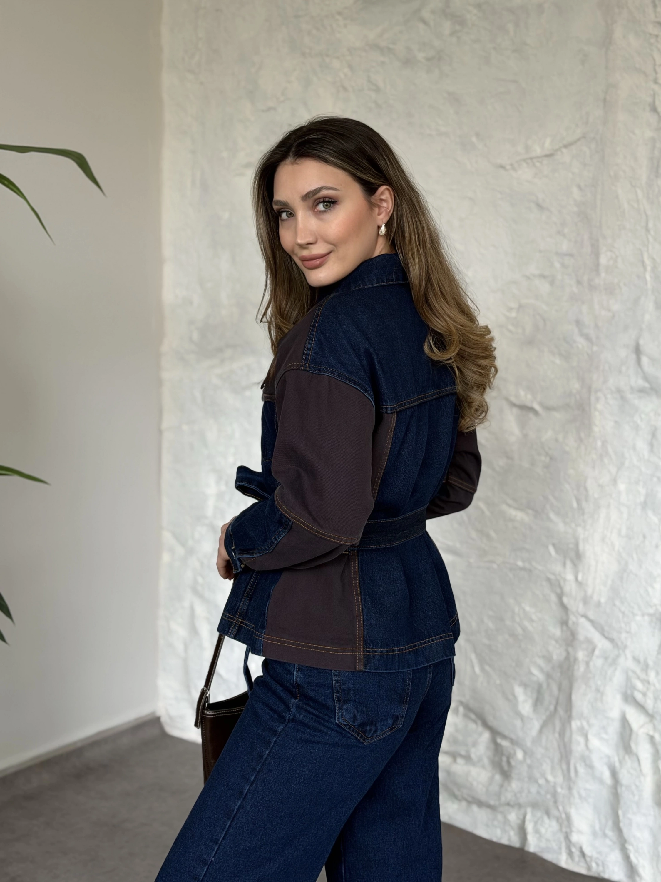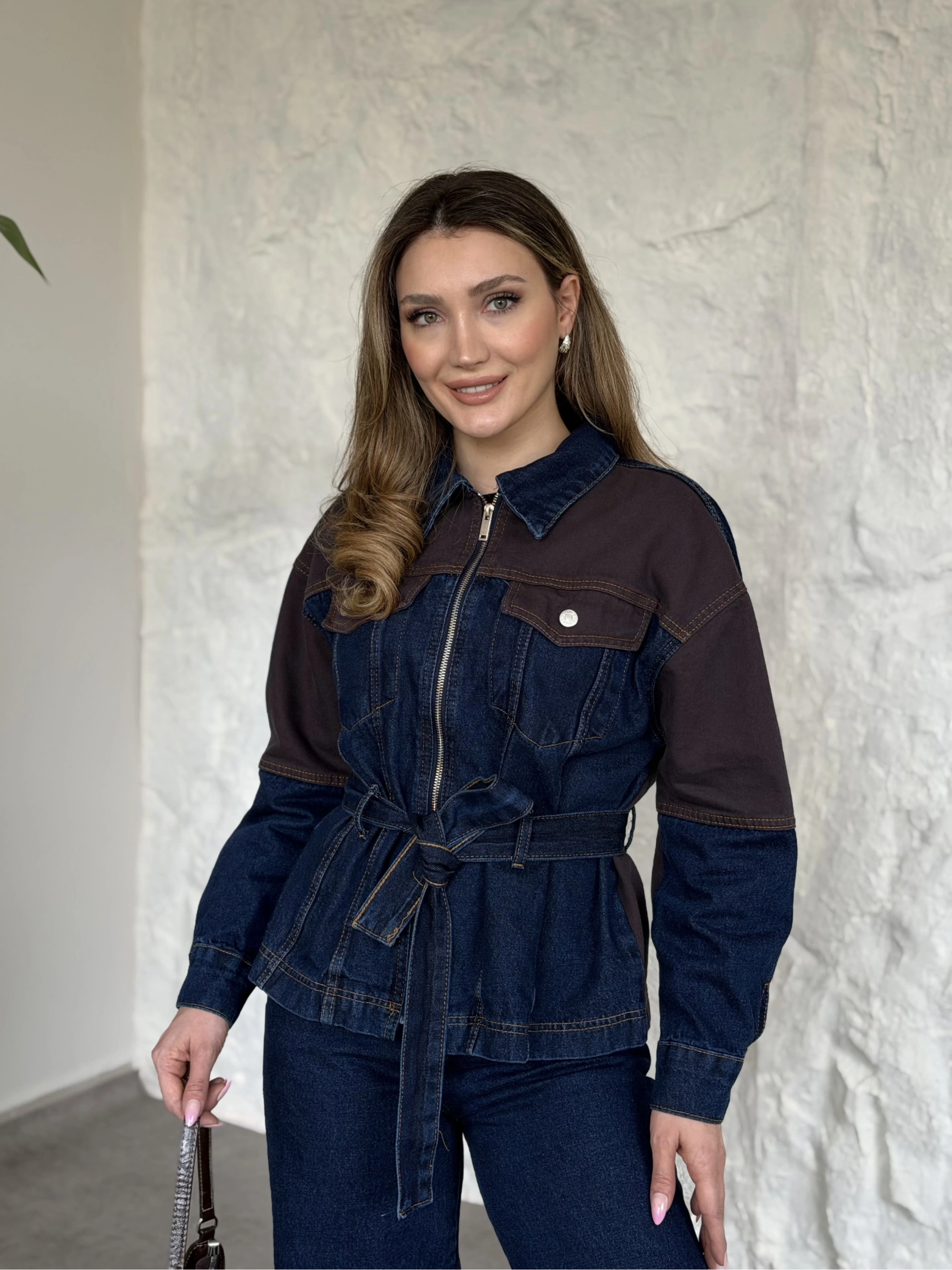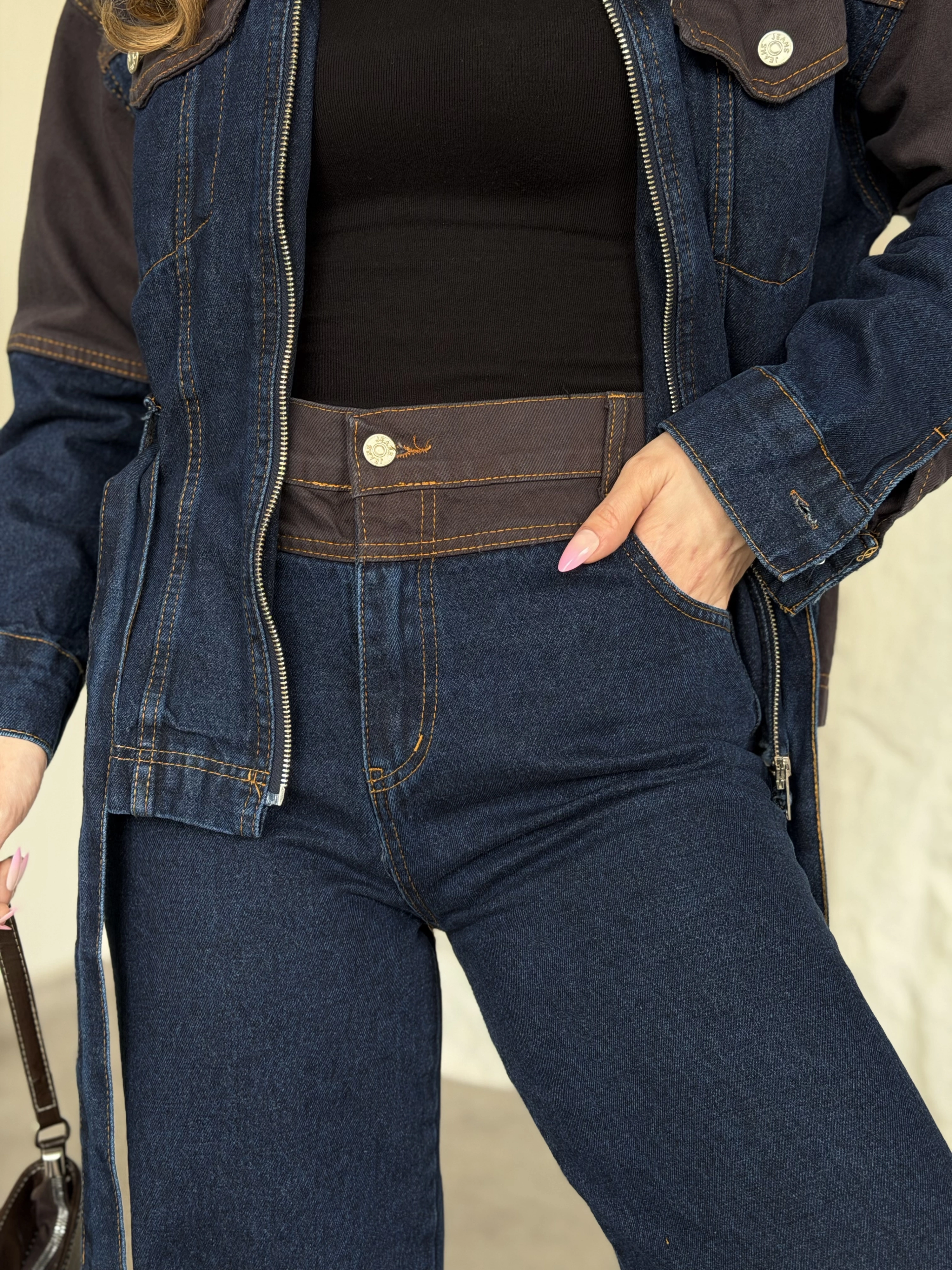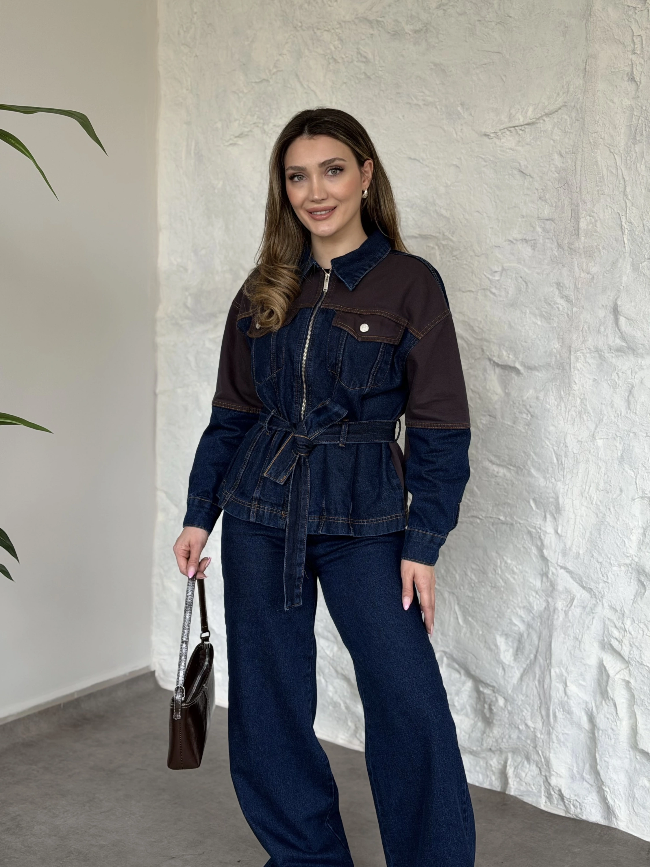 Kahve detaylı belinden kemerli denim takım