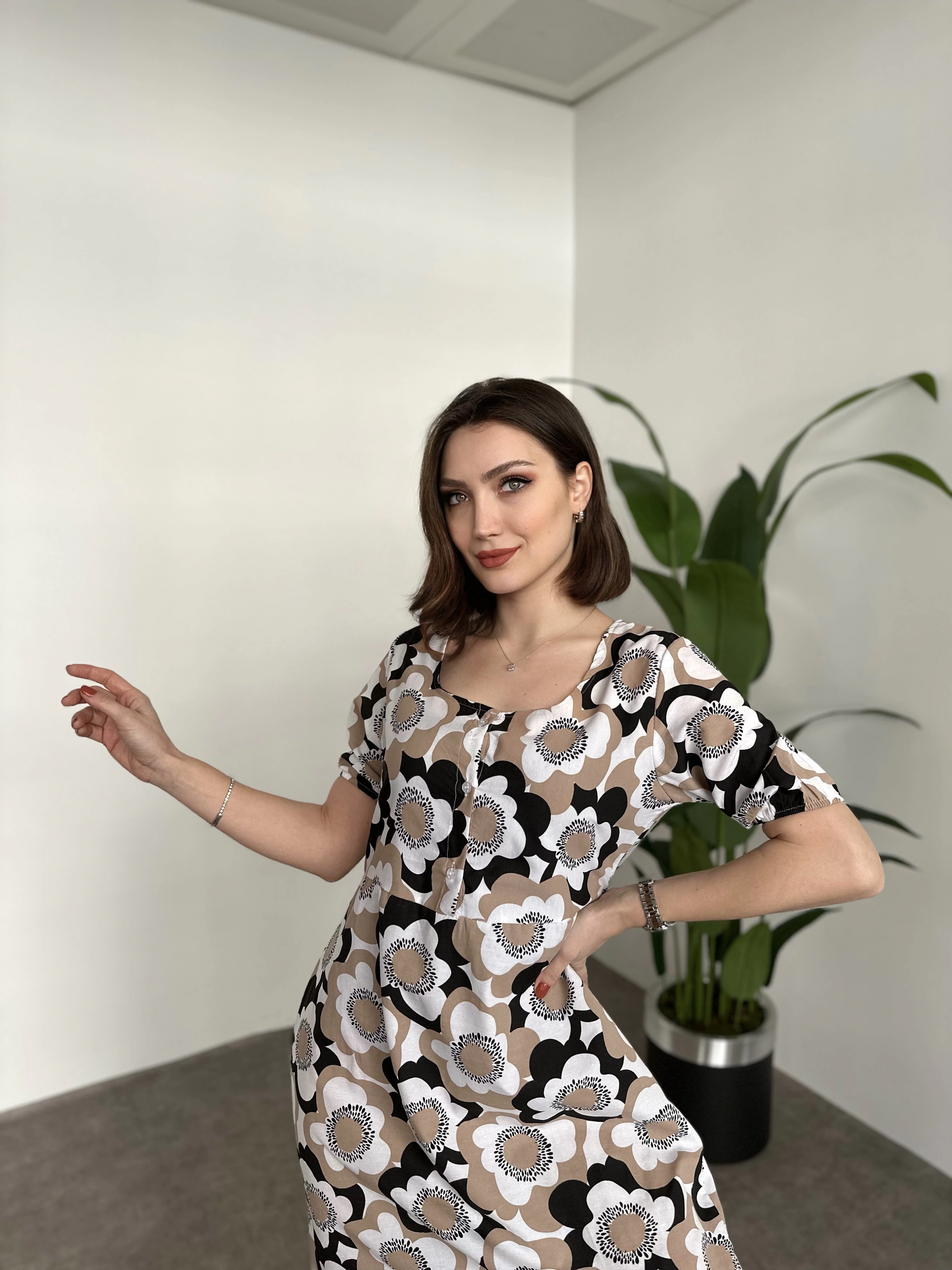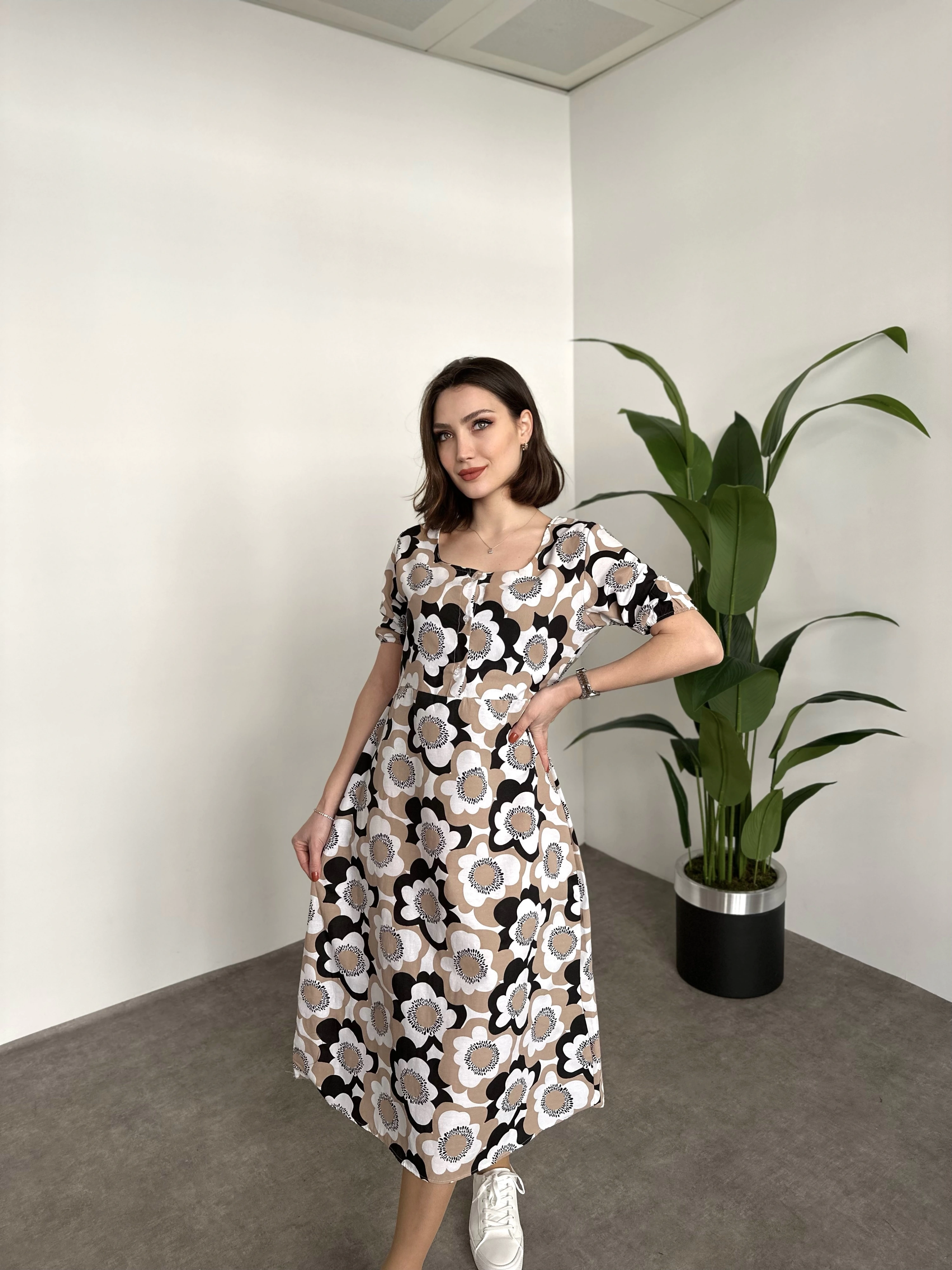 Kare Yaka Düğmeli Poplin Elbise Kahve Çiçekli