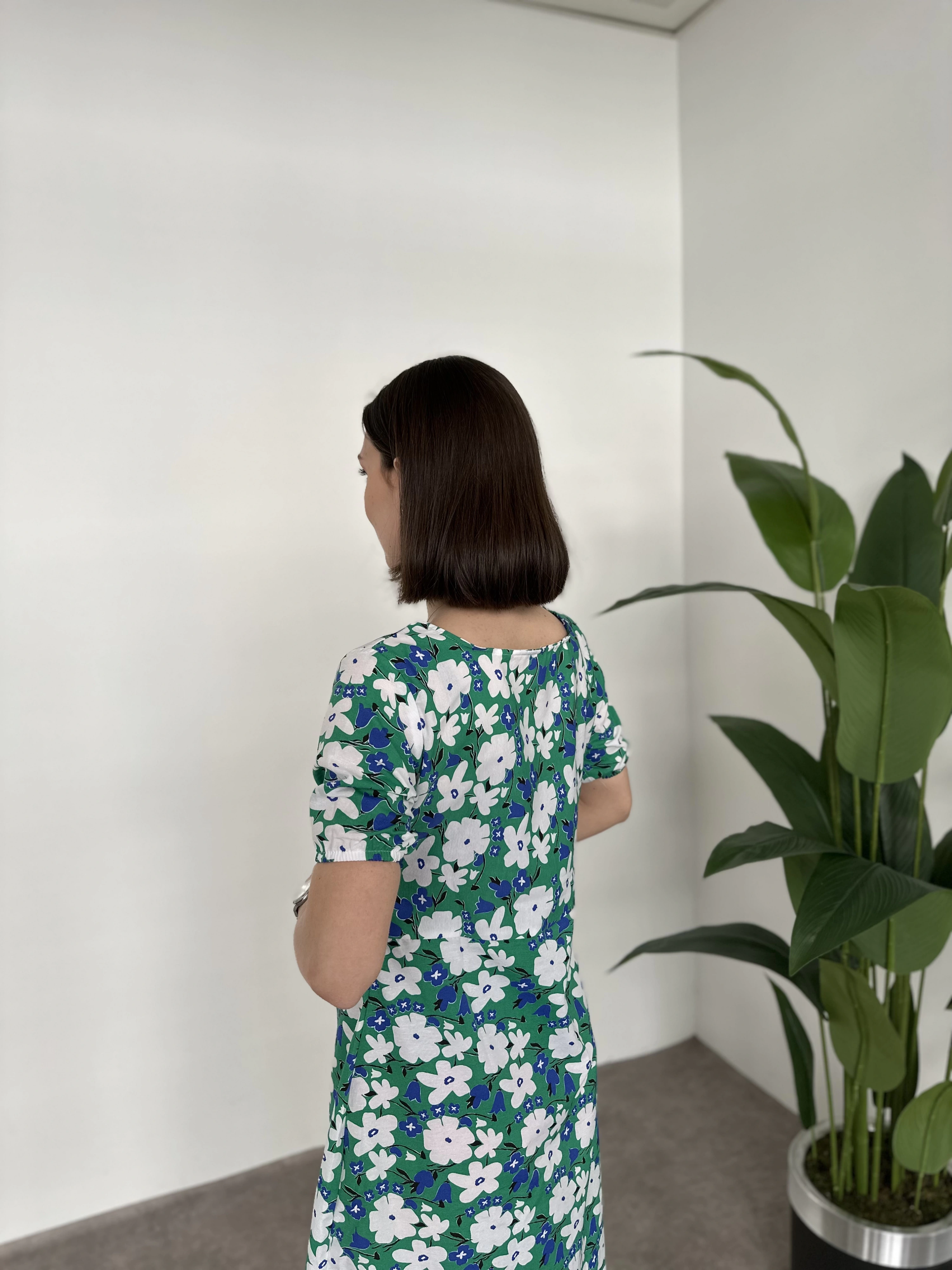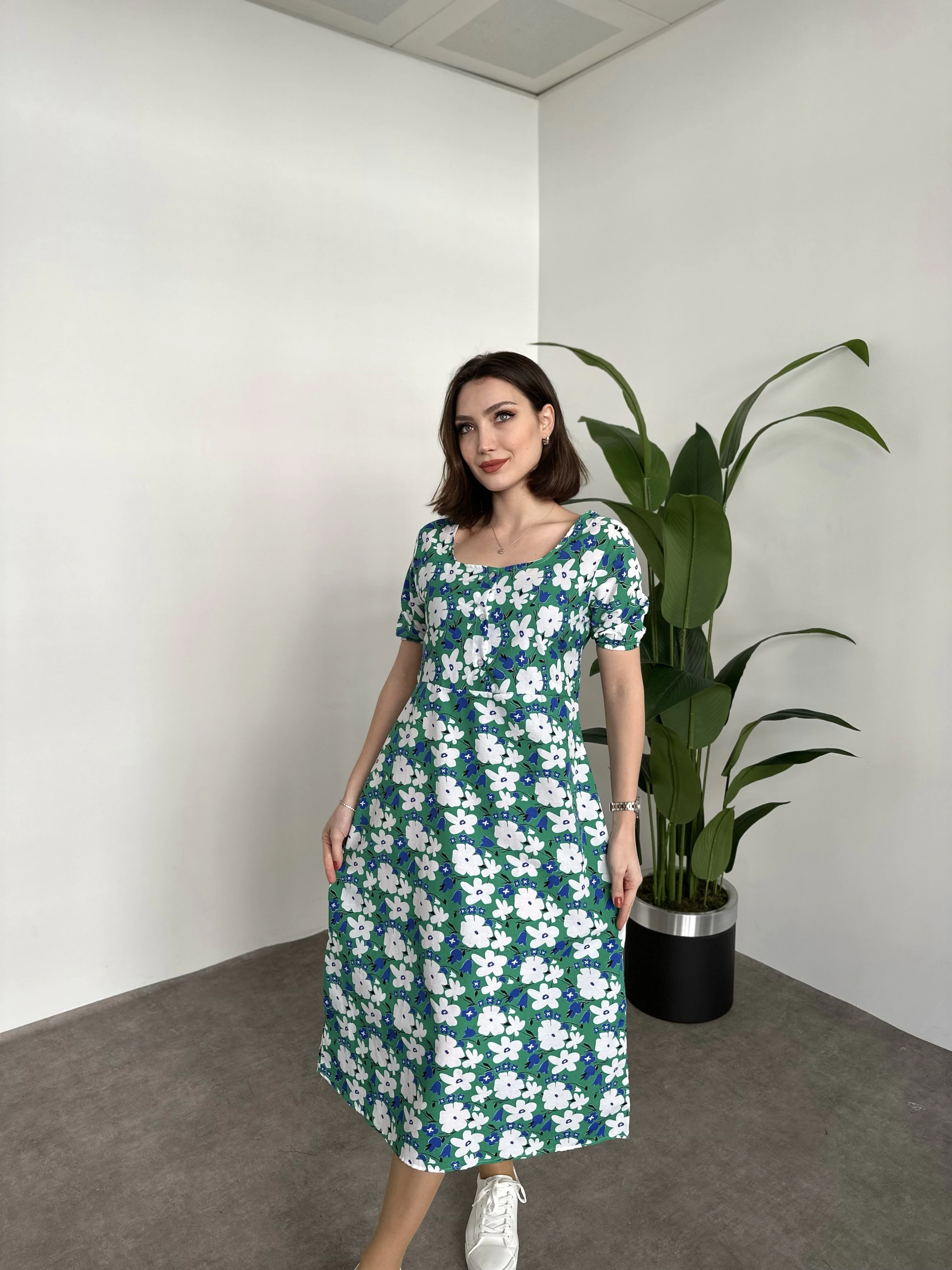 Kare Yaka Düğmeli Poplin Elbise Yeşil Çiçekli