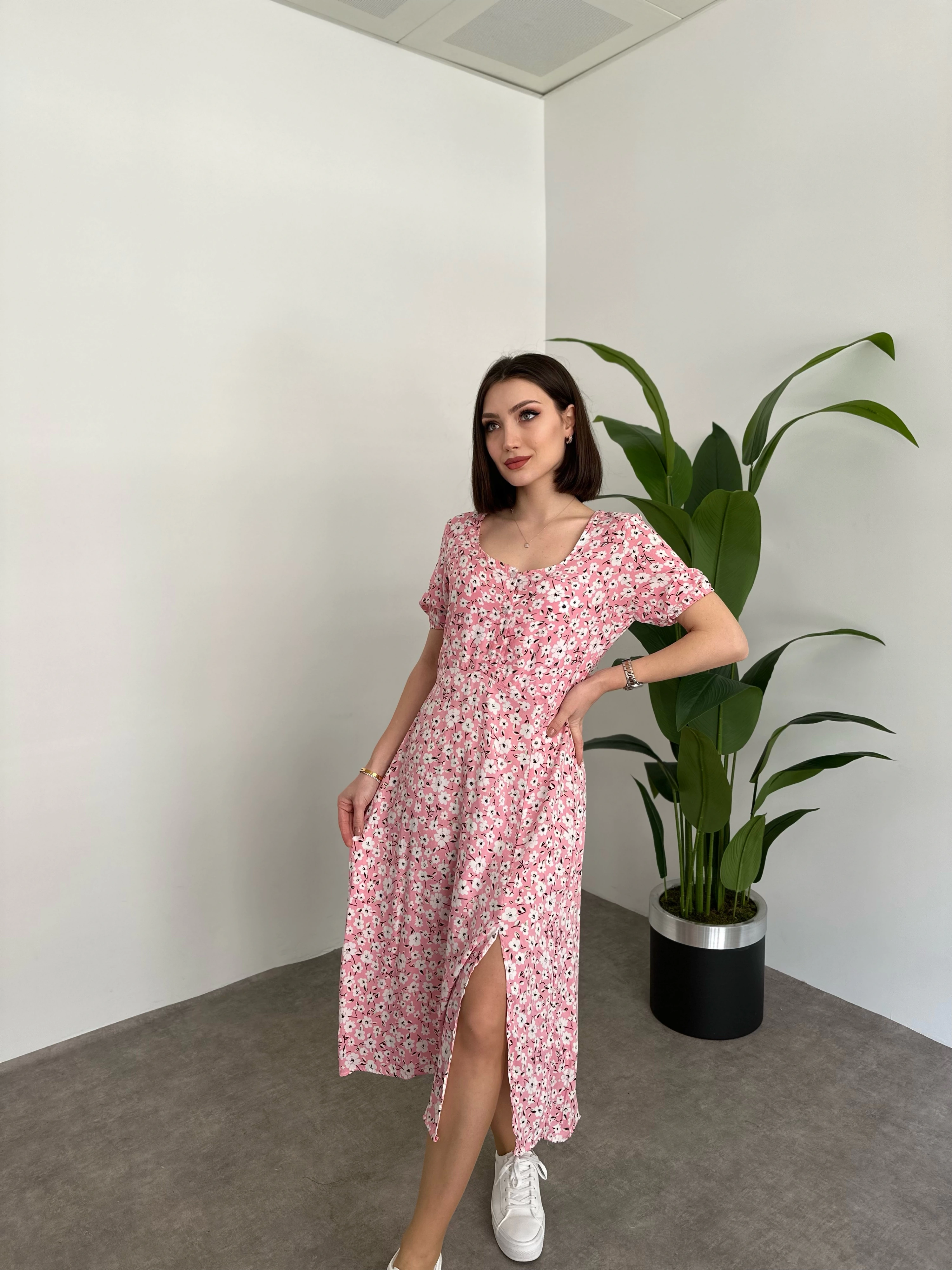 Kare Yaka Düğmeli Yırtmaç Detay Elbise pembe