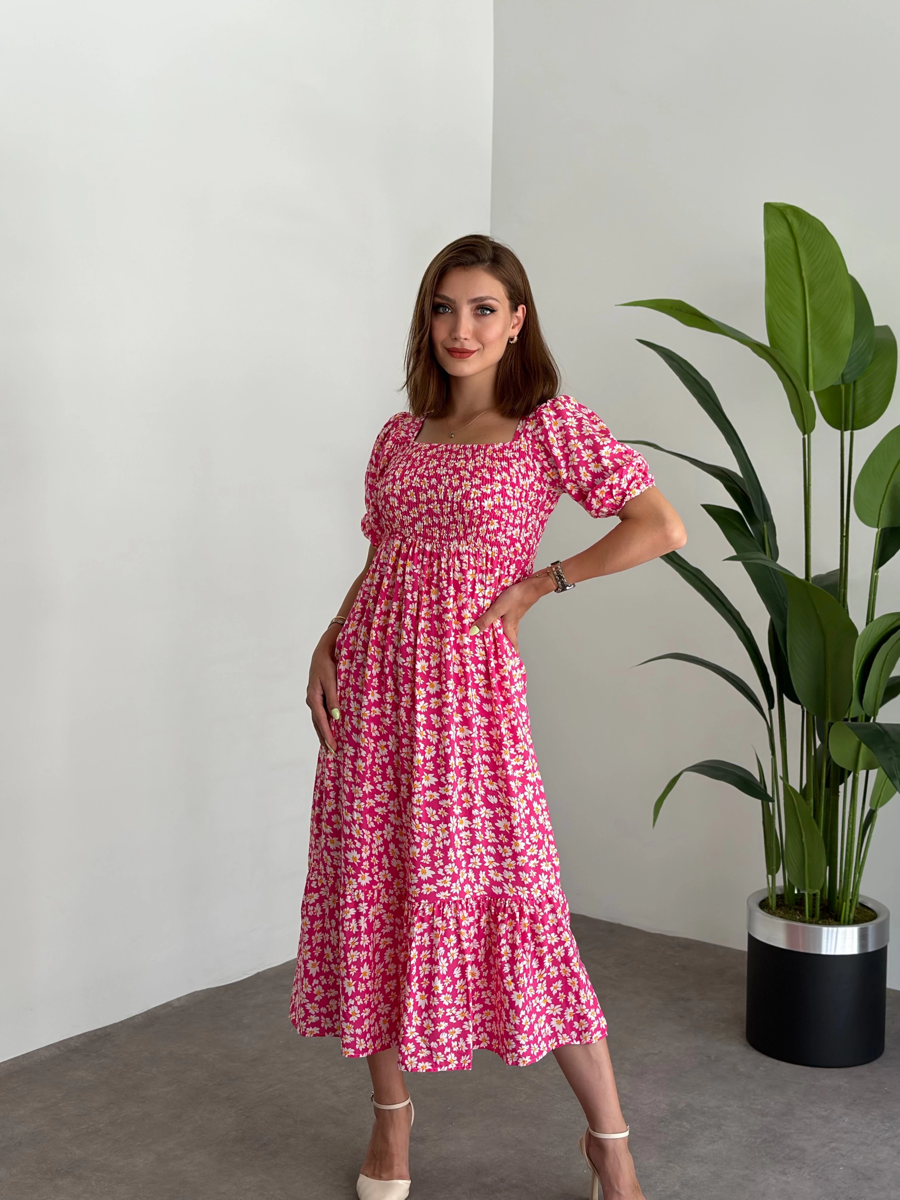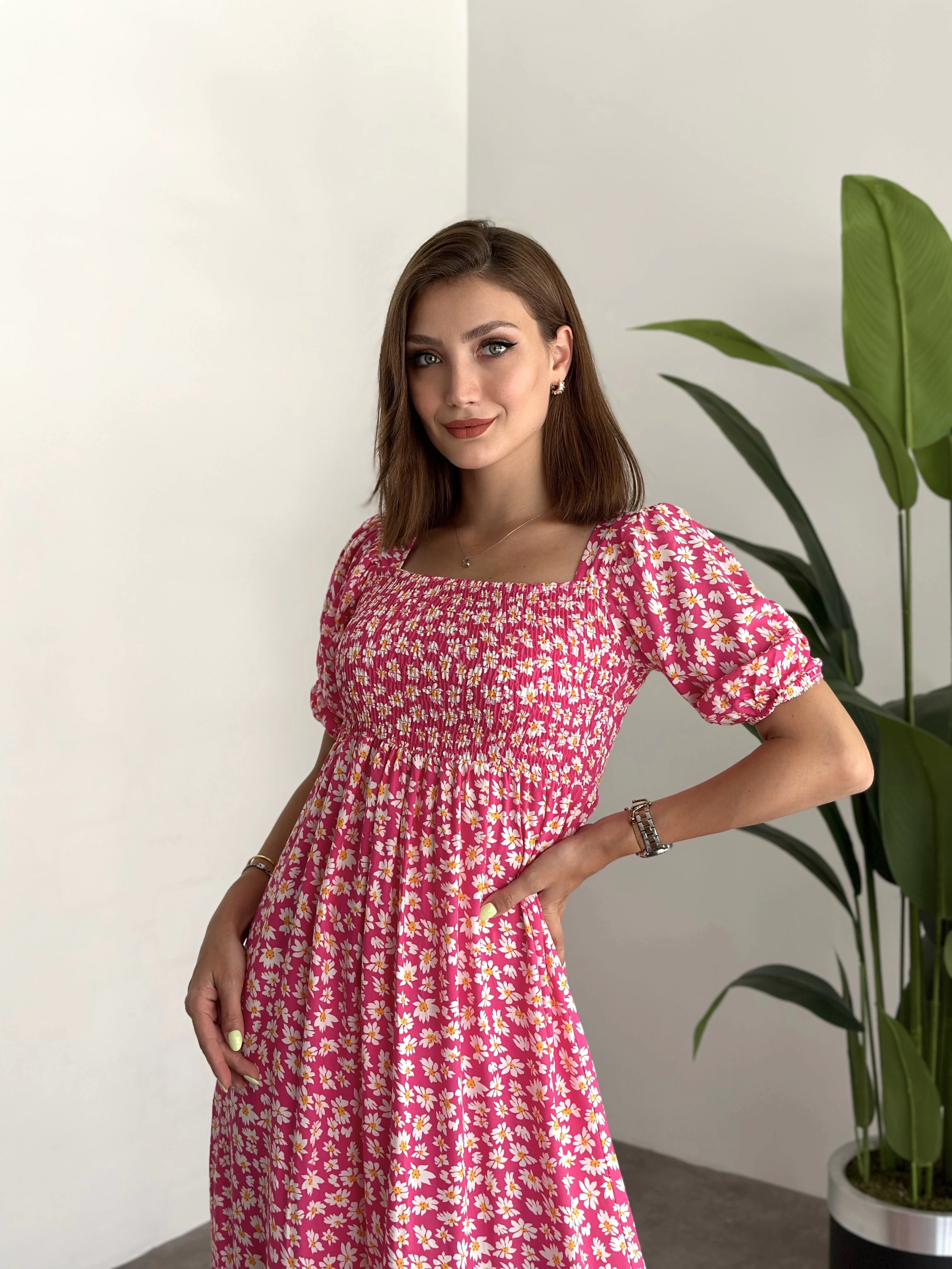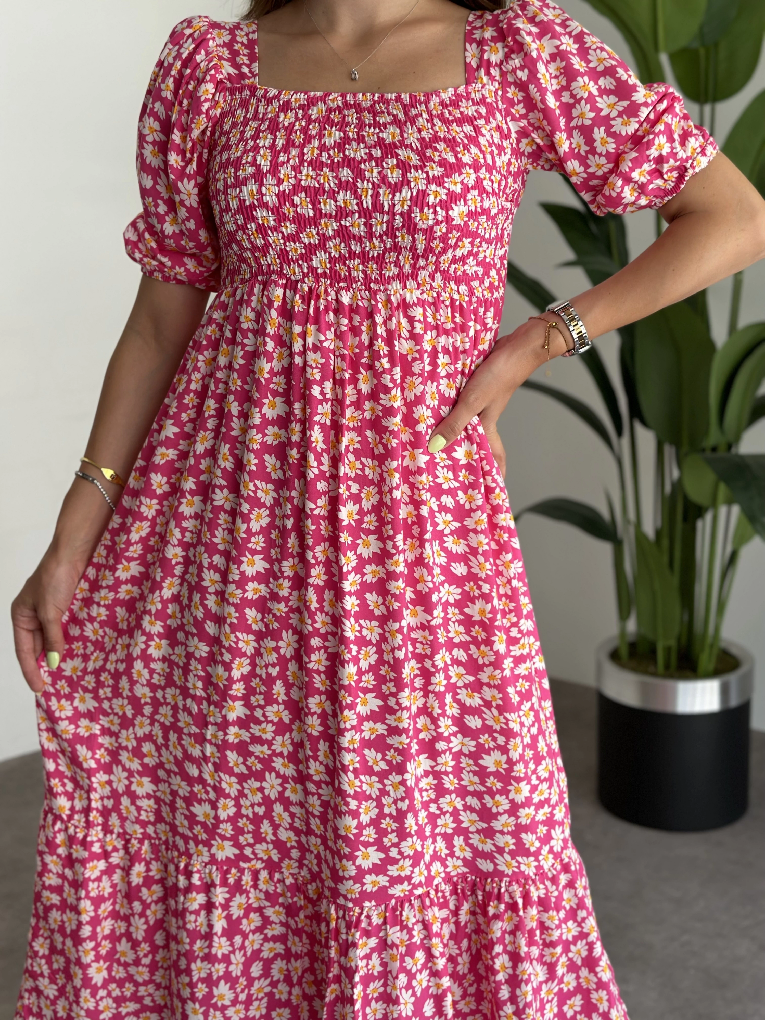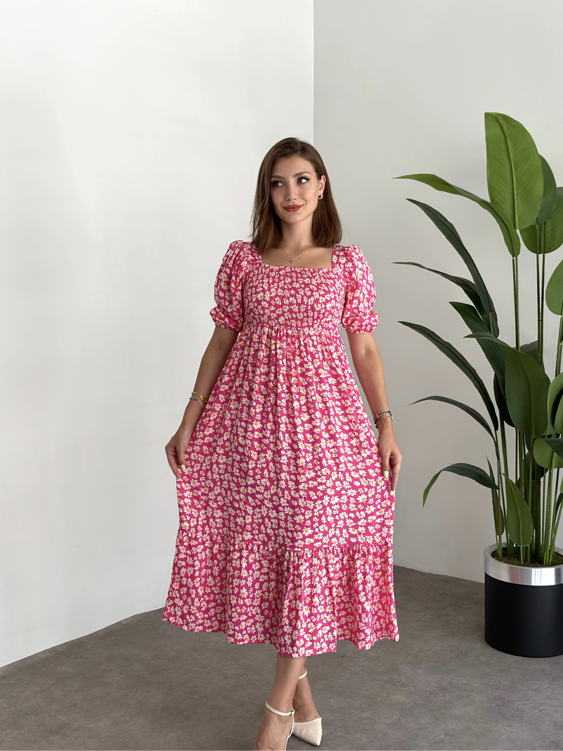 Karpuz Kol Gipeli Pamuklu Viskon Kumaş Elbise Fusya Papatyali