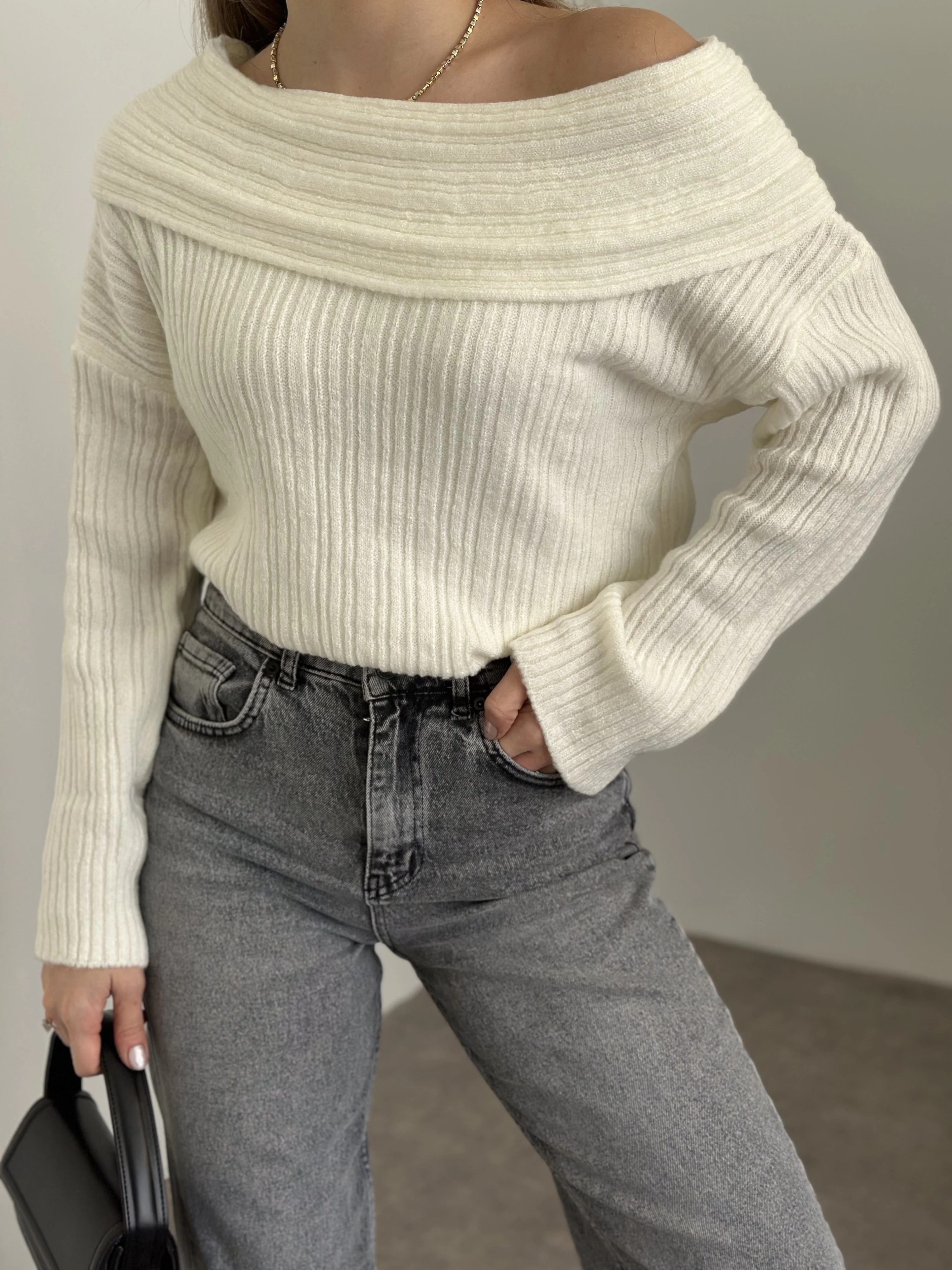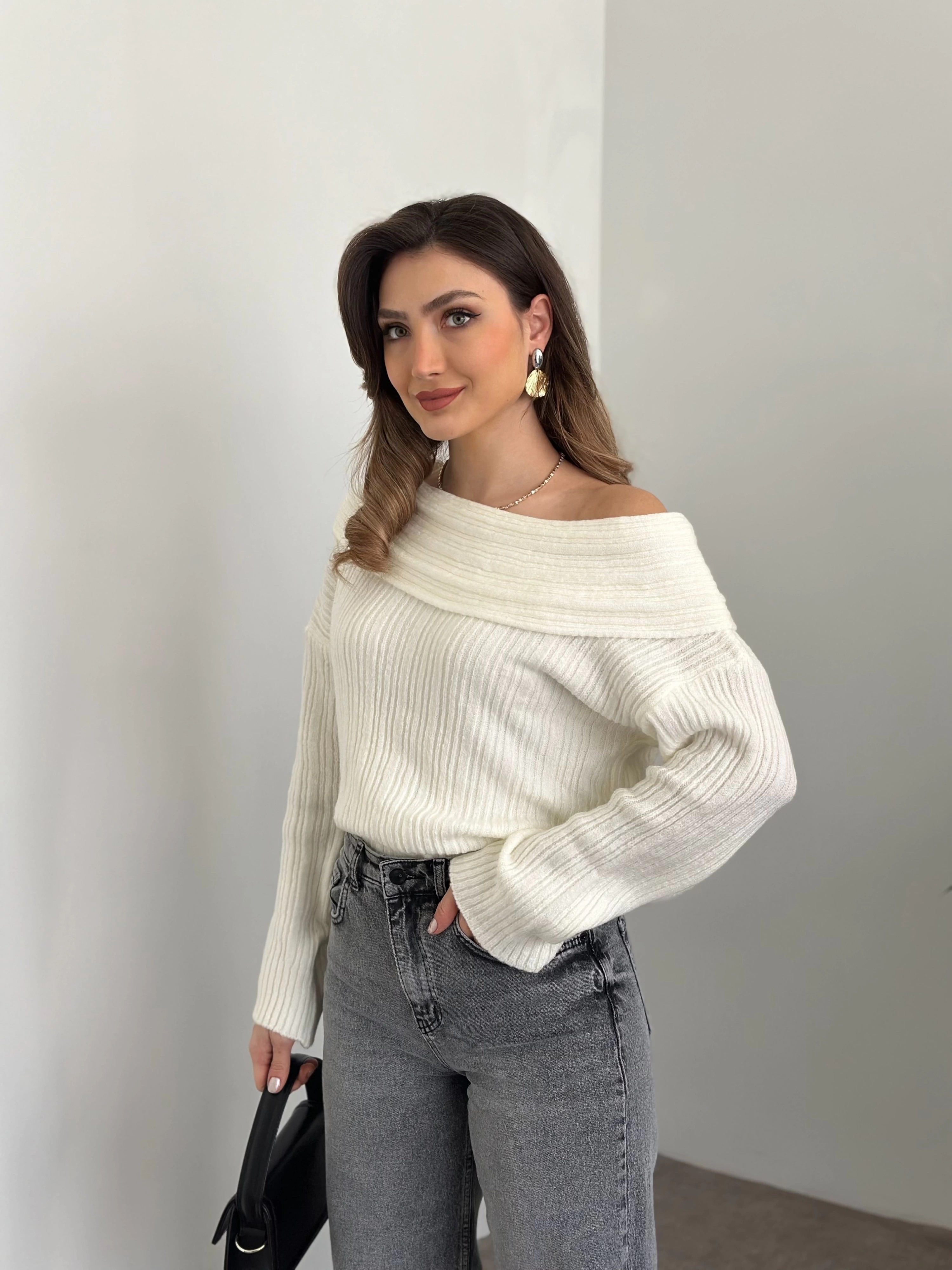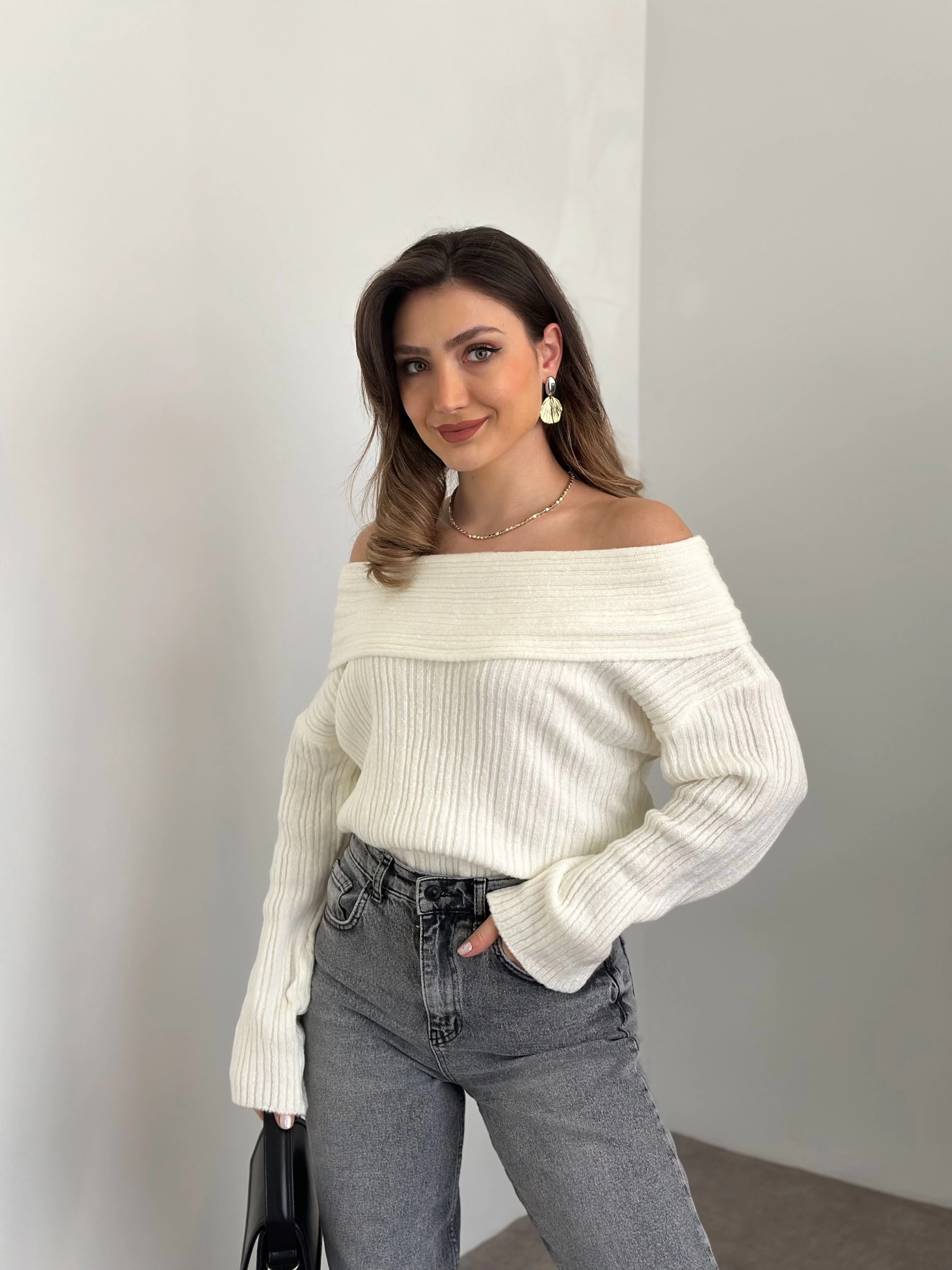 Kayık yaka fitilli yünlü kazak beyaz