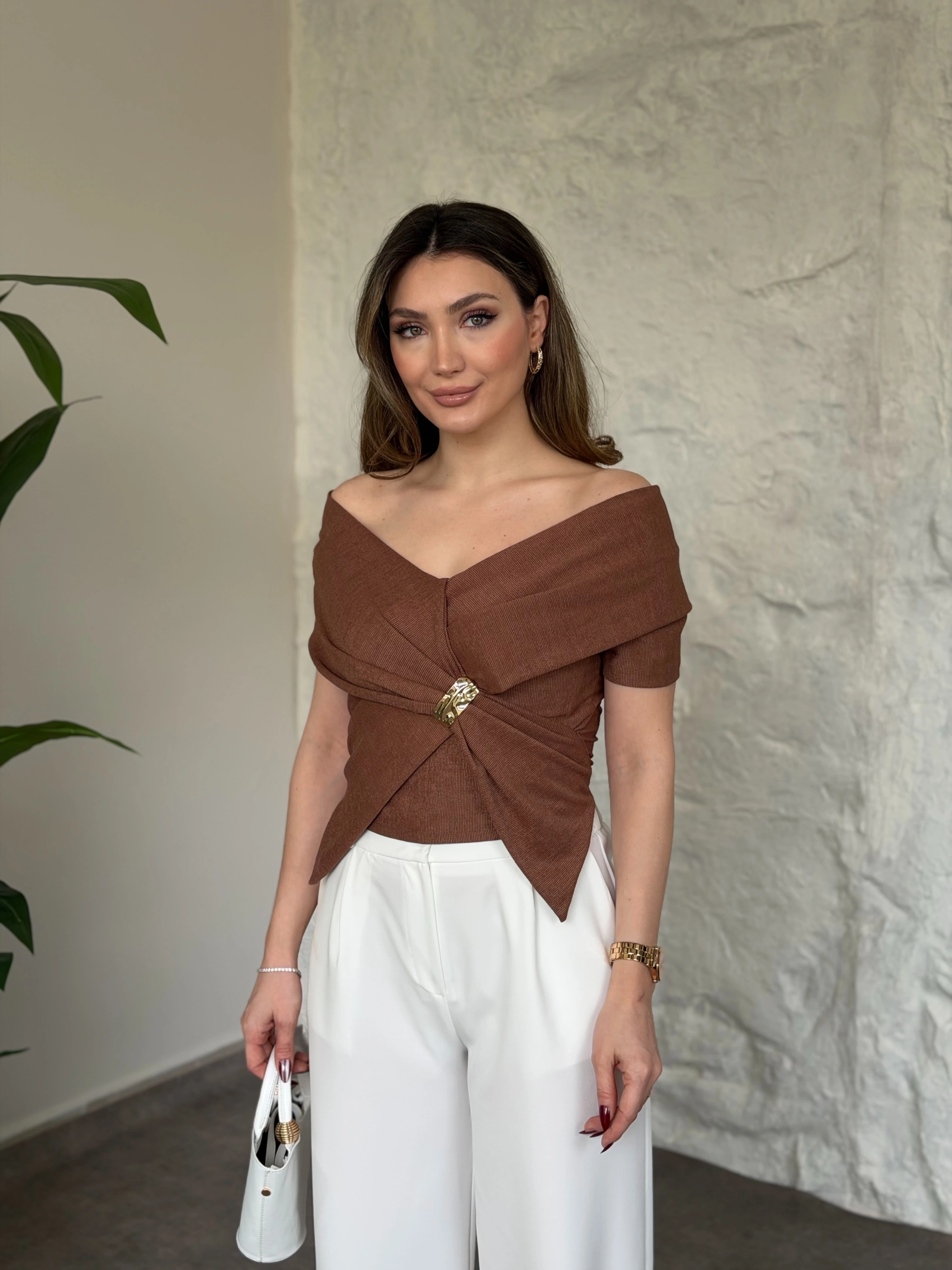 Yaka dekolte ve toka detaylı bluz kahve