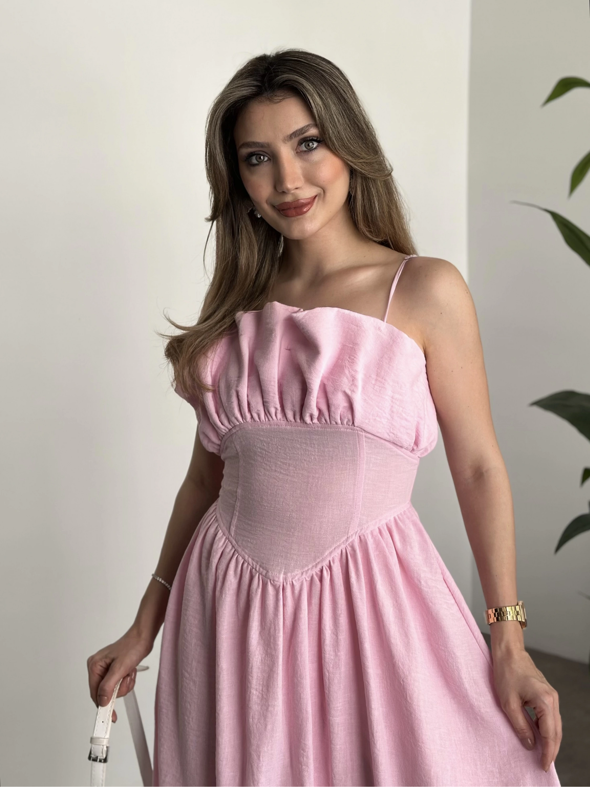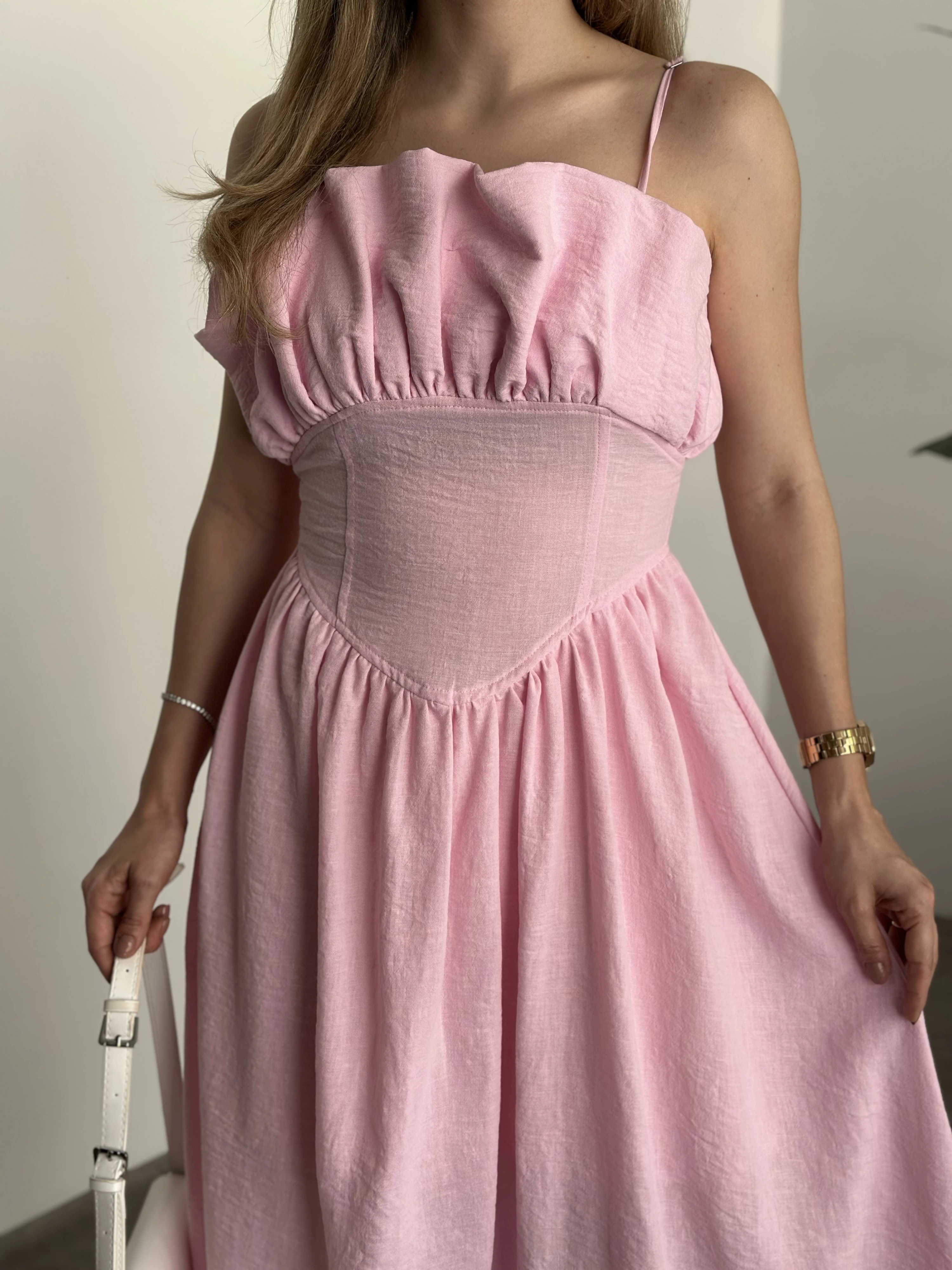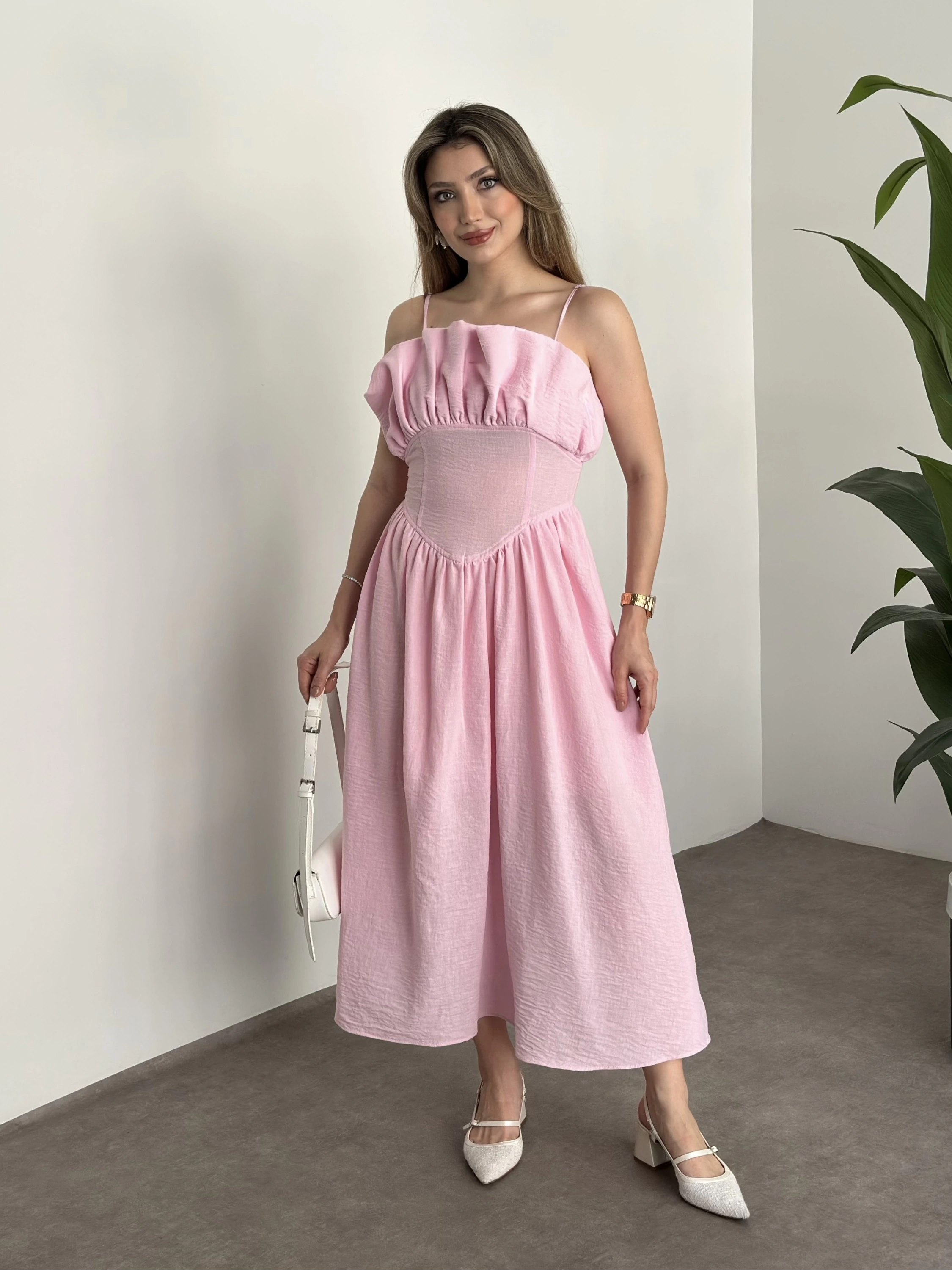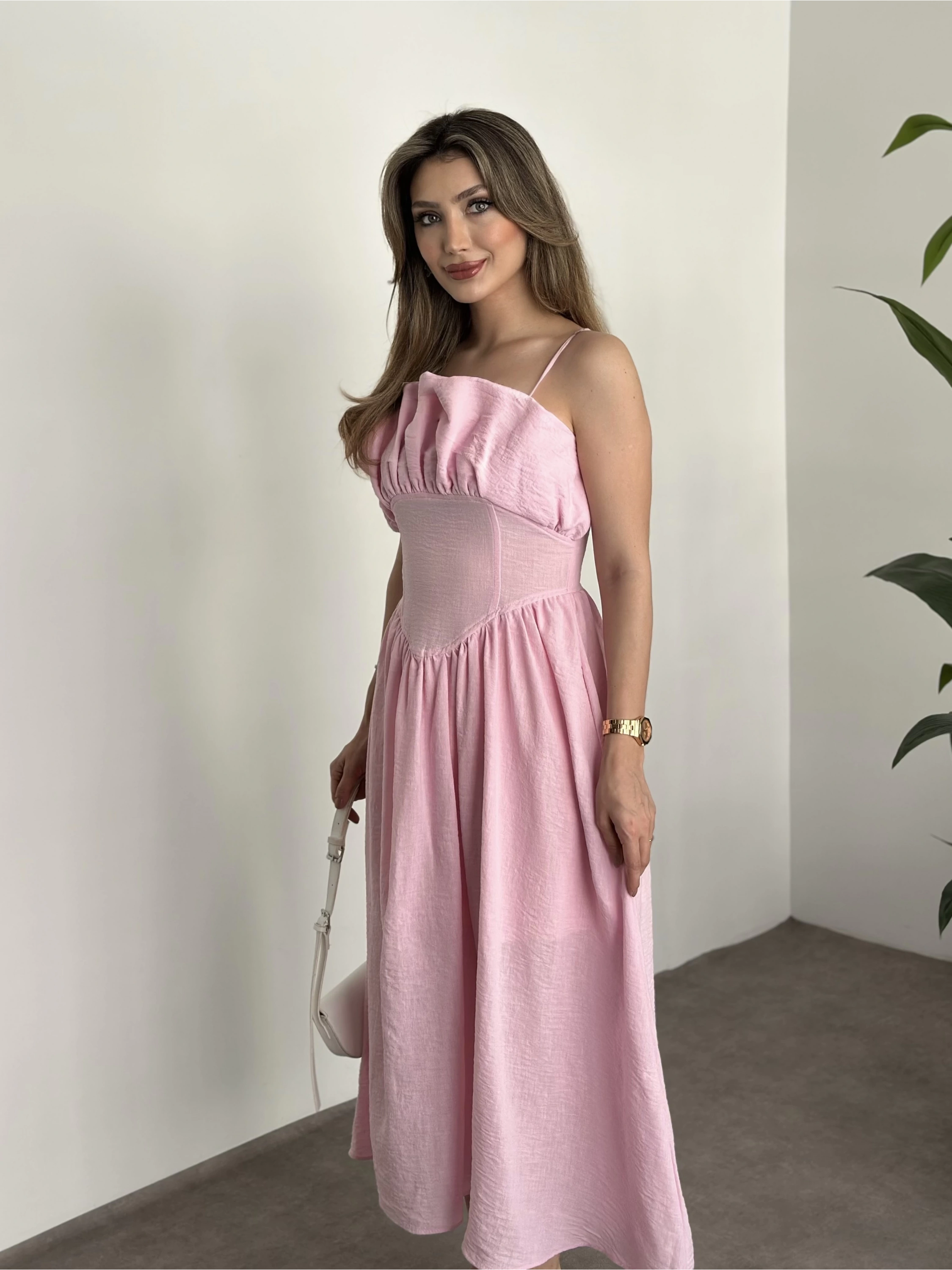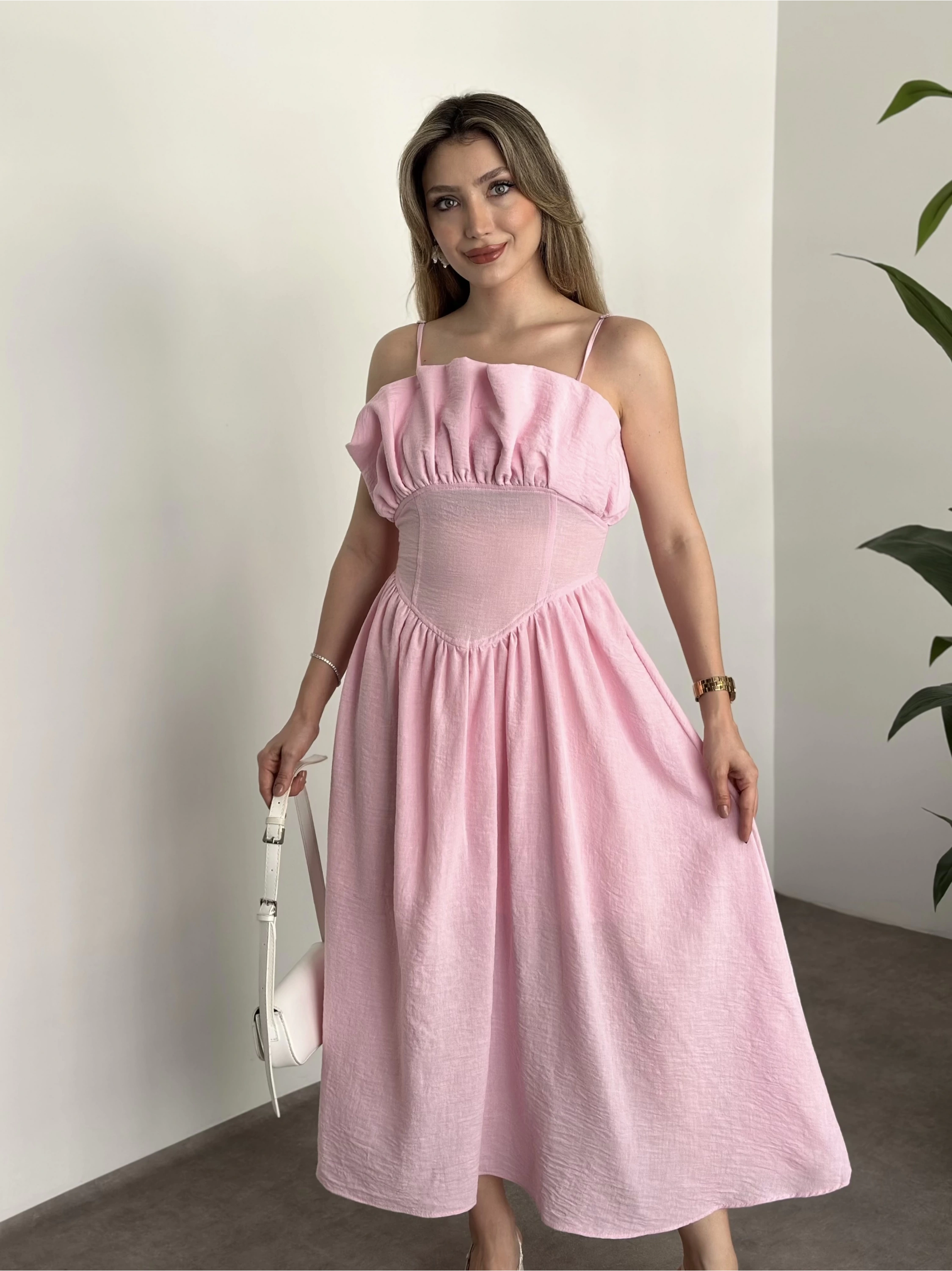 Sırt dekolteli askılı keten elbise yağ yeşili