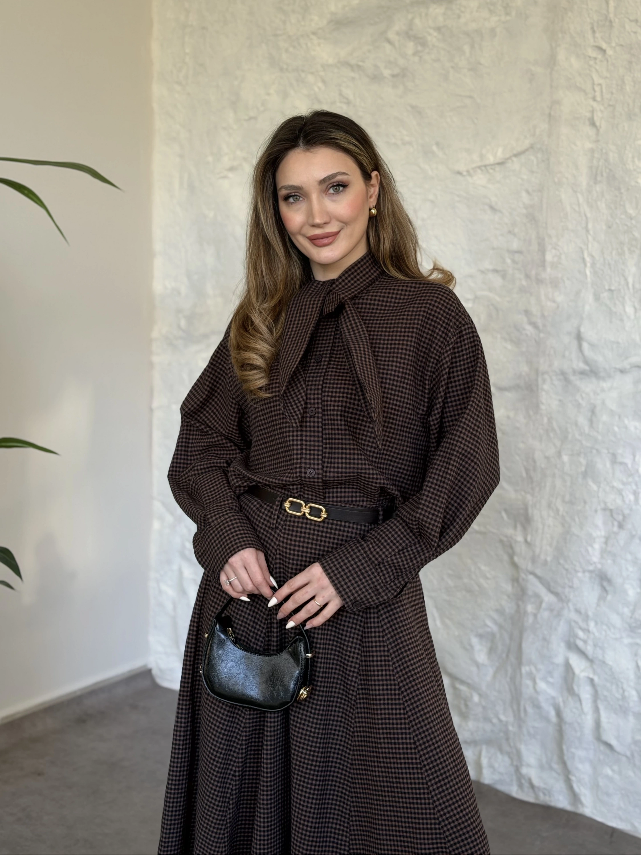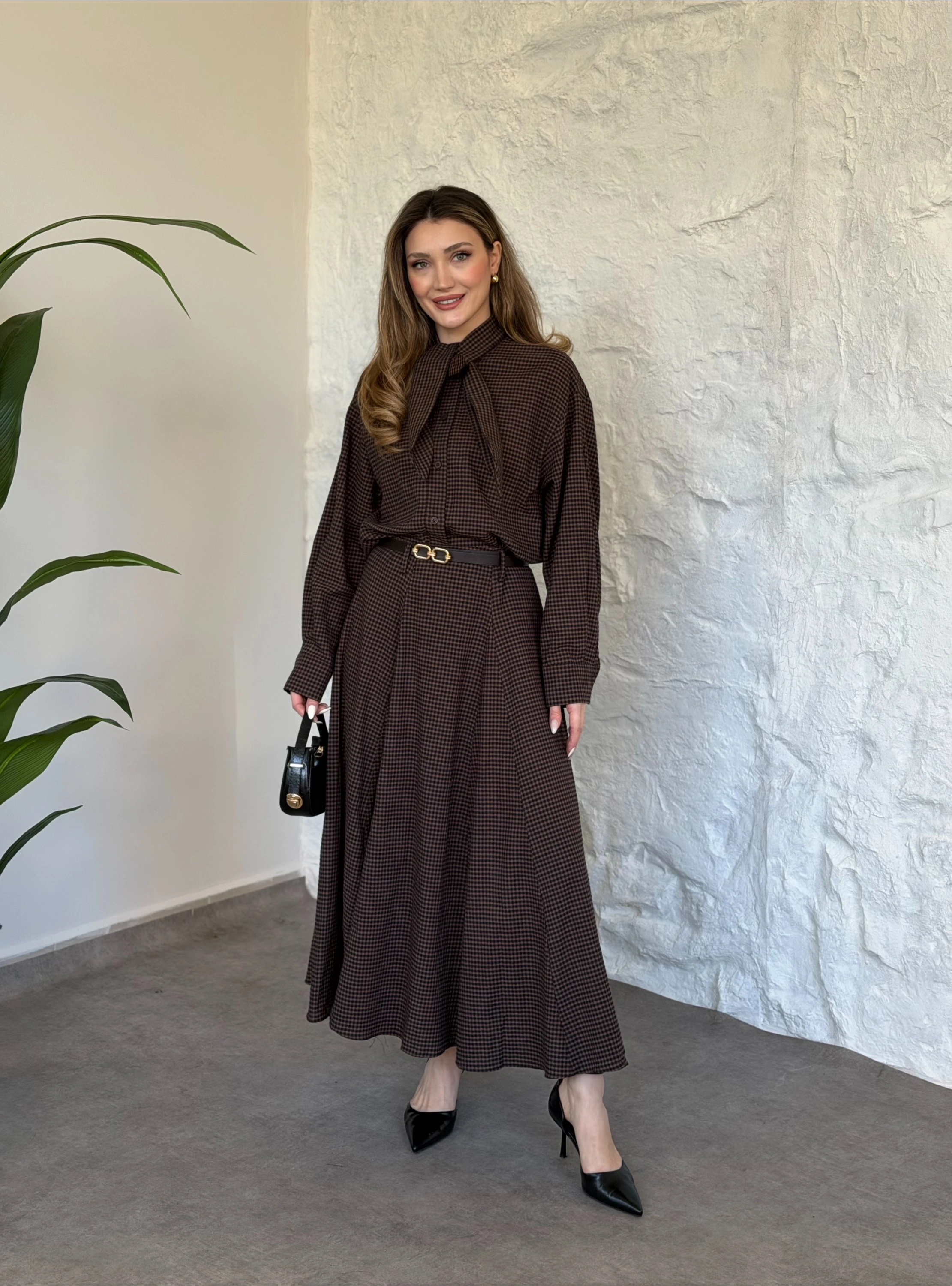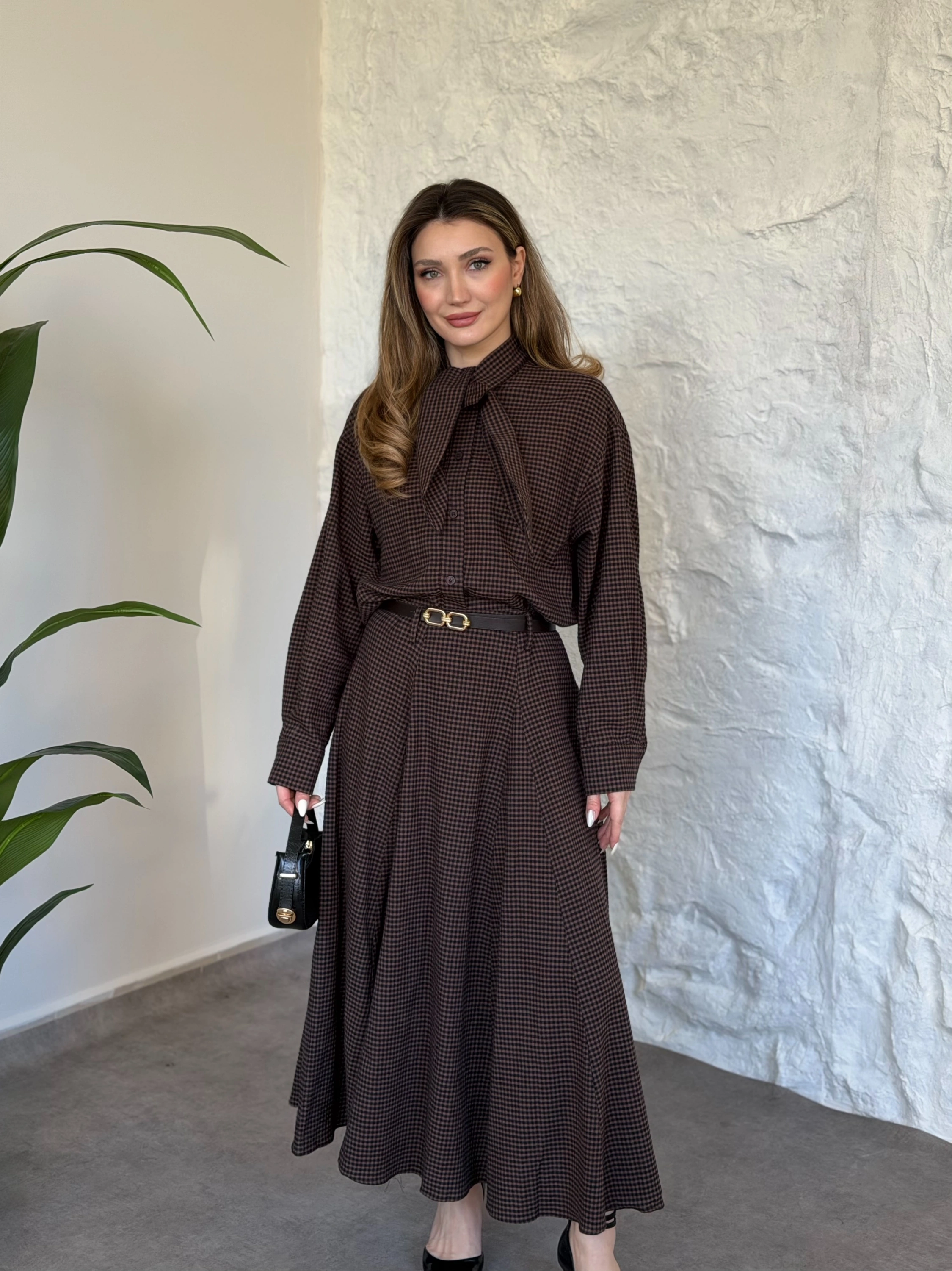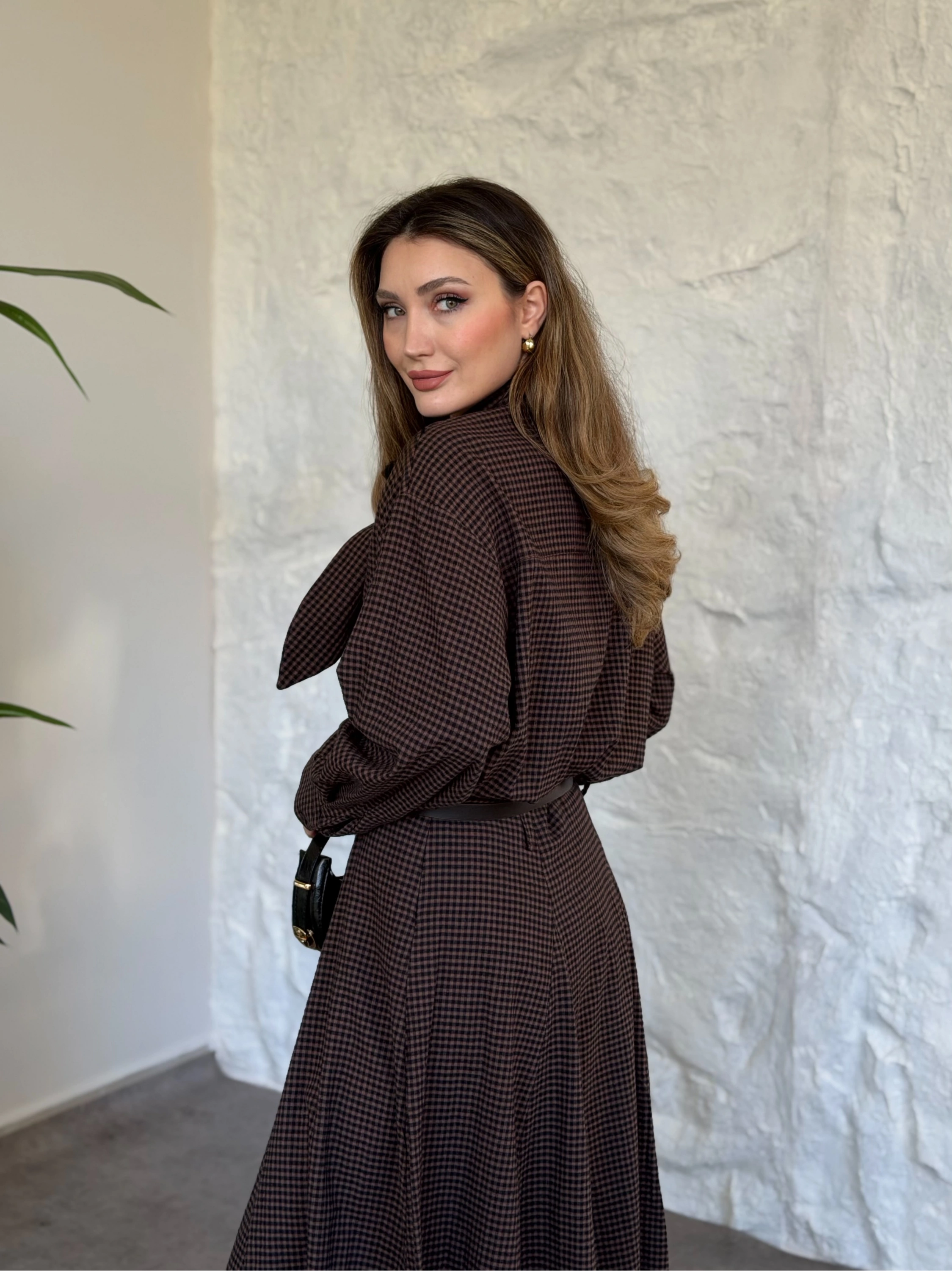 Boğazlı omuzu apoletli gizli düğmeli kemerli takım acı kahve