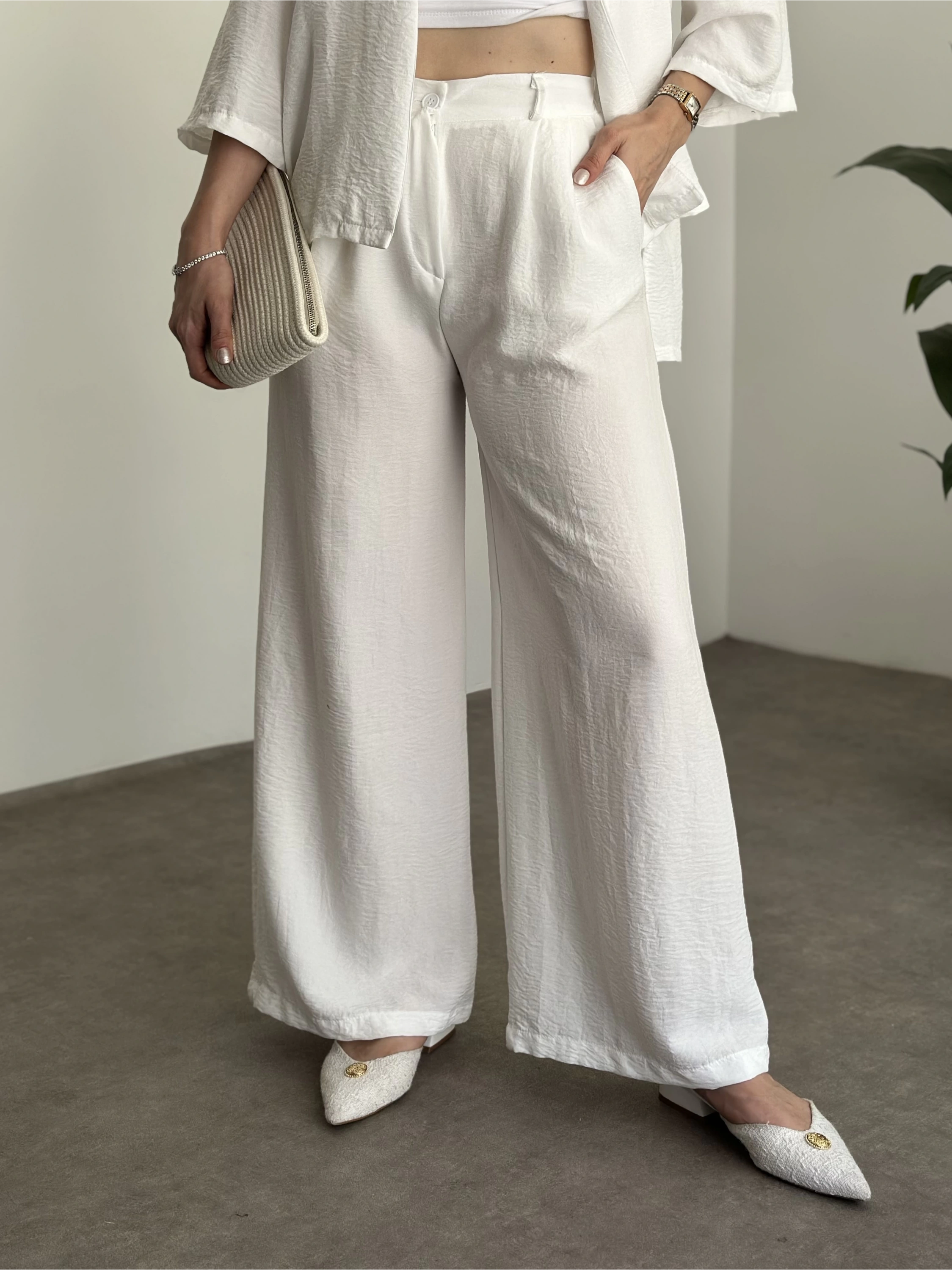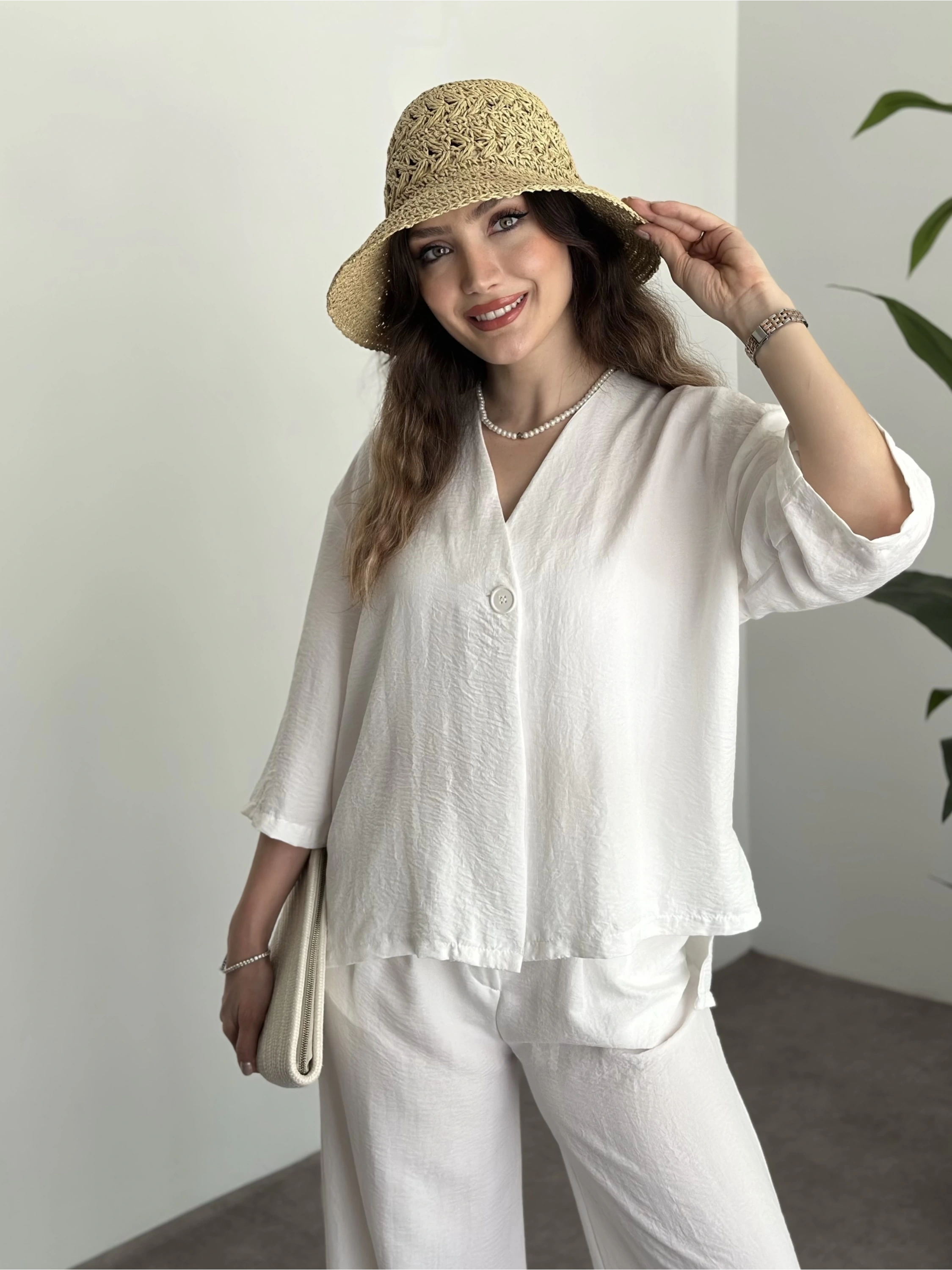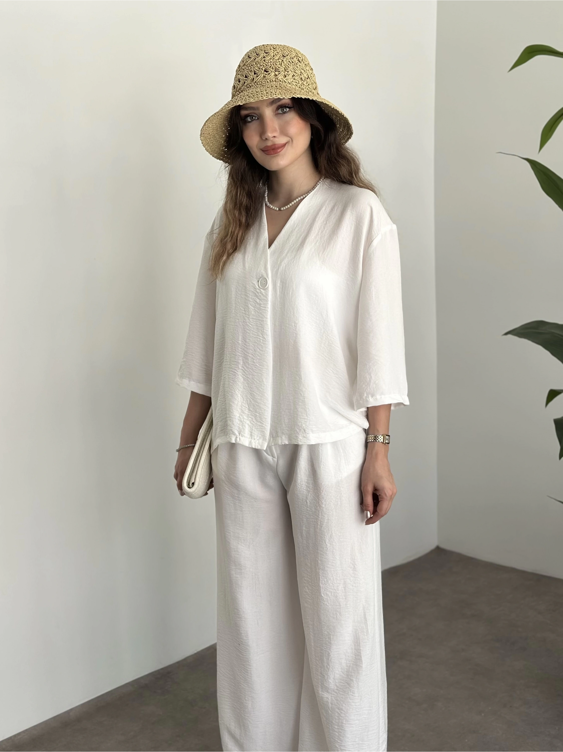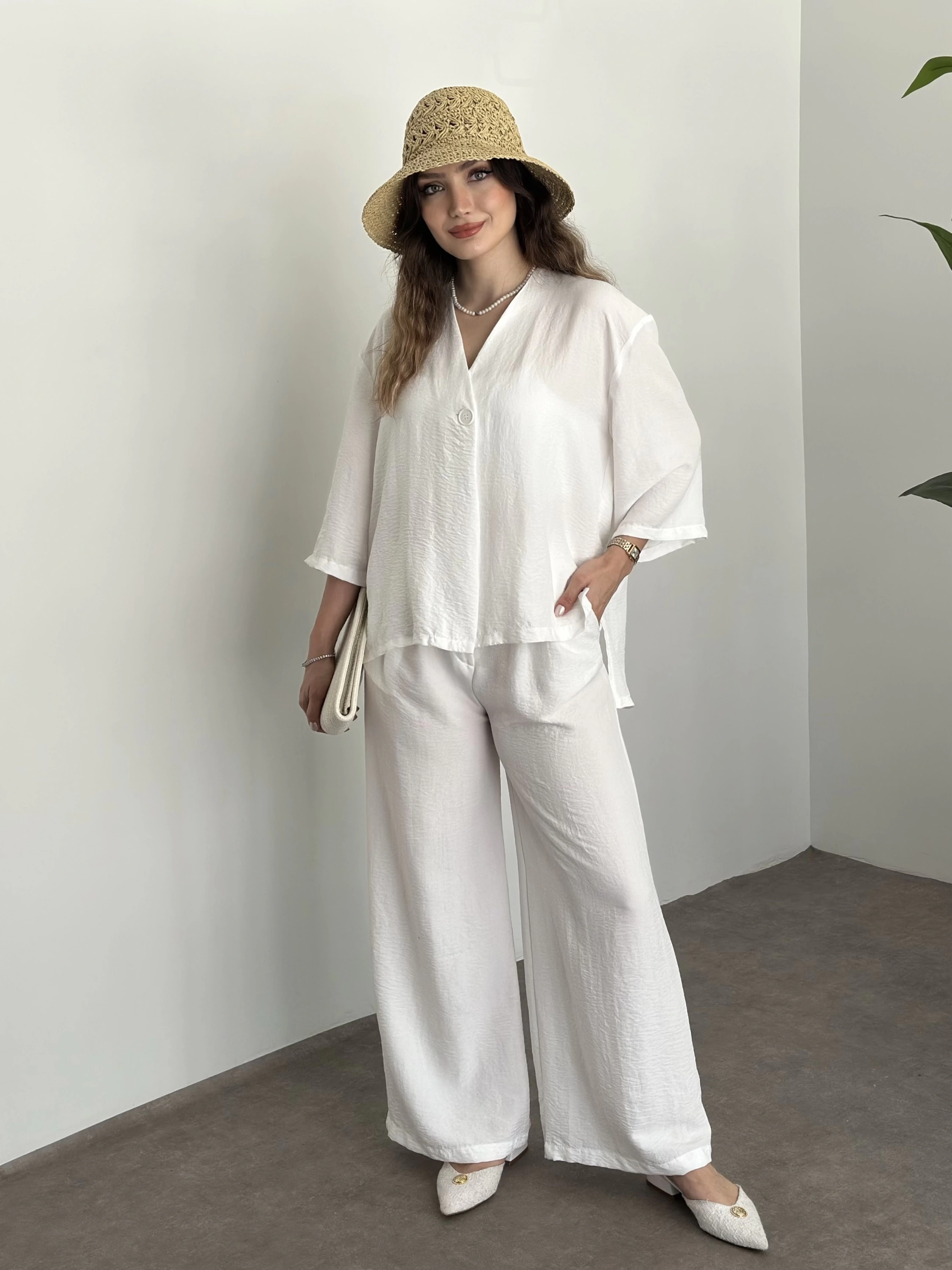 Premium yandan bağlama detaylı double kumaş takım beyaz