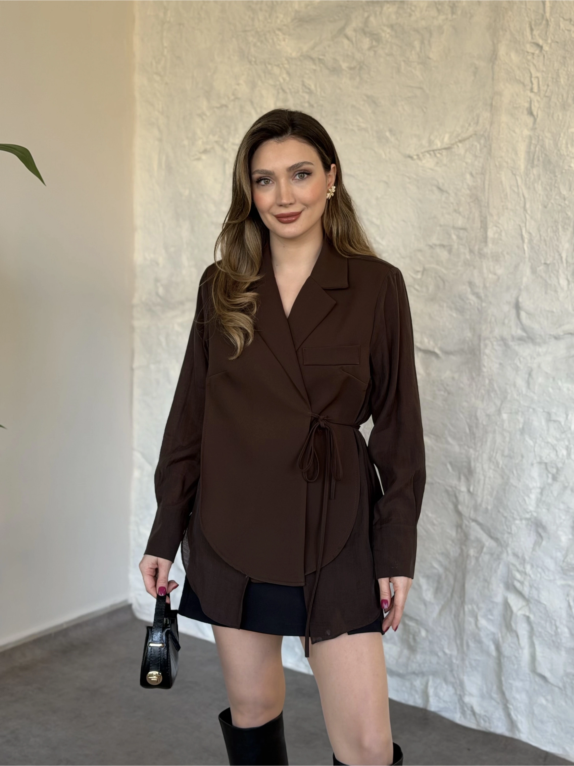 Kolları ve arkası tül yandan bağlamalı gömlek ceket kahve
